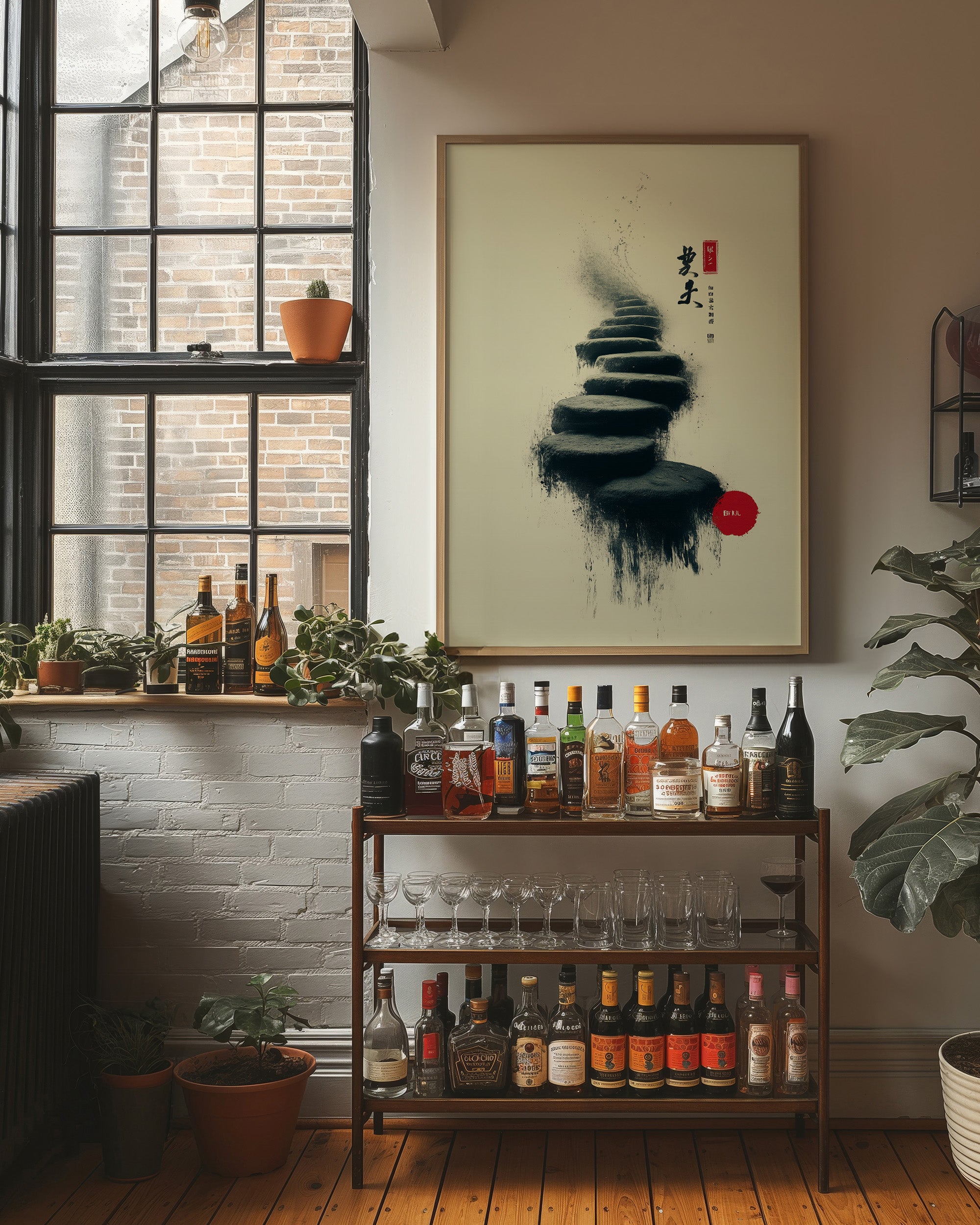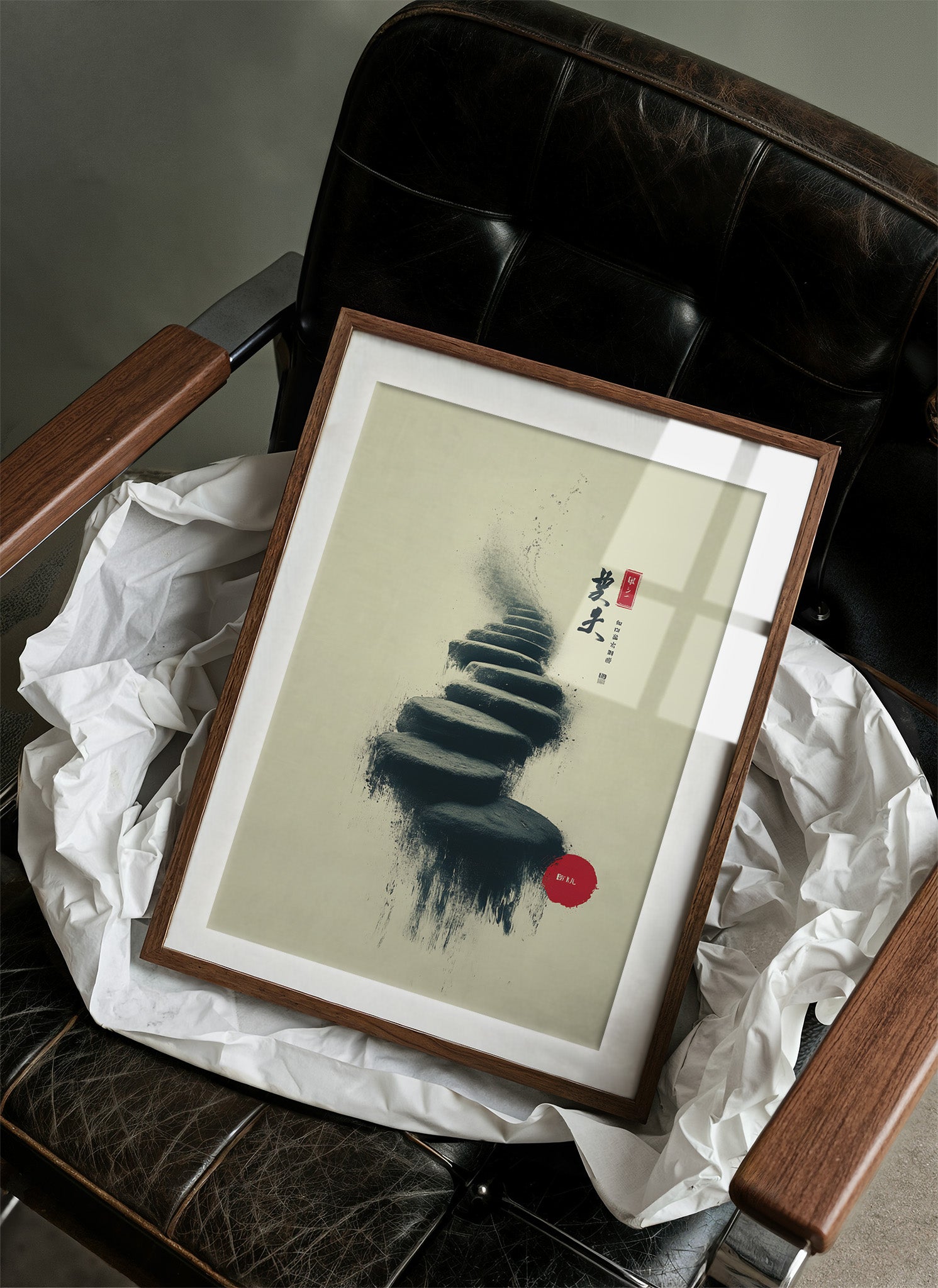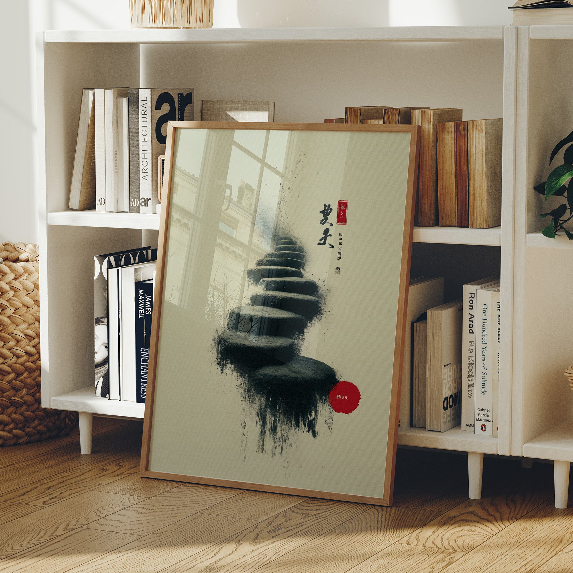 Ink-brushed stones float mysteriously upward through misty sage green, each step a meditation in balance and possibility. The minimalist Asian aesthetic creates a powerful journey through negative space, where traditional calligraphy meets contemporary design. This piece captures the essence of tranquility with its subtle gradients and bold brush strokes anchored by a striking red seal. This thoughtful piece would bring serenity to a reading nook, meditation space, or any room dedicated to peaceful contemplation.