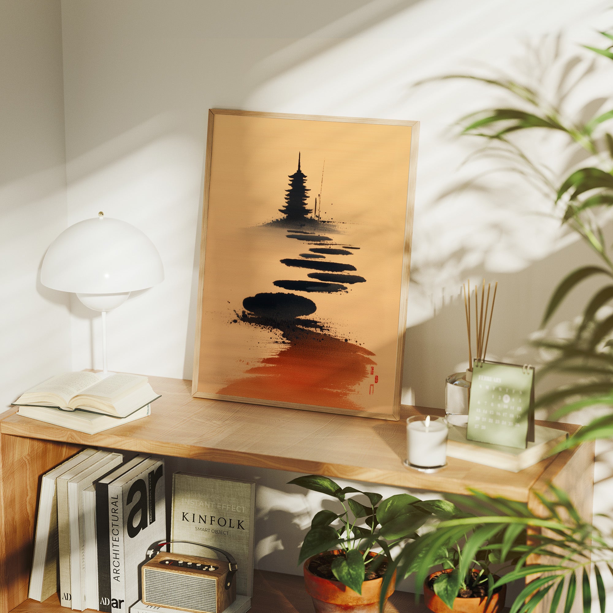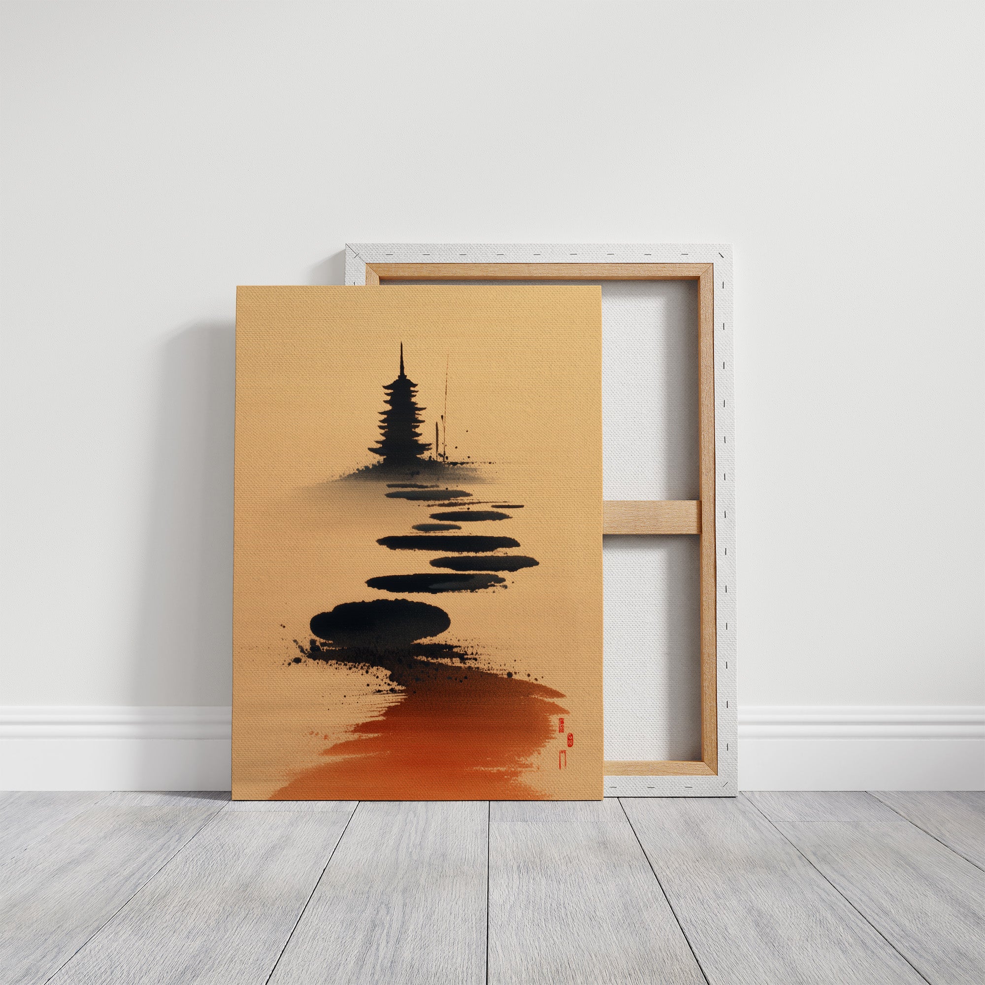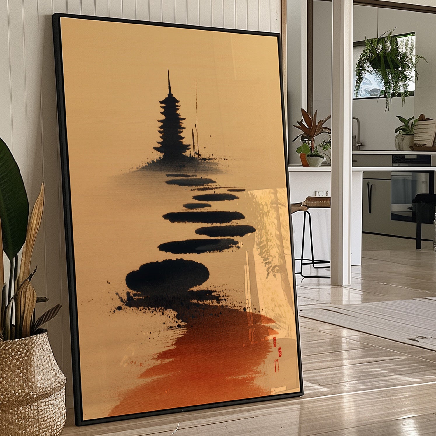 A minimalist journey unfolds through bold brushstrokes, leading the eye along a path of floating stones toward a solitary pagoda. The amber and rust tones melt into each other, creating a misty dreamscape that speaks of distant temples and quiet meditation. The composition masterfully balances negative space with decisive marks, telling a story of spiritual pilgrimage through abstract Asian aesthetics. This piece brings contemplative serenity to a reading nook, meditation space, or any room seeking a touch of zen elegance.