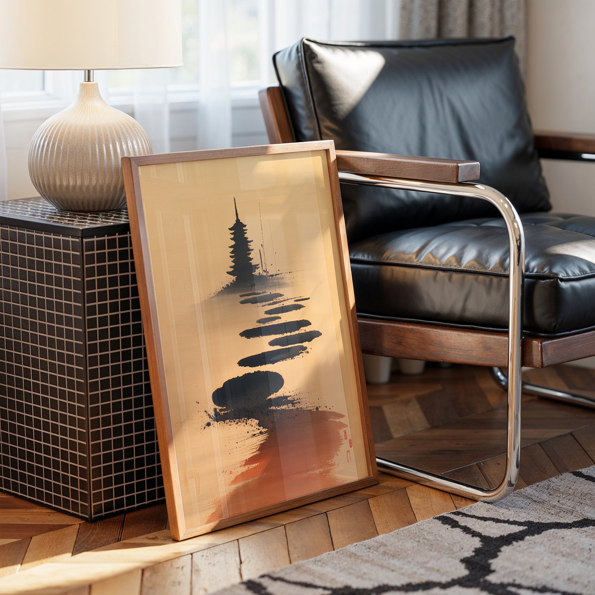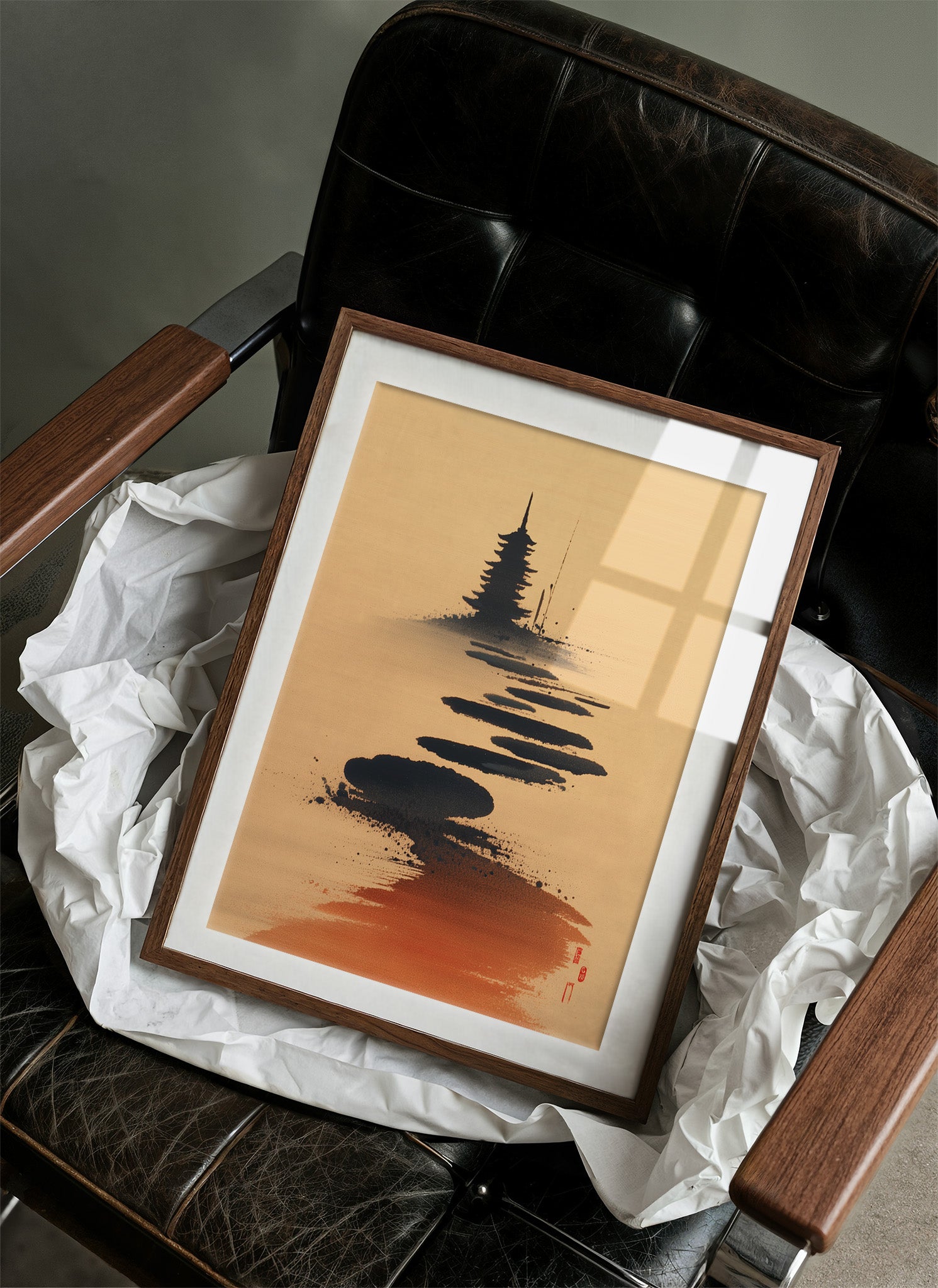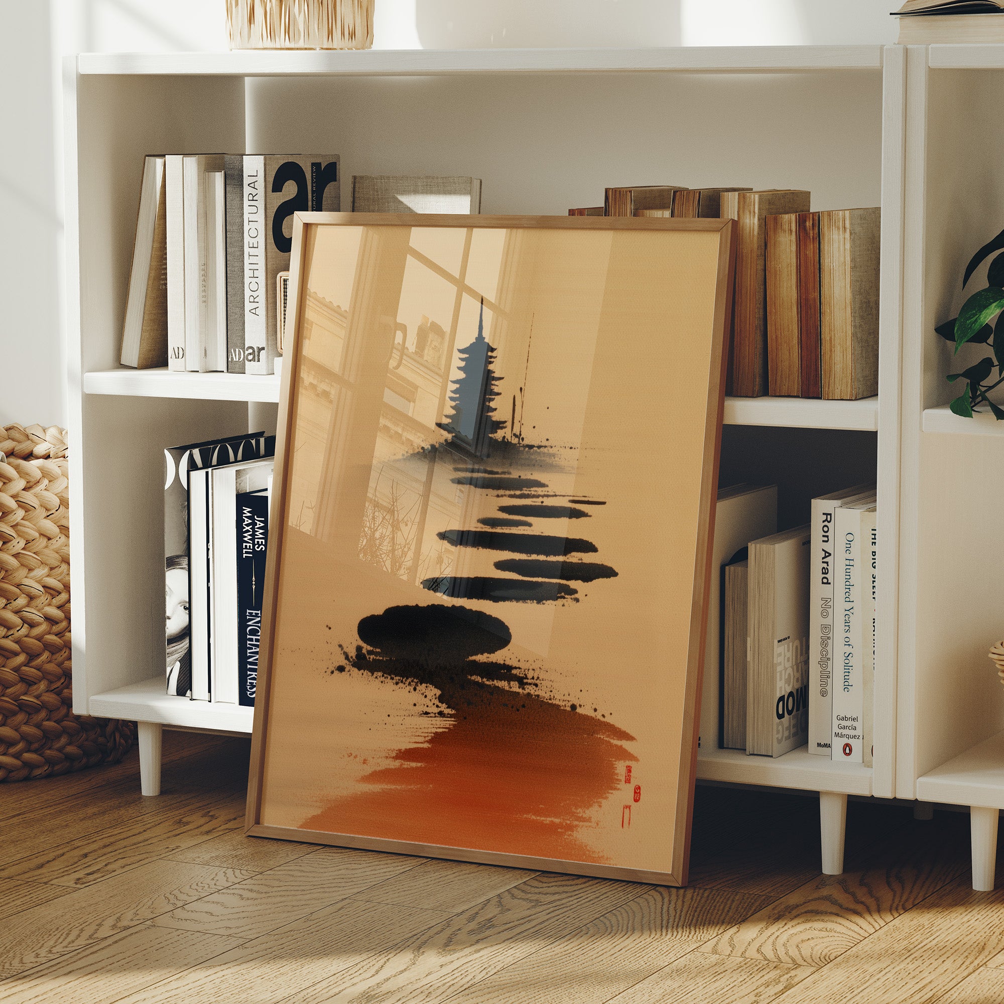 A minimalist journey unfolds through bold brushstrokes, leading the eye along a path of floating stones toward a solitary pagoda. The amber and rust tones melt into each other, creating a misty dreamscape that speaks of distant temples and quiet meditation. The composition masterfully balances negative space with decisive marks, telling a story of spiritual pilgrimage through abstract Asian aesthetics. This piece brings contemplative serenity to a reading nook, meditation space, or any room seeking a touch of zen elegance.