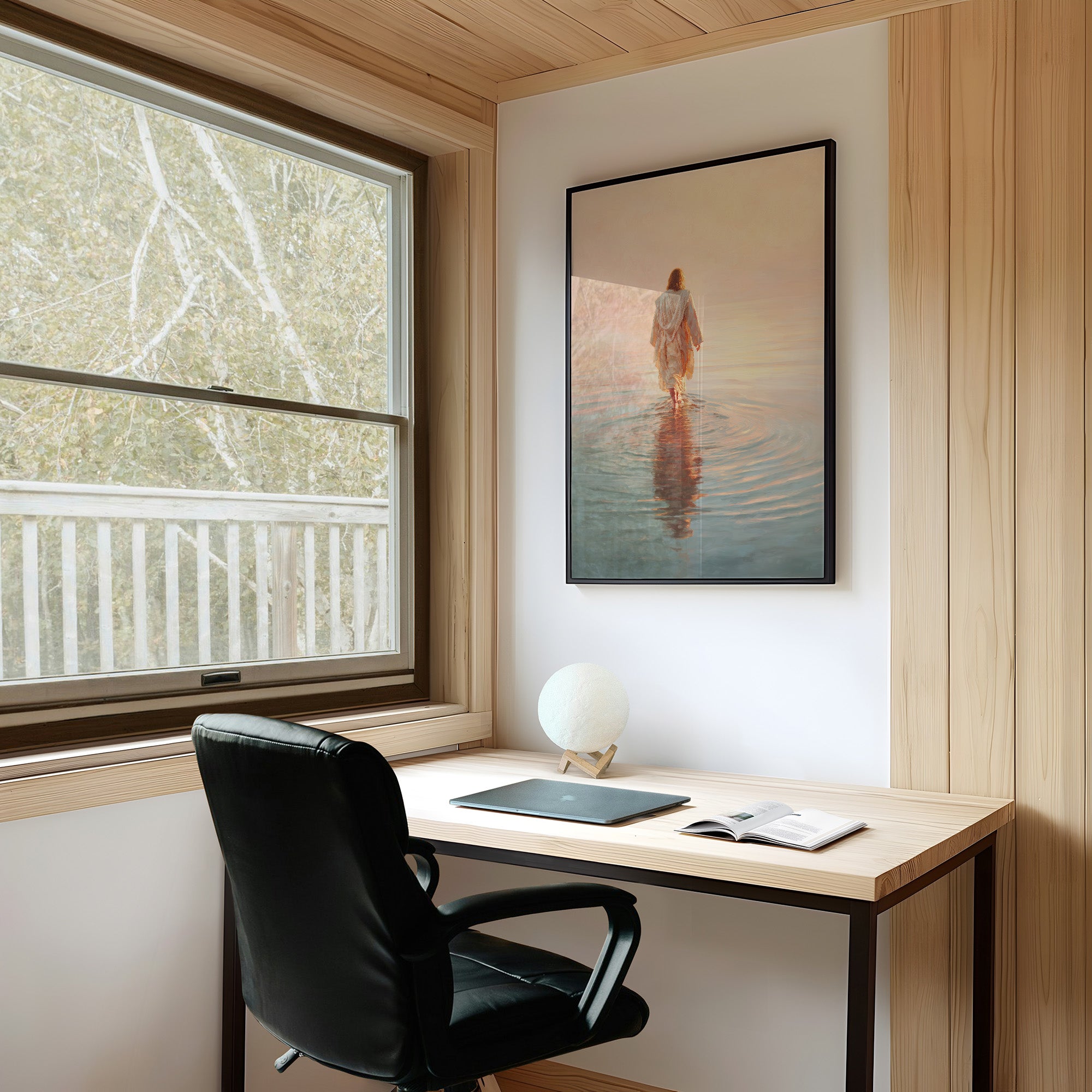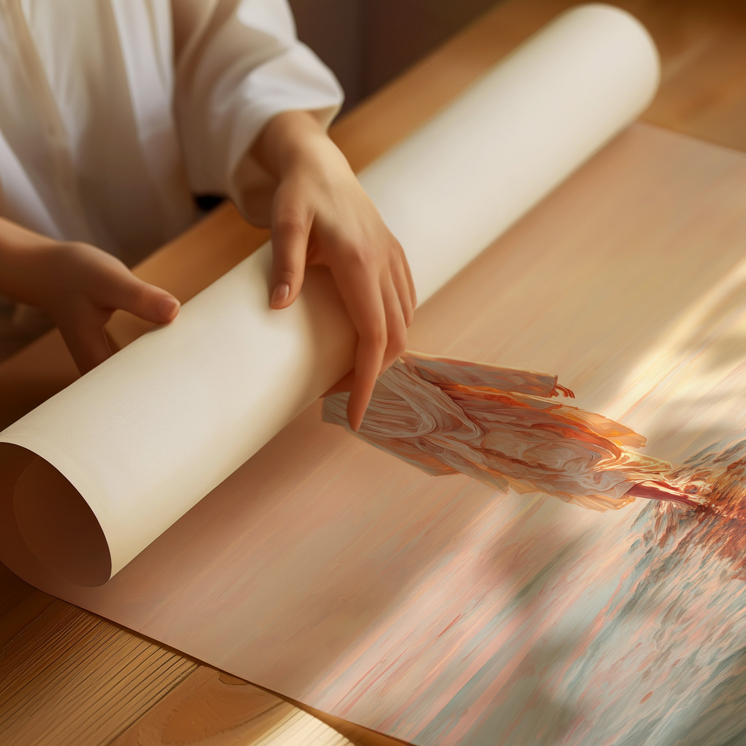 Tranquility ripples outward as a solitary figure wades into the luminous morning sea. Soft peach and golden hues of sunrise blend with cool aqua waters, creating a moment suspended between worlds. The flowing white garment catches the first light, transforming an ordinary journey into something sacred and timeless. This contemplative piece brings a sense of peace and spiritual renewal to any space seeking balance between serenity and quiet inspiration.