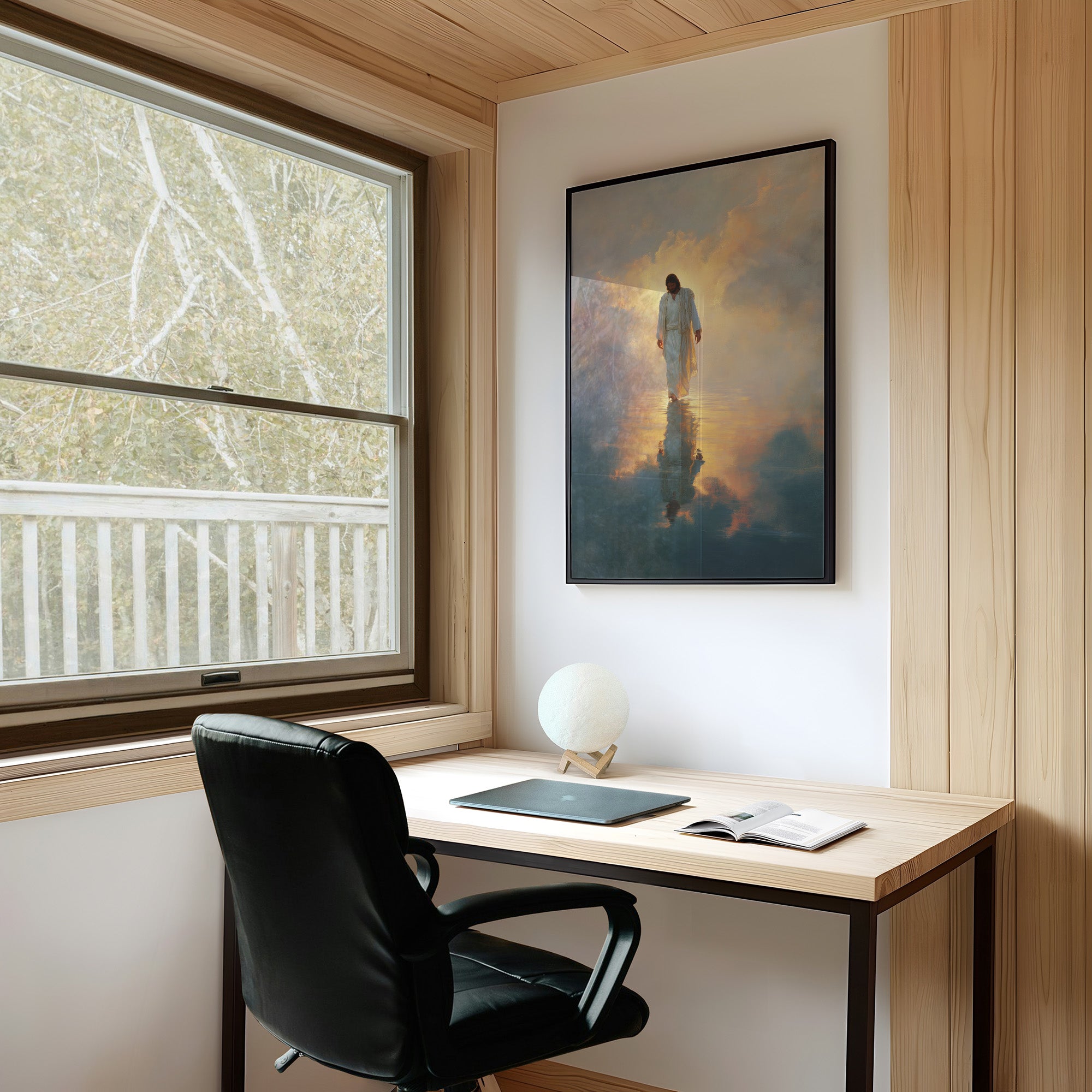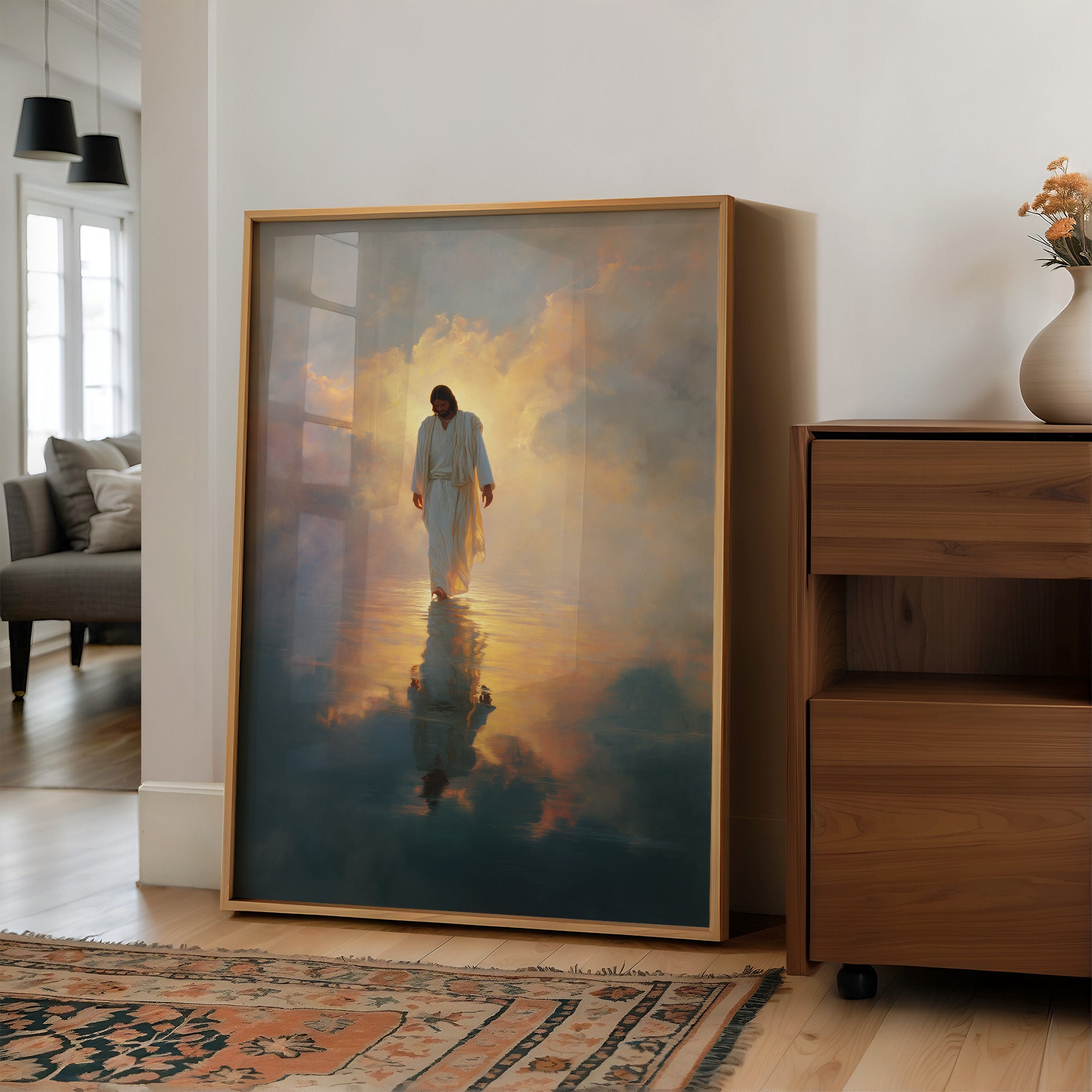 Golden light breaks through clouds, casting a path of radiance across still waters. A solitary figure in white robes treads this luminous pathway, their reflection mirroring every movement in perfect symmetry against the sky-painted surface. The warm amber glow contrasts with cool blues and purples, creating an atmosphere of transcendent peace that seems to exist between worlds.