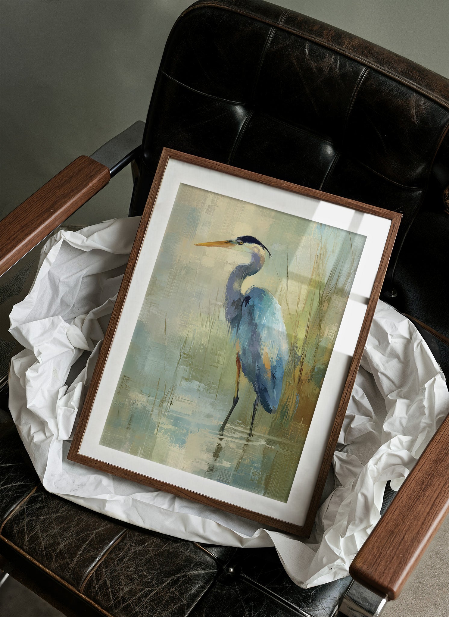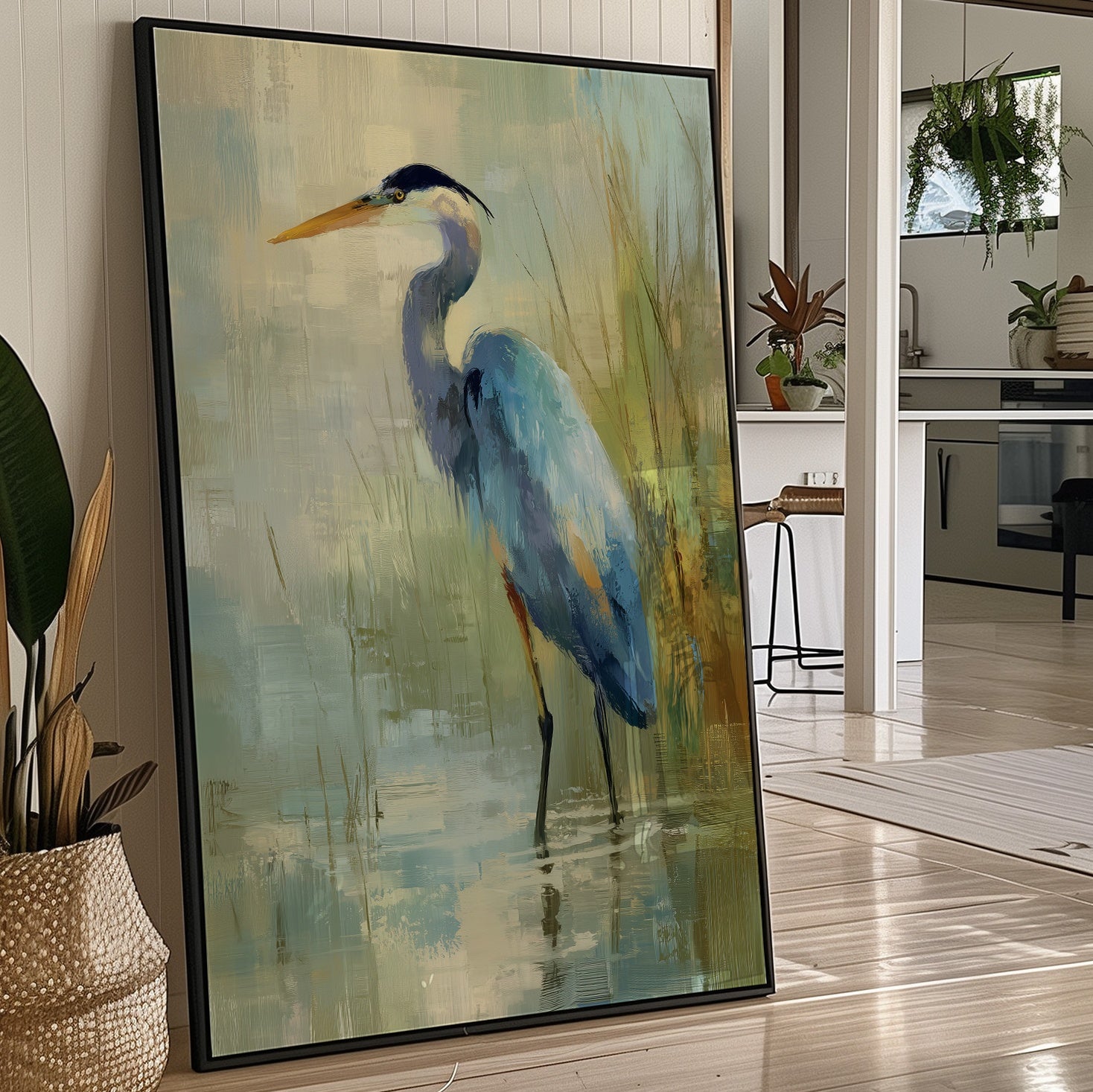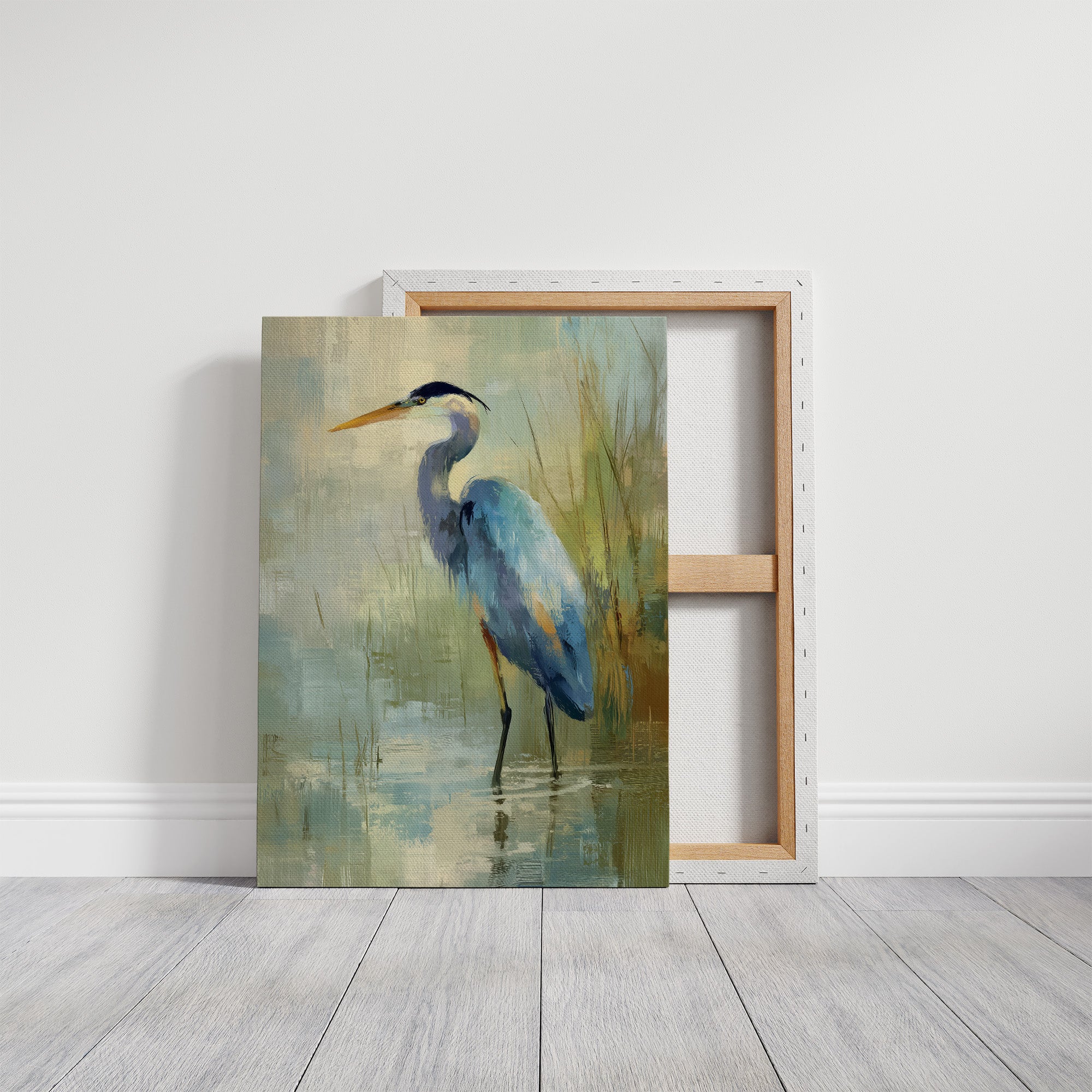 Morning light catches the elegant silhouette of a blue heron standing in tranquil waters. Soft brush strokes in muted sage, cerulean, and cream capture the bird's patient dignity against a backdrop of windswept reeds. The painting's impressionistic quality transforms this solitary watcher into a meditation on nature's quiet moments and the beauty found in patient observation.