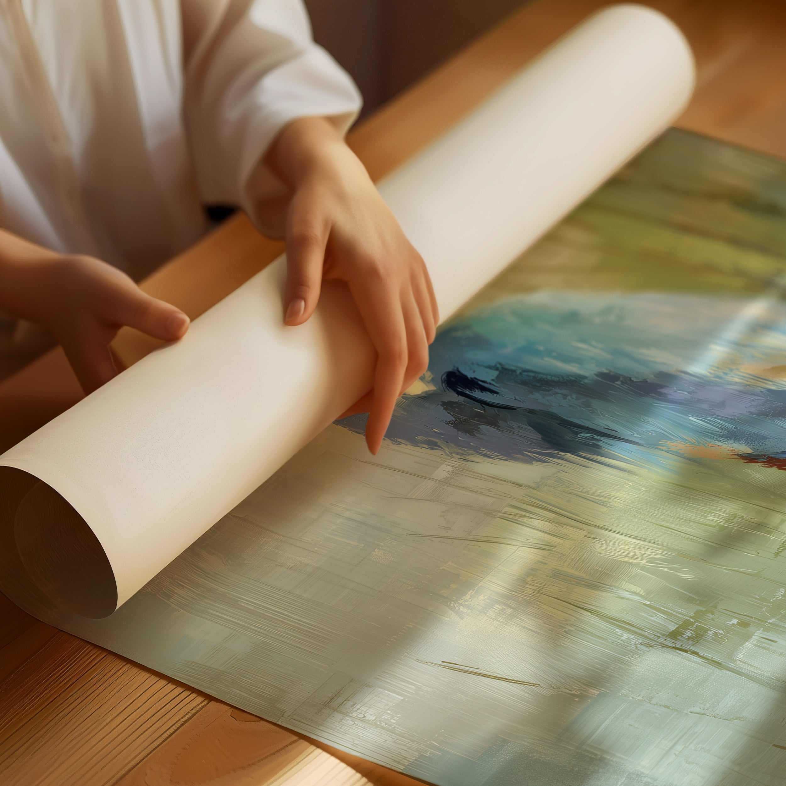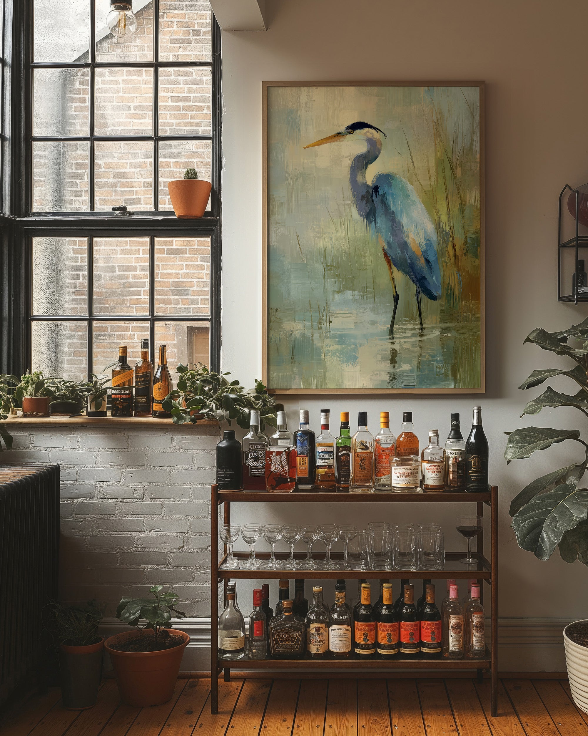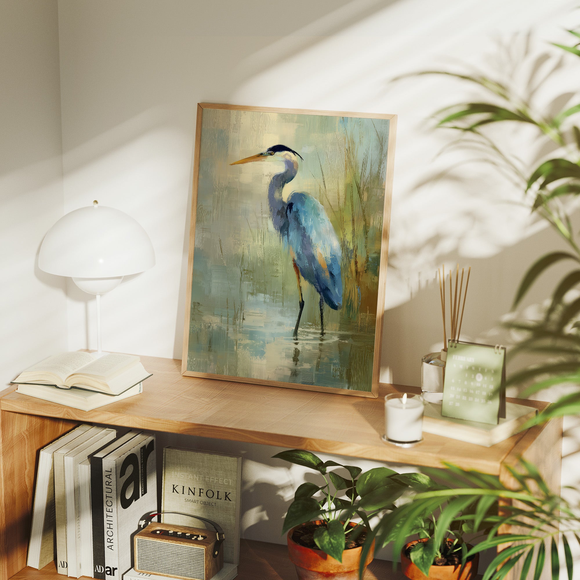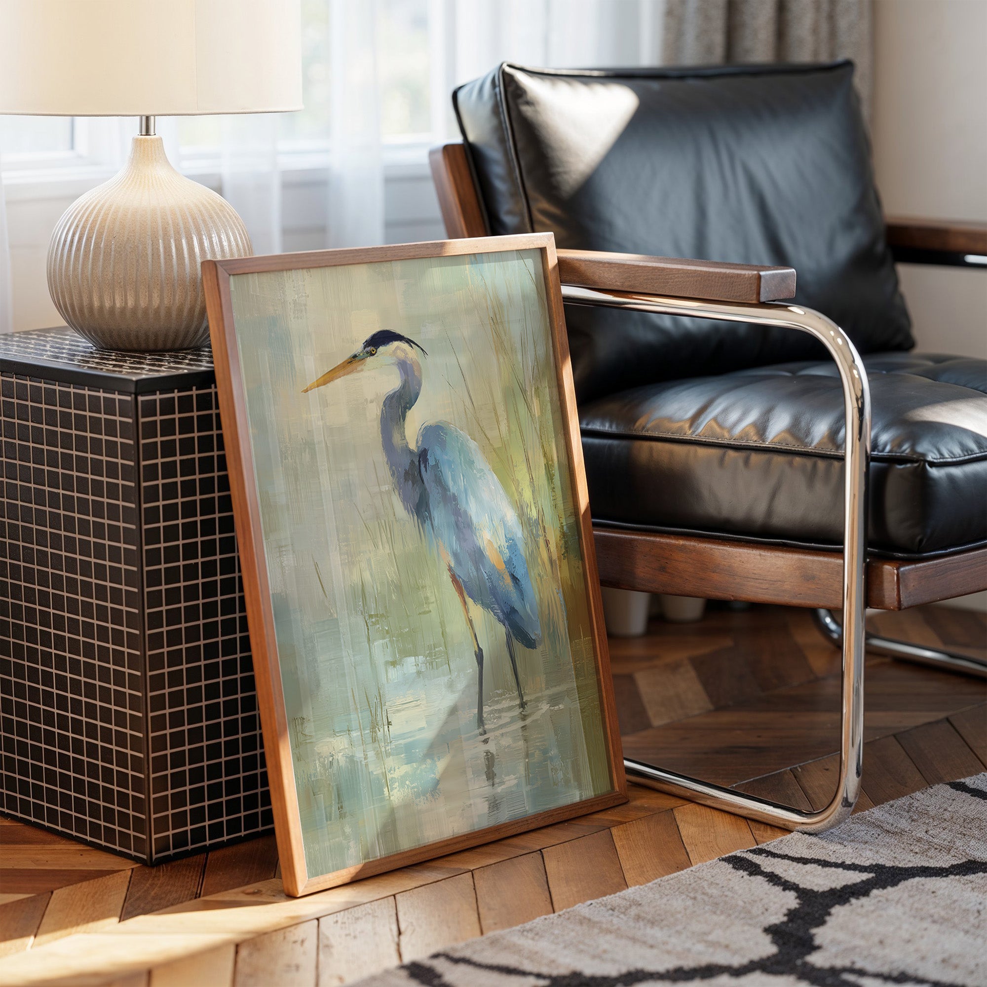 Morning light catches the elegant silhouette of a blue heron standing in tranquil waters. Soft brush strokes in muted sage, cerulean, and cream capture the bird's patient dignity against a backdrop of windswept reeds. The painting's impressionistic quality transforms this solitary watcher into a meditation on nature's quiet moments and the beauty found in patient observation.