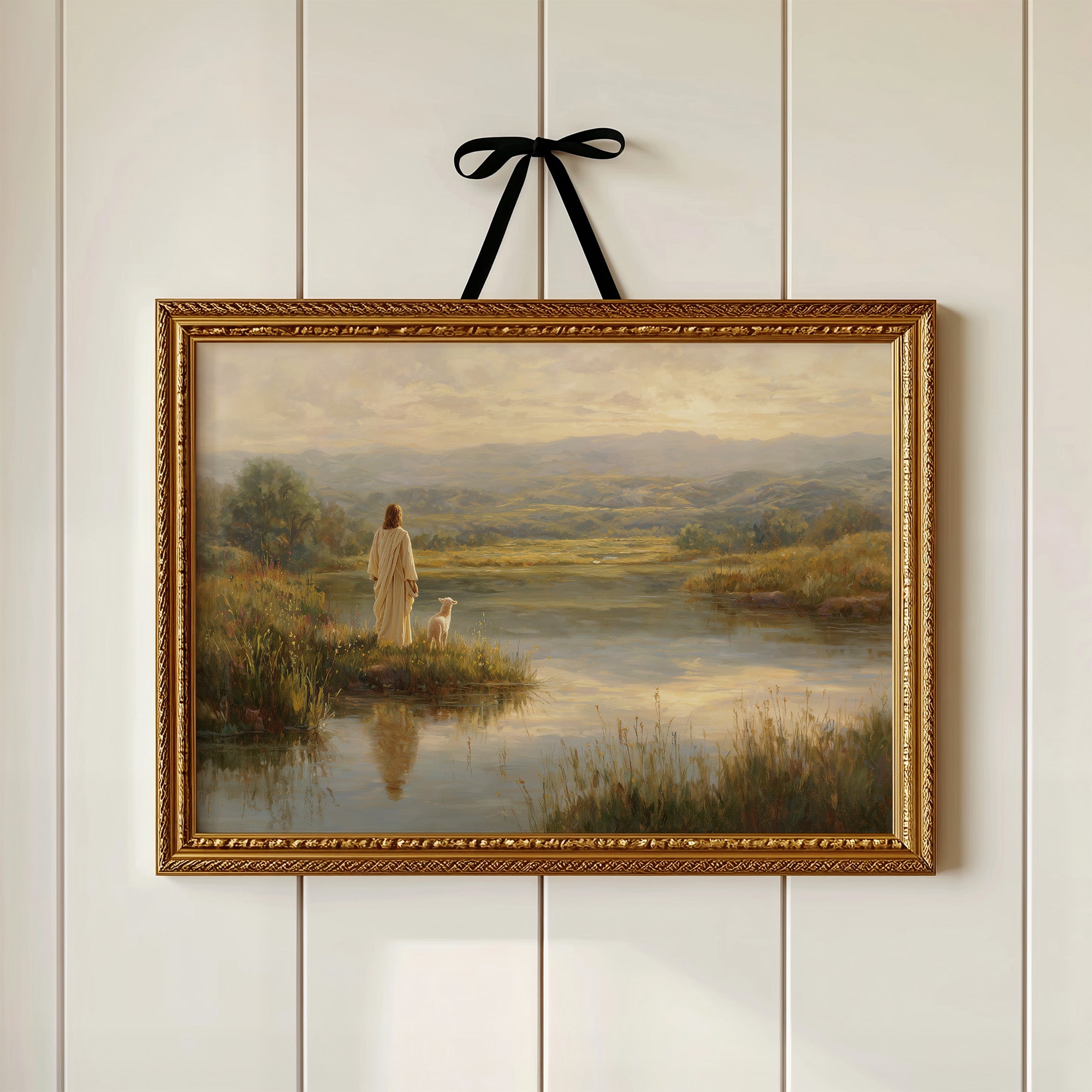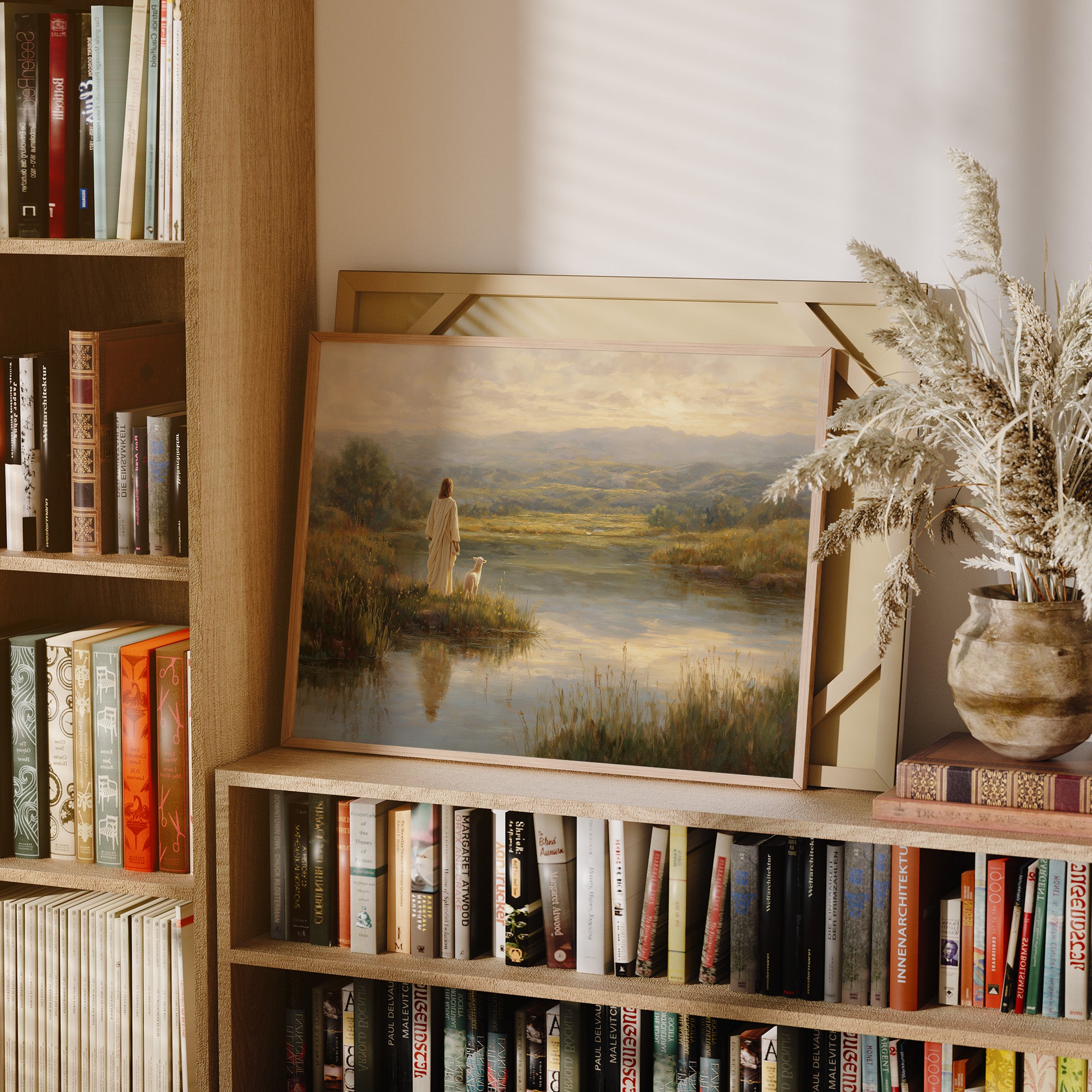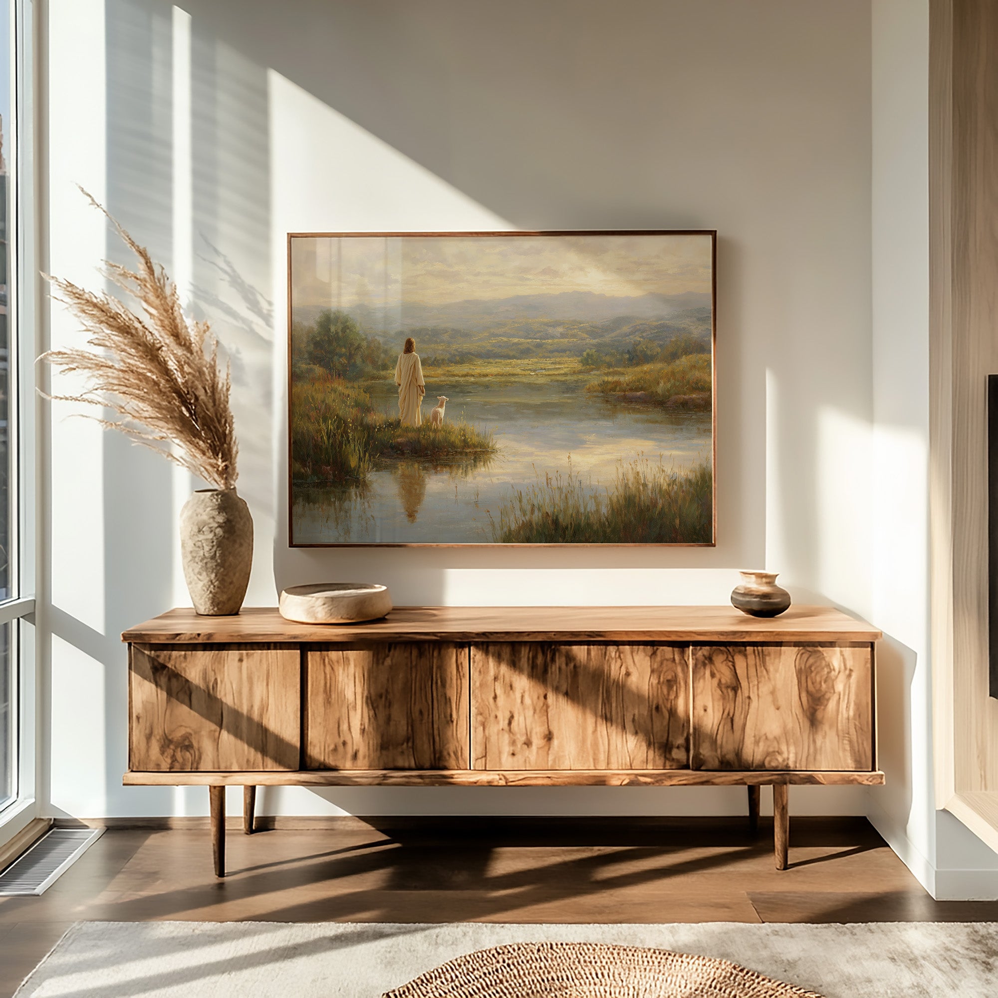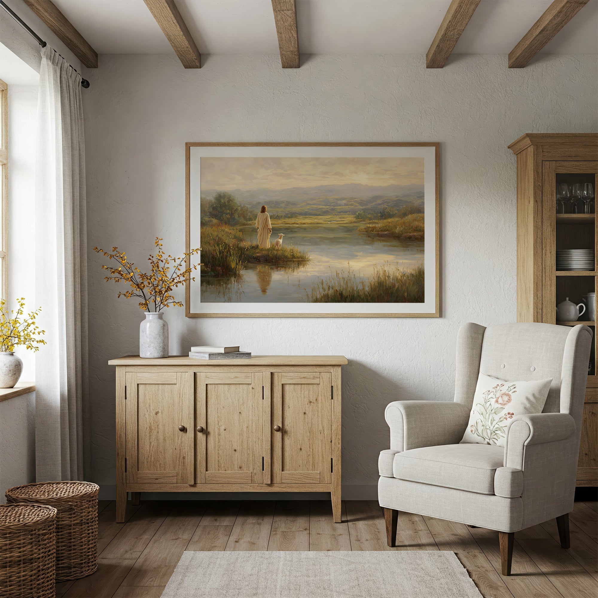Golden hour bathes the valley in honey-warm light, creating a moment of perfect tranquility. The painting captures a solitary figure standing beside a faithful companion at the water's edge, gazing across rolling hills that fade into misty mountains. Soft brushstrokes blend earth tones with delicate highlights, creating a dreamlike quality that invites contemplation and peace. This serene artwork brings a sense of spiritual calm to a reading nook, home office, or meditation space.