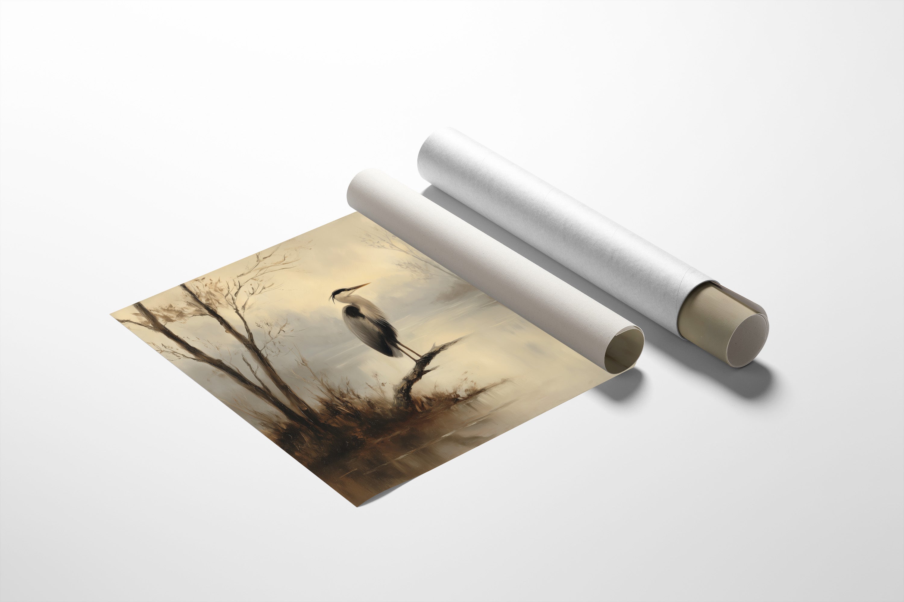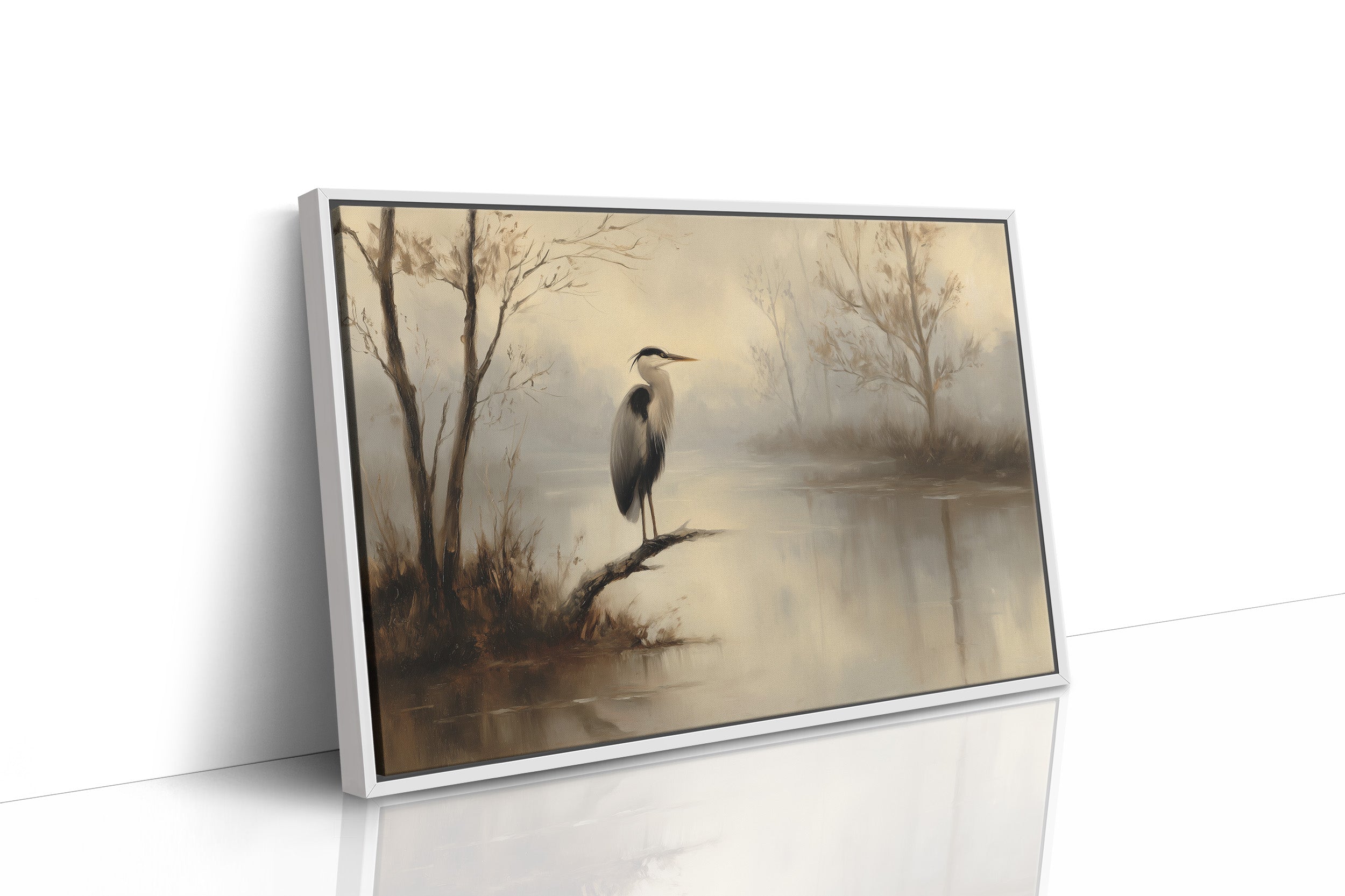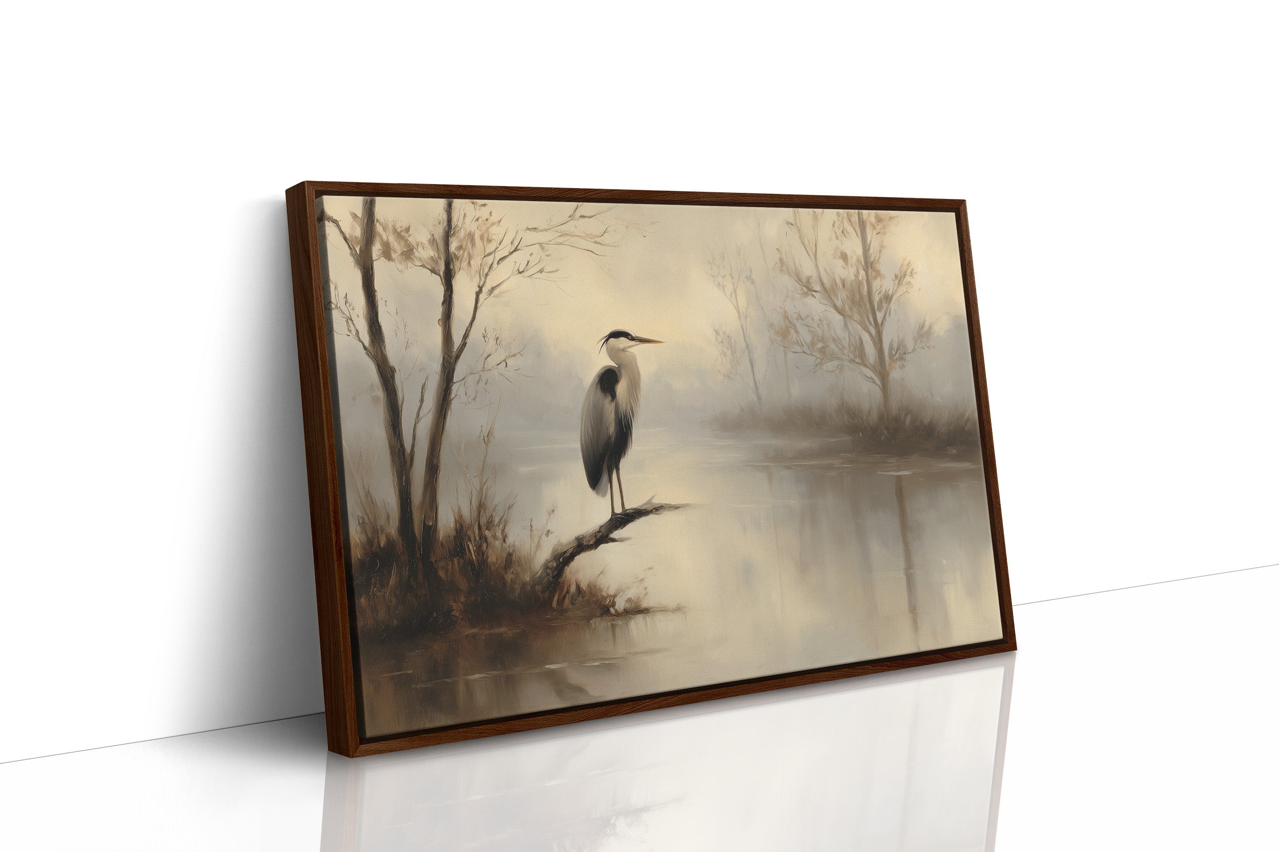 A lone heron stands sentinel in the muted dawn light, its reflection rippling softly across the misty water. The painting captures that fleeting moment when the world holds its breathtrees barely visible through the morning fog, their silhouettes creating a delicate boundary between earth and sky. The gentle sepia tones and subtle brushwork evoke a sense of timelessness, as if this quiet marsh scene exists in a perpetual state of peaceful anticipation. This piece brings contemplative tranquility to a home office or reading nook, inviting moments of reflection amidst the rush of daily life.