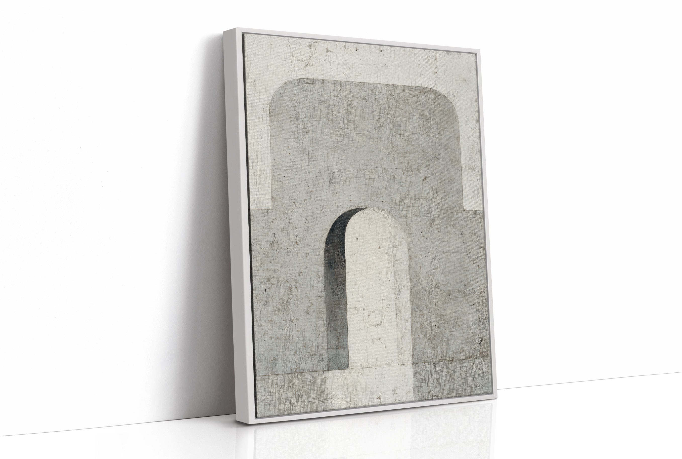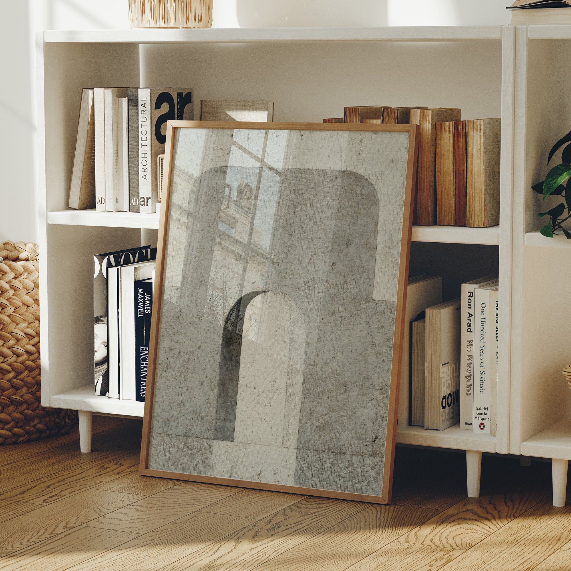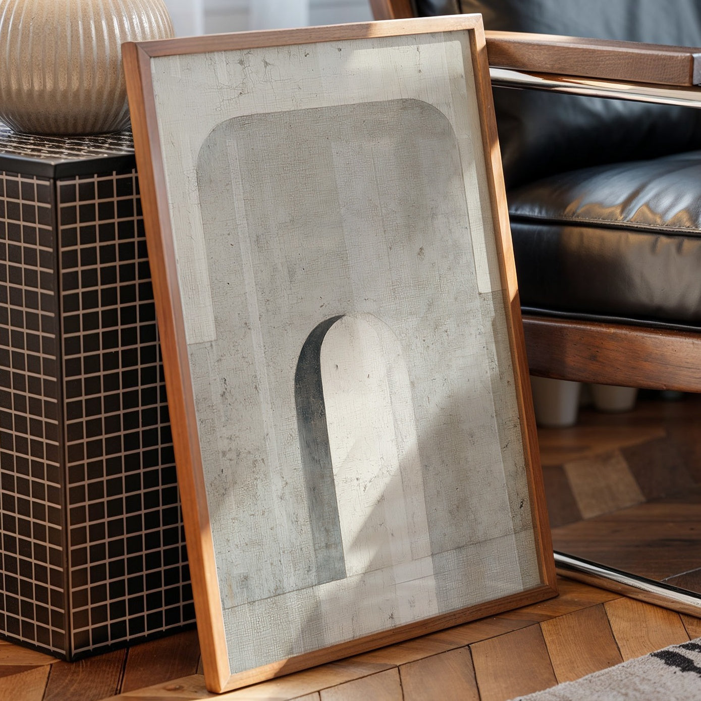 Soft morning rays cast gentle shadows across a minimalist architectural print, where curved forms create a meditation in grey and white. The textured surface reveals subtle variations in tone, while geometric arches suggest doorways to contemplative spaces beyond. This contemporary piece finds harmony among natural elements and clean lines, offering a serene focal point for thoughtful spaces. Perfect for a modern reading nook, home office, or any space where clean lines and architectural elements create a sense of sophisticated calm.