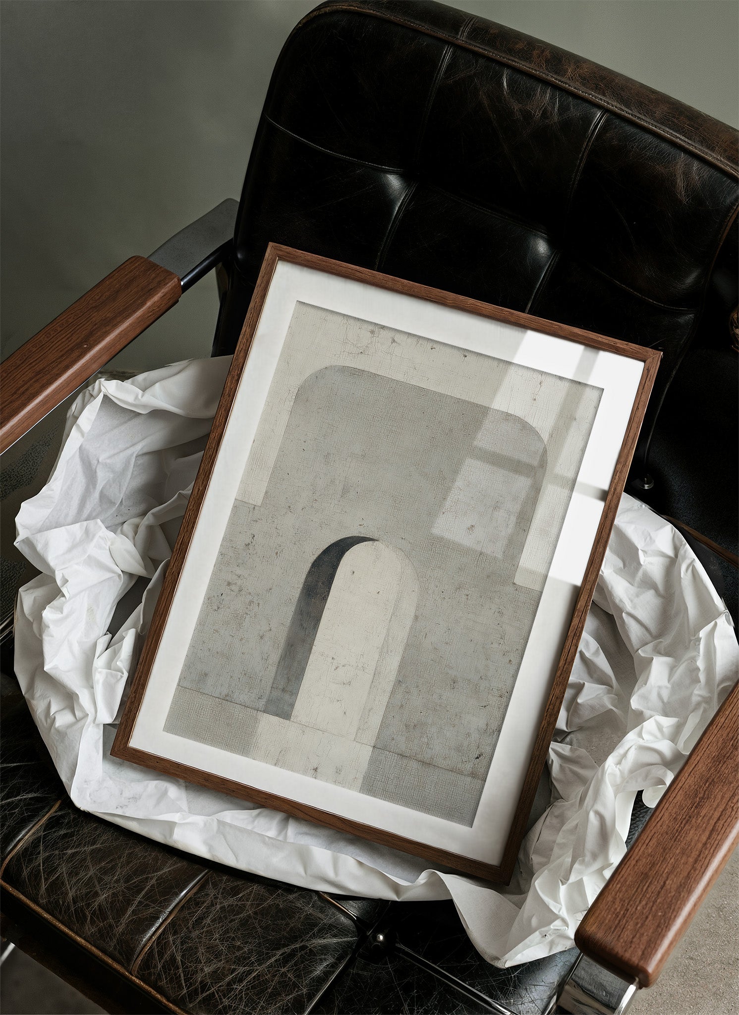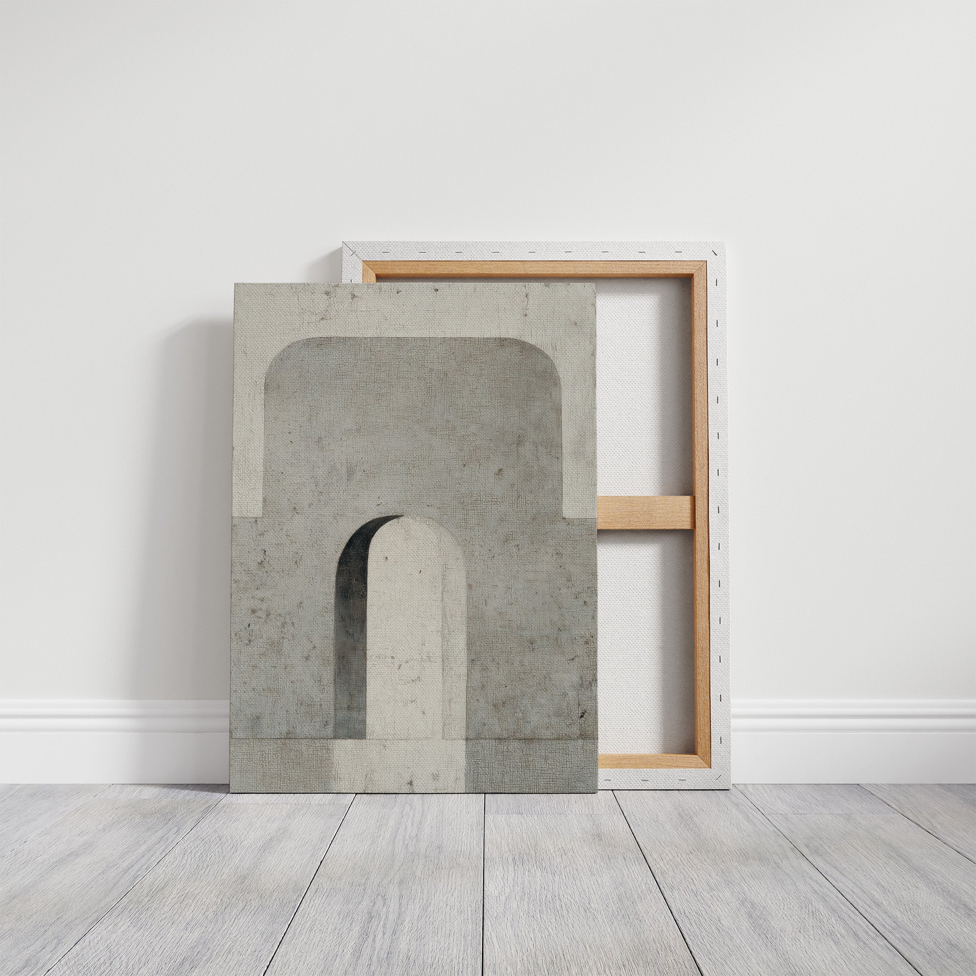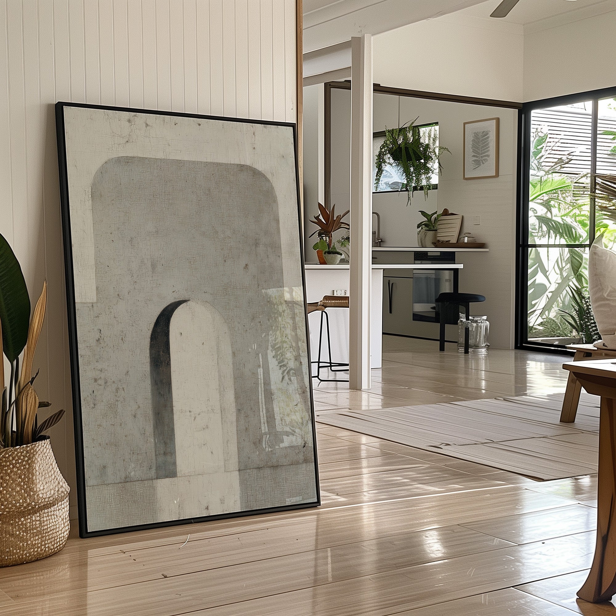 Soft morning rays cast gentle shadows across a minimalist architectural print, where curved forms create a meditation in grey and white. The textured surface reveals subtle variations in tone, while geometric arches suggest doorways to contemplative spaces beyond. This contemporary piece finds harmony among natural elements and clean lines, offering a serene focal point for thoughtful spaces. Perfect for a modern reading nook, home office, or any space where clean lines and architectural elements create a sense of sophisticated calm.