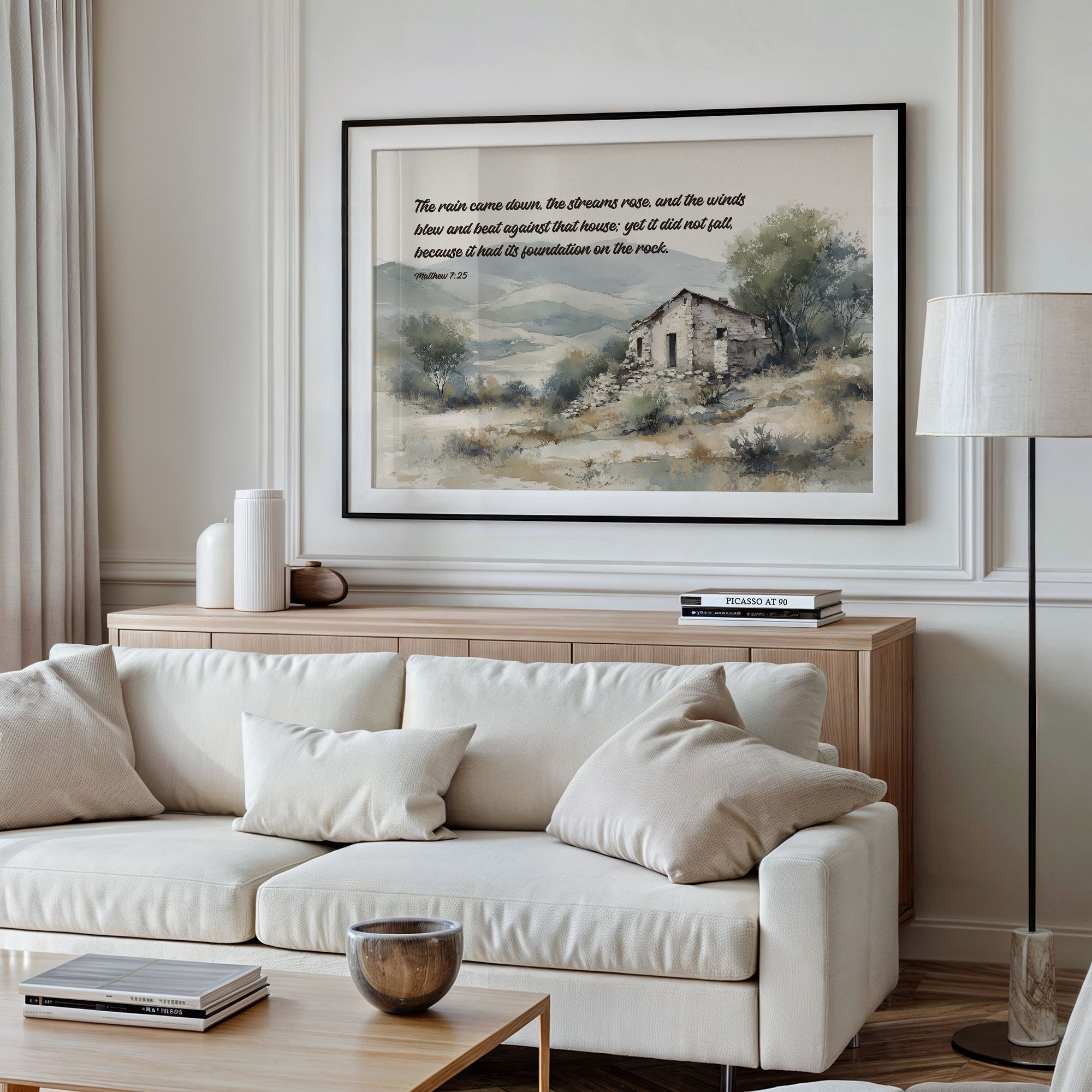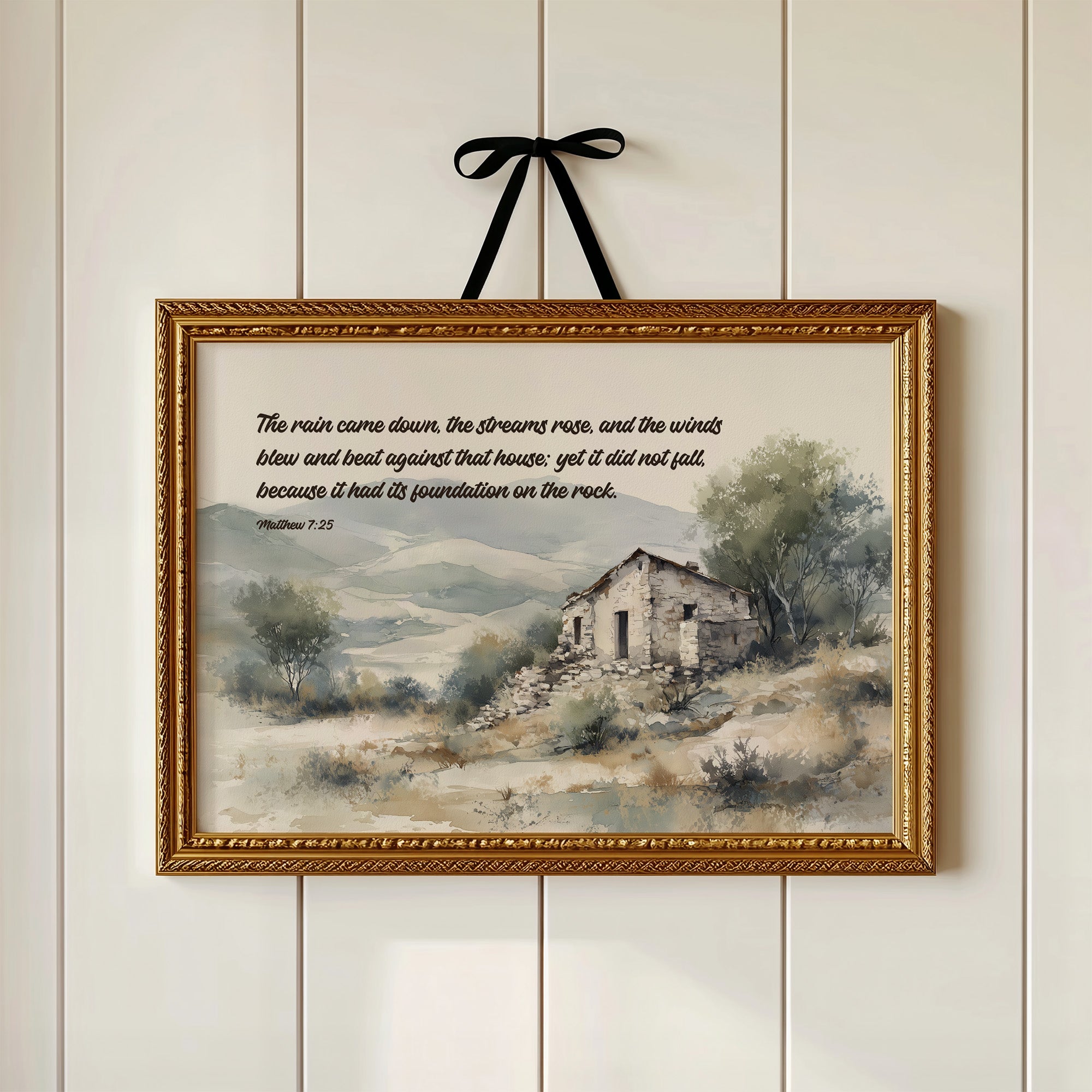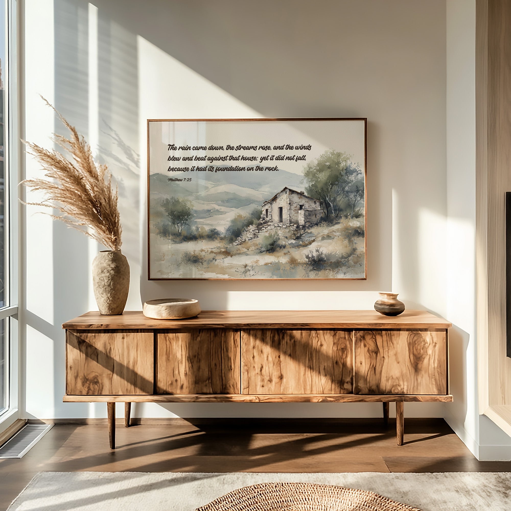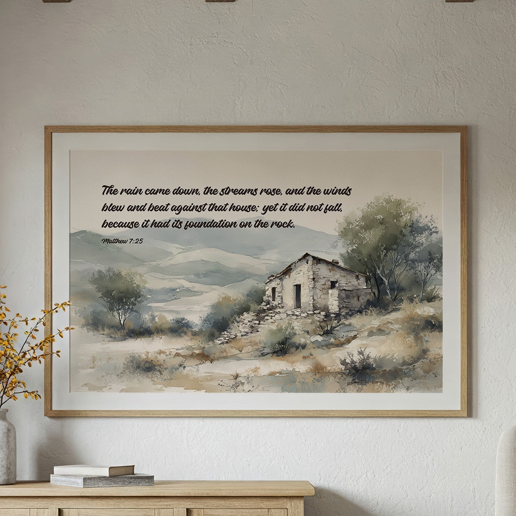 The soft watercolor landscape captures a moment of steadfast resilience. A weathered stone cottage stands alone amid rolling hills and gentle foliage, embodying the biblical verse that flows above it. The muted palette of blues, greens, and earthy tones creates a serene meditation on endurance, while the delicate brushstrokes suggest both vulnerability and strength in the face of life's storms. This contemplative piece brings calming wisdom to a home office, reading nook, or any space where you seek daily inspiration and quiet reflection.