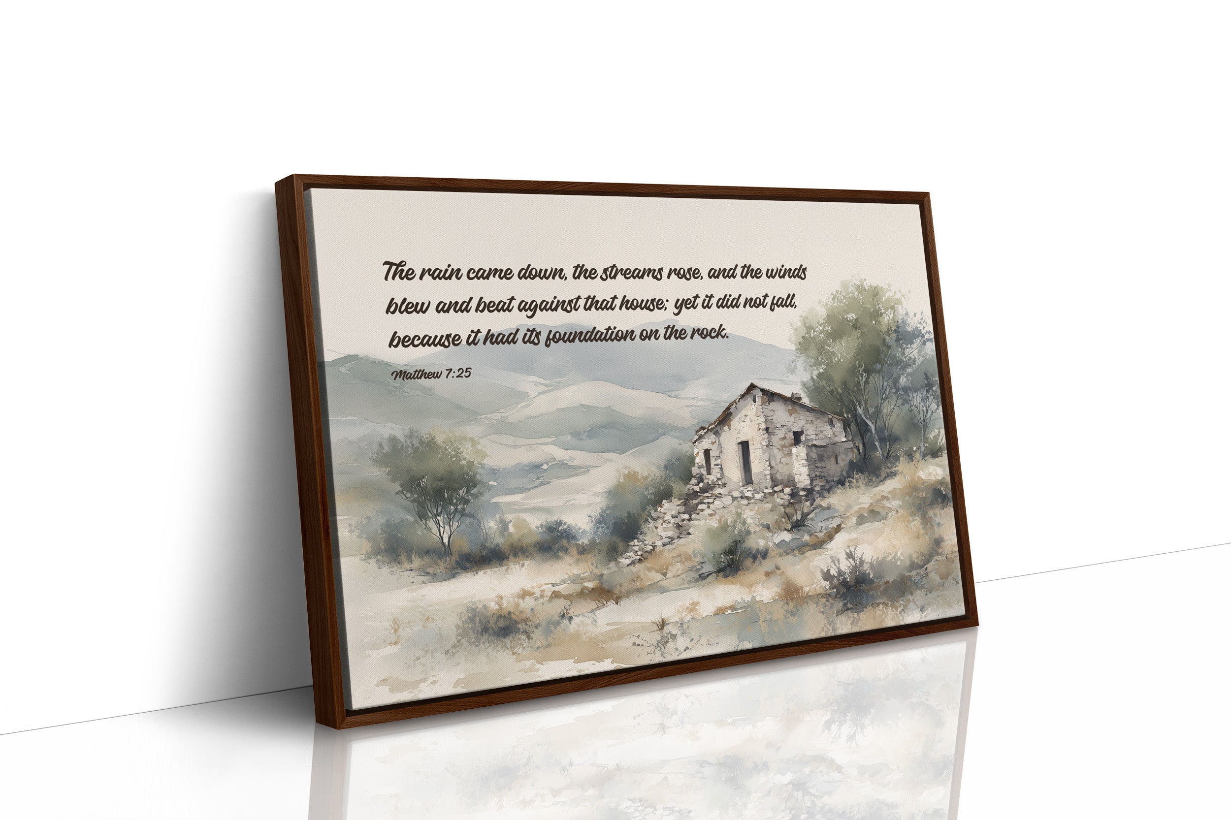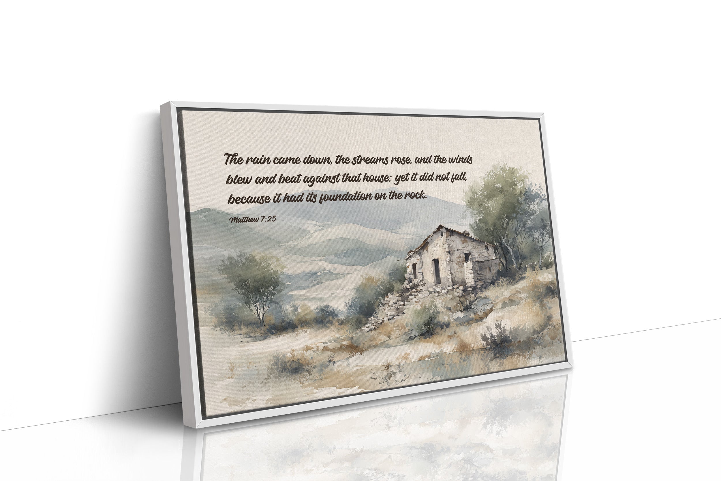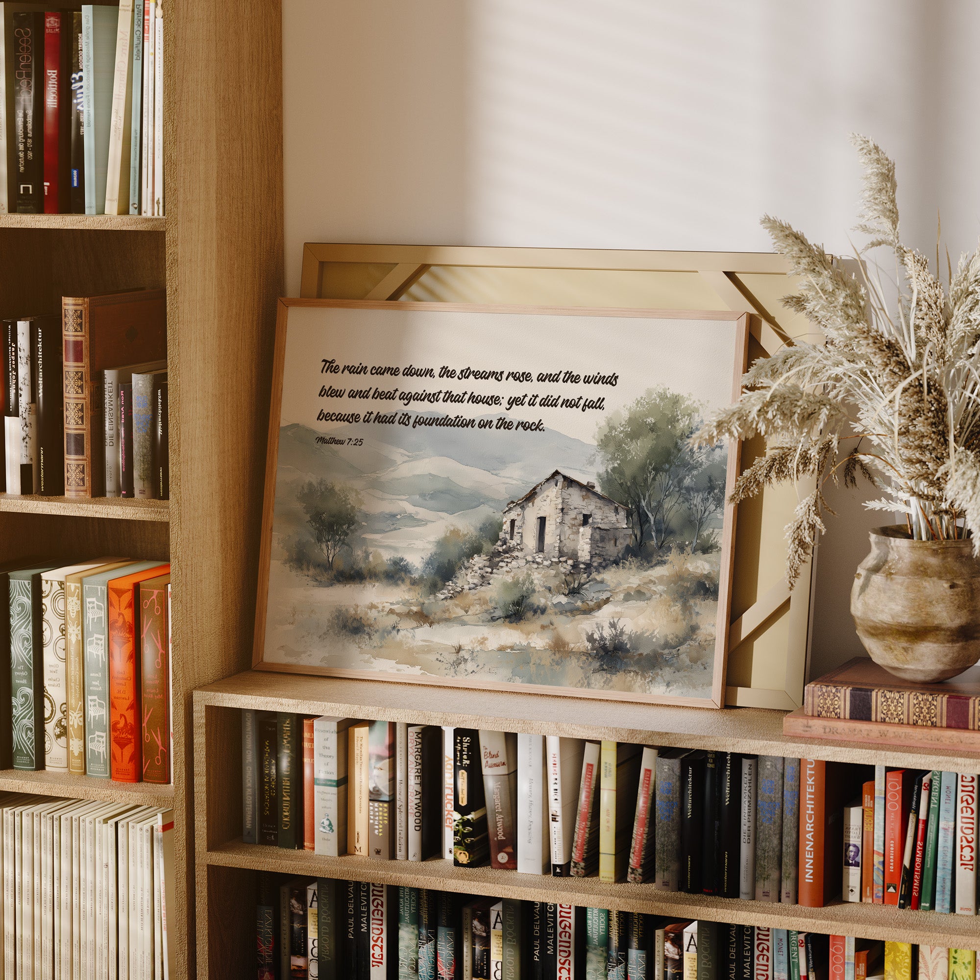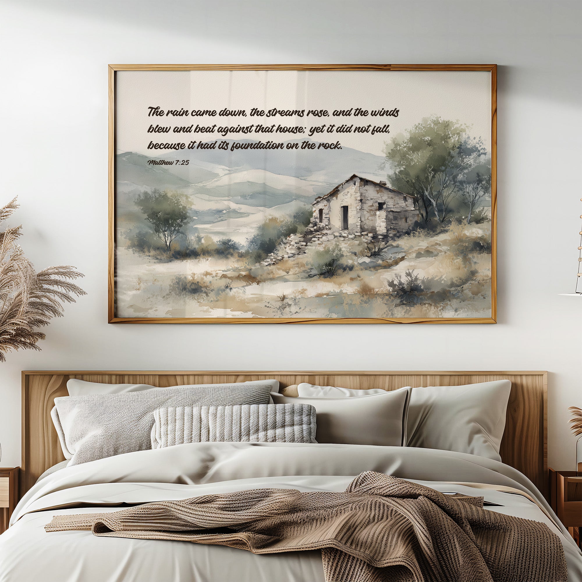 The soft watercolor landscape captures a moment of steadfast resilience. A weathered stone cottage stands alone amid rolling hills and gentle foliage, embodying the biblical verse that flows above it. The muted palette of blues, greens, and earthy tones creates a serene meditation on endurance, while the delicate brushstrokes suggest both vulnerability and strength in the face of life's storms. This contemplative piece brings calming wisdom to a home office, reading nook, or any space where you seek daily inspiration and quiet reflection.