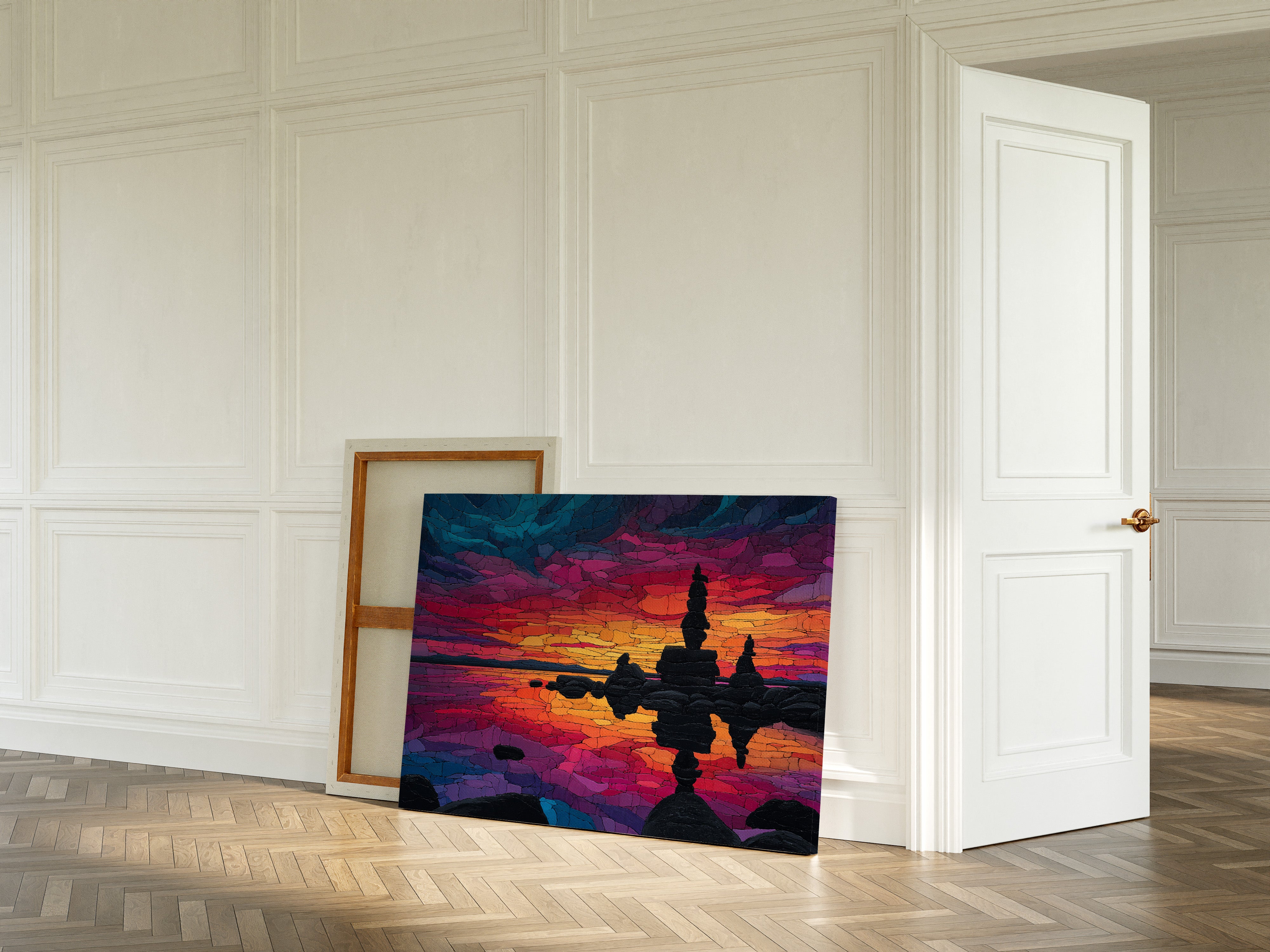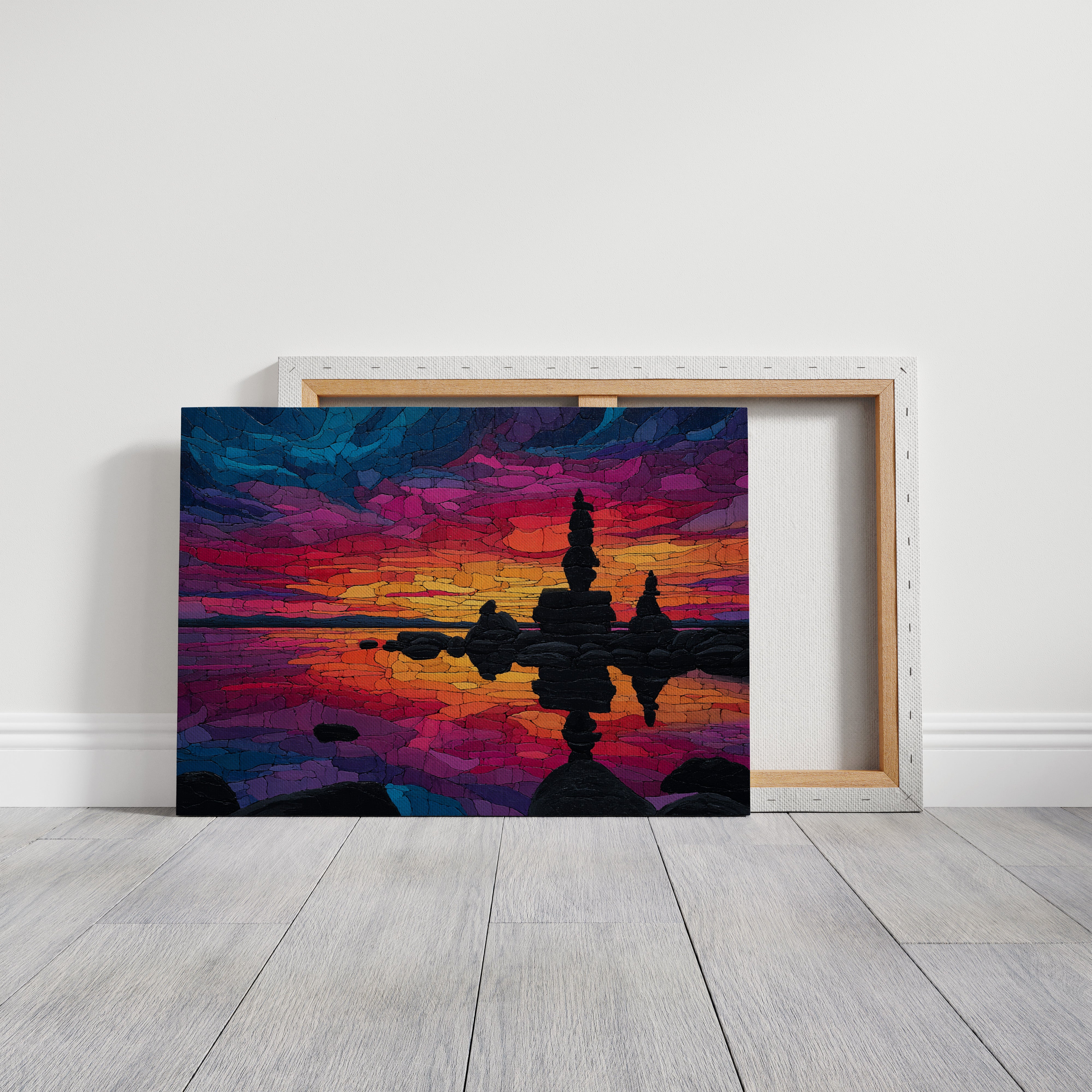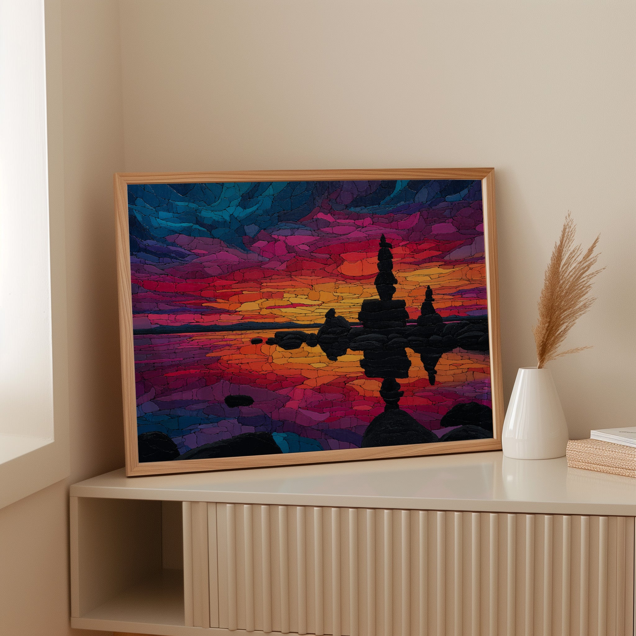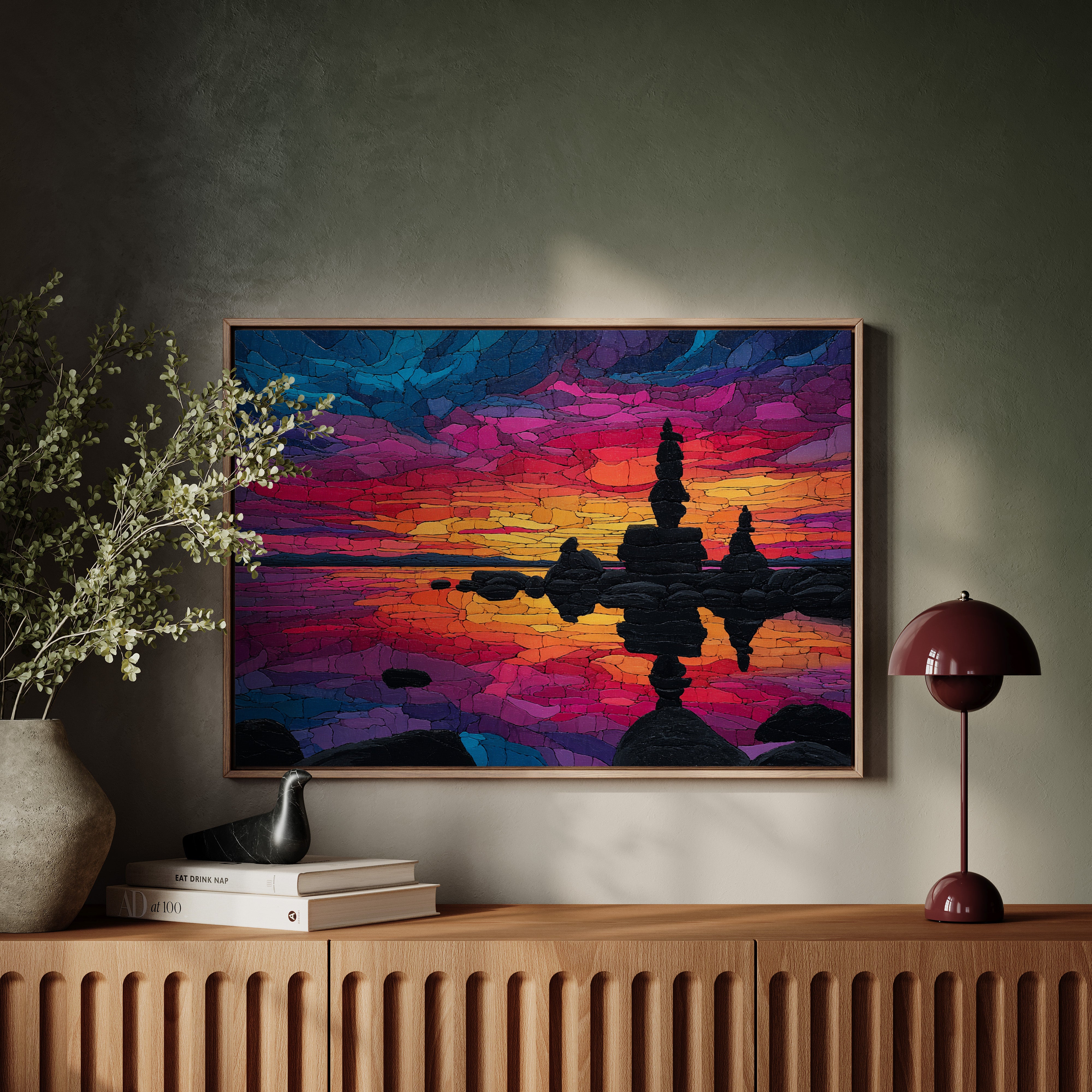 Silhouetted against a blazing horizon, balanced stones stand like ancient sentinels marking time's passage. The sky fractures into a mesmerizing mosaic of deep blues, vibrant magentas, and molten golds, each color bleeding into the next like stained glass caught in sunset's final breath. The calm waters mirror this celestial display, creating a perfect reflection where dark stone sculptures appear to float between two worlds. This piece captures the meditative practice of stone stacking against nature's most spectacular light show.
