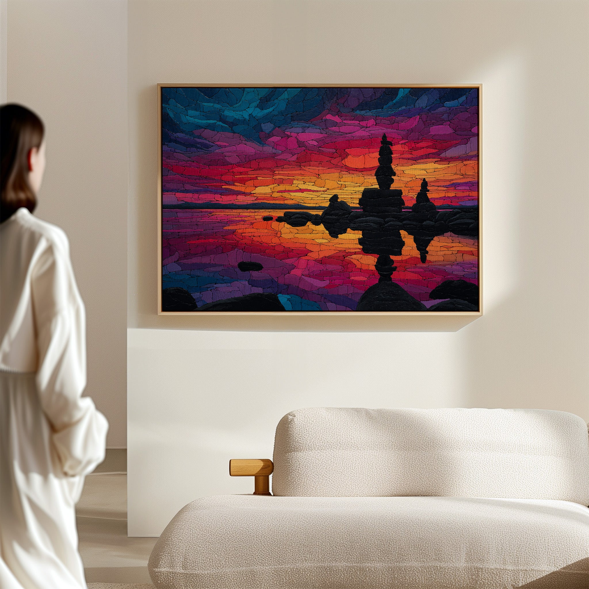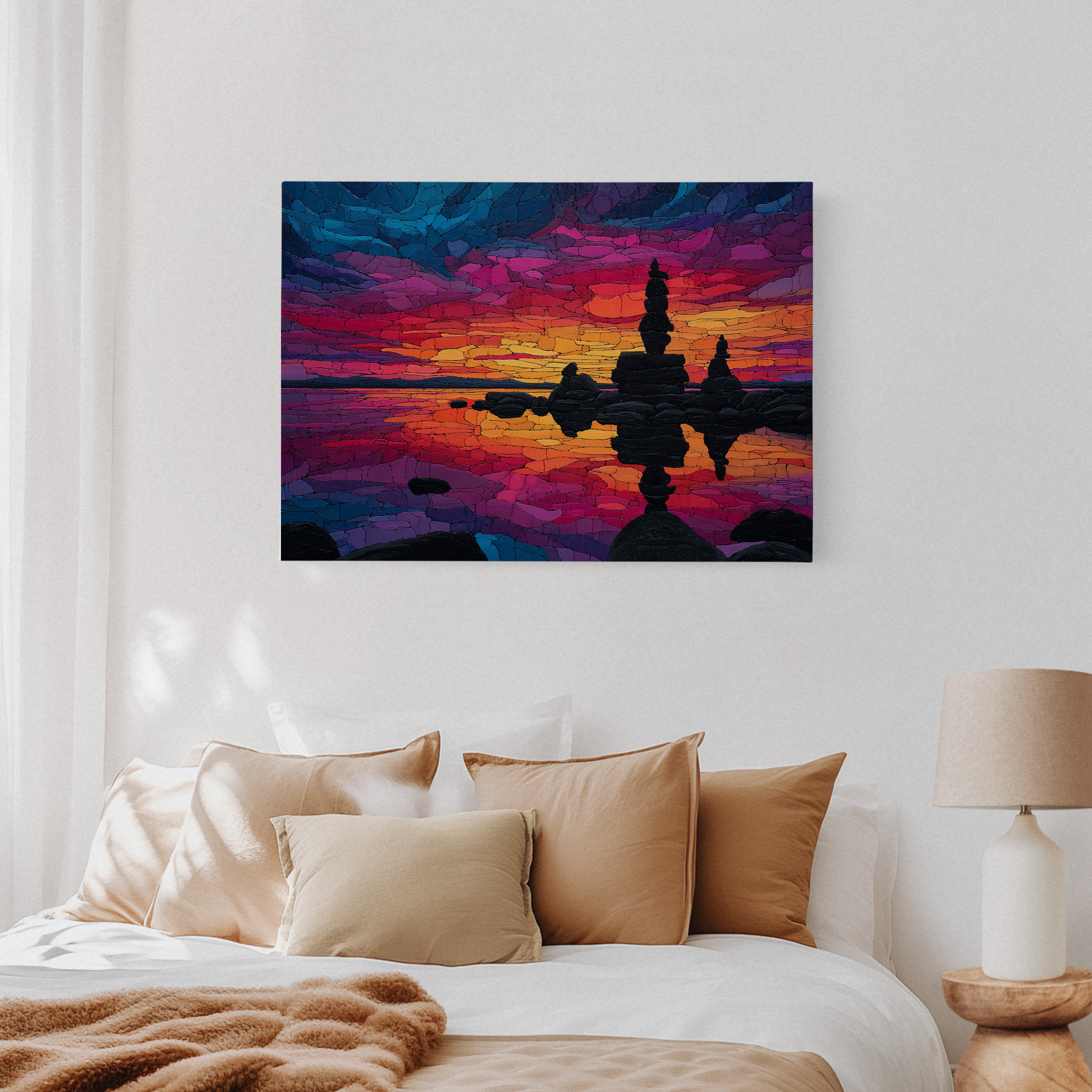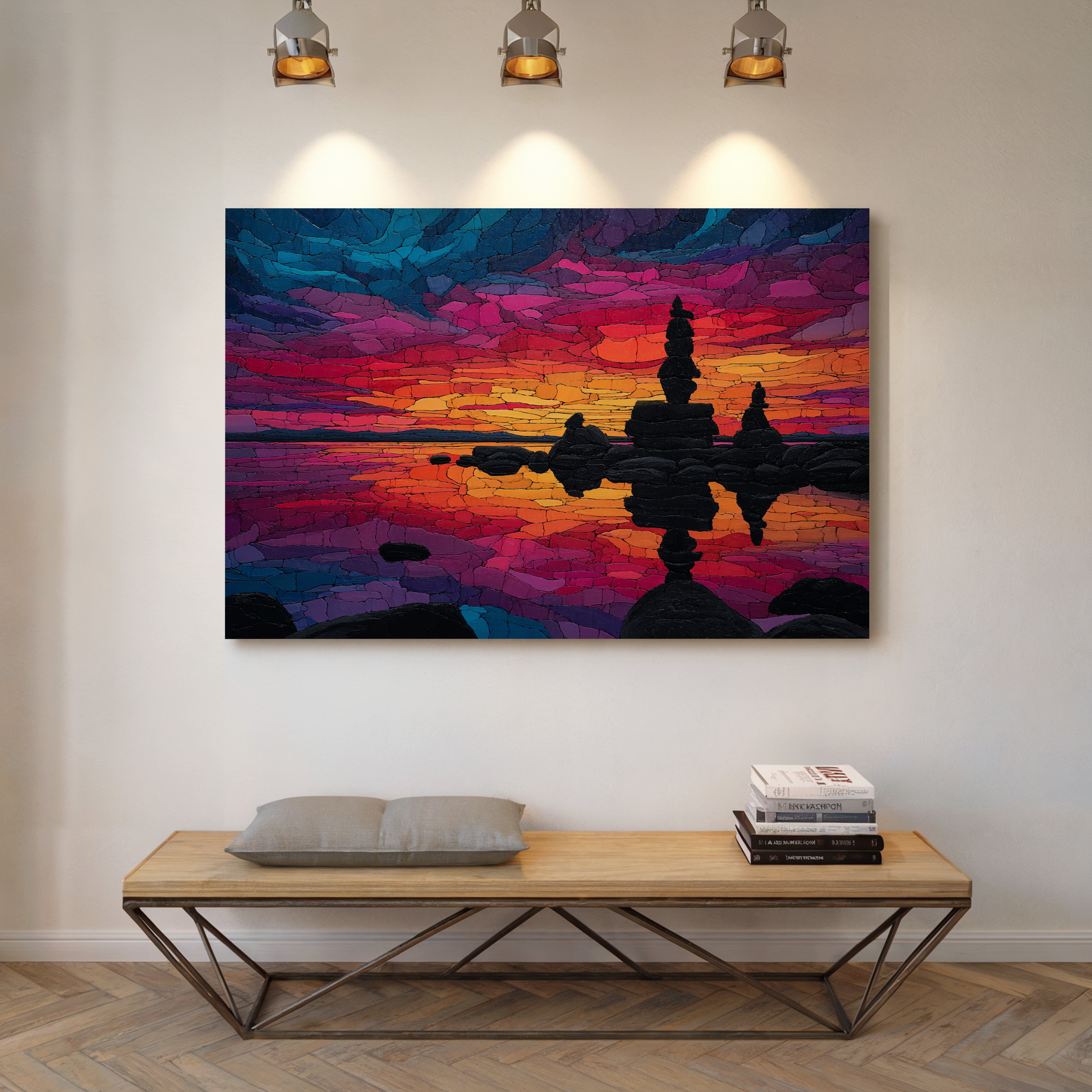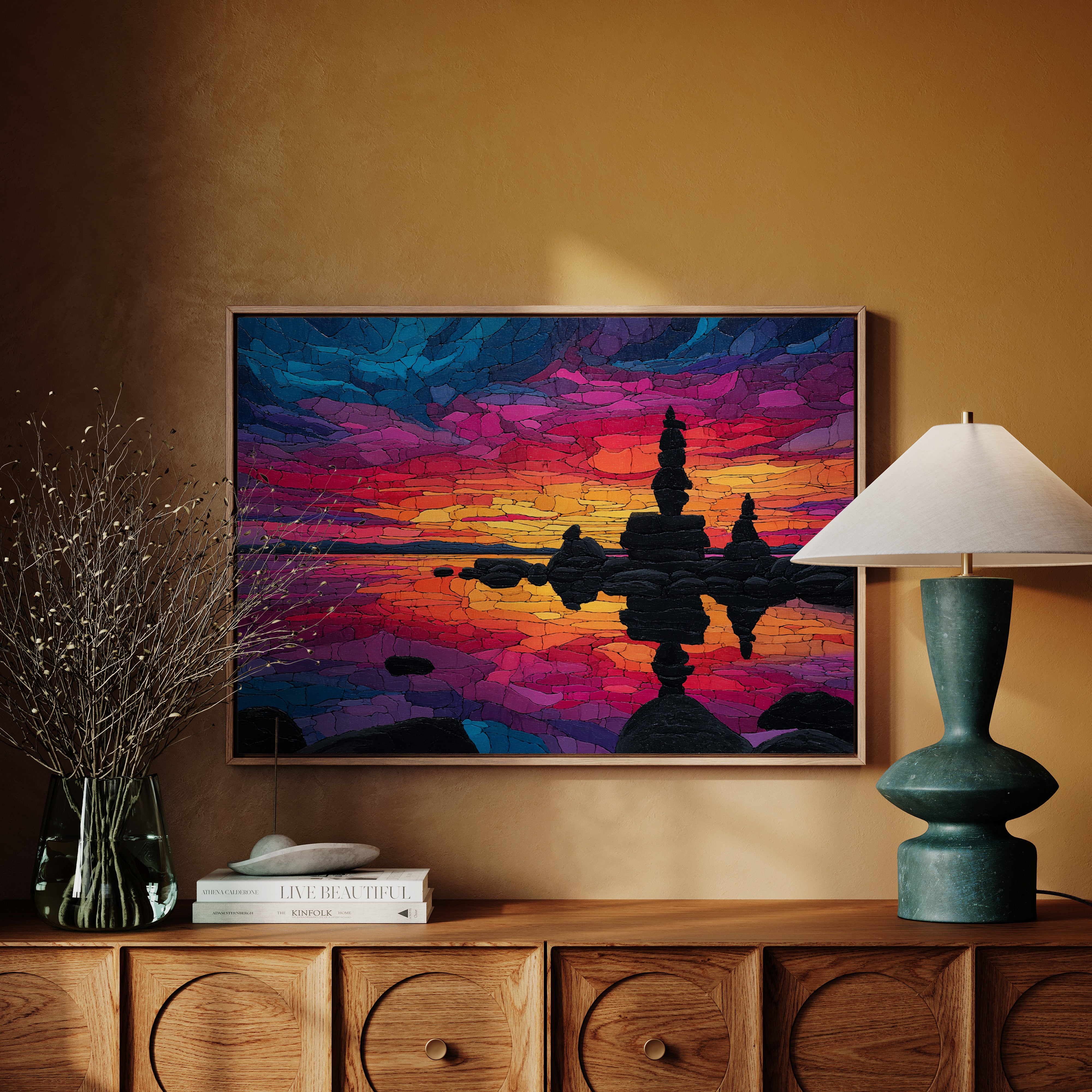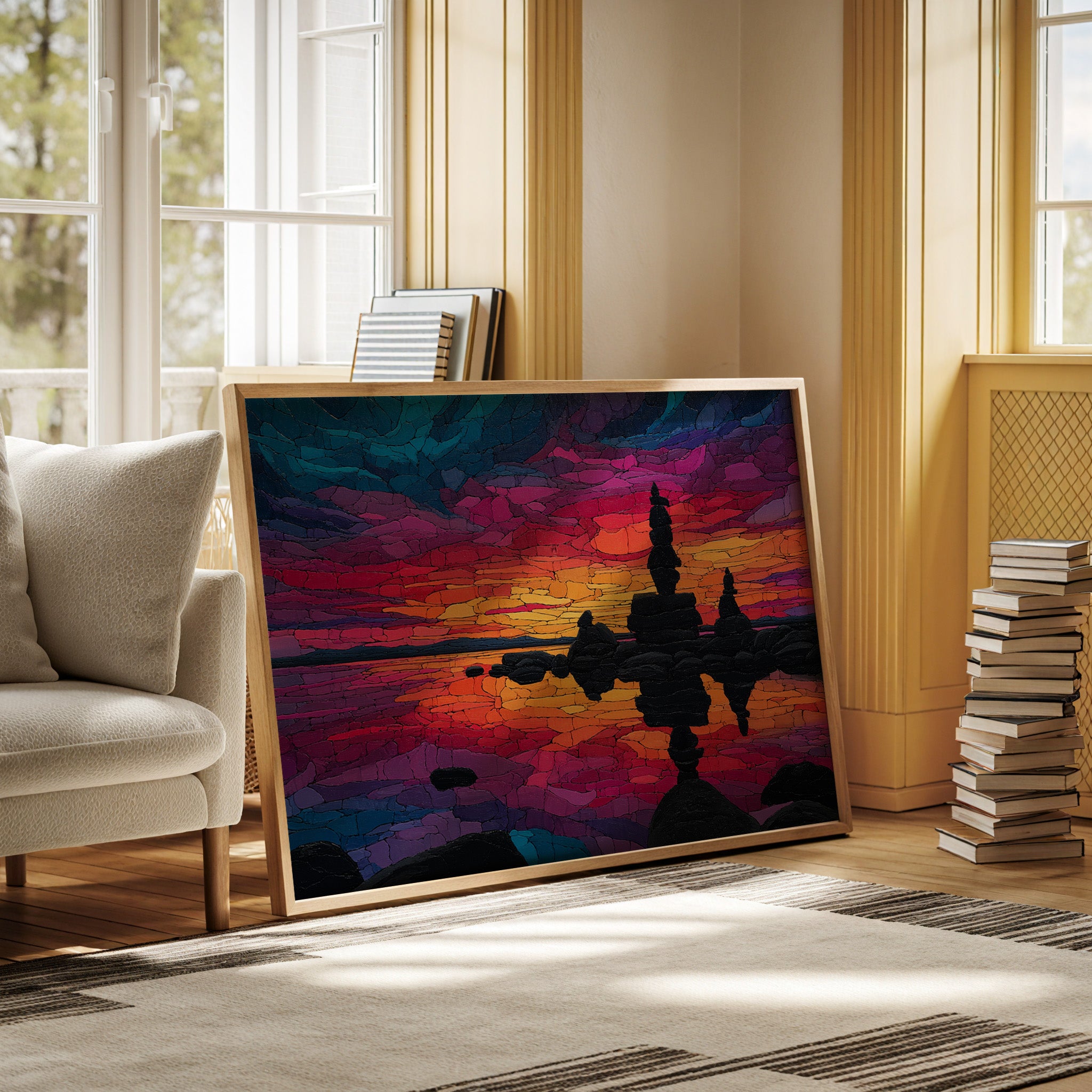 Silhouetted against a blazing horizon, balanced stones stand like ancient sentinels marking time's passage. The sky fractures into a mesmerizing mosaic of deep blues, vibrant magentas, and molten golds, each color bleeding into the next like stained glass caught in sunset's final breath. The calm waters mirror this celestial display, creating a perfect reflection where dark stone sculptures appear to float between two worlds. This piece captures the meditative practice of stone stacking against nature's most spectacular light show.