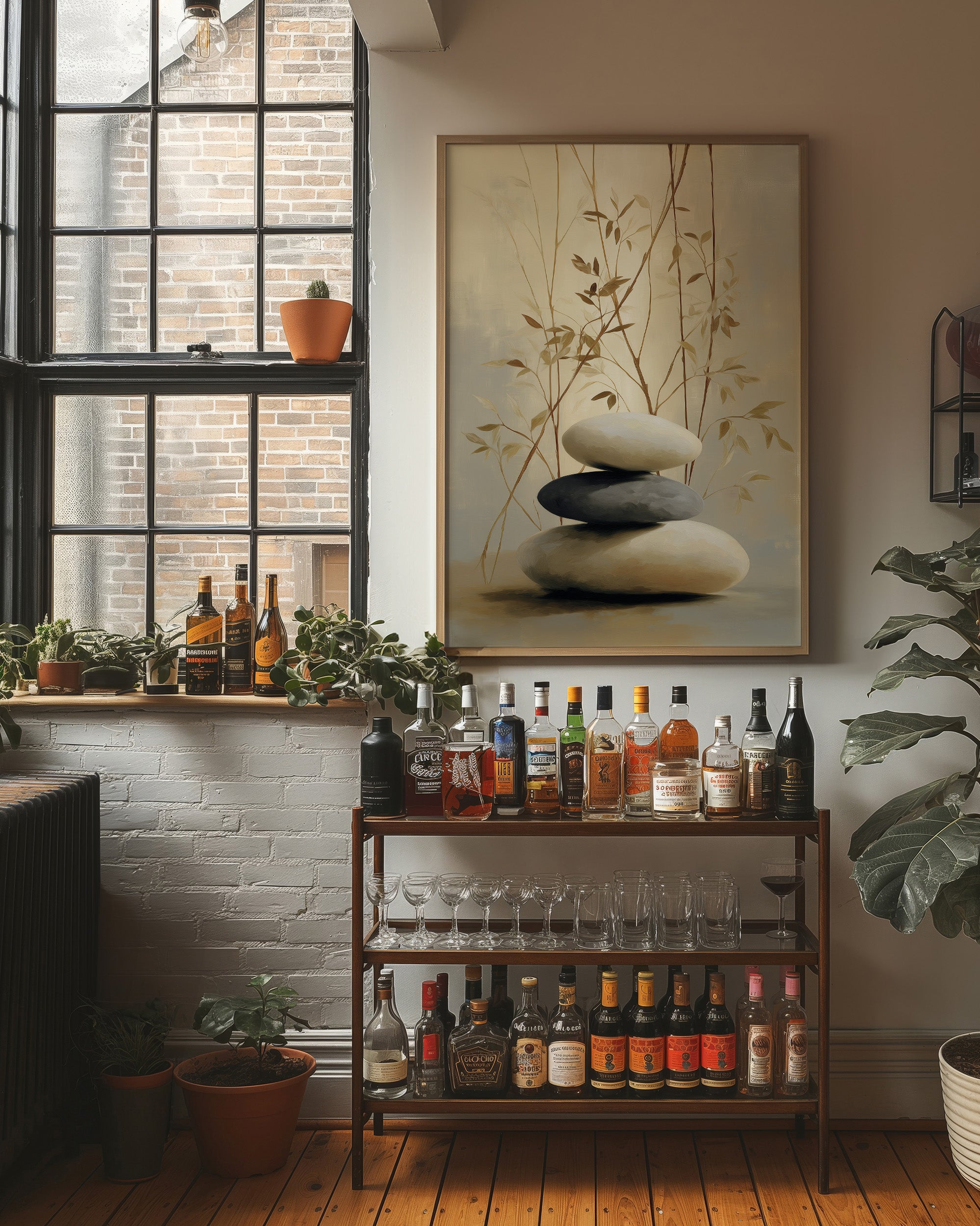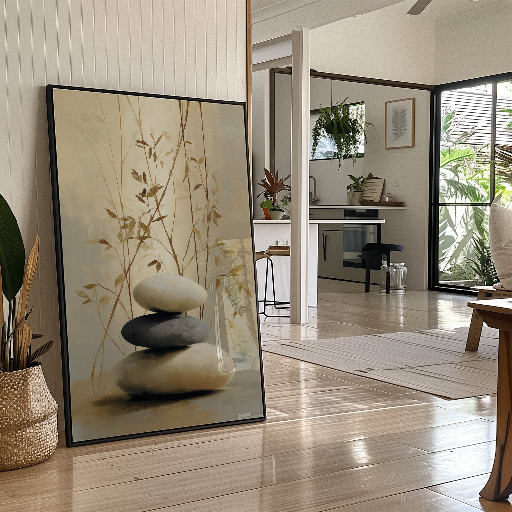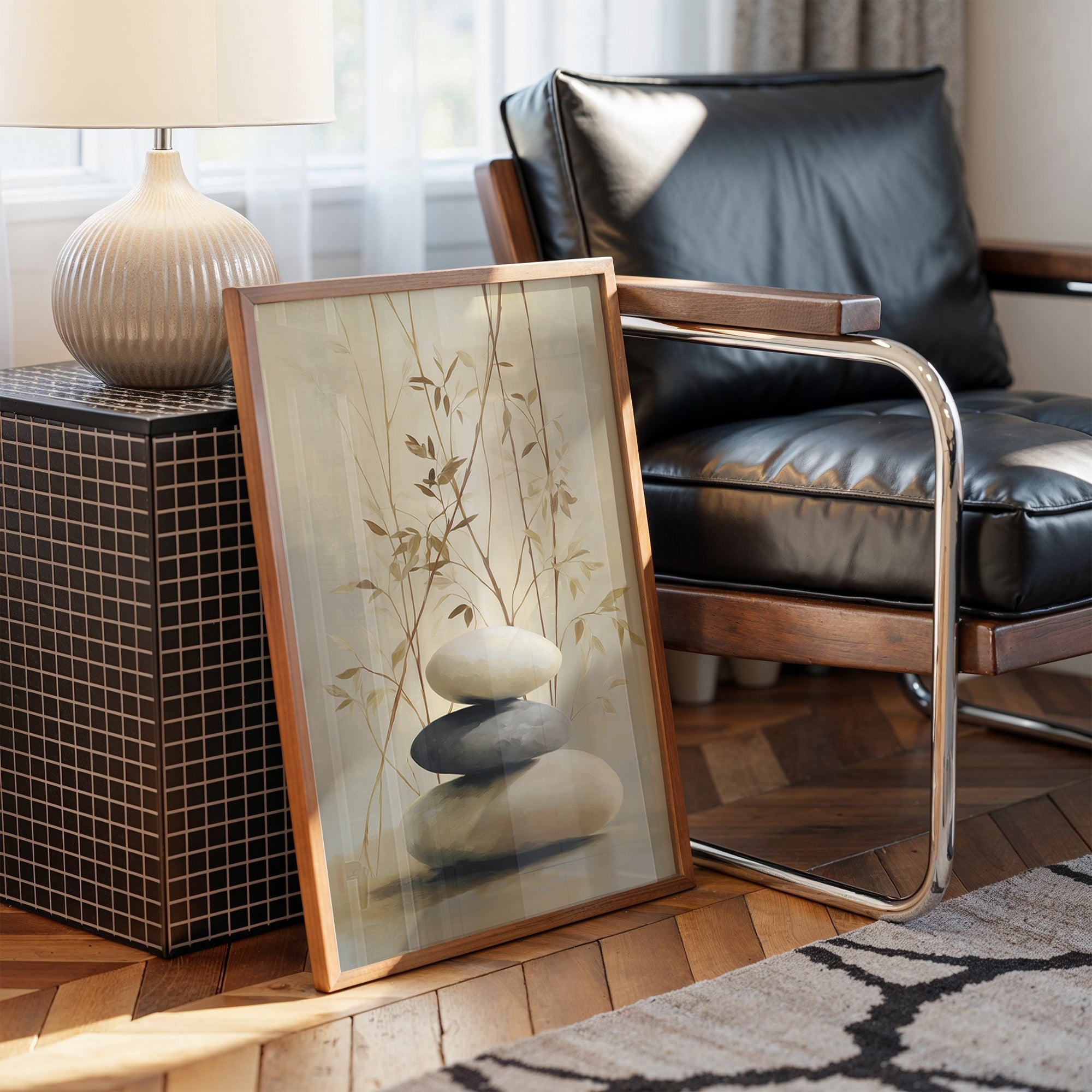 Morning light filters through delicate bamboo stems, casting gentle shadows across balanced stones. The composition speaks of serenity and balance, with smooth river rocks stacked in perfect harmony against a soft, misty backdrop of golden botanical silhouettes. The natural elements merge in a thoughtful arrangement that captures both strength and gentleness, highlighted by warm neutral tones and organic textures. This piece would bring a sense of calm to a meditation space or reading nook, offering a peaceful focal point that invites contemplation and mindfulness.