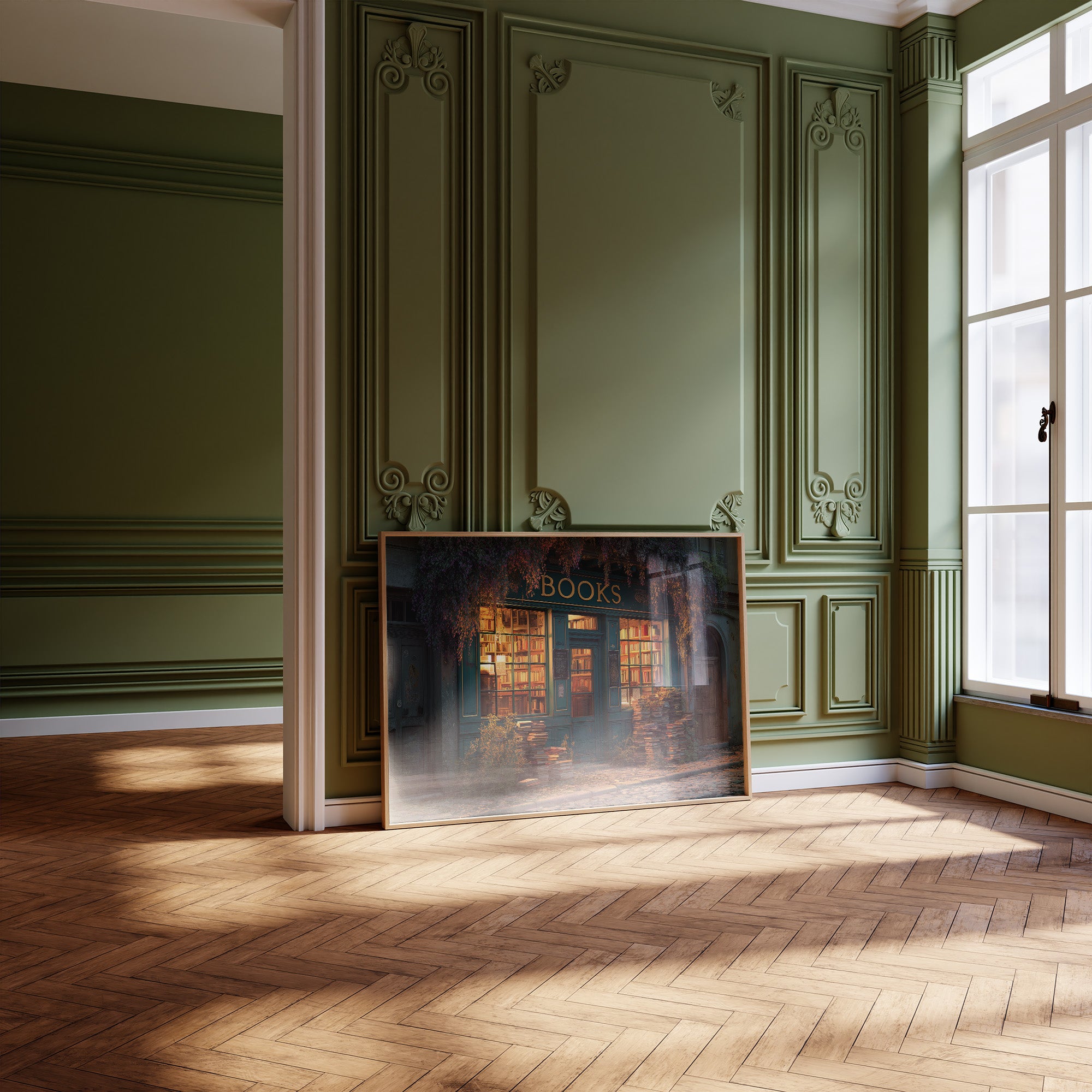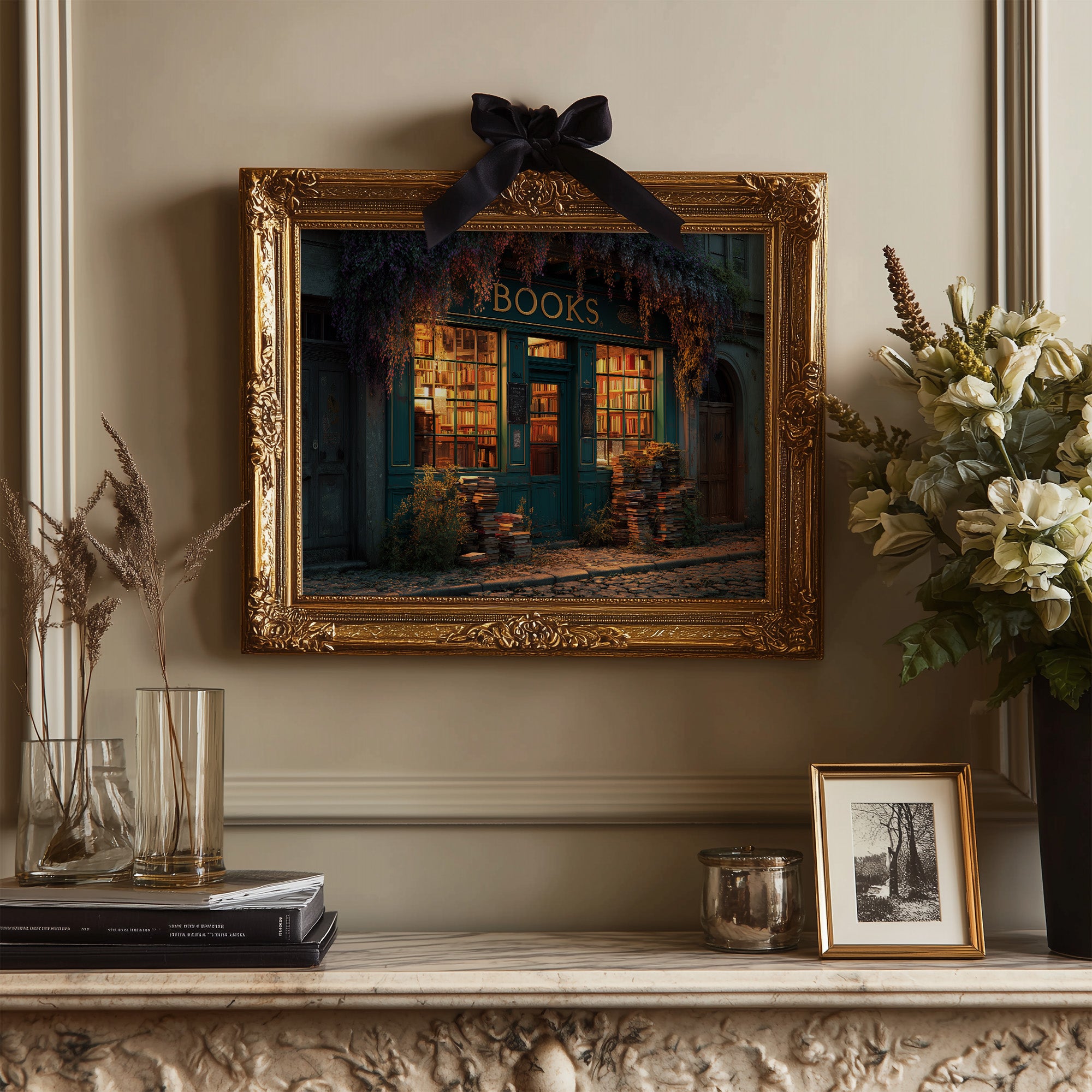 Warm golden light spills from an enchanted bookstore, inviting passersby into its literary haven. The teal facade stands in charming contrast to cascading vines and carefully stacked volumes that promise adventures yet undiscovered. Rich emerald tones and amber illumination create a nostalgic sanctuary where time seems to slow among cobblestone streets and literary treasures.