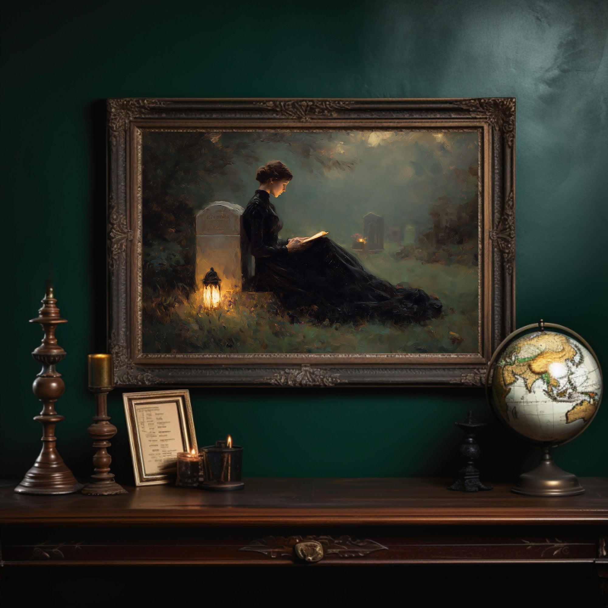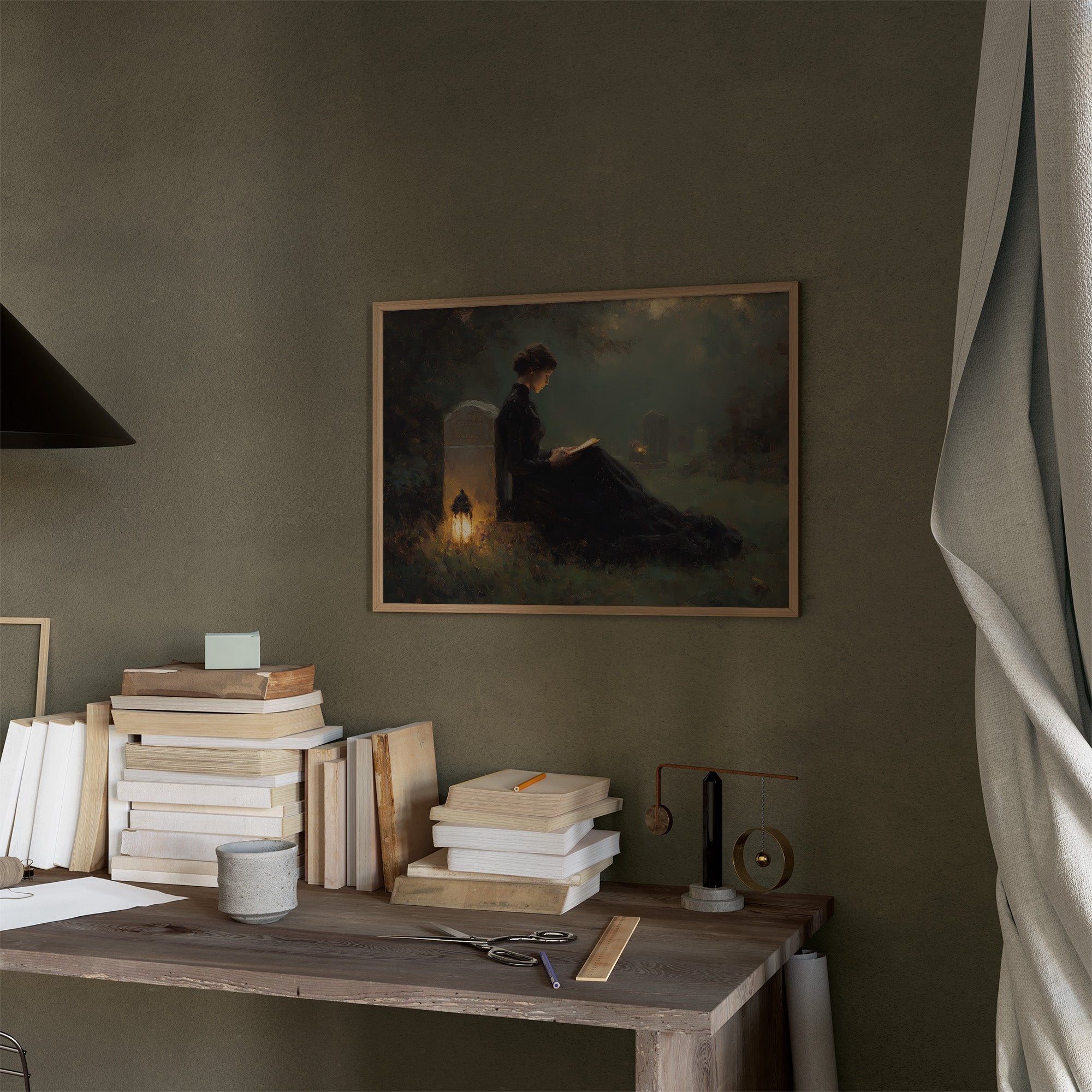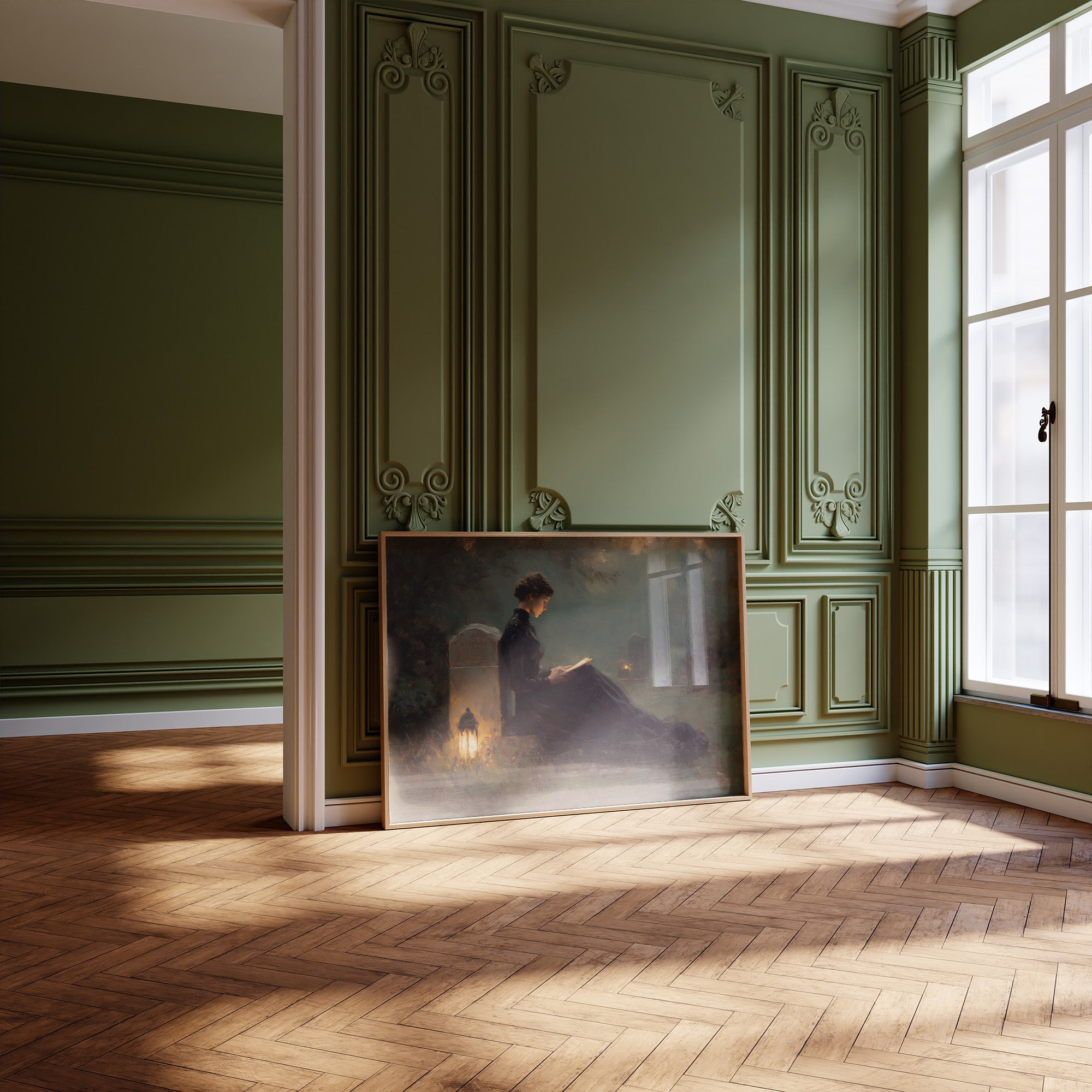 The soft glow of a lantern illuminates a moment frozen in time, a figure lost in literary reverie amid the stillness of twilight. Rich emerald tones and amber light create an atmosphere of contemplative solitude, the painted scene nestled among real volumes that seem to continue its narrative beyond the frame. This classical portrait finds its perfect home against wooden bookshelves, bringing a touch of romantic nostalgia to a study, reading nook, or any space where stories and silence intertwine.