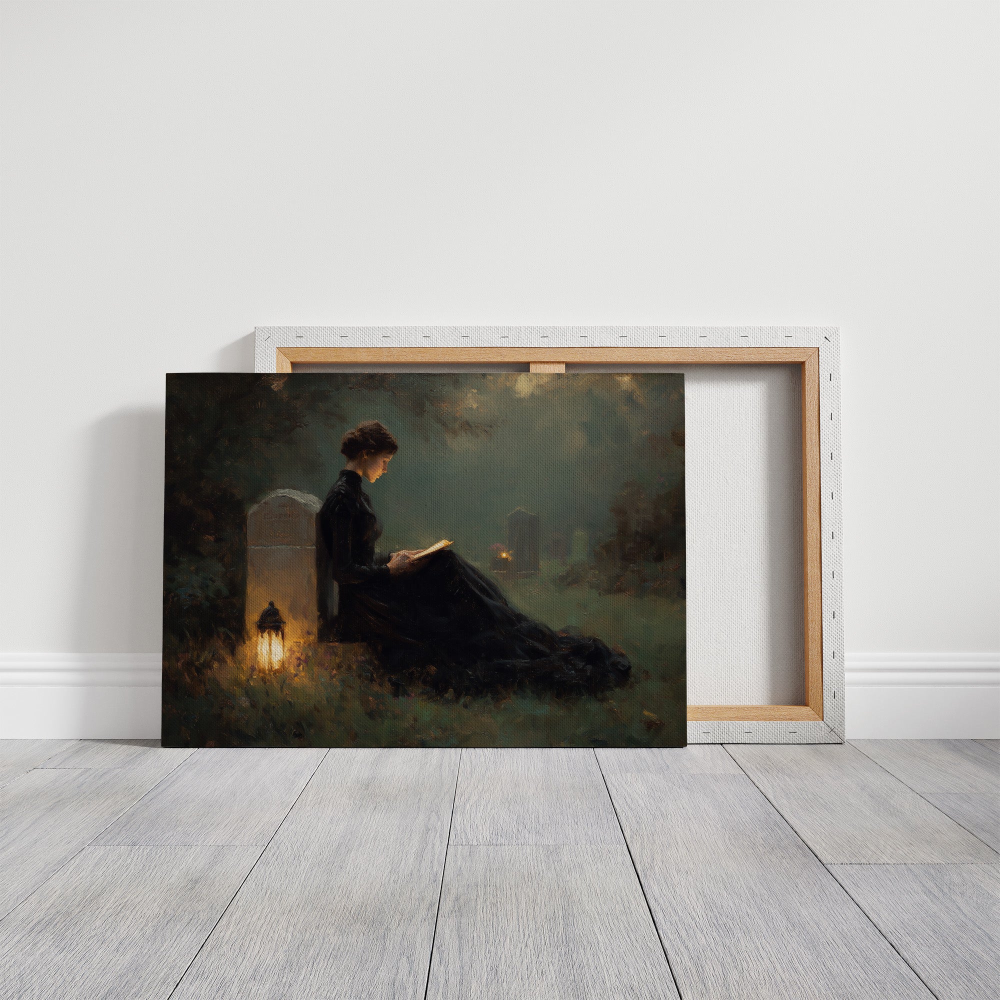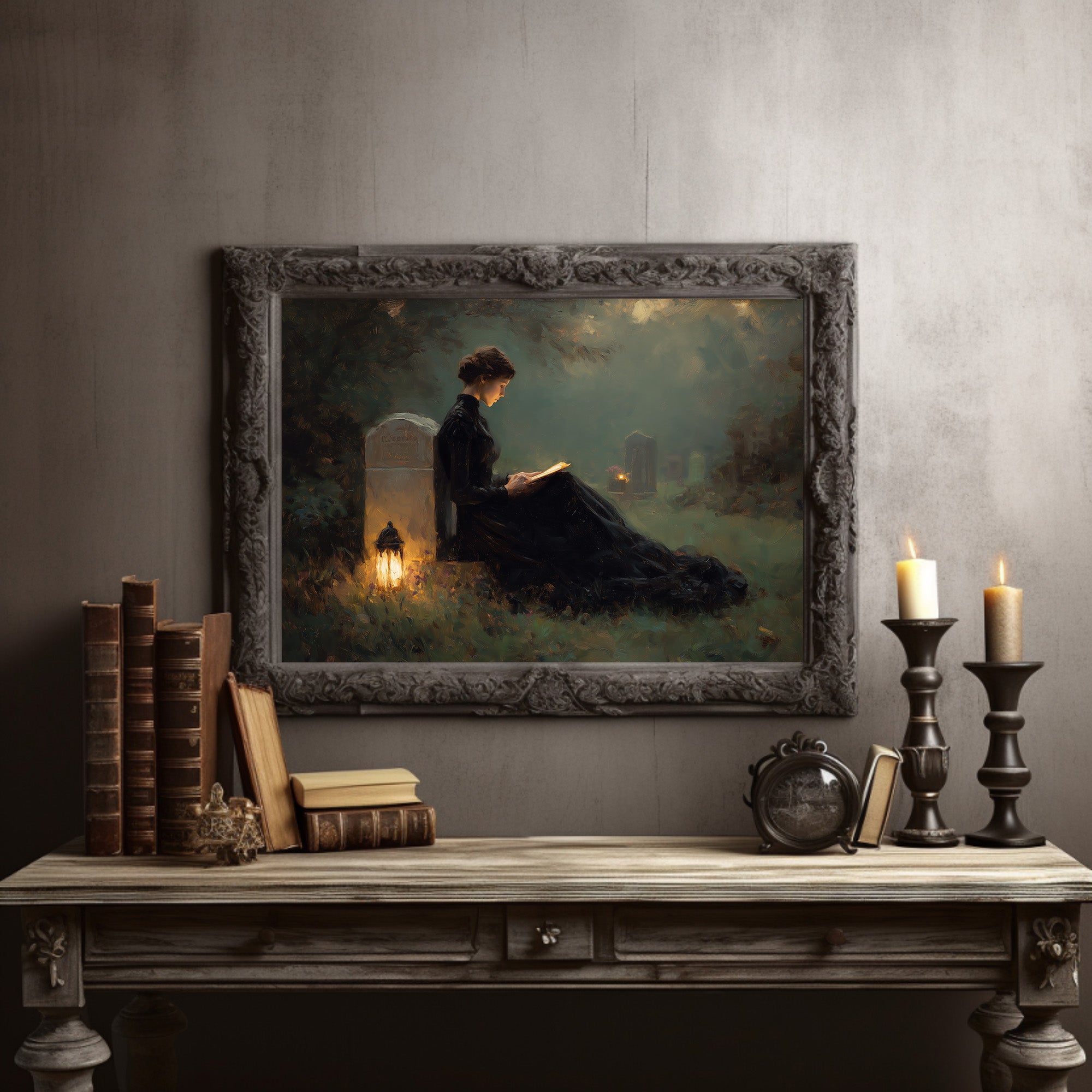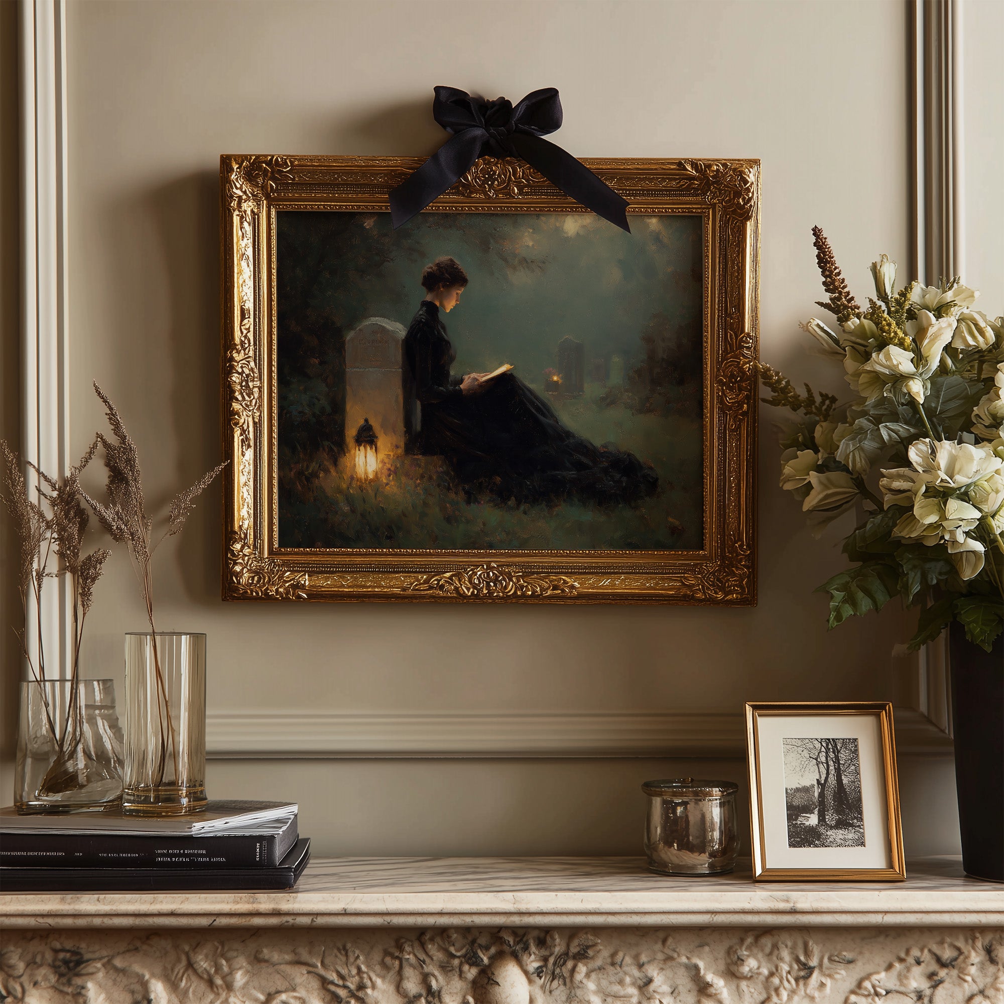 The soft glow of a lantern illuminates a moment frozen in time, a figure lost in literary reverie amid the stillness of twilight. Rich emerald tones and amber light create an atmosphere of contemplative solitude, the painted scene nestled among real volumes that seem to continue its narrative beyond the frame. This classical portrait finds its perfect home against wooden bookshelves, bringing a touch of romantic nostalgia to a study, reading nook, or any space where stories and silence intertwine.