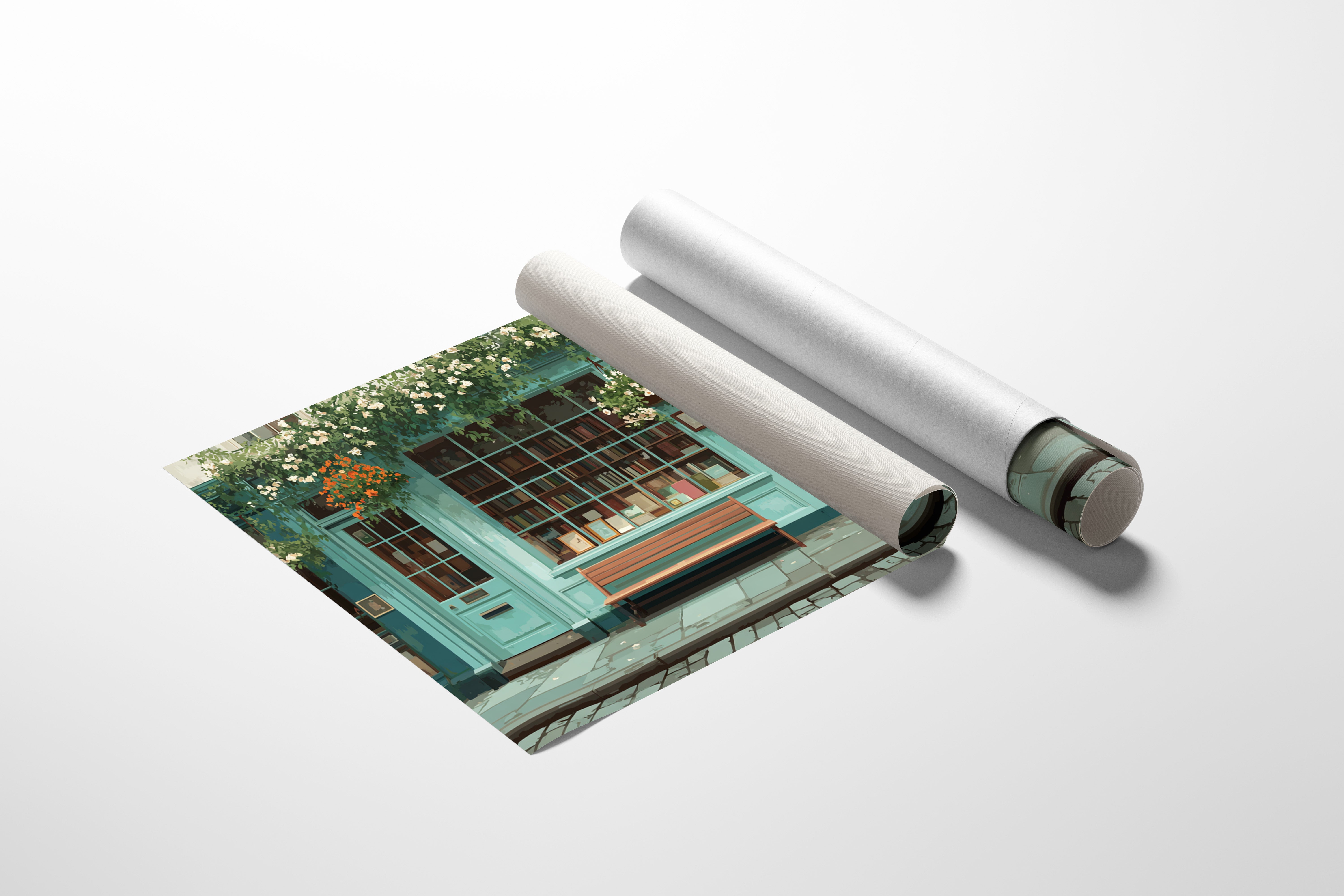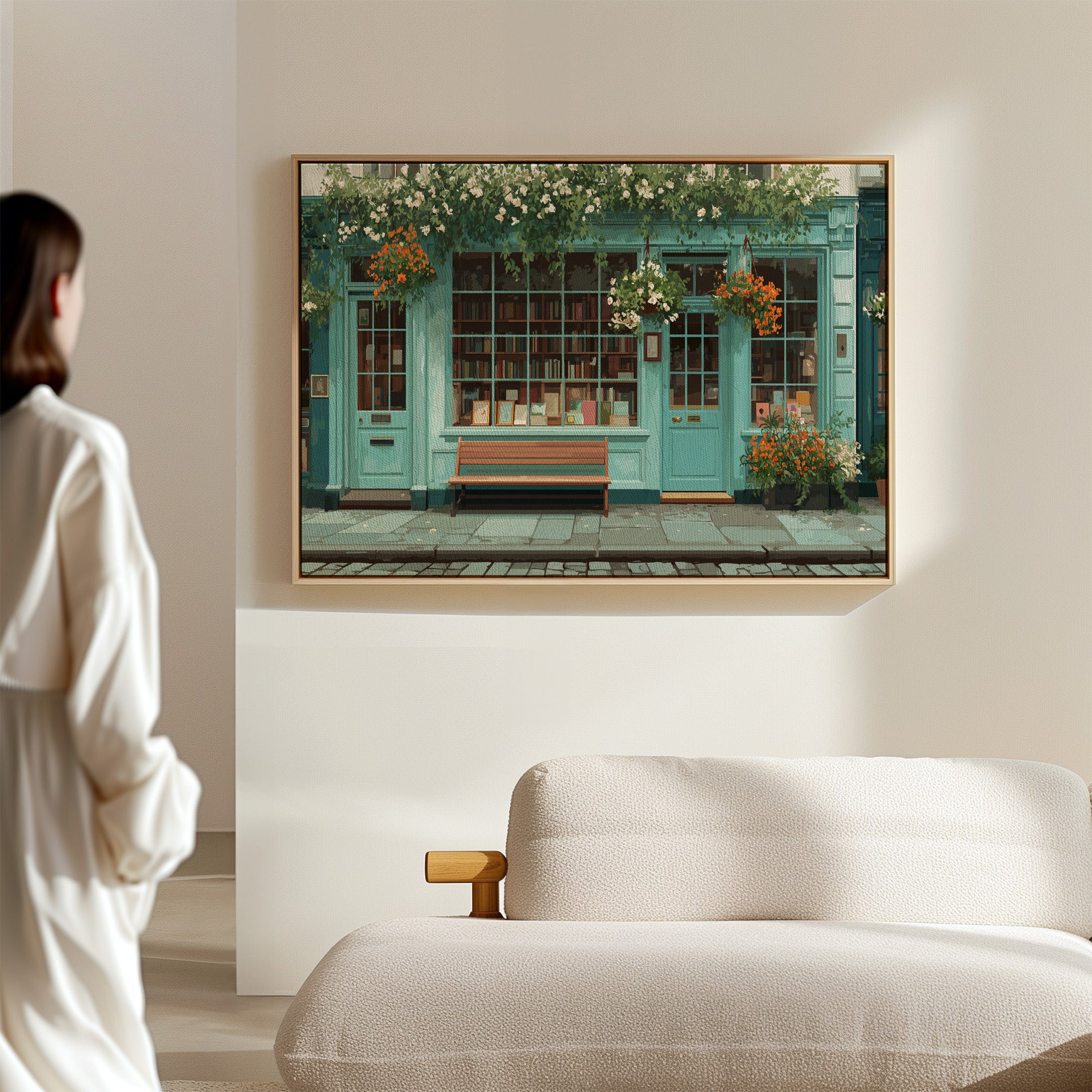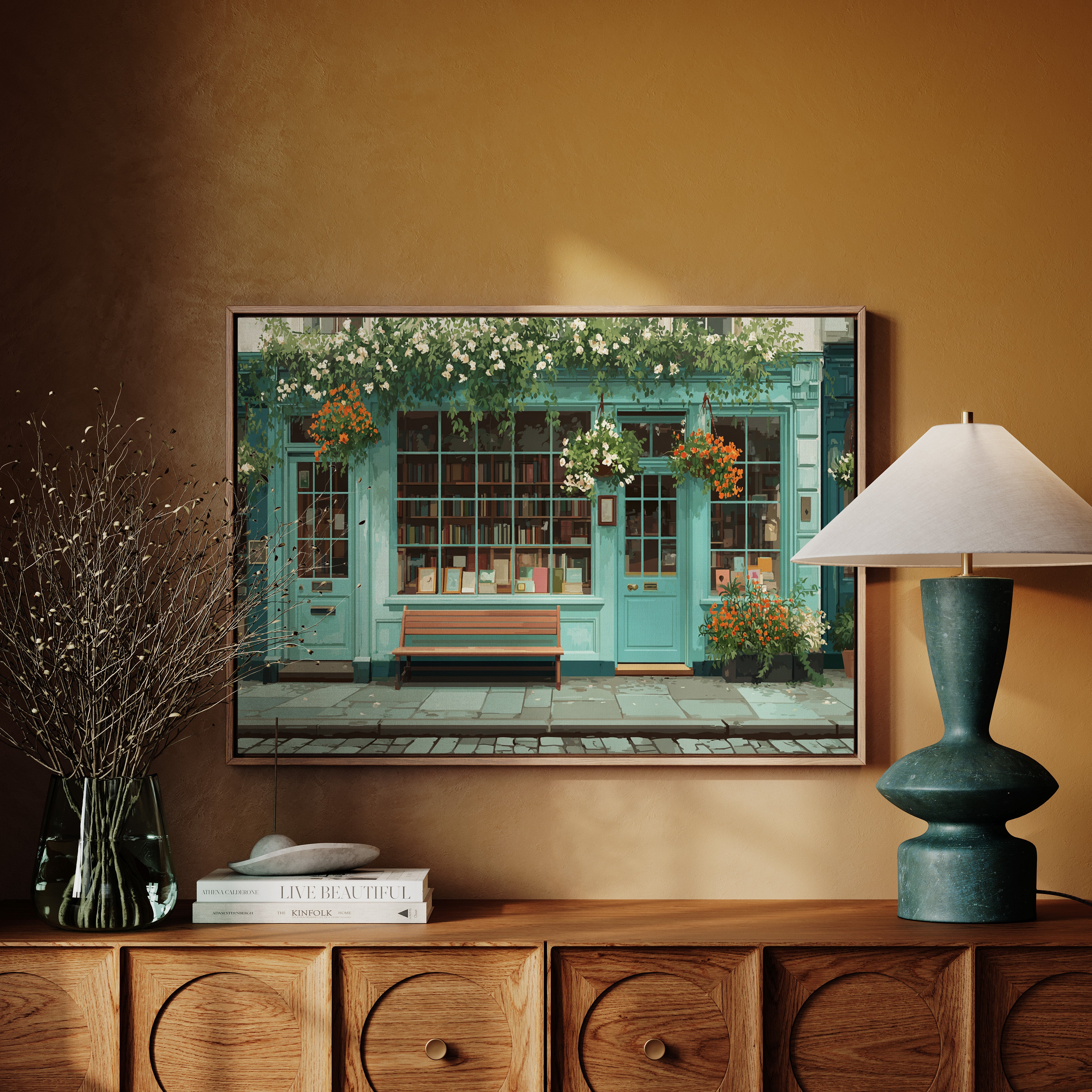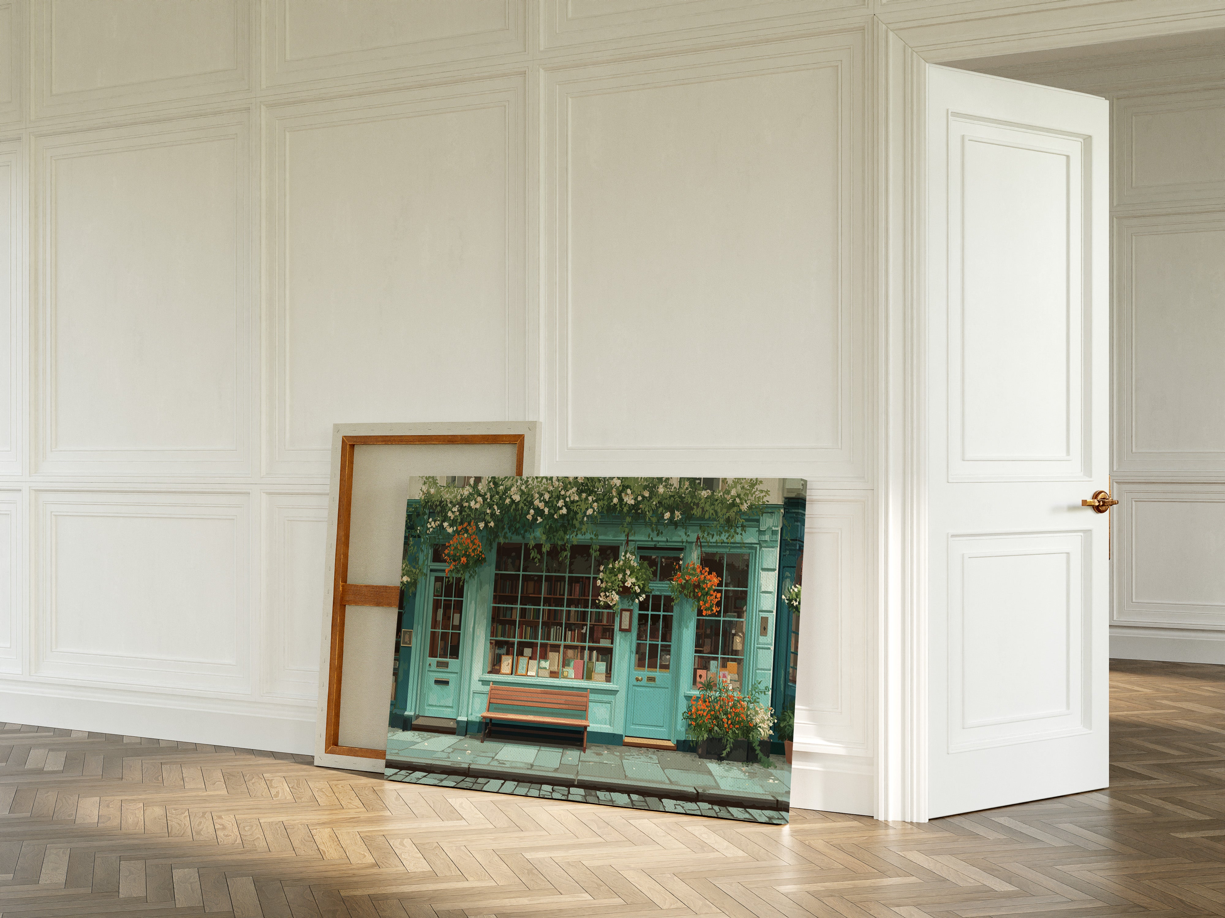 A charming turquoise storefront invites passersby to pause and dream among cascading flowers and weathered pages. Cream and orange blooms spill from hanging baskets, creating a living frame for windows filled with literary treasures. Behind antique glass panes, bookshelves stretch from floor to ceiling, their spines telling tales of adventures yet to be discovered. A simple wooden bench offers a moment of respite, as if waiting for the next reader to stop and contemplate their next literary journey. This scene would bring a touch of literary romance to a reading nook, home library, or any space where stories and nature intertwine.