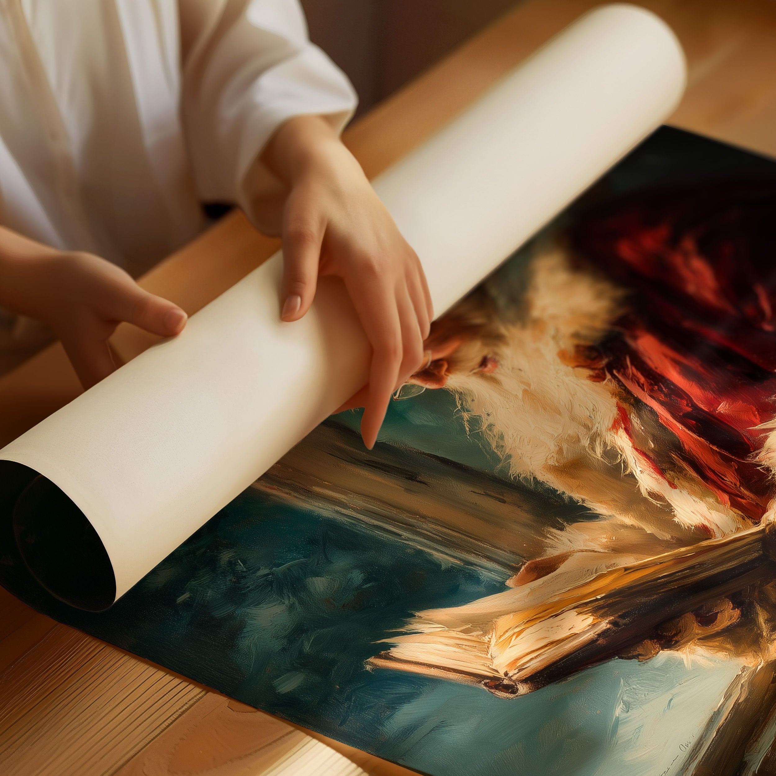 In the soft glow of a winter evening, a moment of quiet contemplation unfolds. Rich crimson velvet and ivory fur frame a scene of peaceful solitude, as pages turn beneath the ethereal blue-green light of a frost-touched window. The classical composition draws us into an intimate narrative, where tradition and wonder intertwine in the depths of December darkness. This evocative piece transforms any room into a sanctuary of seasonal storytelling and timeless holiday charm. Perfect for creating a focal point in living spaces or adding a touch of nostalgic warmth to reading nooks during the winter months.