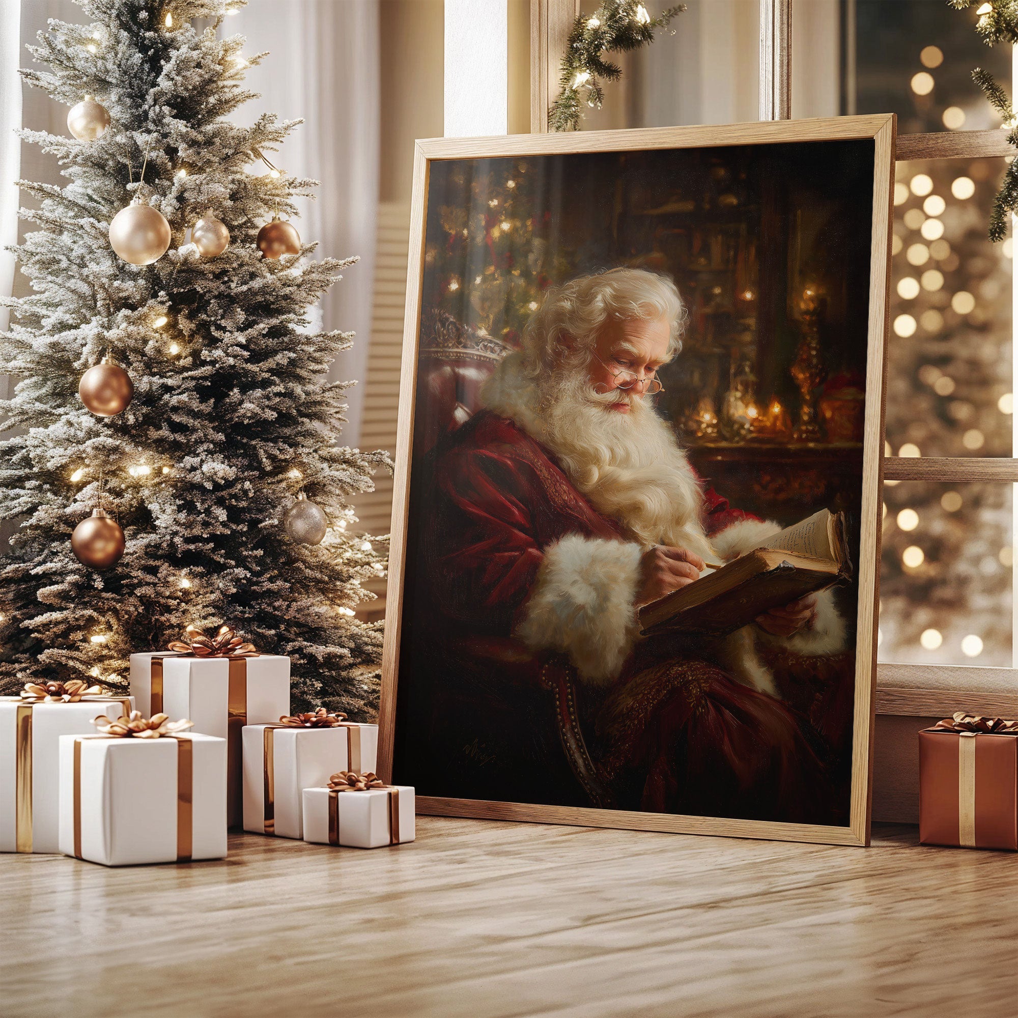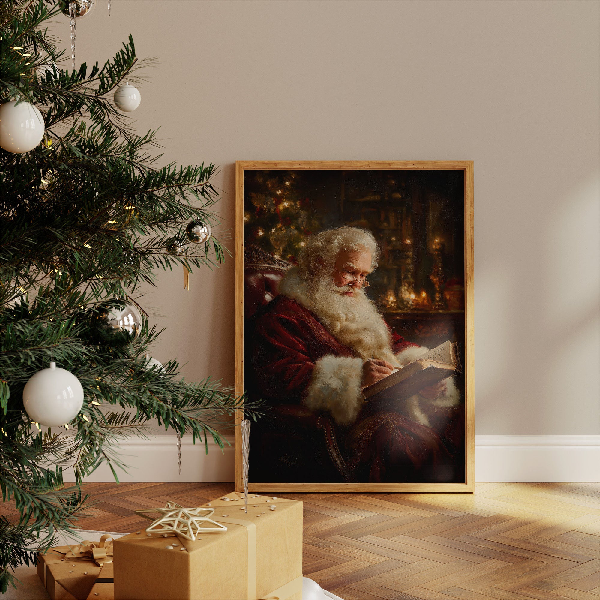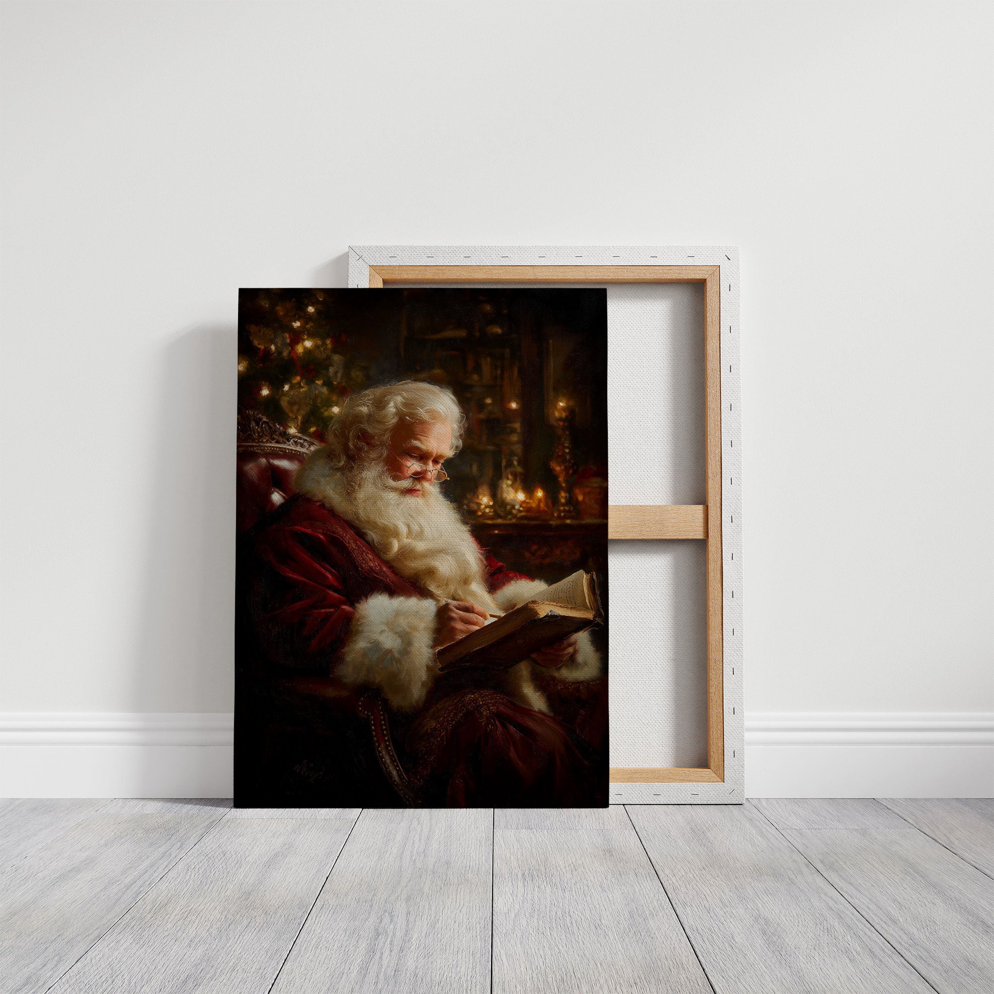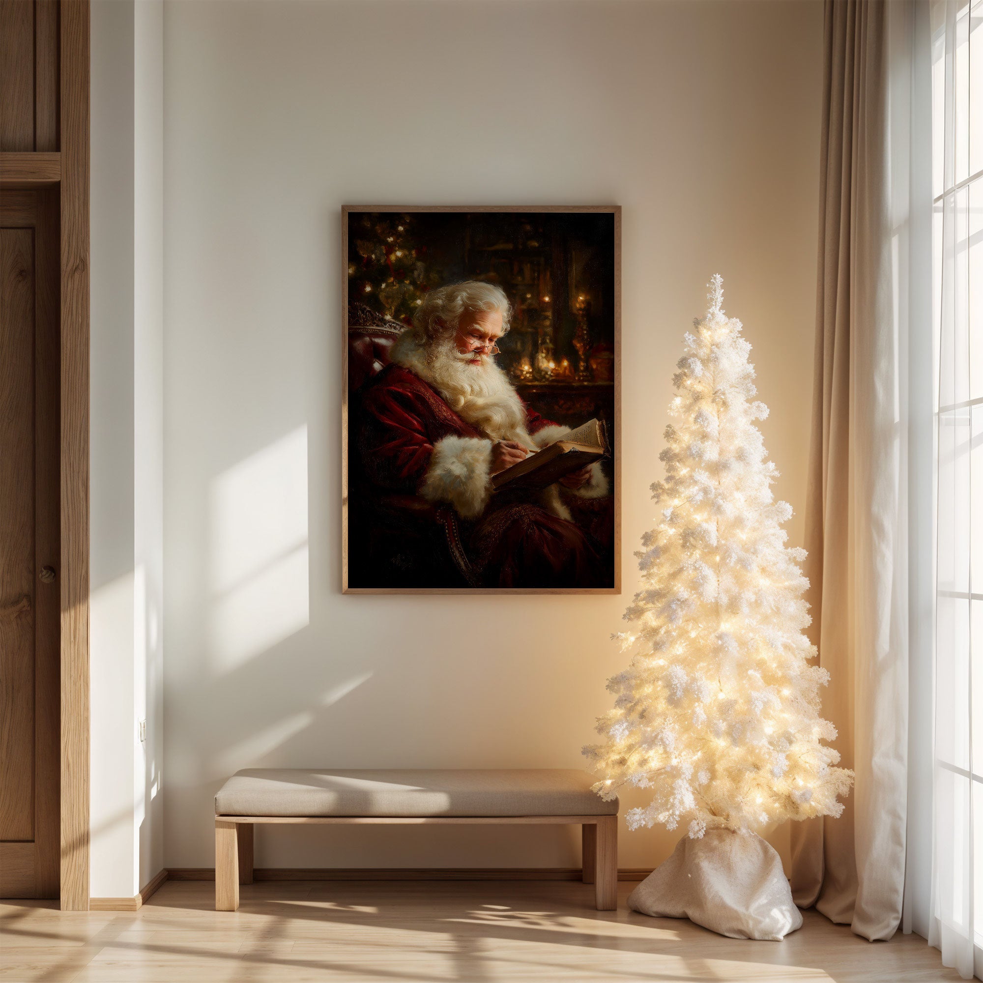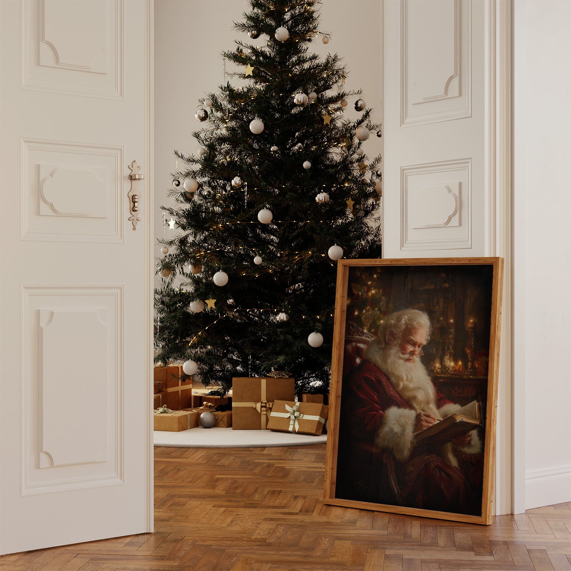 In the warm glow of a December evening, a timeless scene unfolds with gentle reverence. A figure in rich crimson velvet sits in contemplative stillness, carefully reviewing an ancient leather-bound tome while firelight dances across the pages. The scene radiates with seasonal warmth - from the soft twinkle of lights to the frost-dusted tree adorned with copper and pearl ornaments. This intimate moment captures the quiet magic that fills the air during the holiday season. Perfect for creating a festive focal point in living rooms, studies, or anywhere you want to infuse classic holiday charm. The warm color palette and nostalgic scene make it an ideal piece for seasonal decorating that still maintains sophistication.