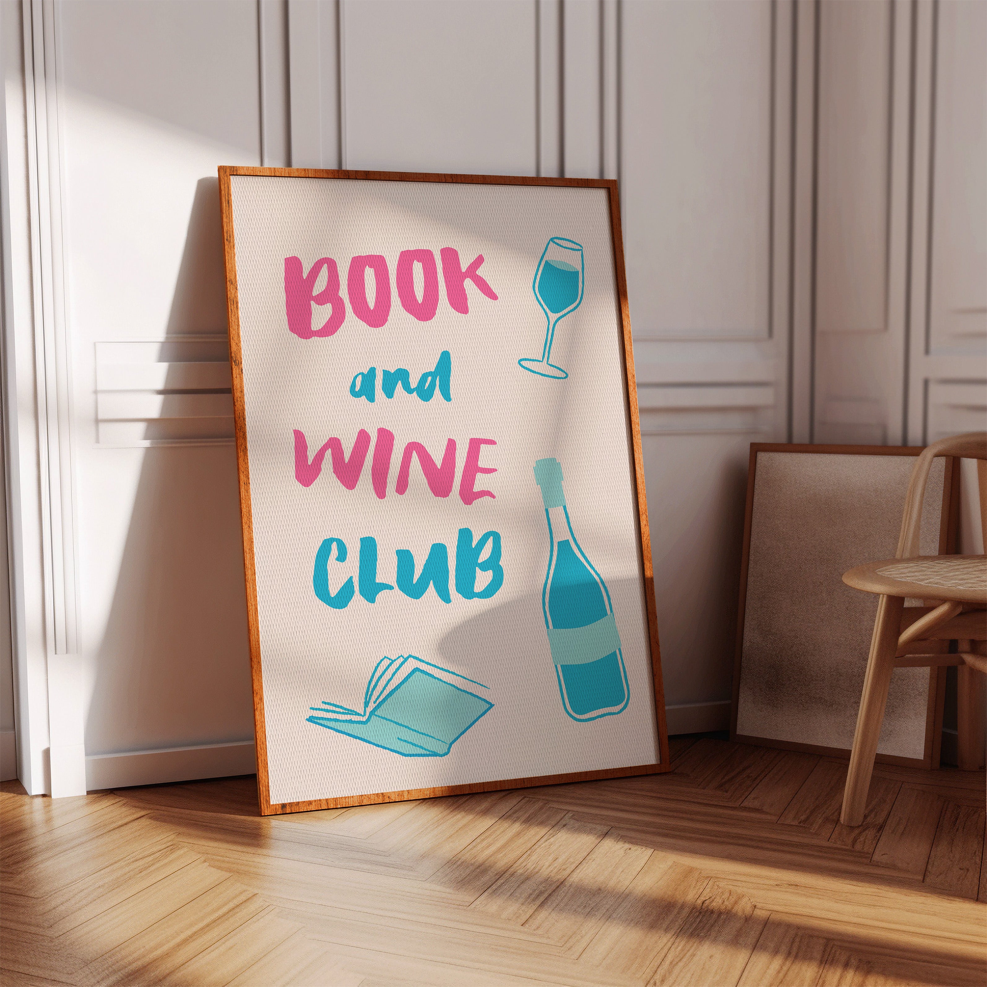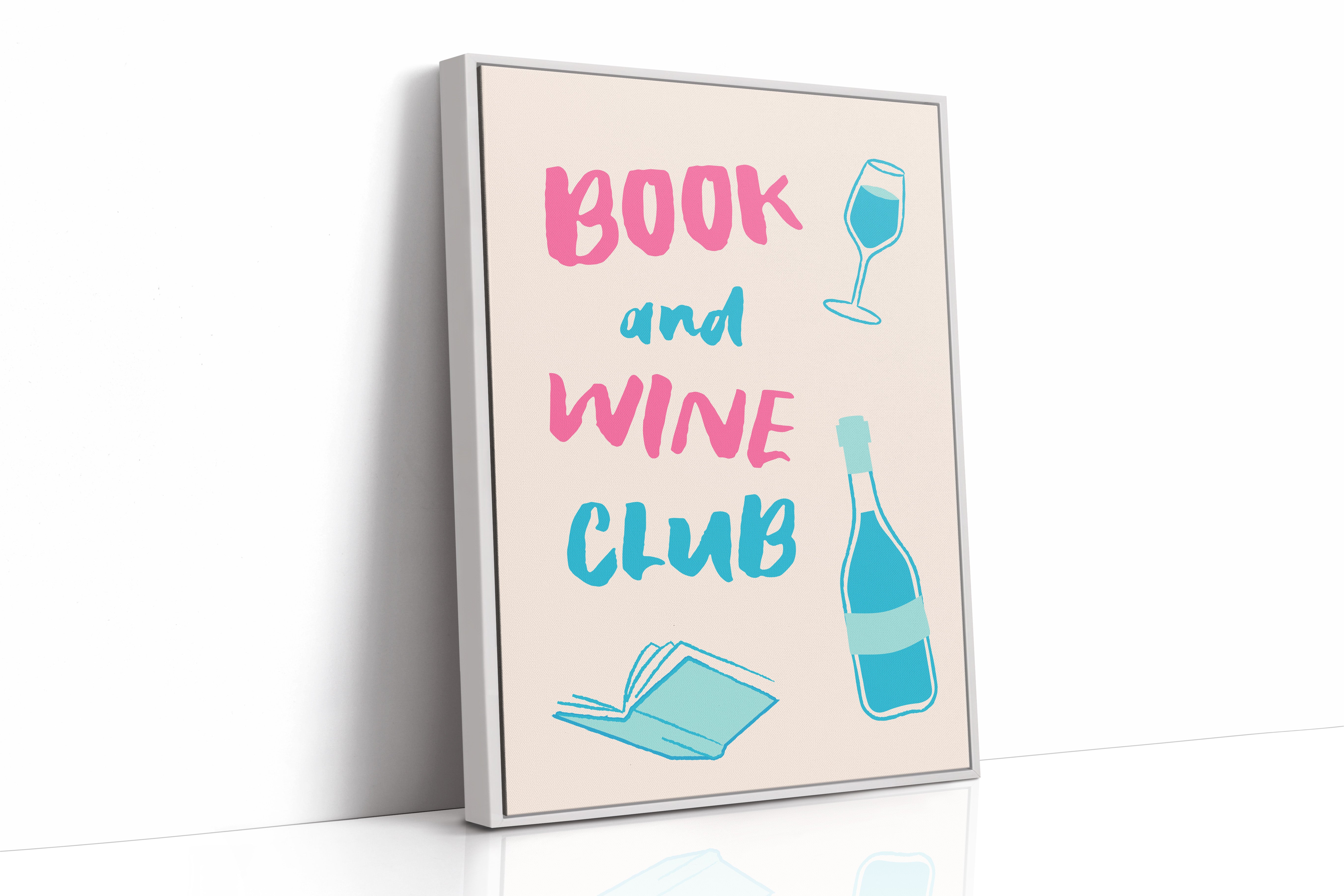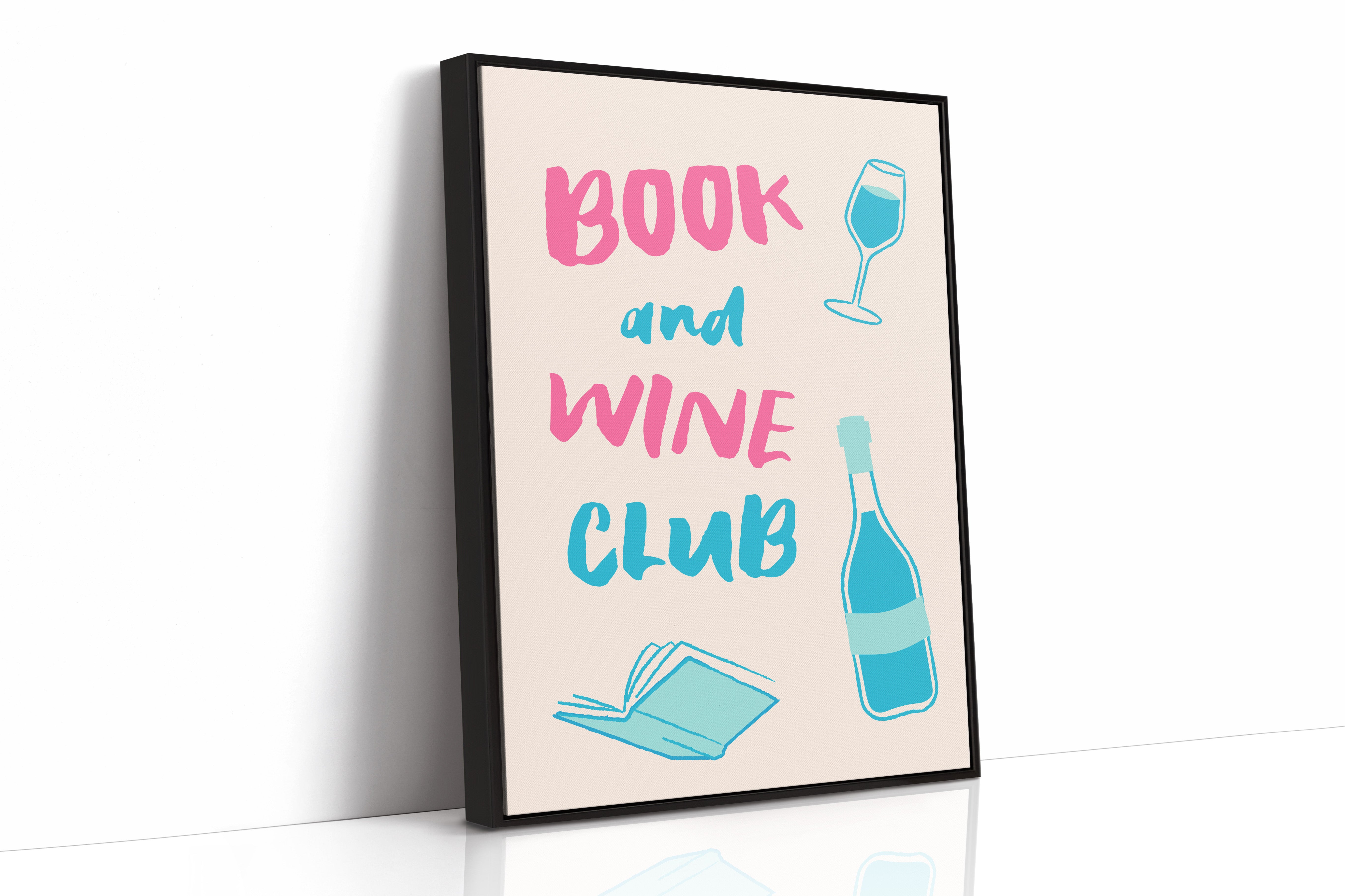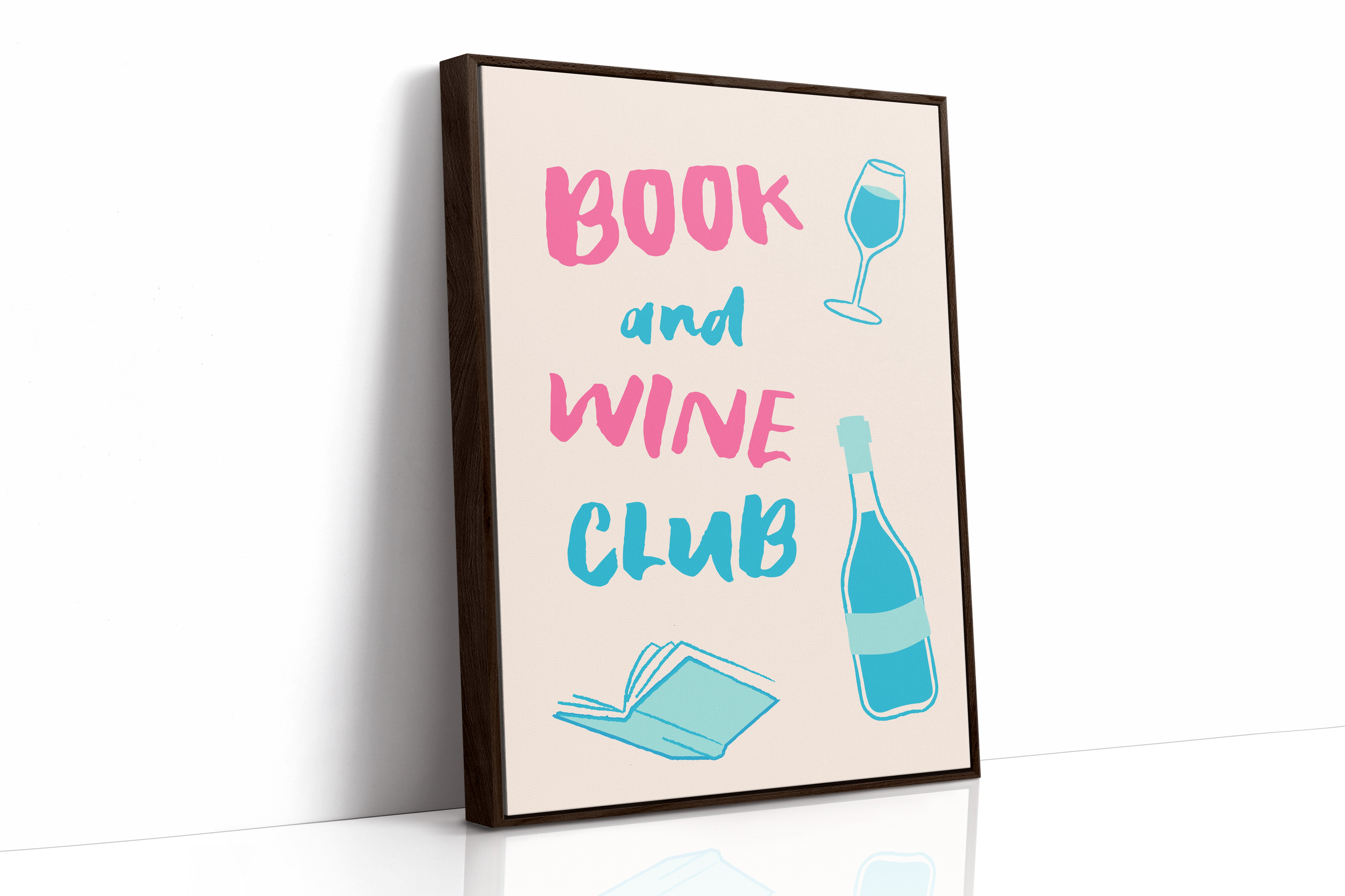 A playful celebration of life's perfect pairing captures the essence of relaxed sophistication. Bold pink letters dance with turquoise illustrations, creating a modern take on the timeless pleasure of reading with a glass of wine. The minimalist design speaks to quiet evenings and thoughtful moments, where literature and libations come together in perfect harmony. This piece would bring a spark of joy and invitation to any reading nook, home library, or kitchen wall, inspiring gatherings that blend intellectual discourse with social warmth.