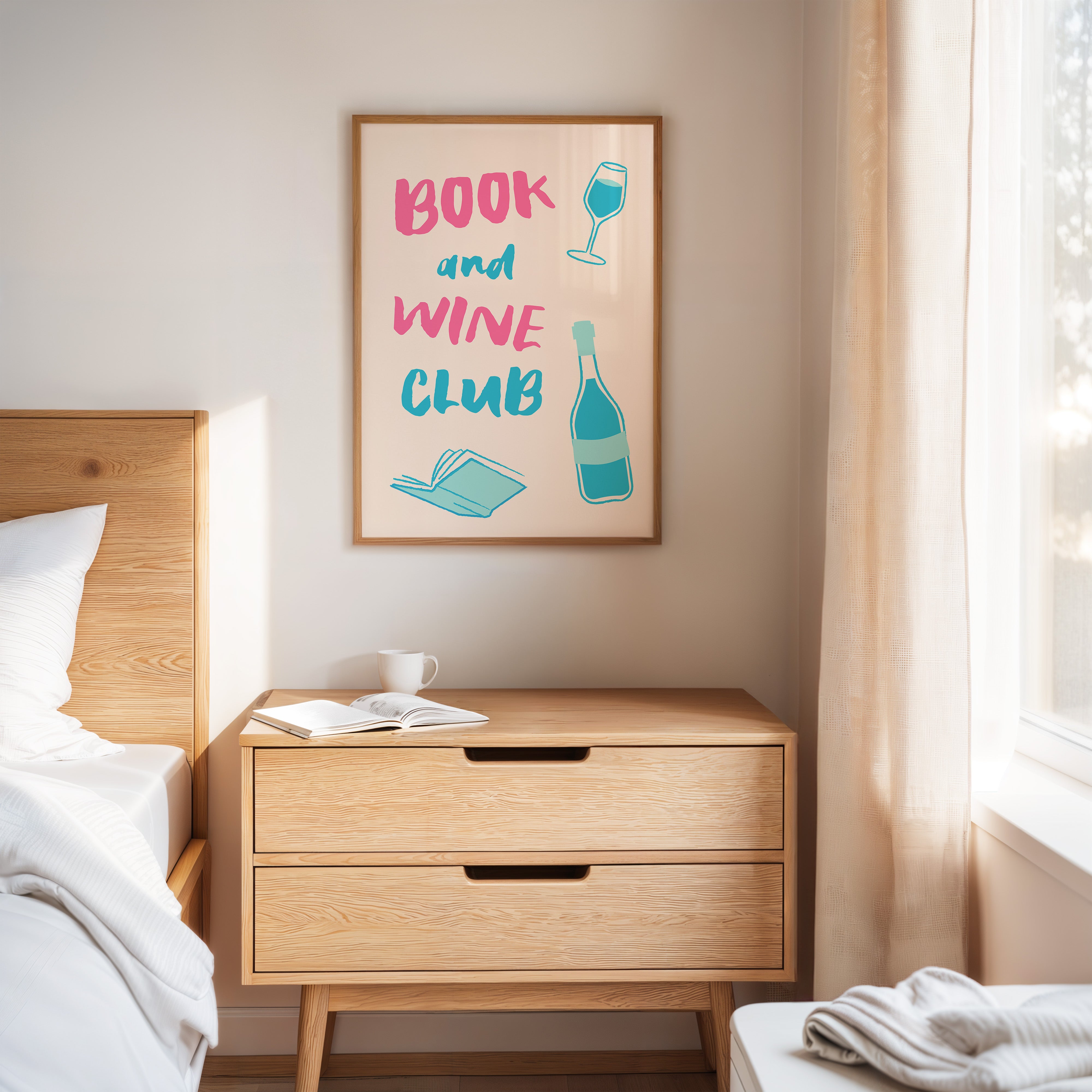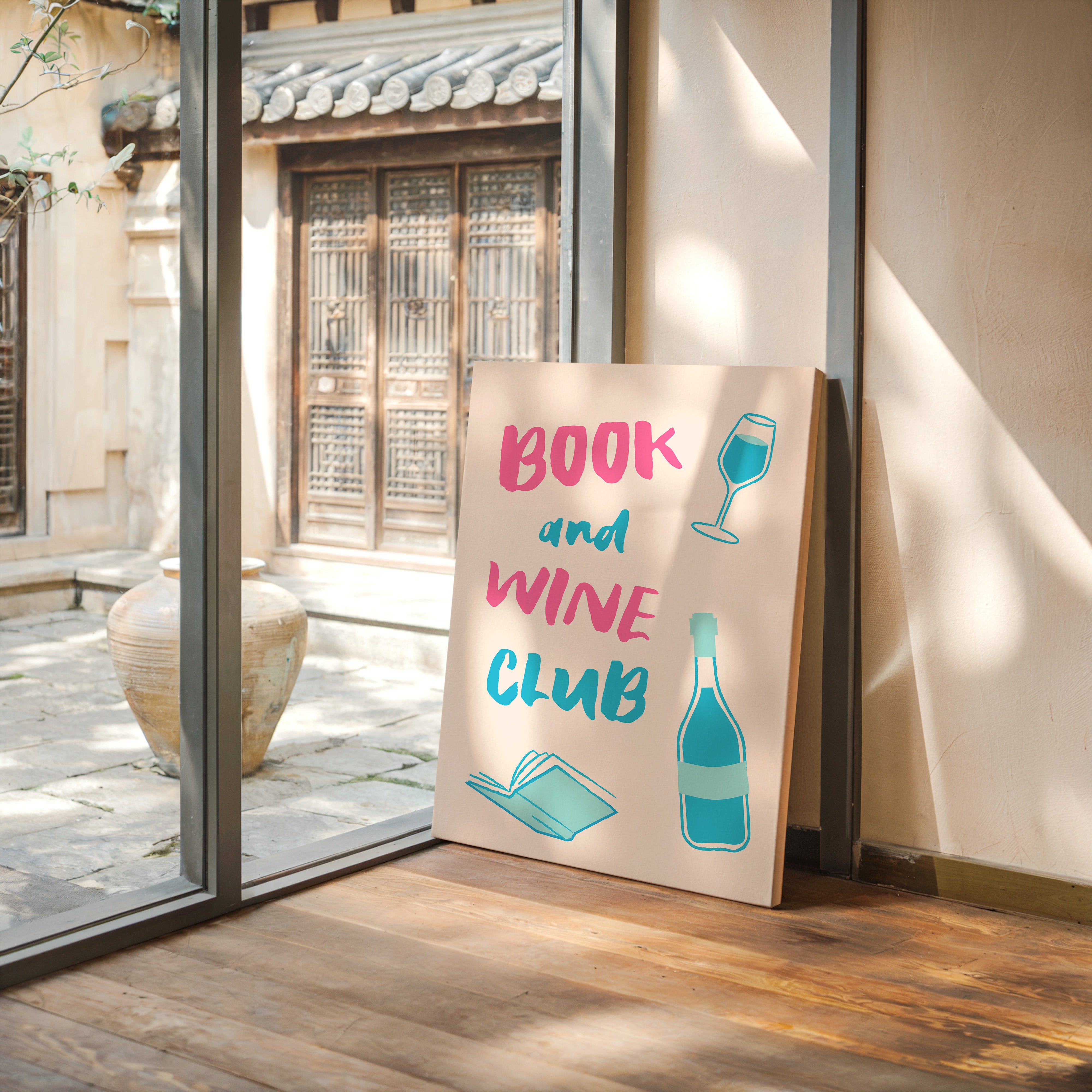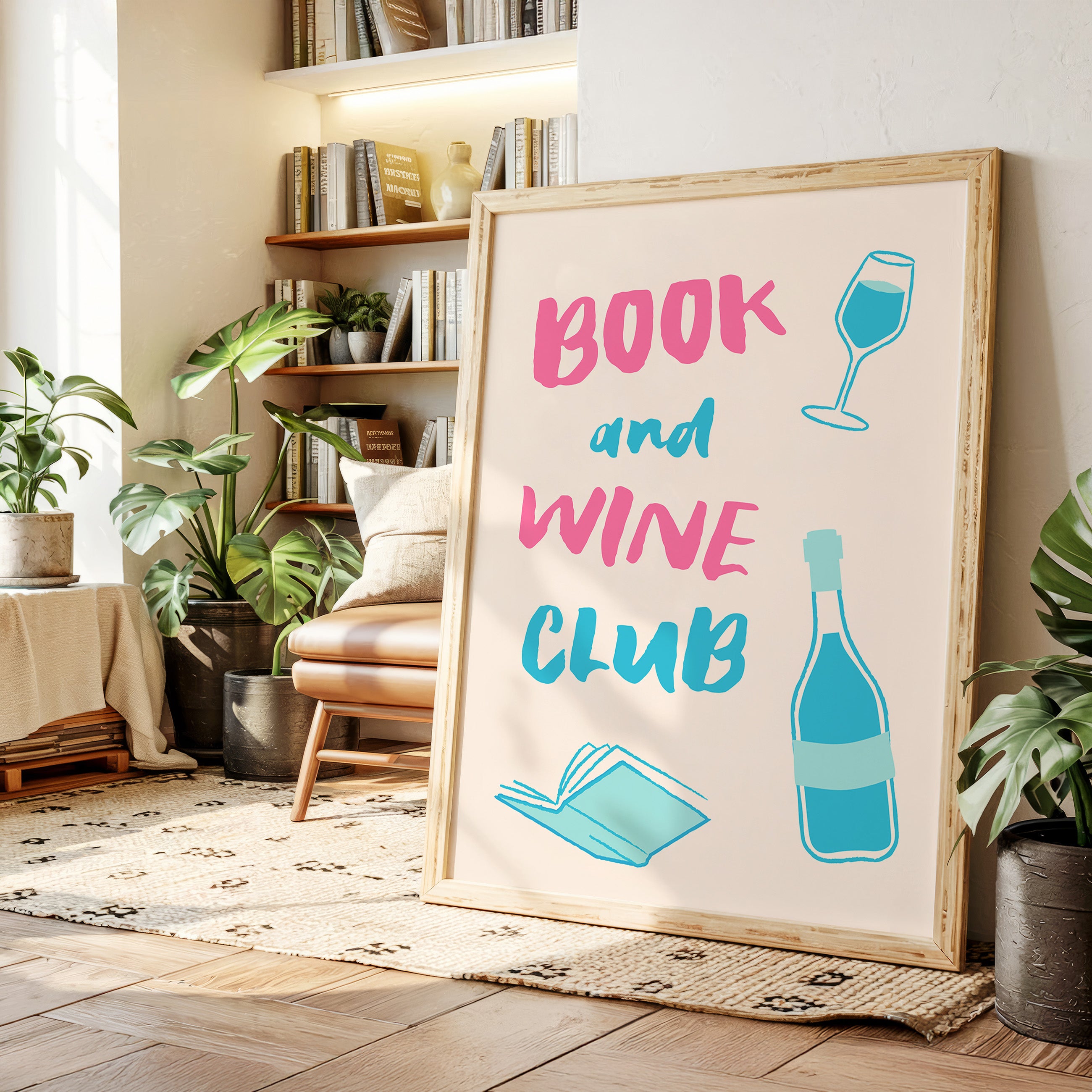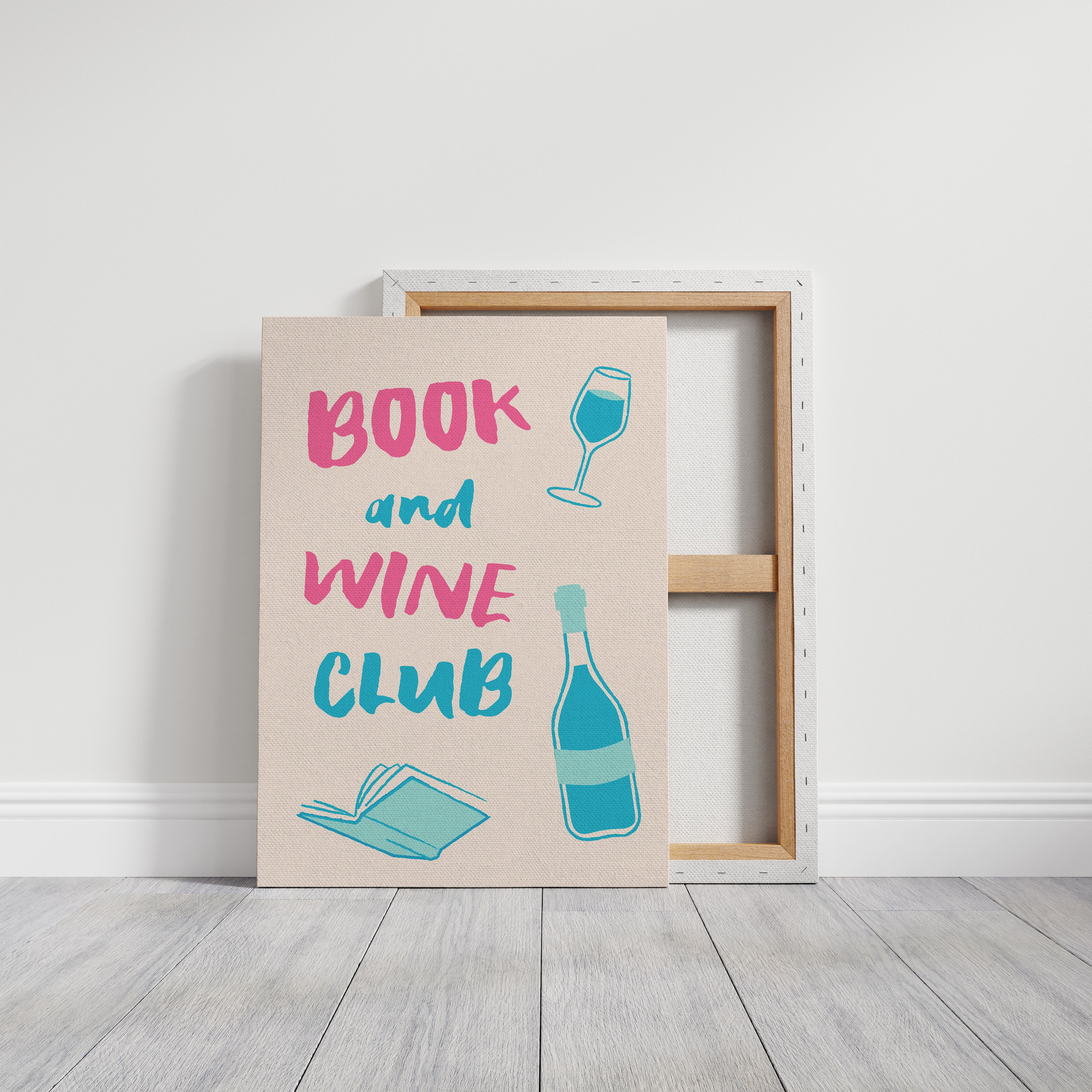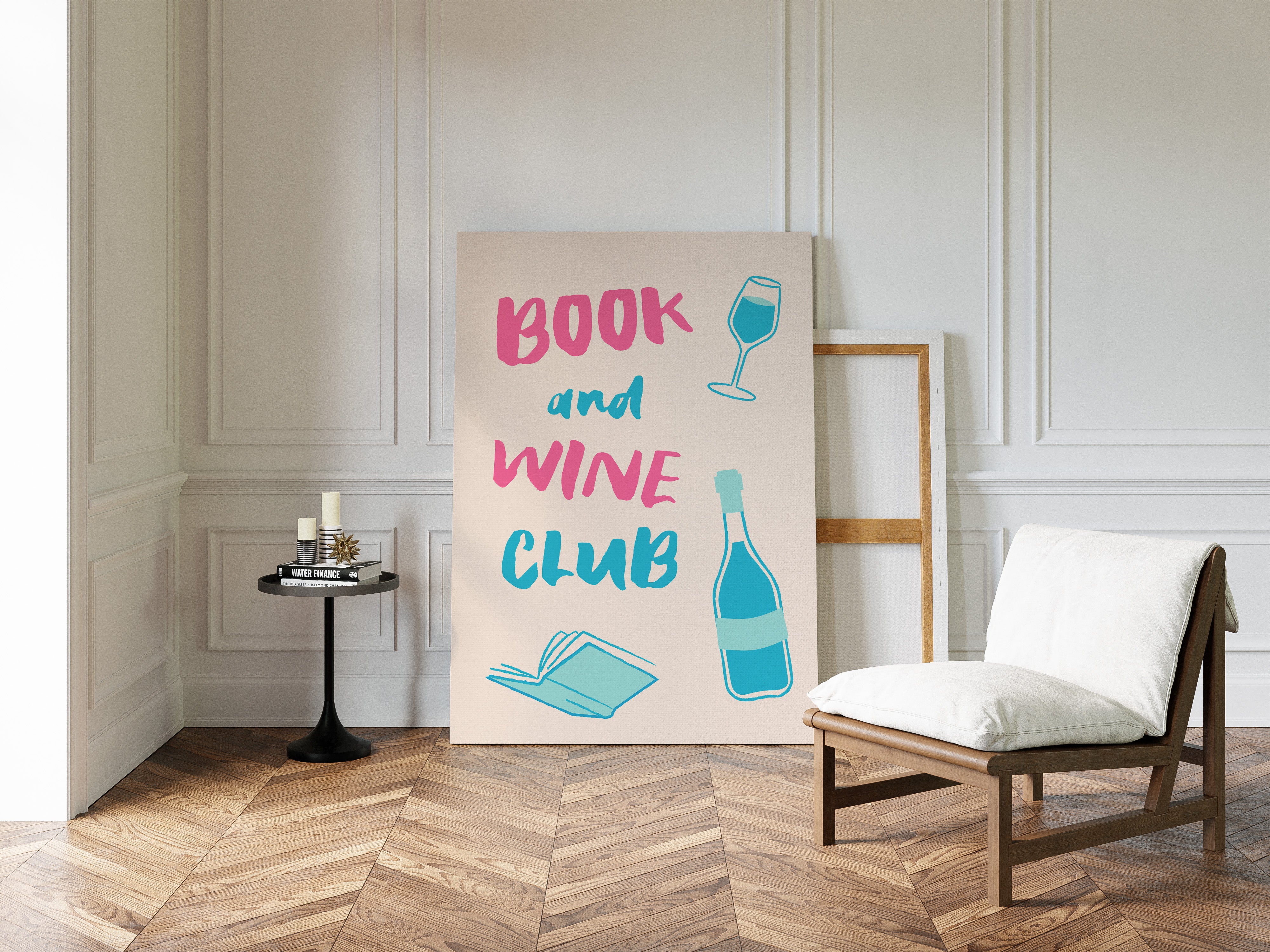 A playful celebration of life's perfect pairing captures the essence of relaxed sophistication. Bold pink letters dance with turquoise illustrations, creating a modern take on the timeless pleasure of reading with a glass of wine. The minimalist design speaks to quiet evenings and thoughtful moments, where literature and libations come together in perfect harmony. This piece would bring a spark of joy and invitation to any reading nook, home library, or kitchen wall, inspiring gatherings that blend intellectual discourse with social warmth.