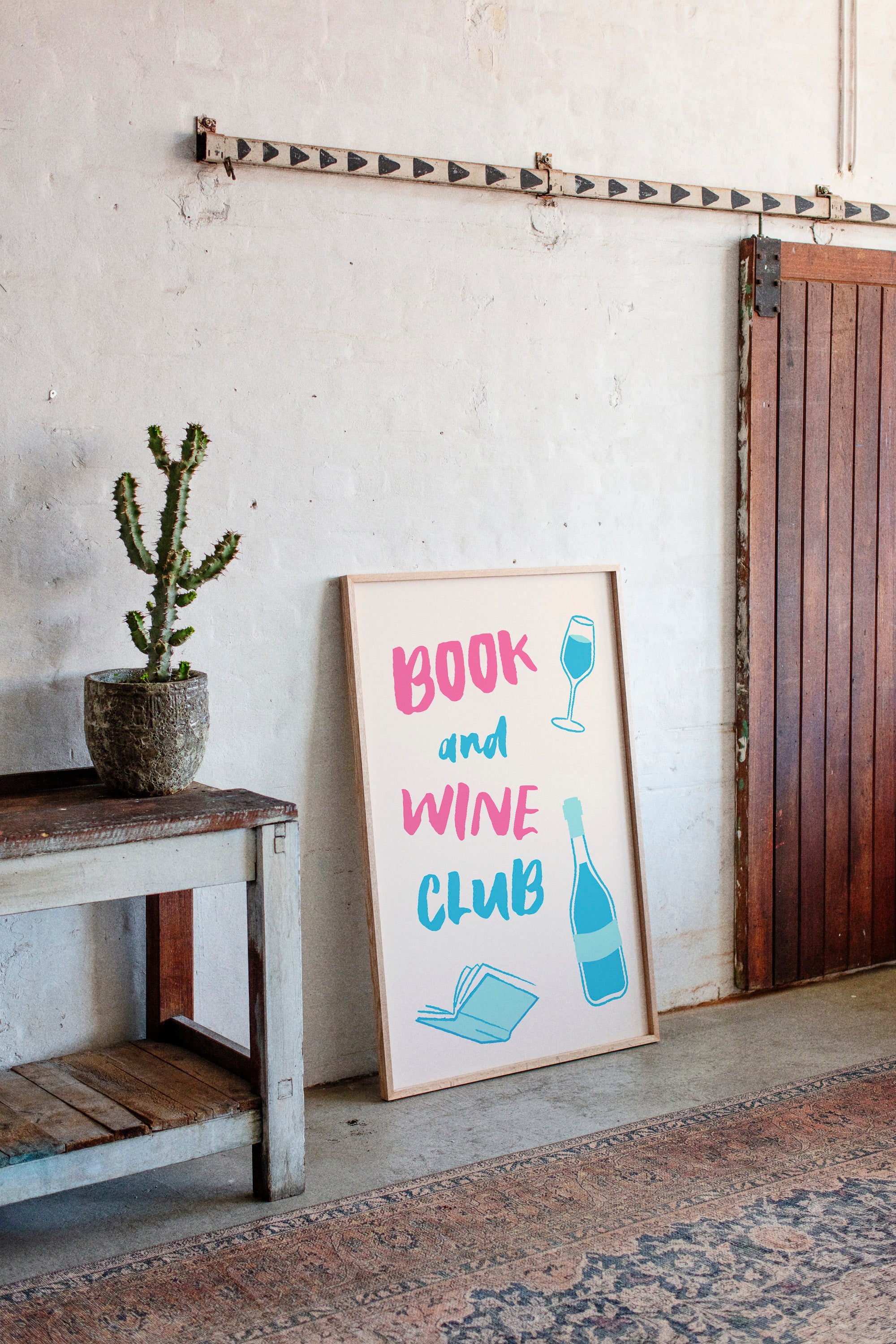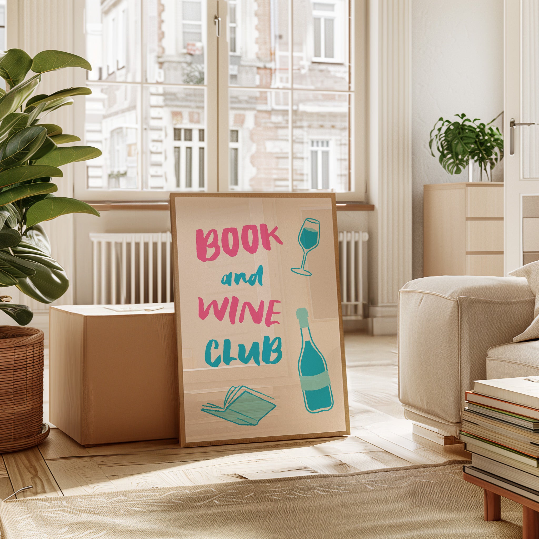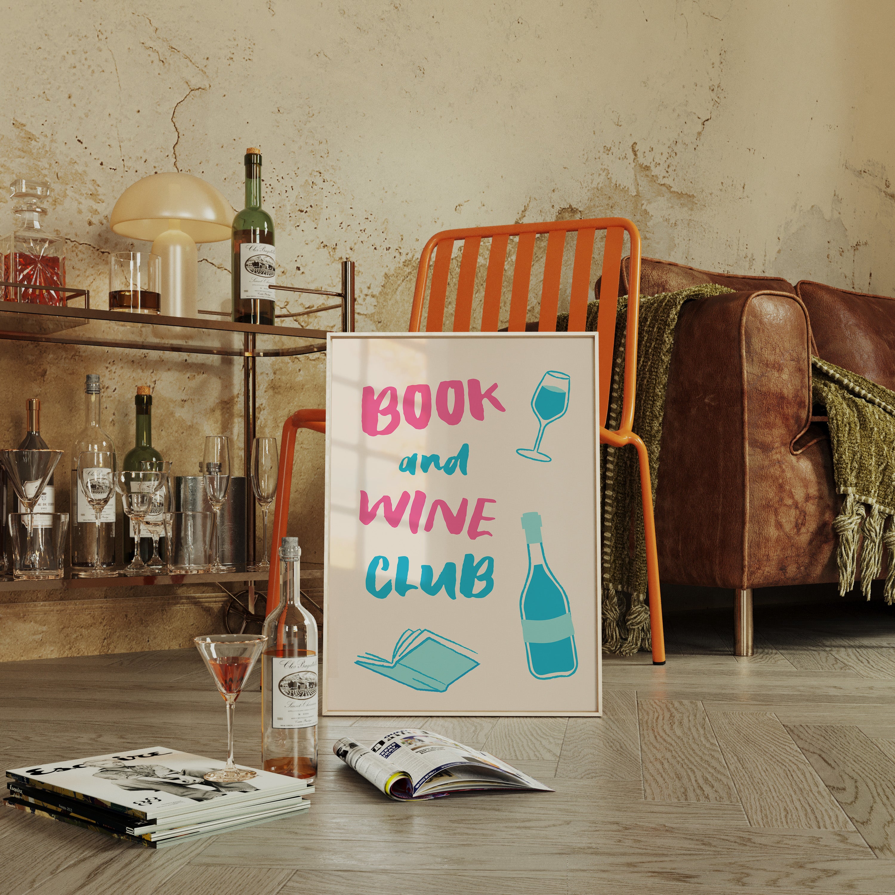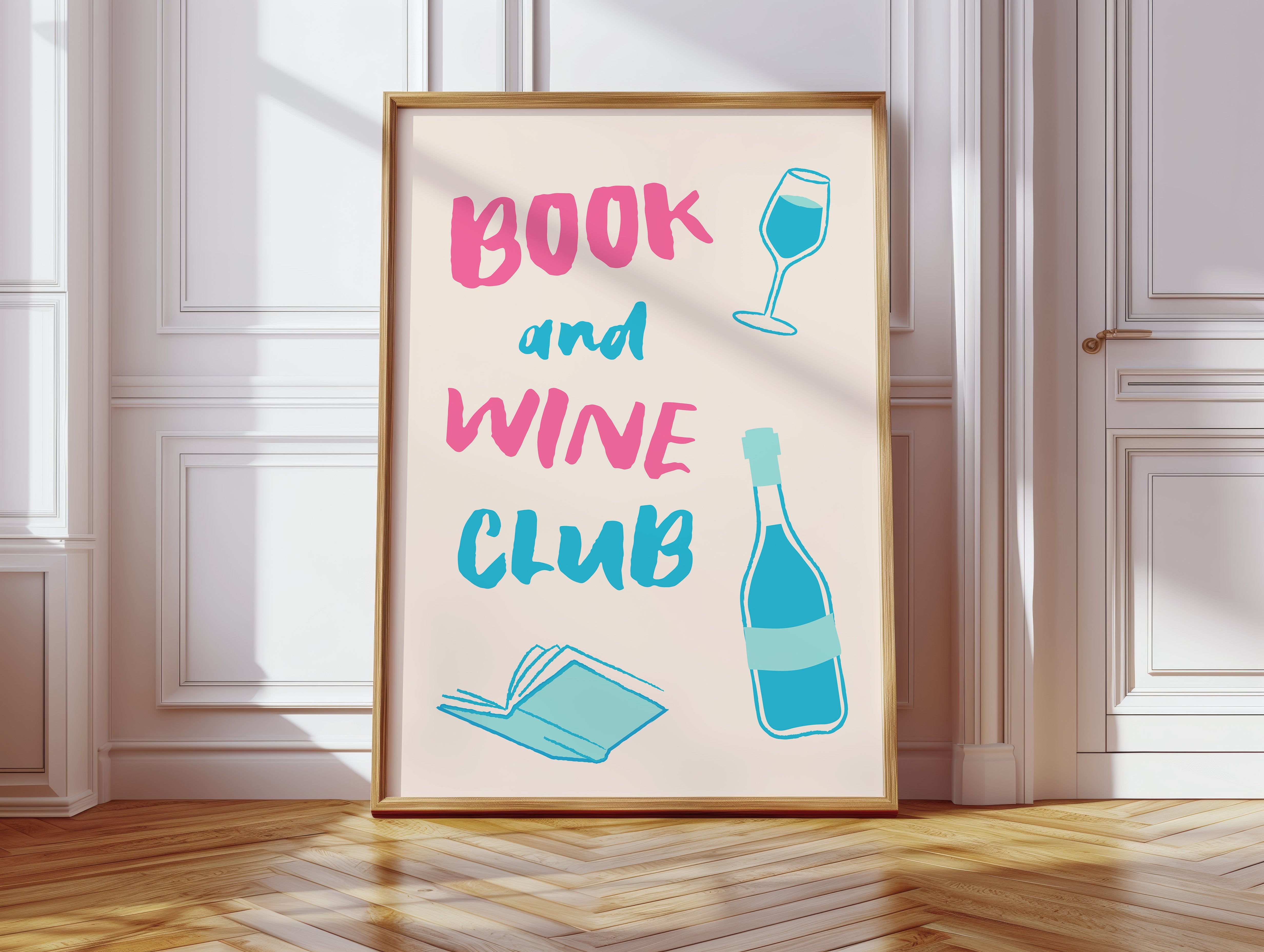 A playful celebration of life's perfect pairing captures the essence of relaxed sophistication. Bold pink letters dance with turquoise illustrations, creating a modern take on the timeless pleasure of reading with a glass of wine. The minimalist design speaks to quiet evenings and thoughtful moments, where literature and libations come together in perfect harmony. This piece would bring a spark of joy and invitation to any reading nook, home library, or kitchen wall, inspiring gatherings that blend intellectual discourse with social warmth.