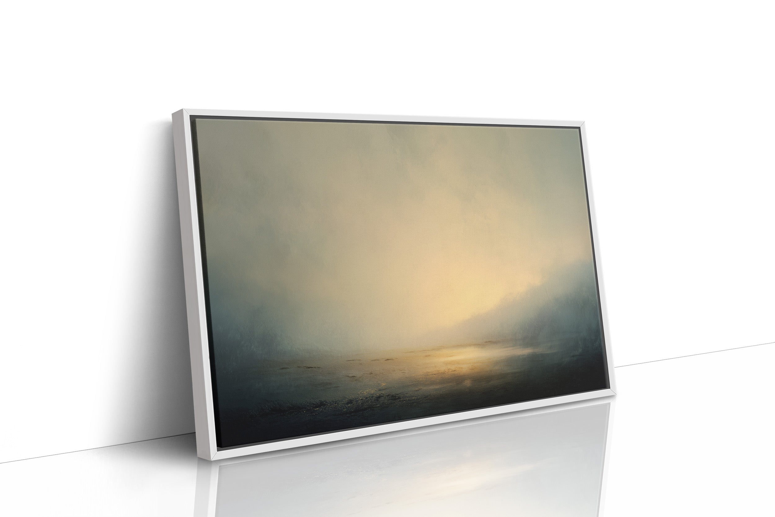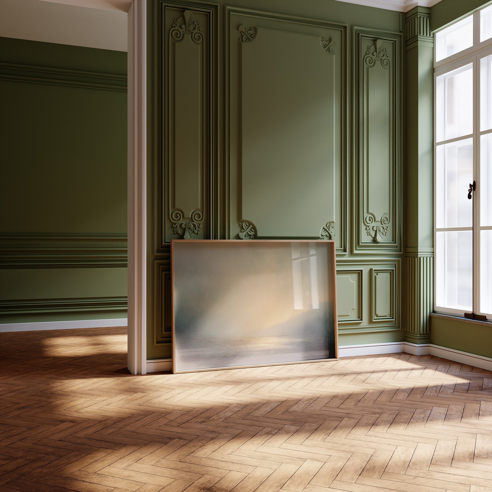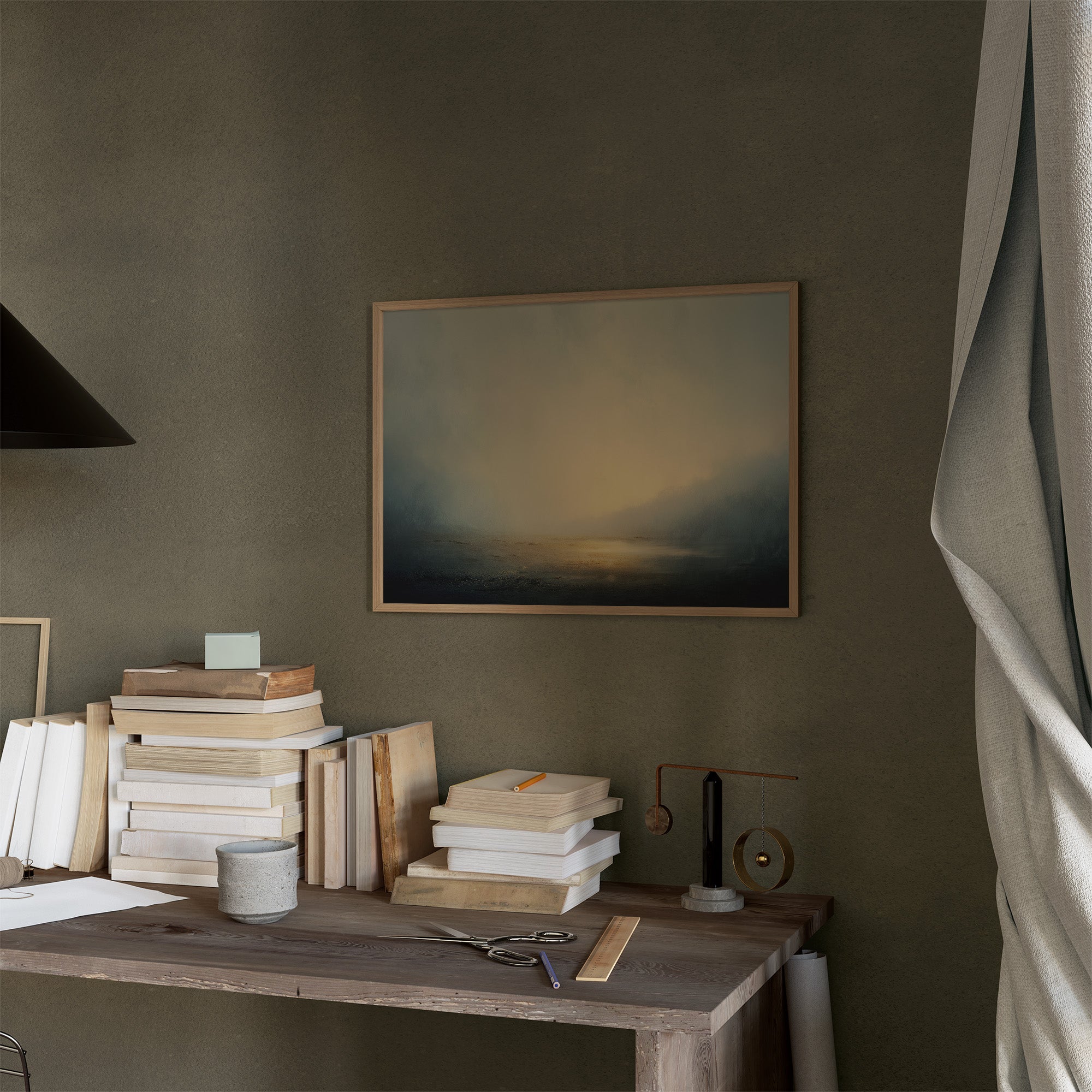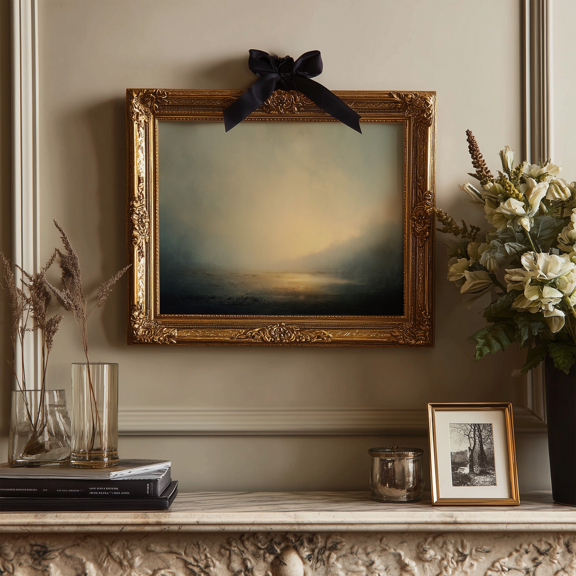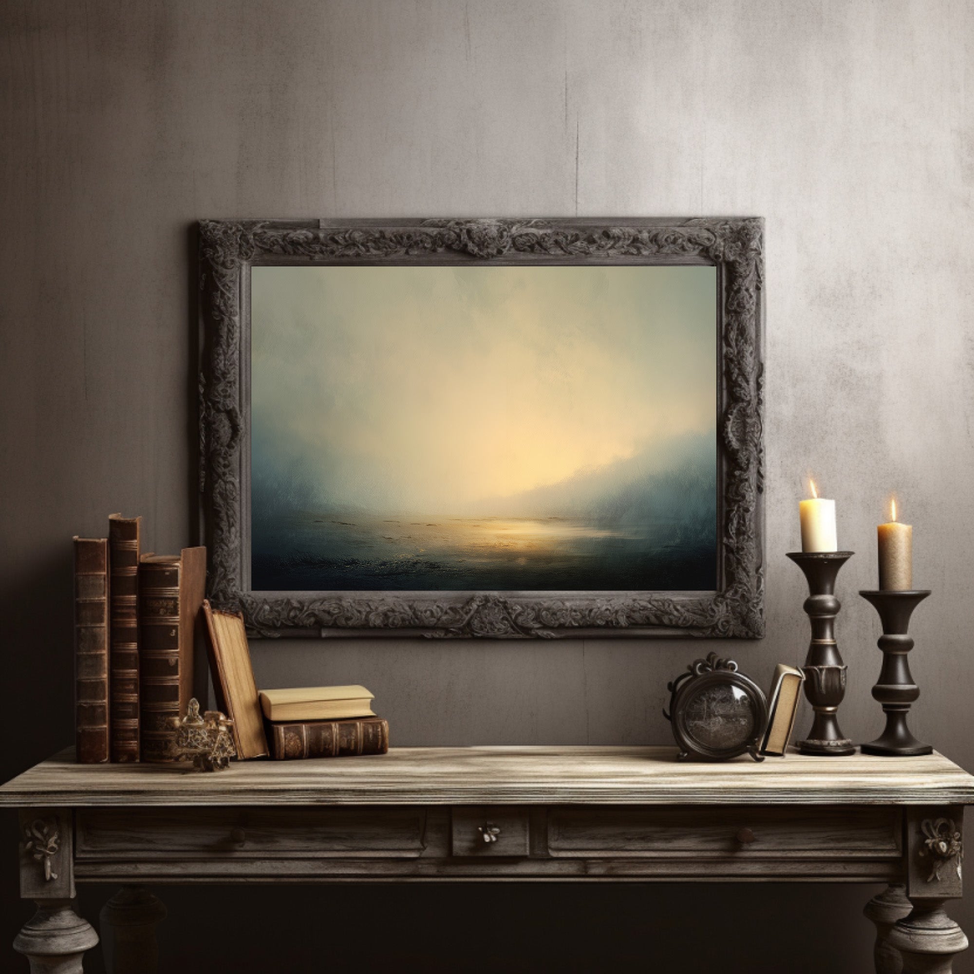 A soft, ethereal landscape sits in elegant repose against a backdrop of countless stories waiting to be discovered. The misty, luminous artwork creates a moment of pause amidst the rich tapestry of book spines, inviting contemplation of horizons both physical and metaphorical. Warm wood tones of the shelves contrast with the cool mystery of the framed piece, while the gentle presence of greenery adds life to this sanctuary of thought.
