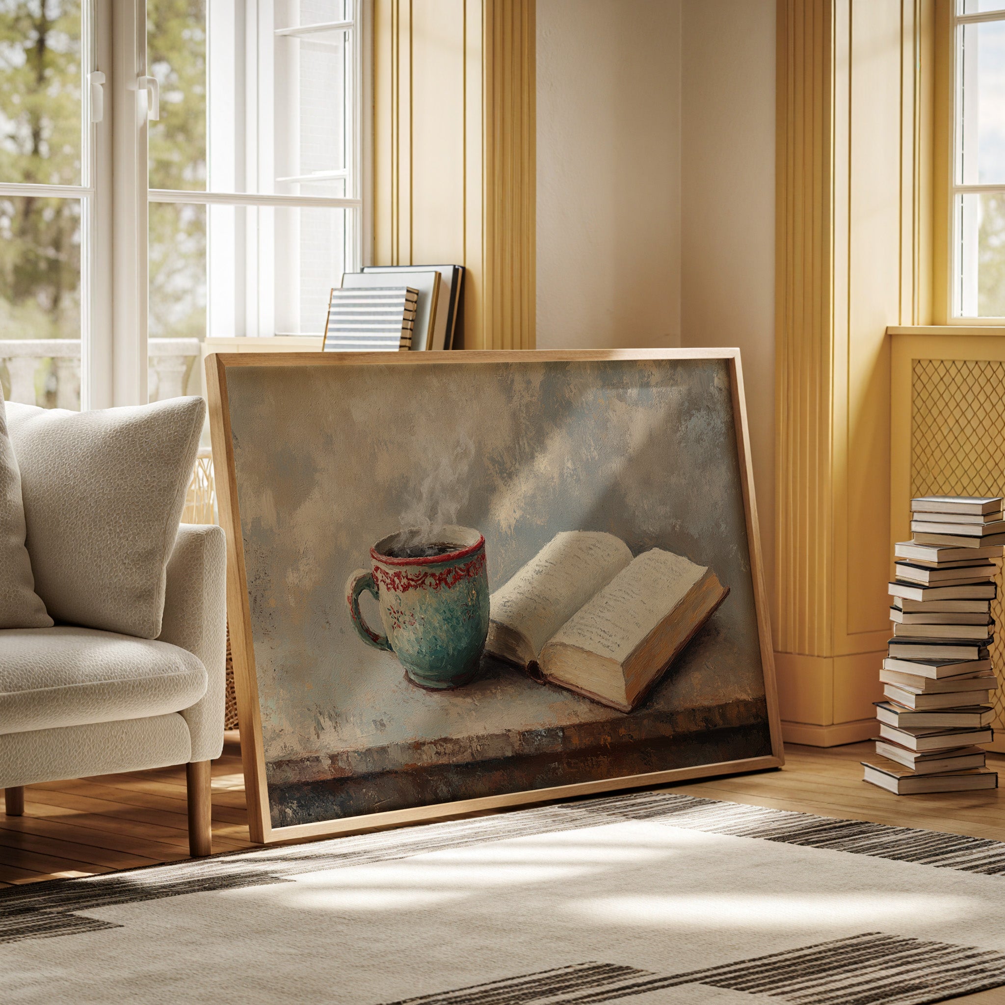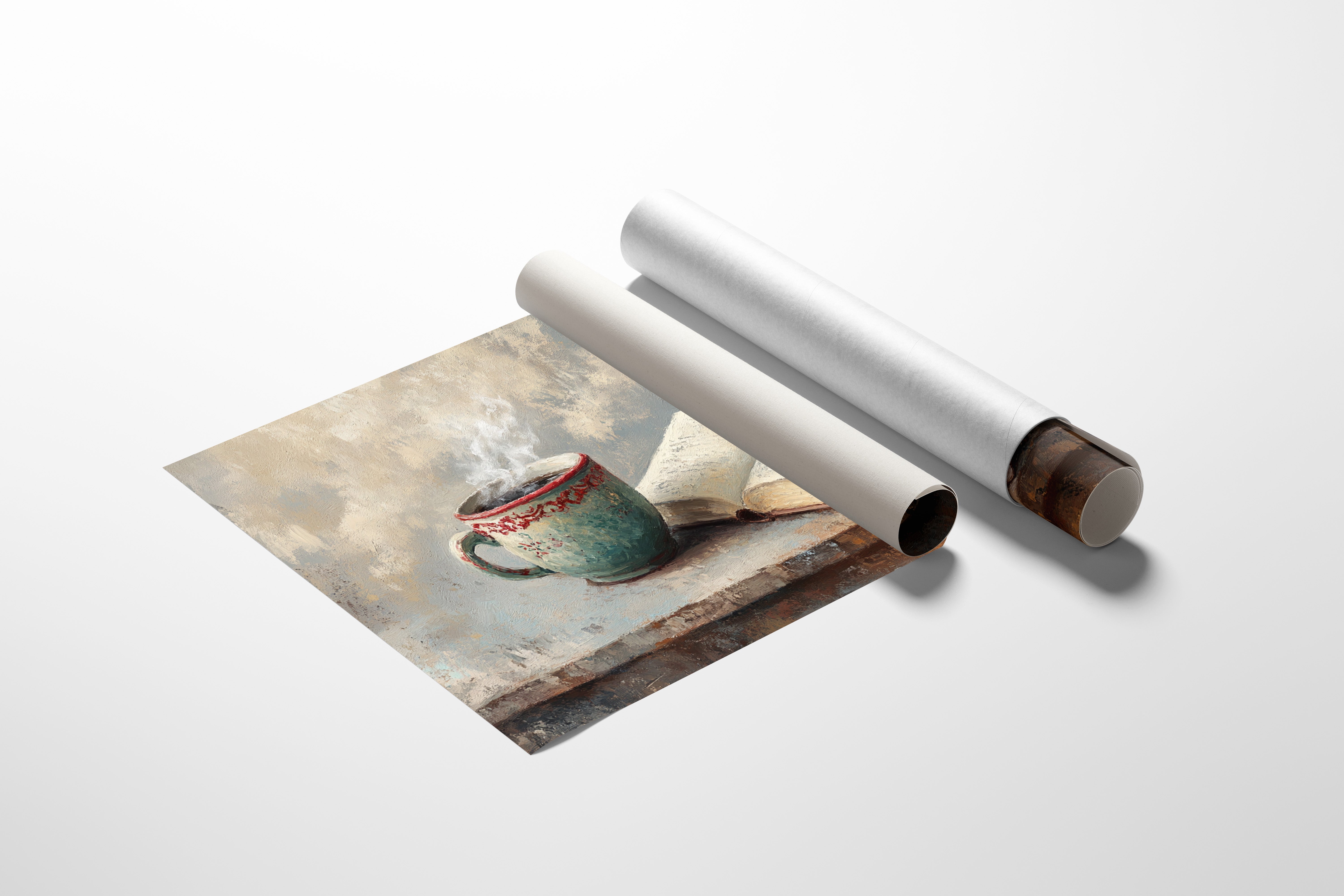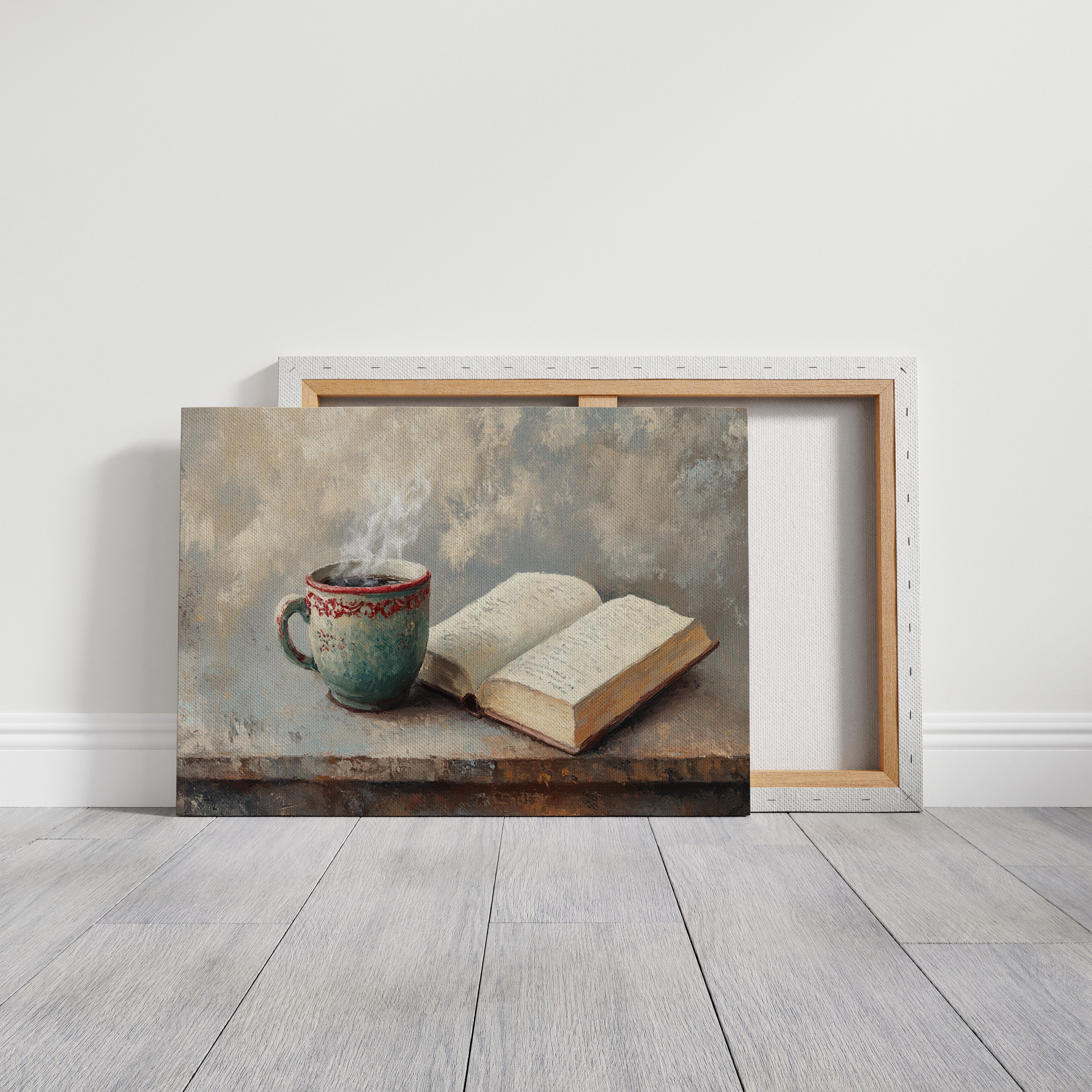 Steam rises lazily from a vintage turquoise cup, its red trim catching the soft morning light like a secret message. The well-worn book lies open, pages gently ruffled as if caught mid-conversation with the warming brew beside it. Rich textures emerge through careful brushstrokes - the weathered leather binding, the delicate wisps of steam, and the intricate pattern adorning the cherished mug. This intimate still life captures that perfect moment of solitude when the world hasn't quite awakened. Perfect for a reading nook, home library, or any quiet corner where moments of reflection are treasured.