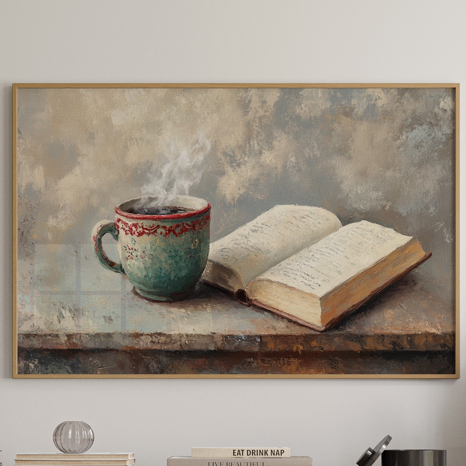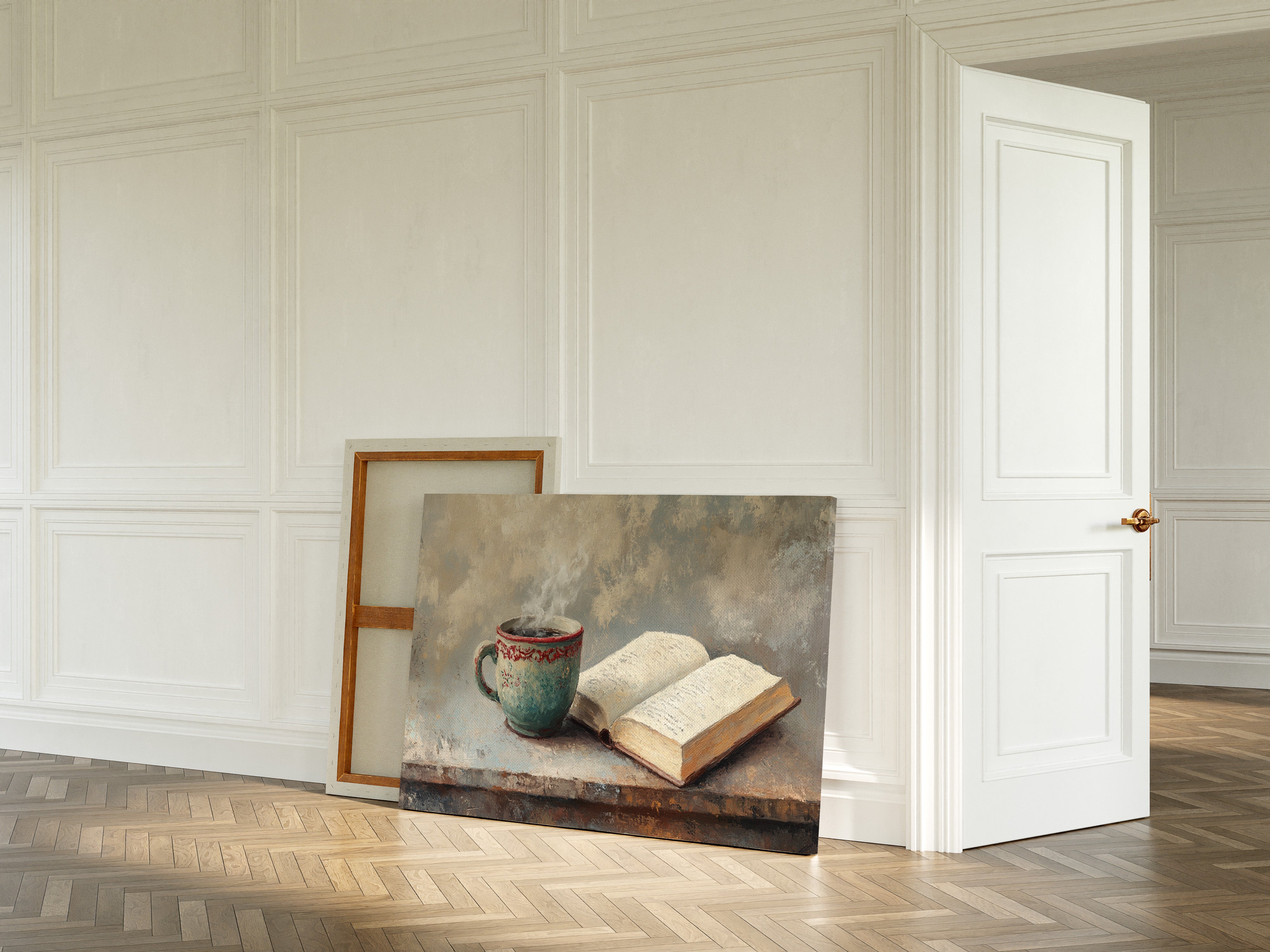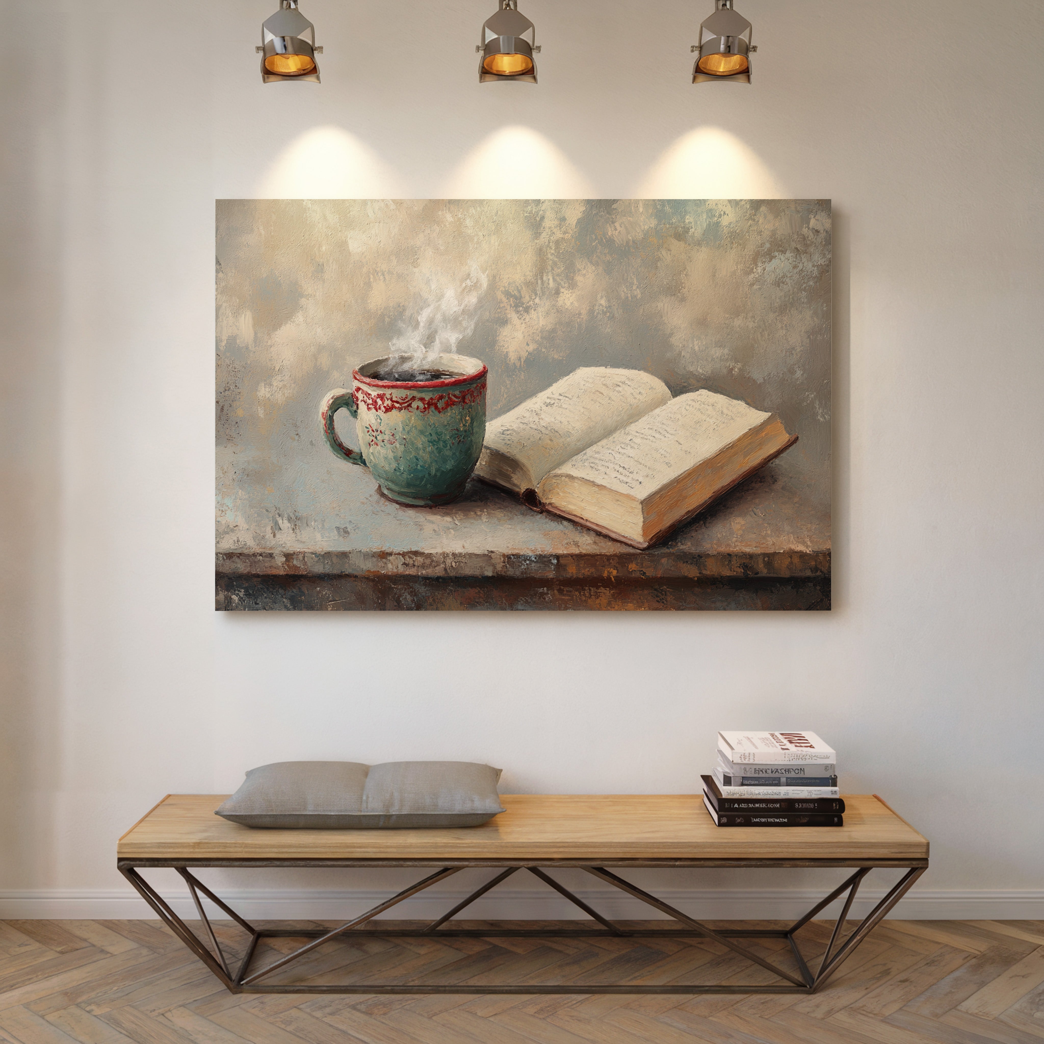 Steam rises lazily from a vintage turquoise cup, its red trim catching the soft morning light like a secret message. The well-worn book lies open, pages gently ruffled as if caught mid-conversation with the warming brew beside it. Rich textures emerge through careful brushstrokes - the weathered leather binding, the delicate wisps of steam, and the intricate pattern adorning the cherished mug. This intimate still life captures that perfect moment of solitude when the world hasn't quite awakened. Perfect for a reading nook, home library, or any quiet corner where moments of reflection are treasured.