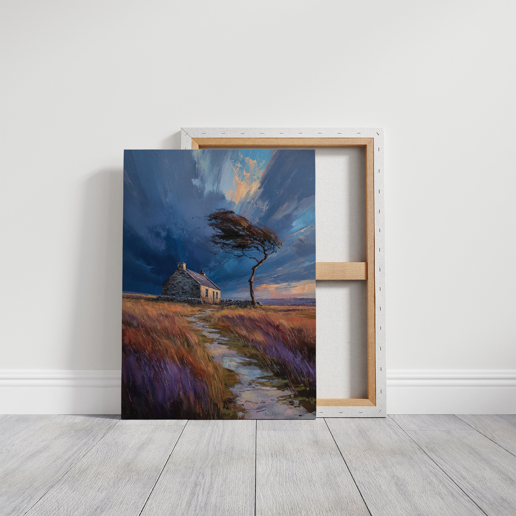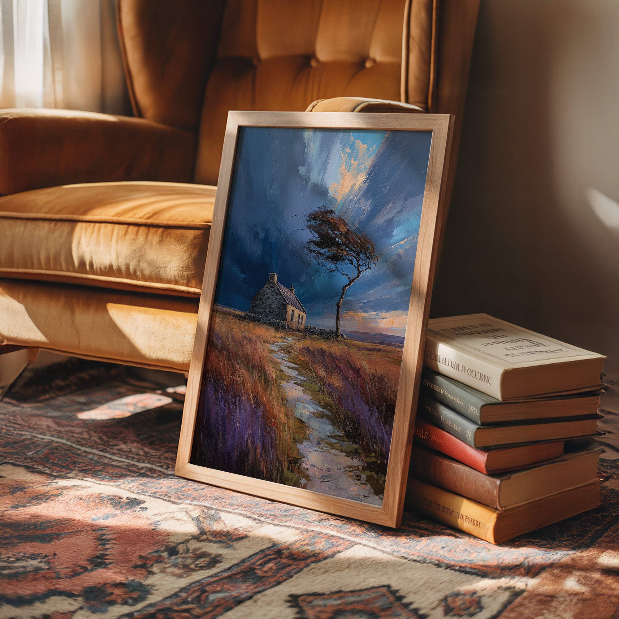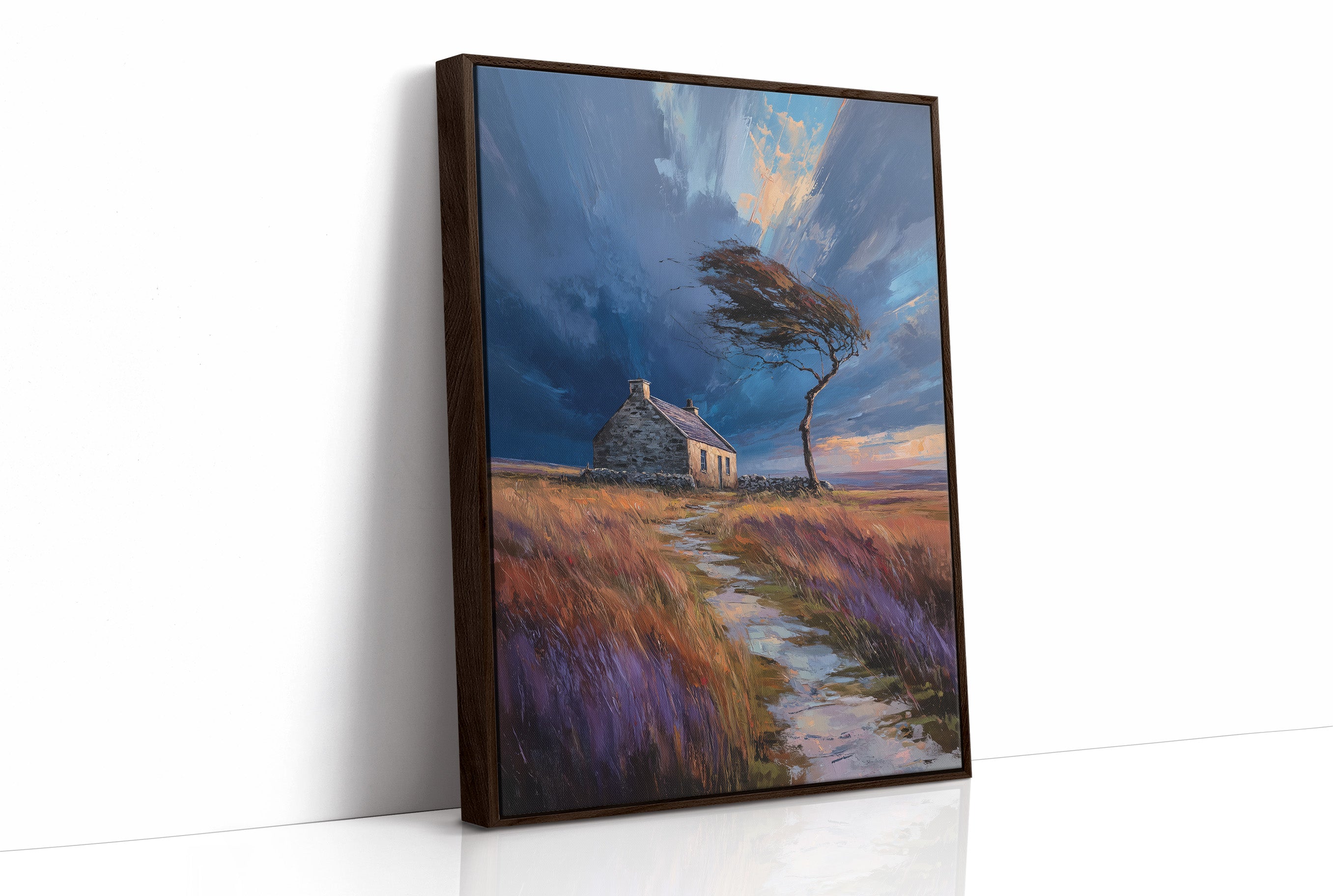 A windswept path leads through amber grassland toward a solitary stone cottage, standing defiant against nature's might. The bent tree leans dramatically against a tumultuous sky, where deep indigo clouds part briefly for golden light to spill across the horizon. Russet and lavender grasses dance in the coastal breeze, creating a textured foreground that draws the eye along the pale, winding trail to the humble shelter.