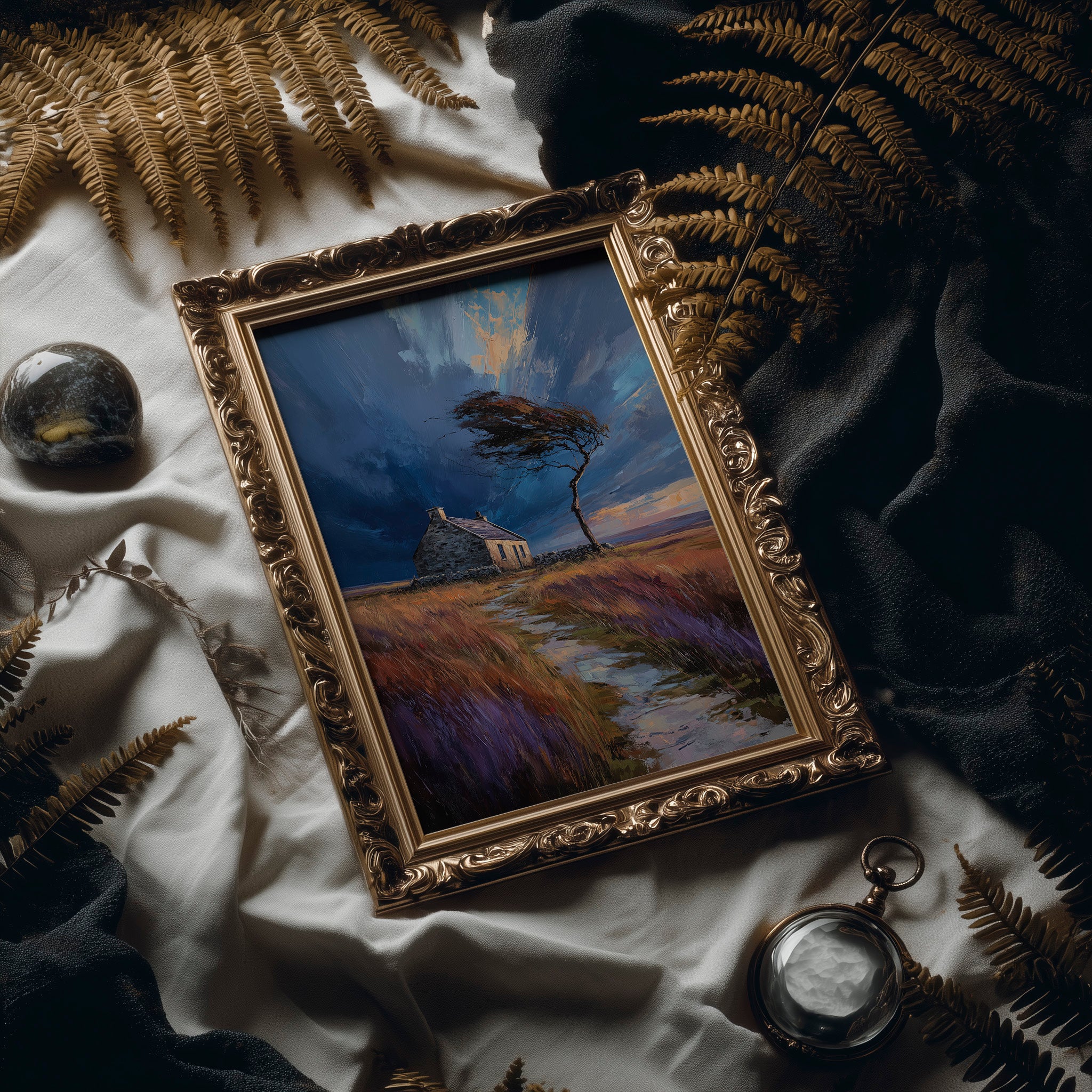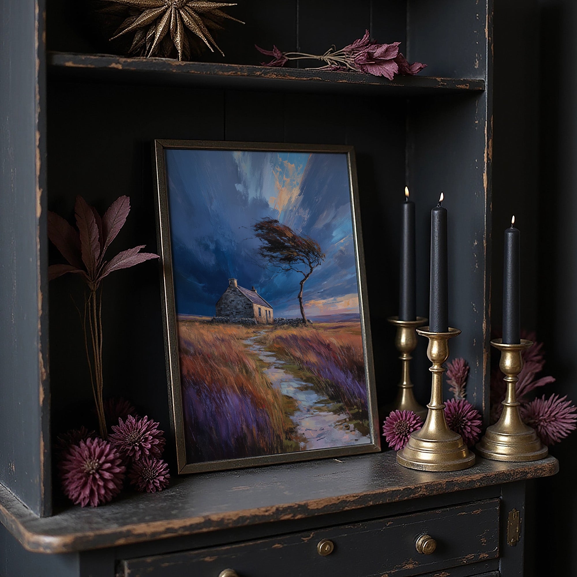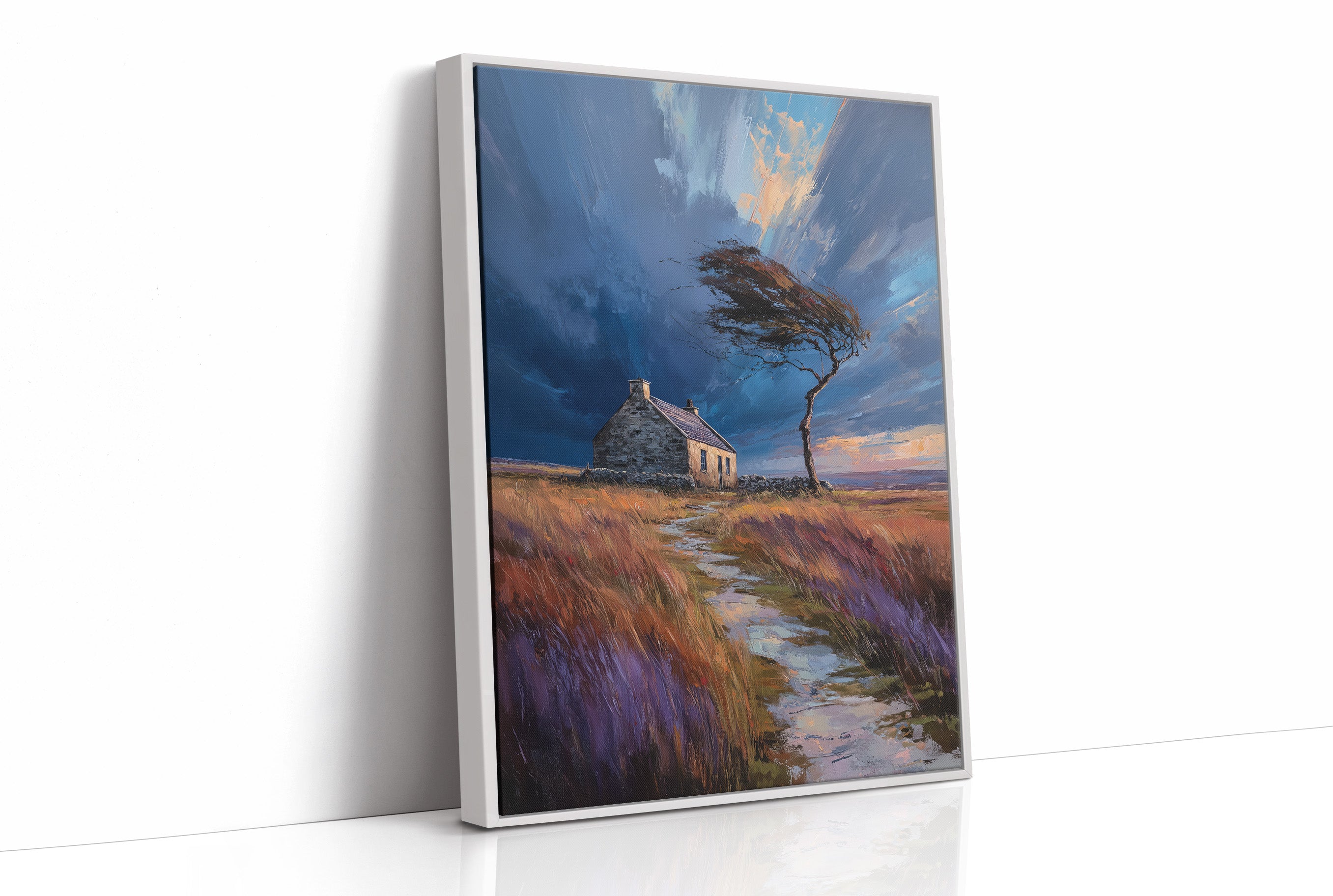 A windswept path leads through amber grassland toward a solitary stone cottage, standing defiant against nature's might. The bent tree leans dramatically against a tumultuous sky, where deep indigo clouds part briefly for golden light to spill across the horizon. Russet and lavender grasses dance in the coastal breeze, creating a textured foreground that draws the eye along the pale, winding trail to the humble shelter.