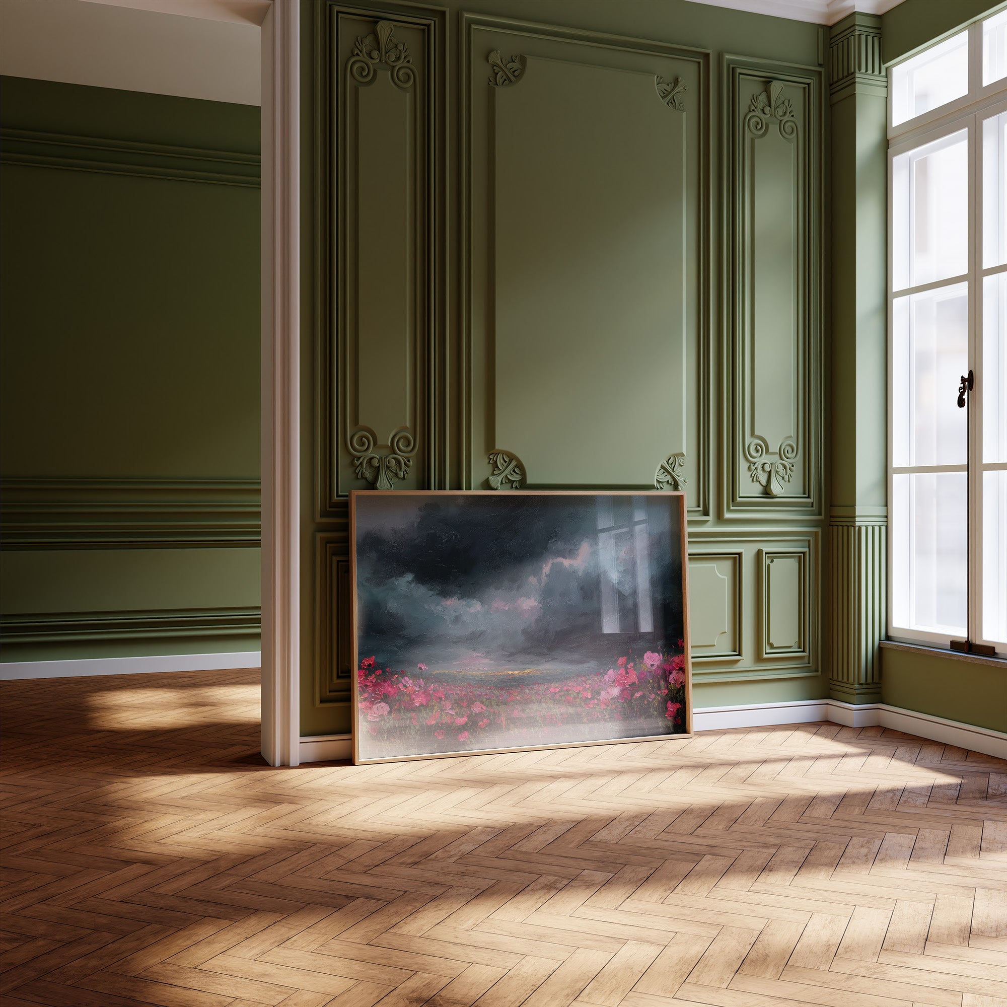 The tension between beauty and turmoil hangs suspended in time. Vibrant pink wildflowers stretch across a field beneath an ominous sky, where charcoal clouds swirl with unexpected touches of lavender and rose. The dramatic contrast creates a captivating narrative of resilience, with delicate blooms standing defiant against the gathering tempest above. This piece would transform a reading nook or home office into a contemplative sanctuary, inviting moments of reflection on nature's complex harmony between darkness and light.