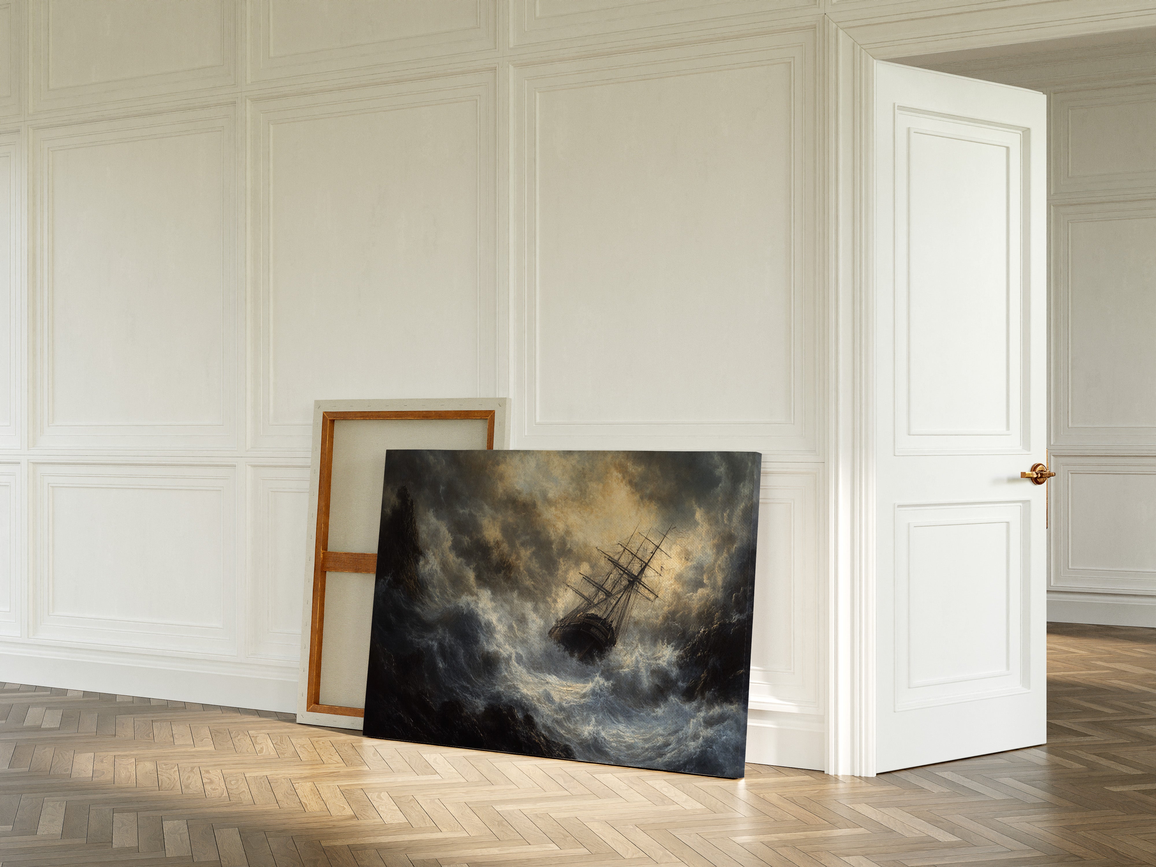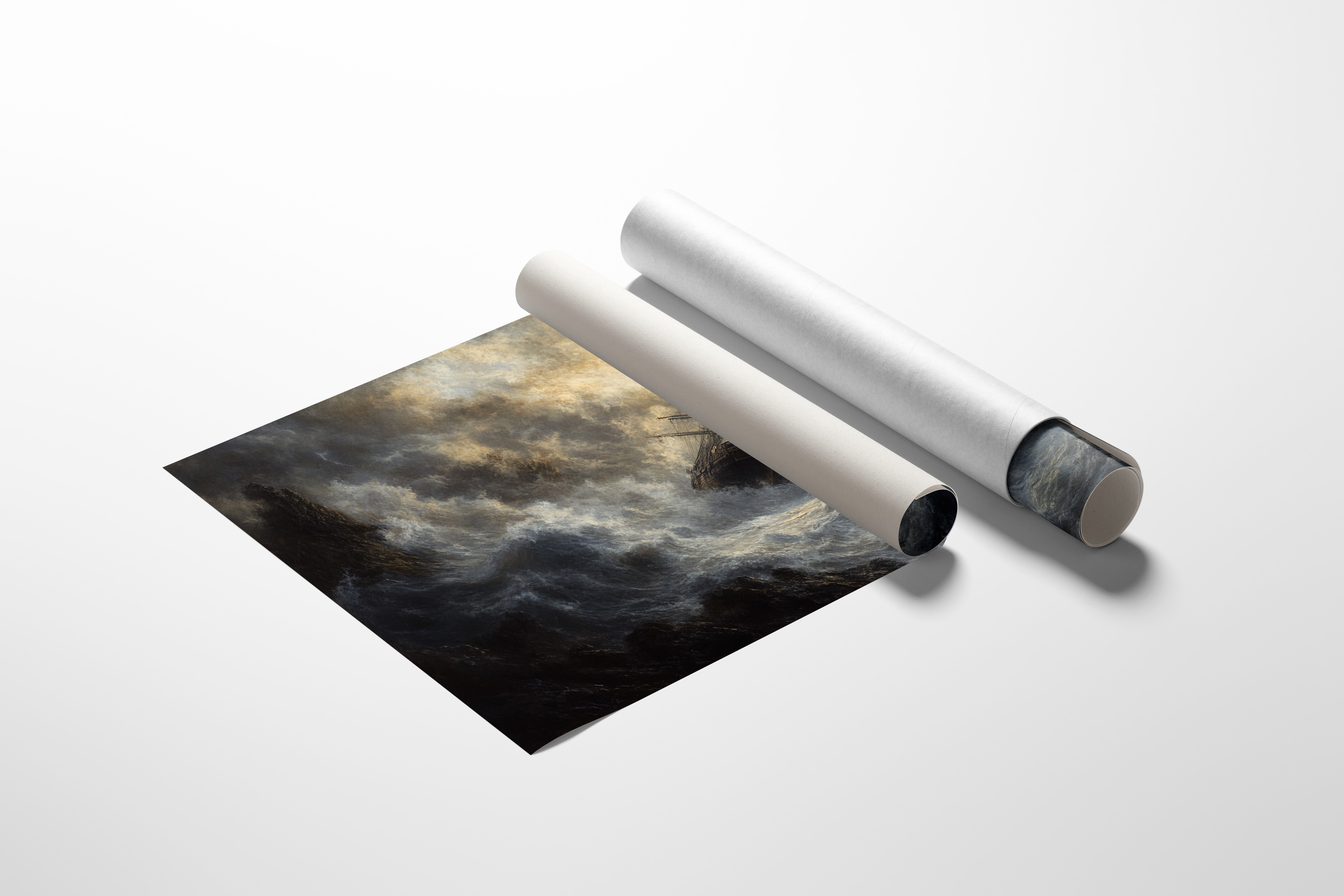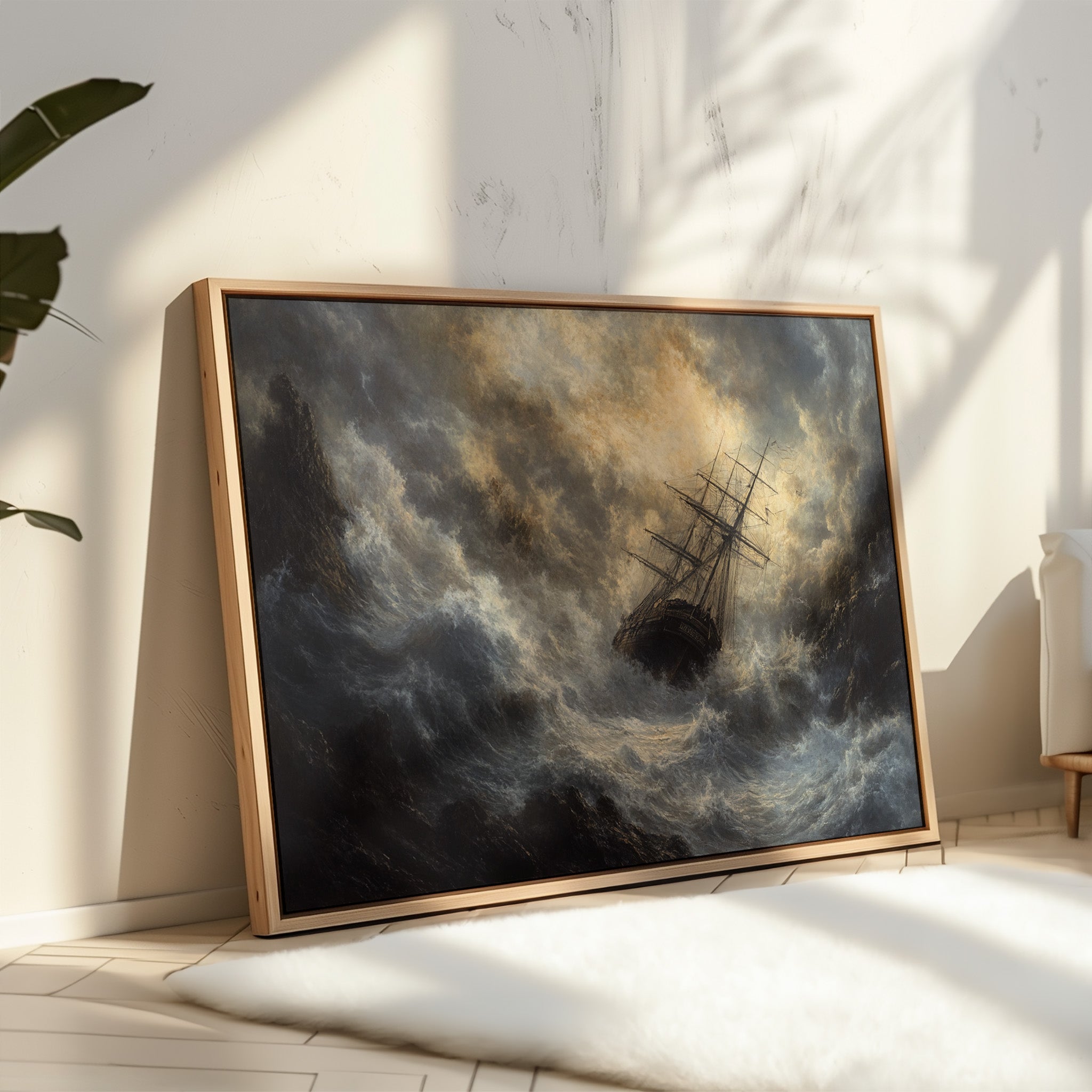 Tumultuous waves rise like mountains against a brooding sky, where golden light breaks through storm clouds in defiant radiance. A sailing vessel lists precariously among the towering swells, its masts reaching toward an amber-lit heaven while dark waters churn below. The dramatic interplay of light and shadow creates a sublime tension between nature's raw power and humanity's determined spirit at sea.