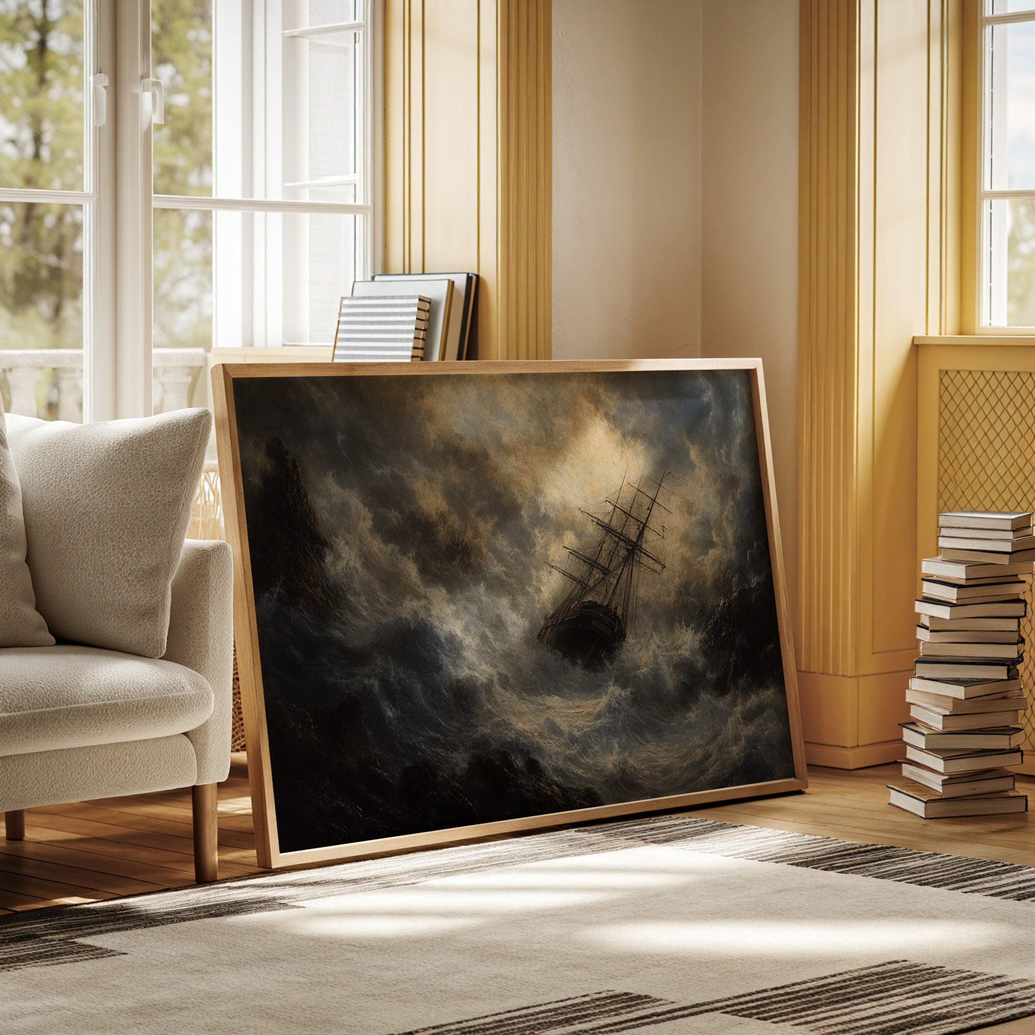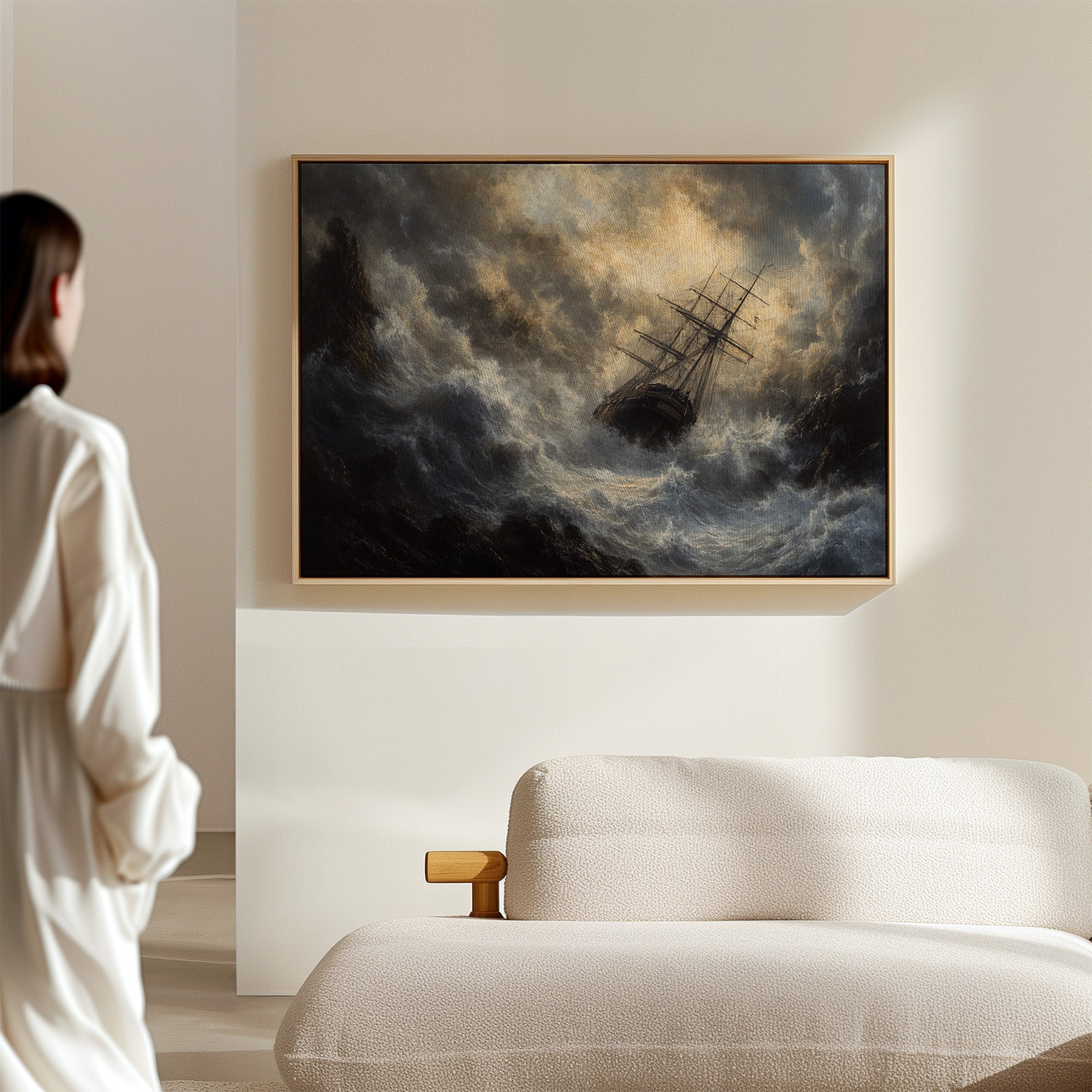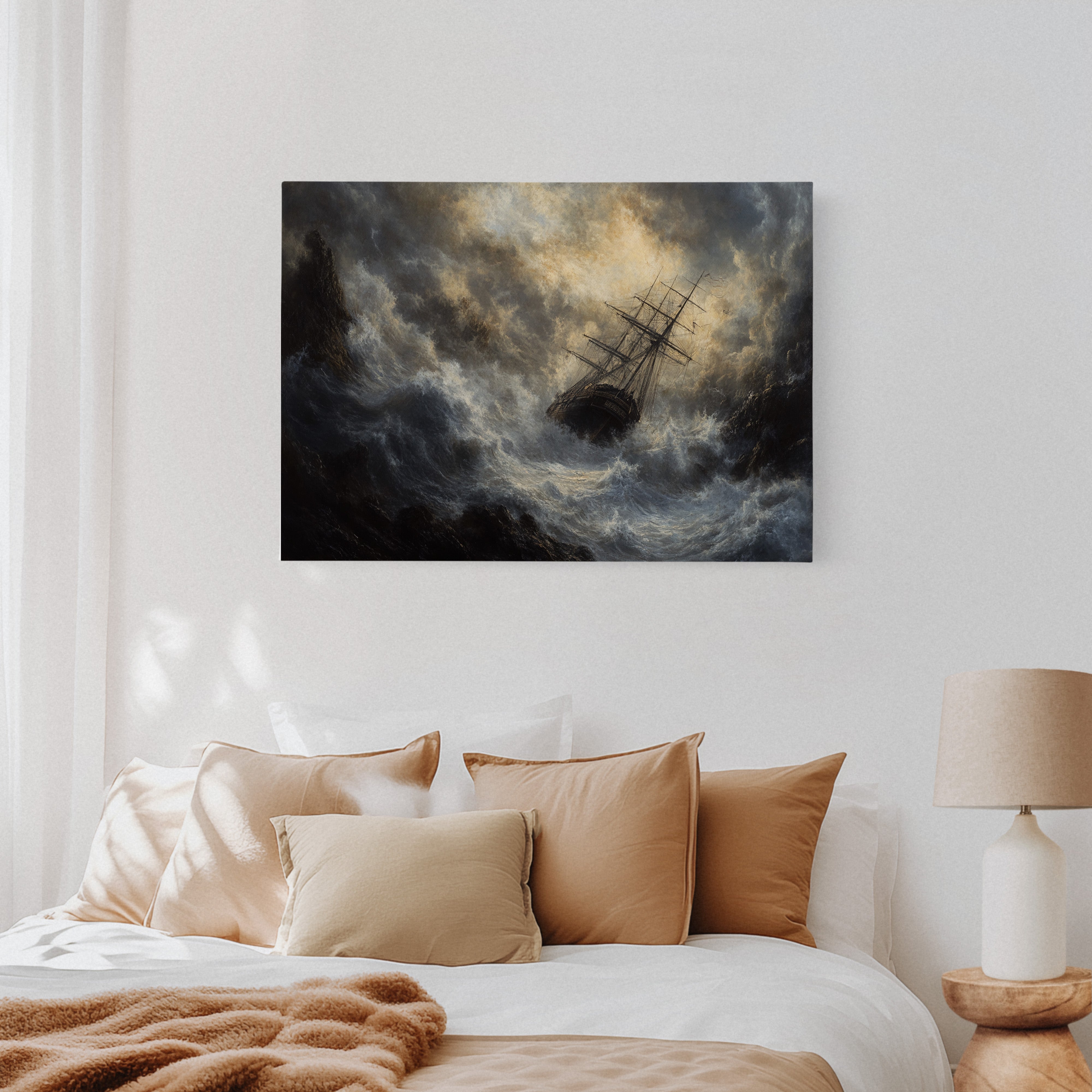 Tumultuous waves rise like mountains against a brooding sky, where golden light breaks through storm clouds in defiant radiance. A sailing vessel lists precariously among the towering swells, its masts reaching toward an amber-lit heaven while dark waters churn below. The dramatic interplay of light and shadow creates a sublime tension between nature's raw power and humanity's determined spirit at sea.