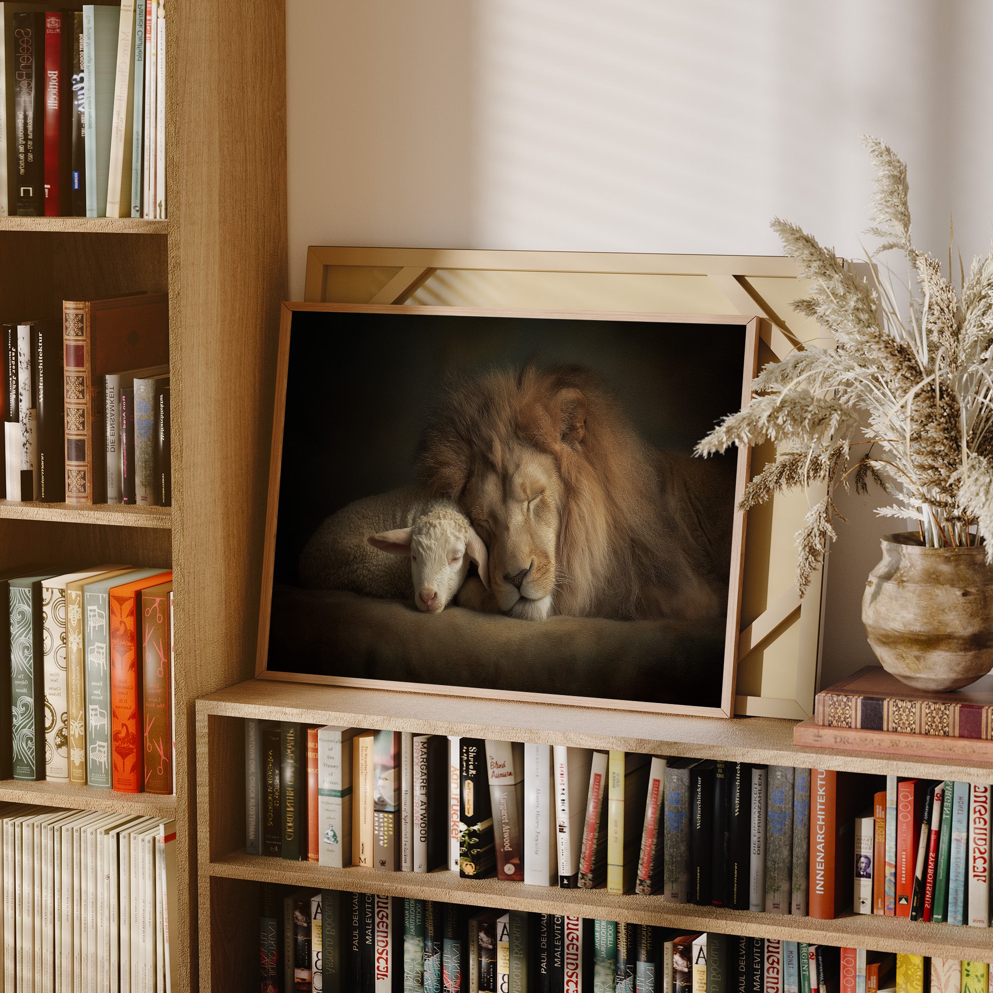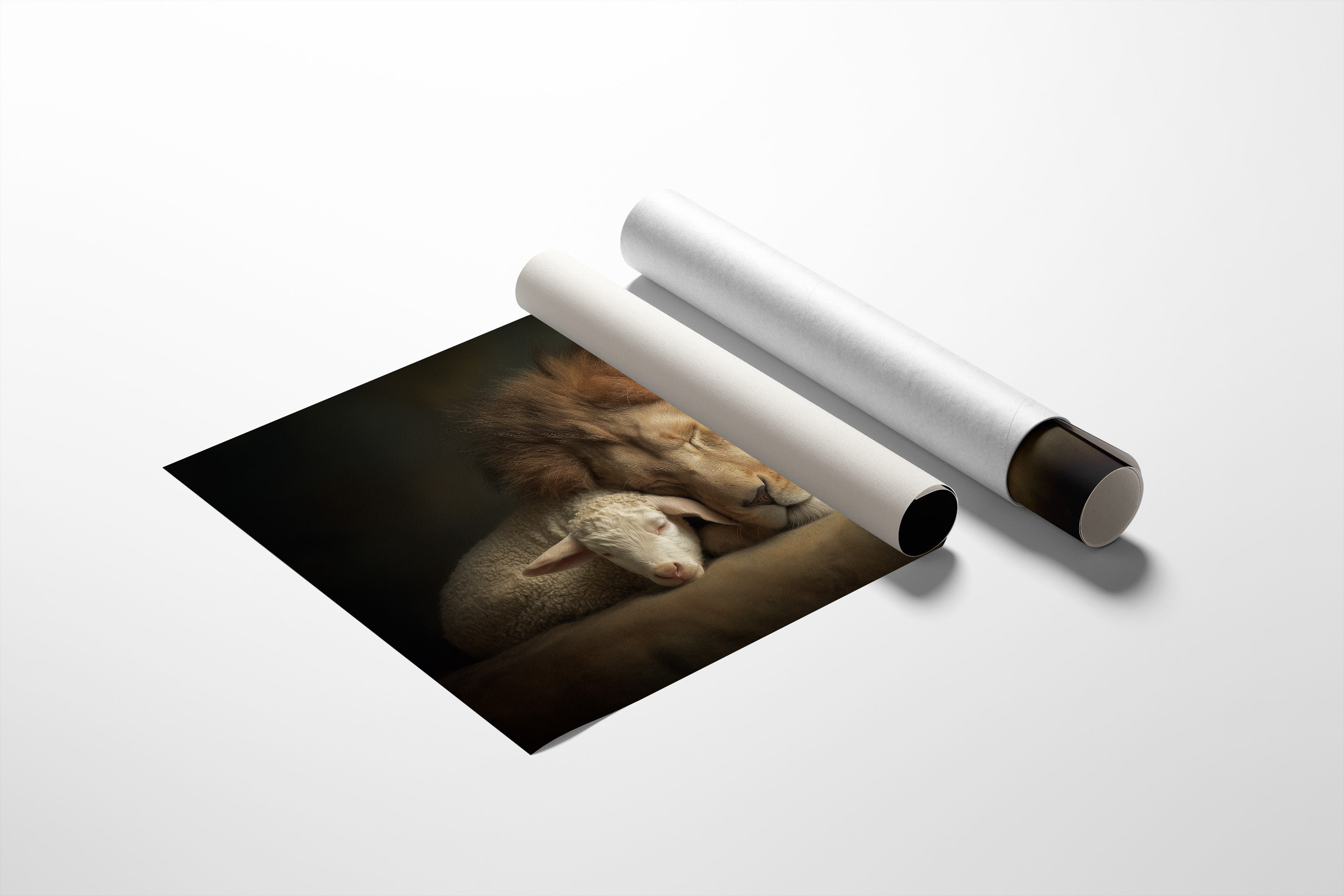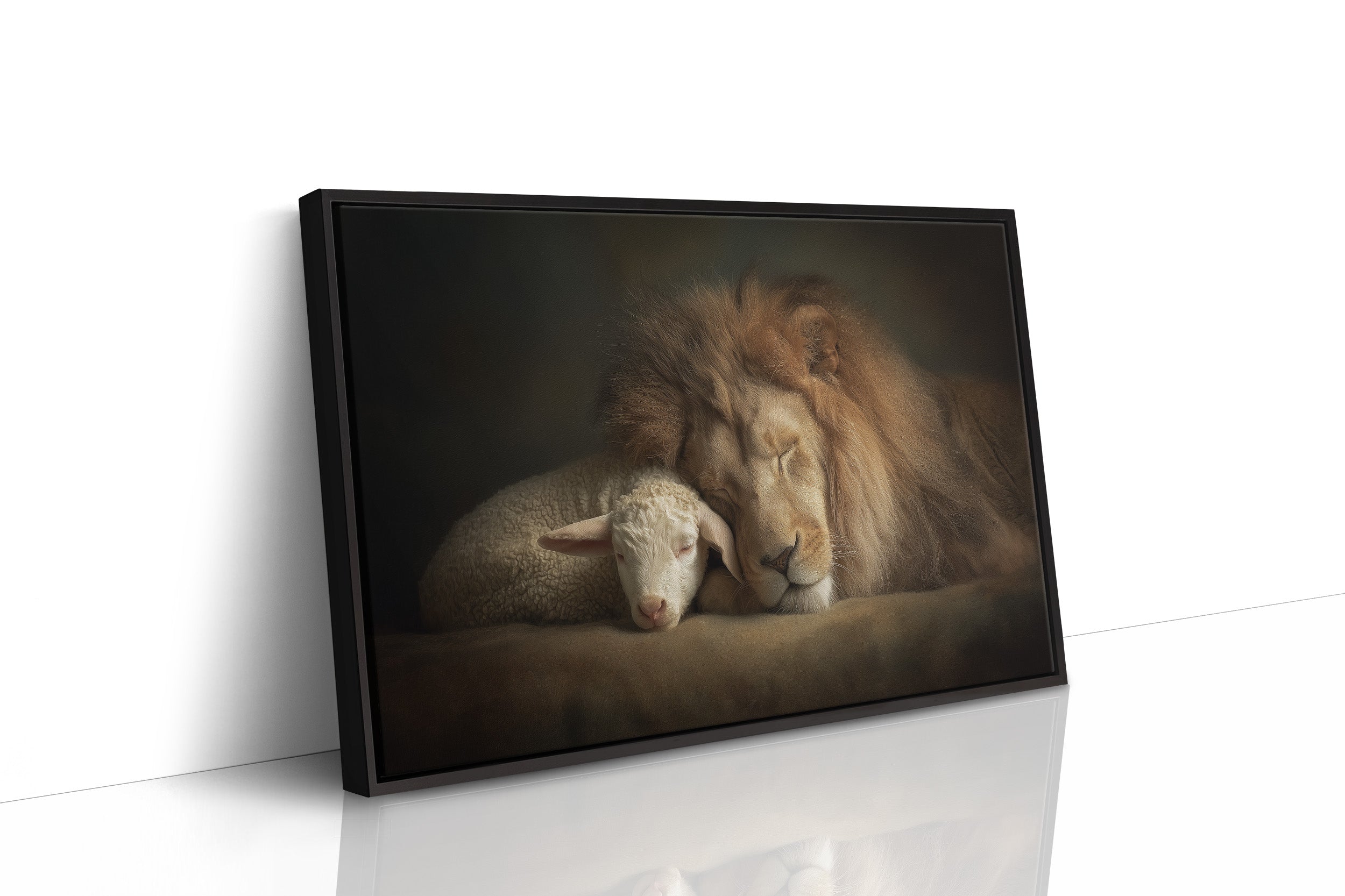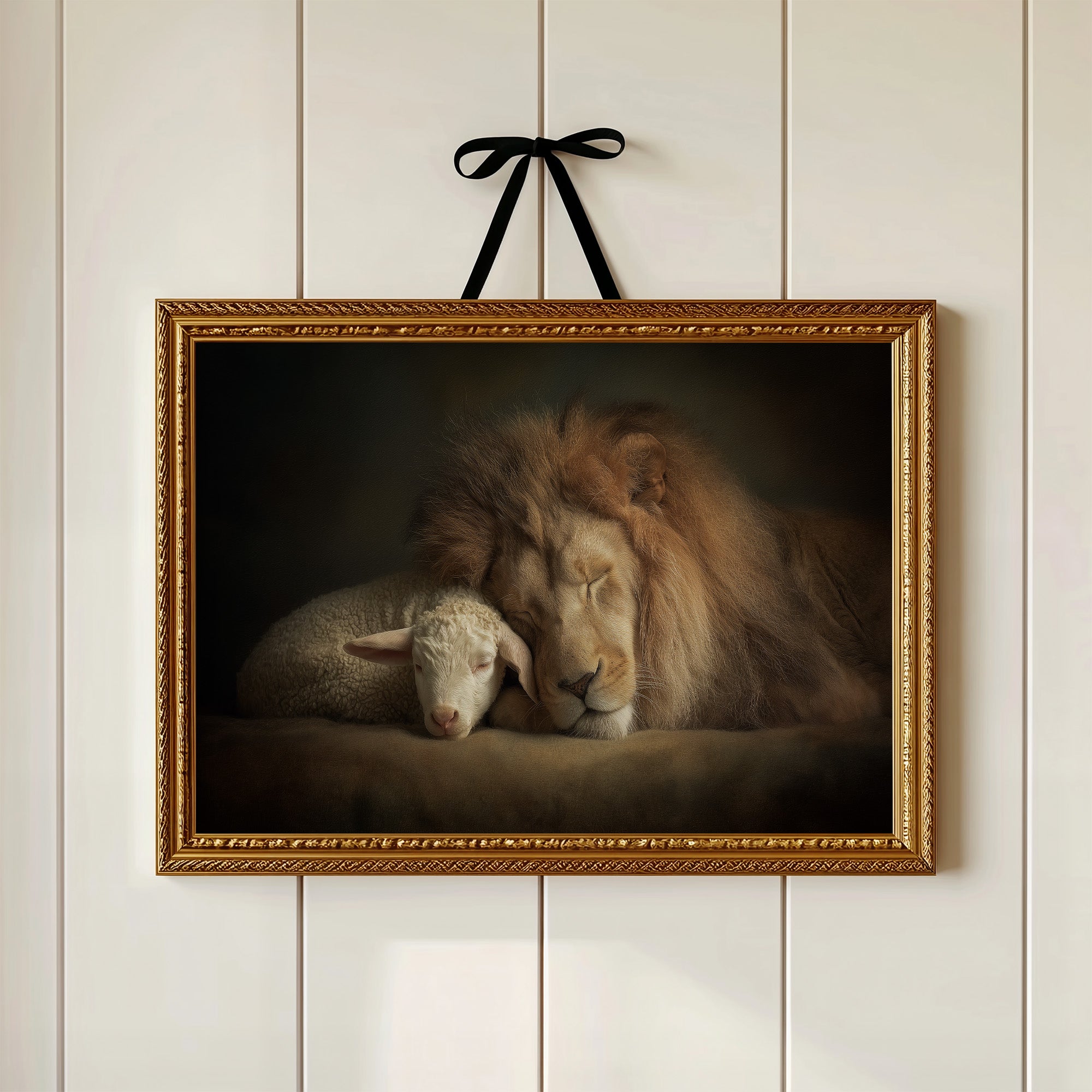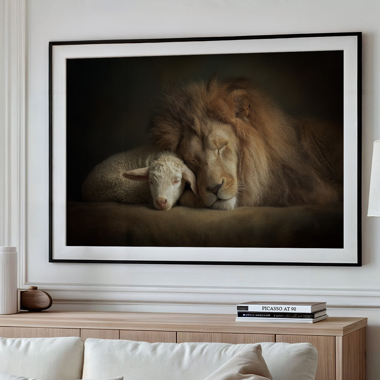 A powerful lion and delicate lamb rest together in peaceful harmony, their forms softened by warm, golden light against a dark background. The contrast between the mighty mane of the lion and the innocent white wool of the lamb creates a striking visual metaphor for unexpected companionship and protection. This contemporary portrait captures the essence of unlikely bonds and the beauty found in vulnerability and strength coexisting.