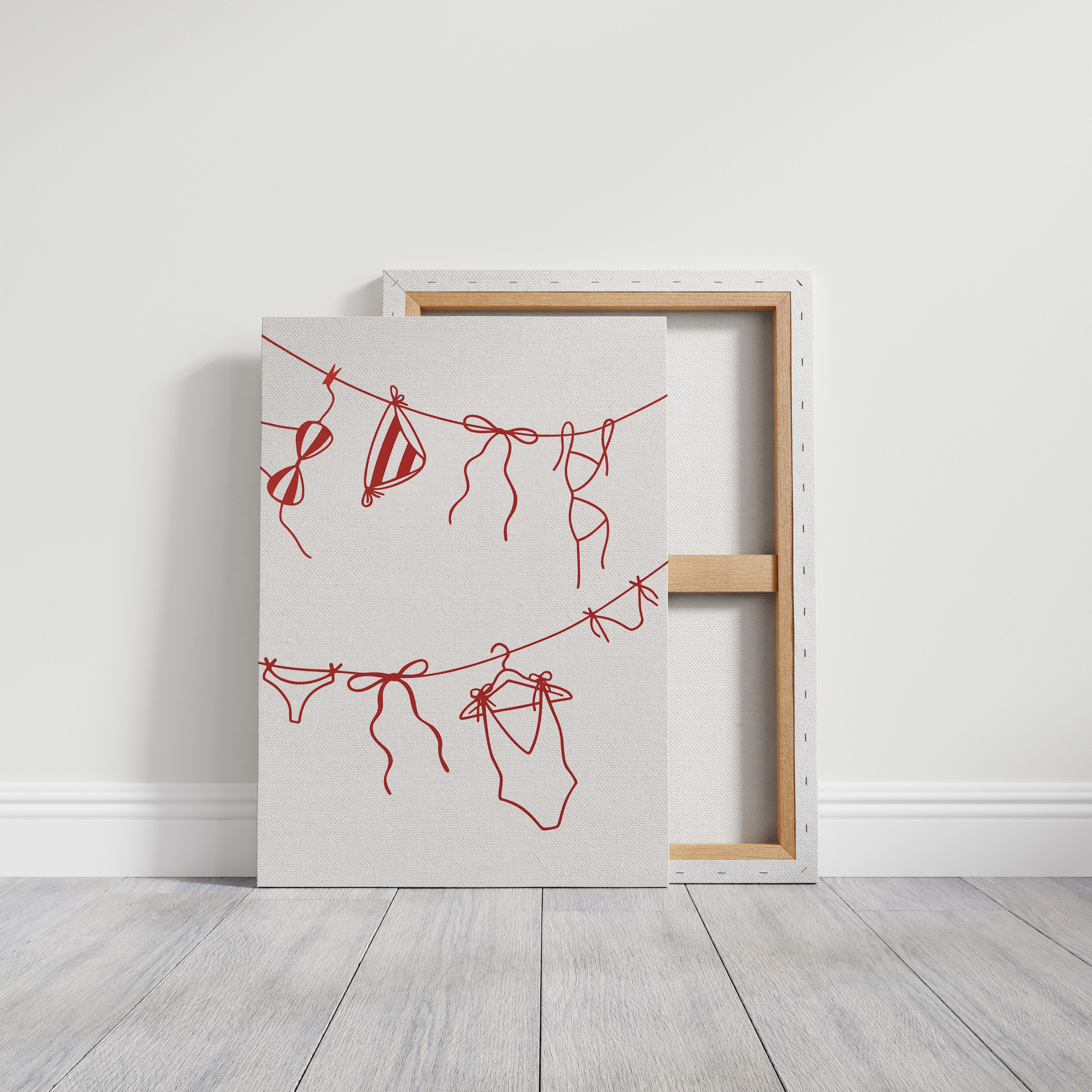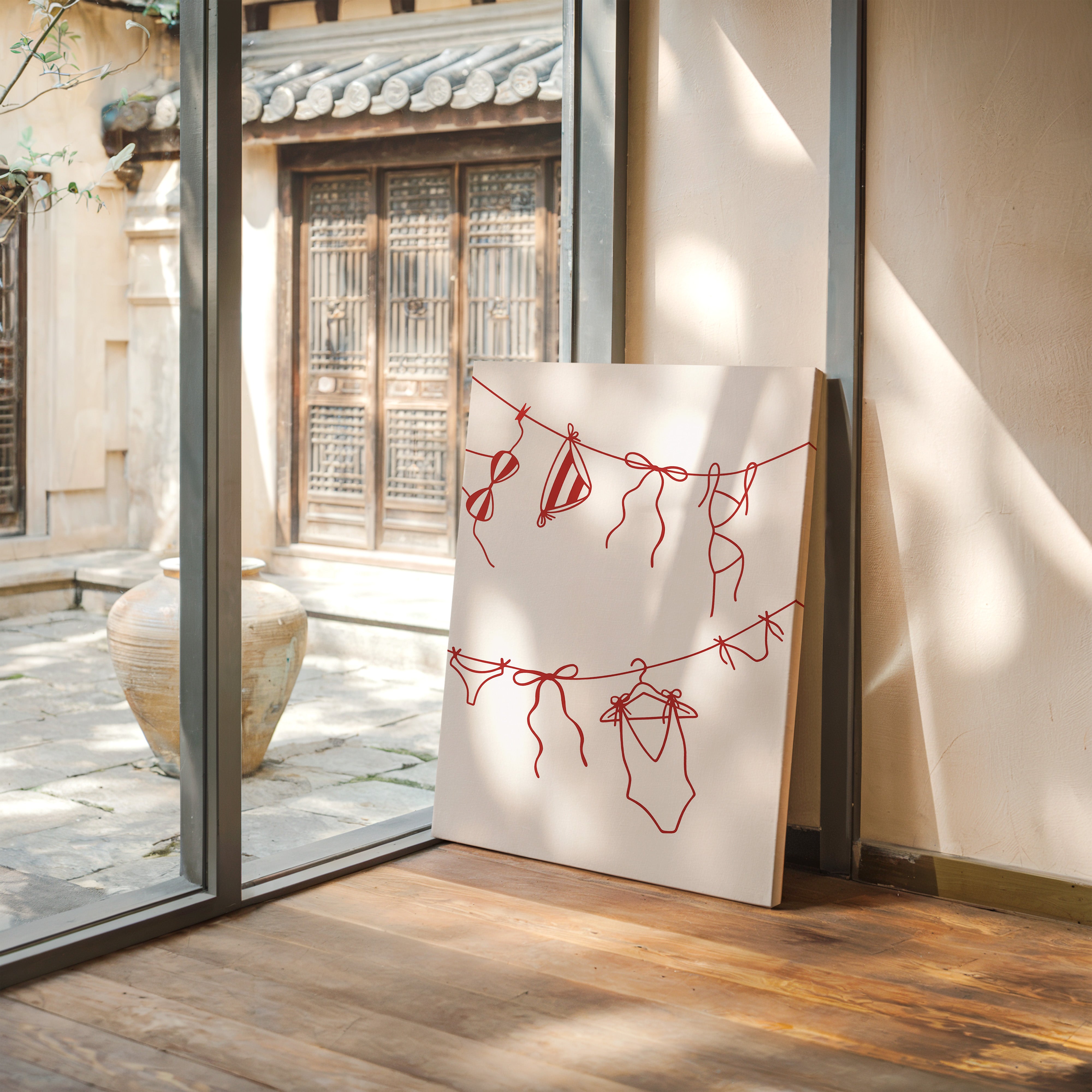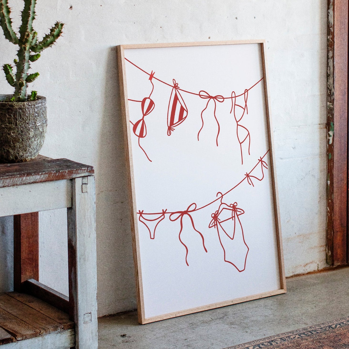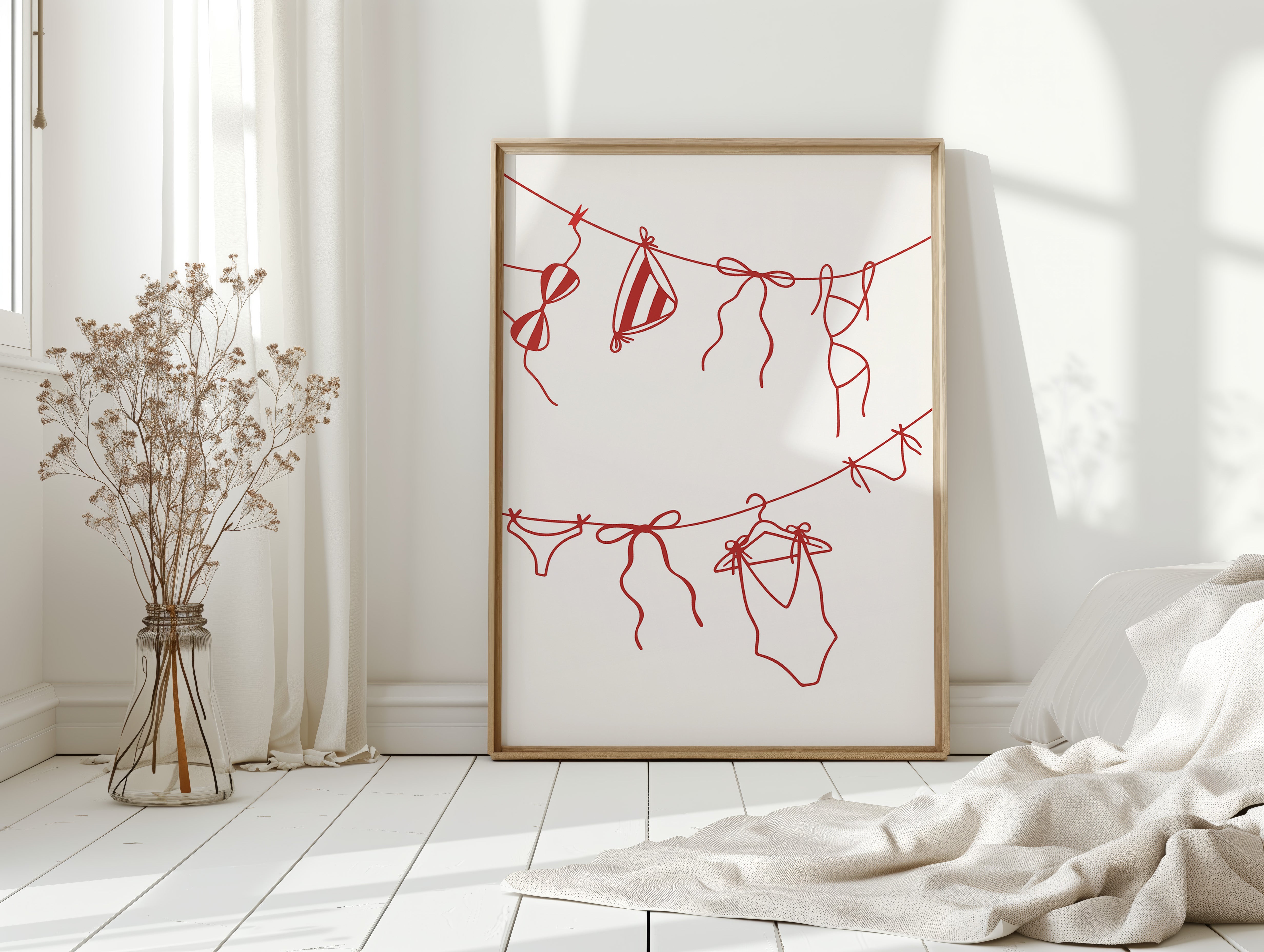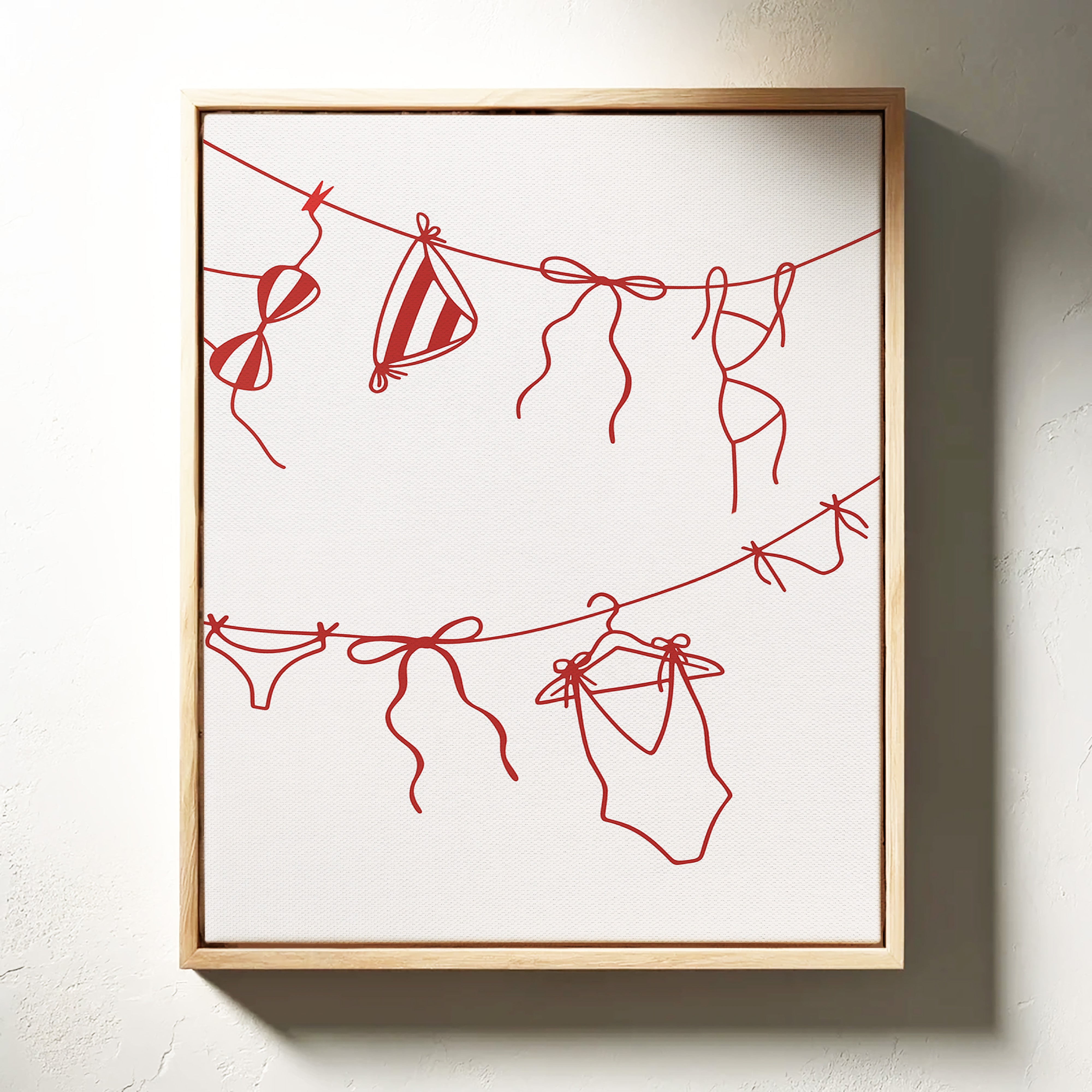 A delicate line drawing captures the carefree spirit of summer, with swimsuits dancing on an invisible breeze. Simple red strokes sketch out a collection of beach essentials strung across a clothesline, each piece telling its own story of sun-soaked adventures. The minimalist design speaks of lazy afternoons and salt-kissed skin, with flowing ribbons and strings adding a playful movement to the composition. Perfect for bringing a touch of summer nostalgia to a bathroom, powder room, or beach house retreat.