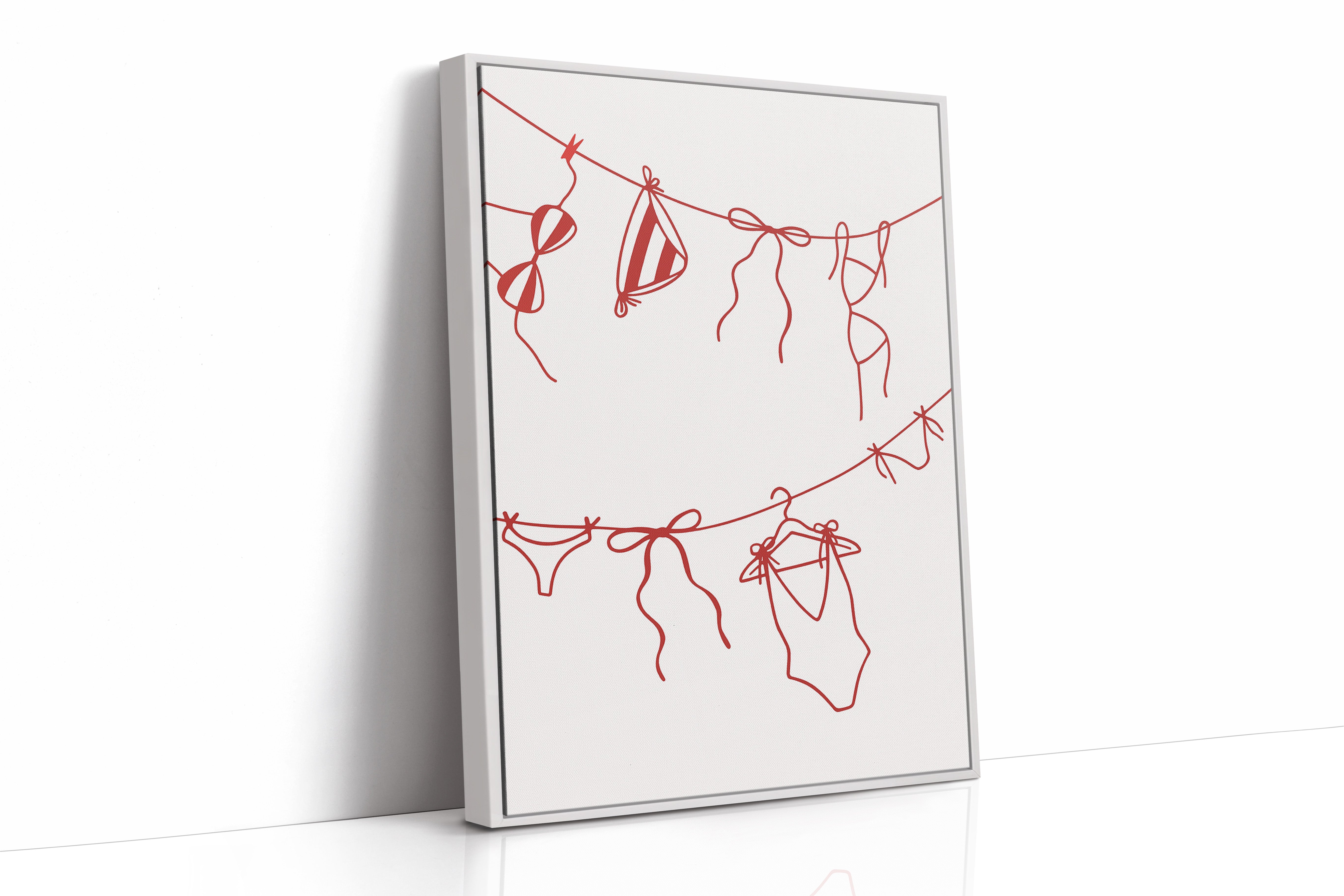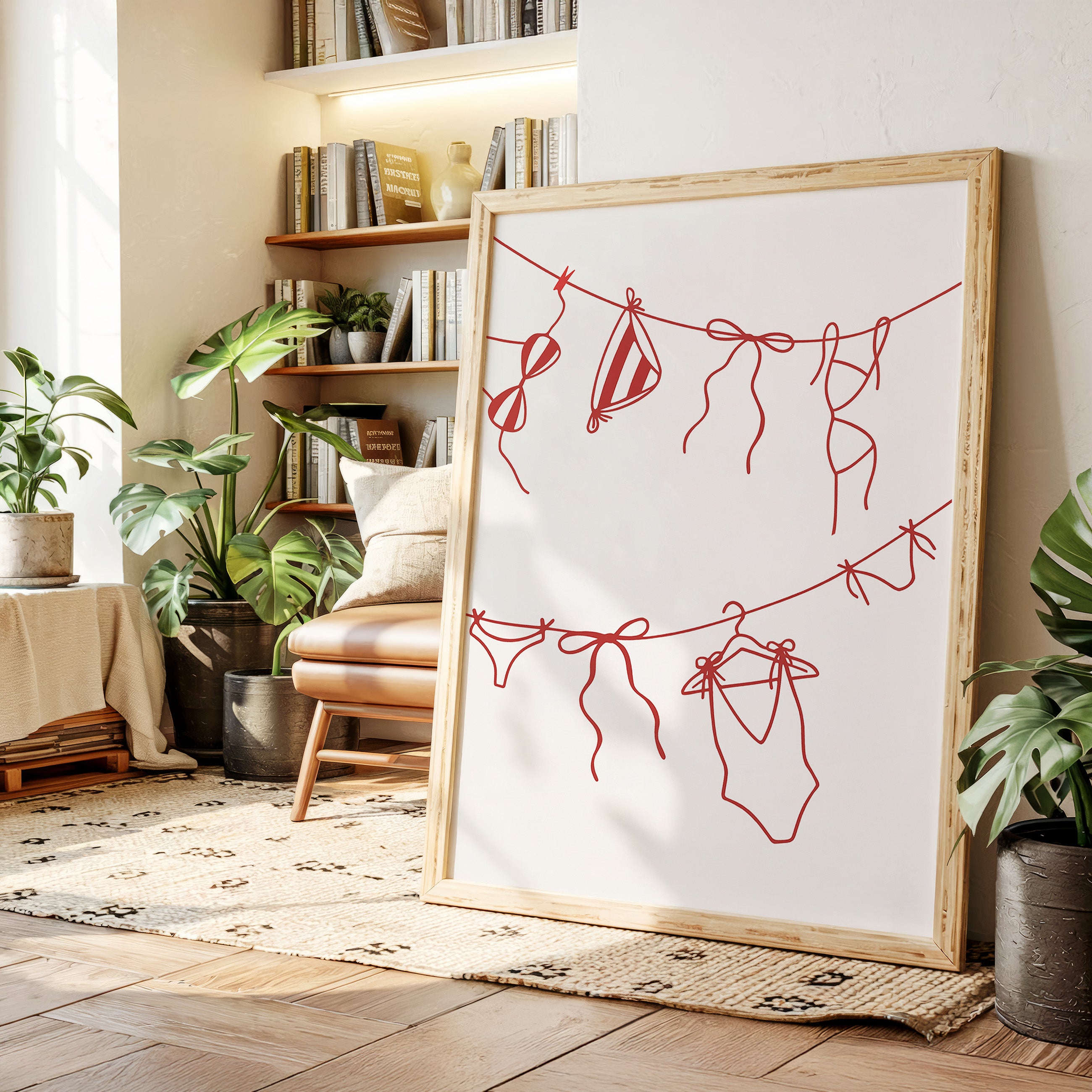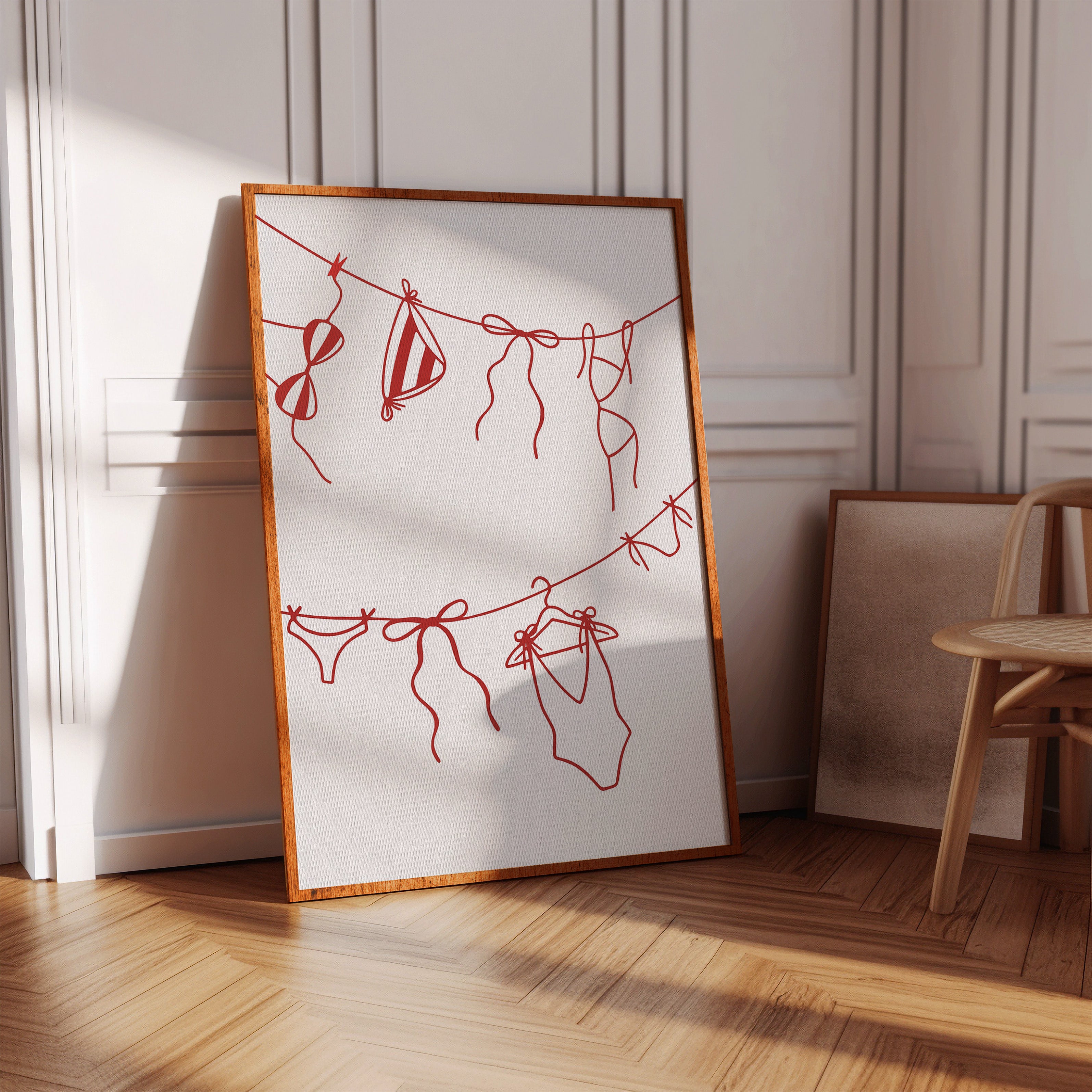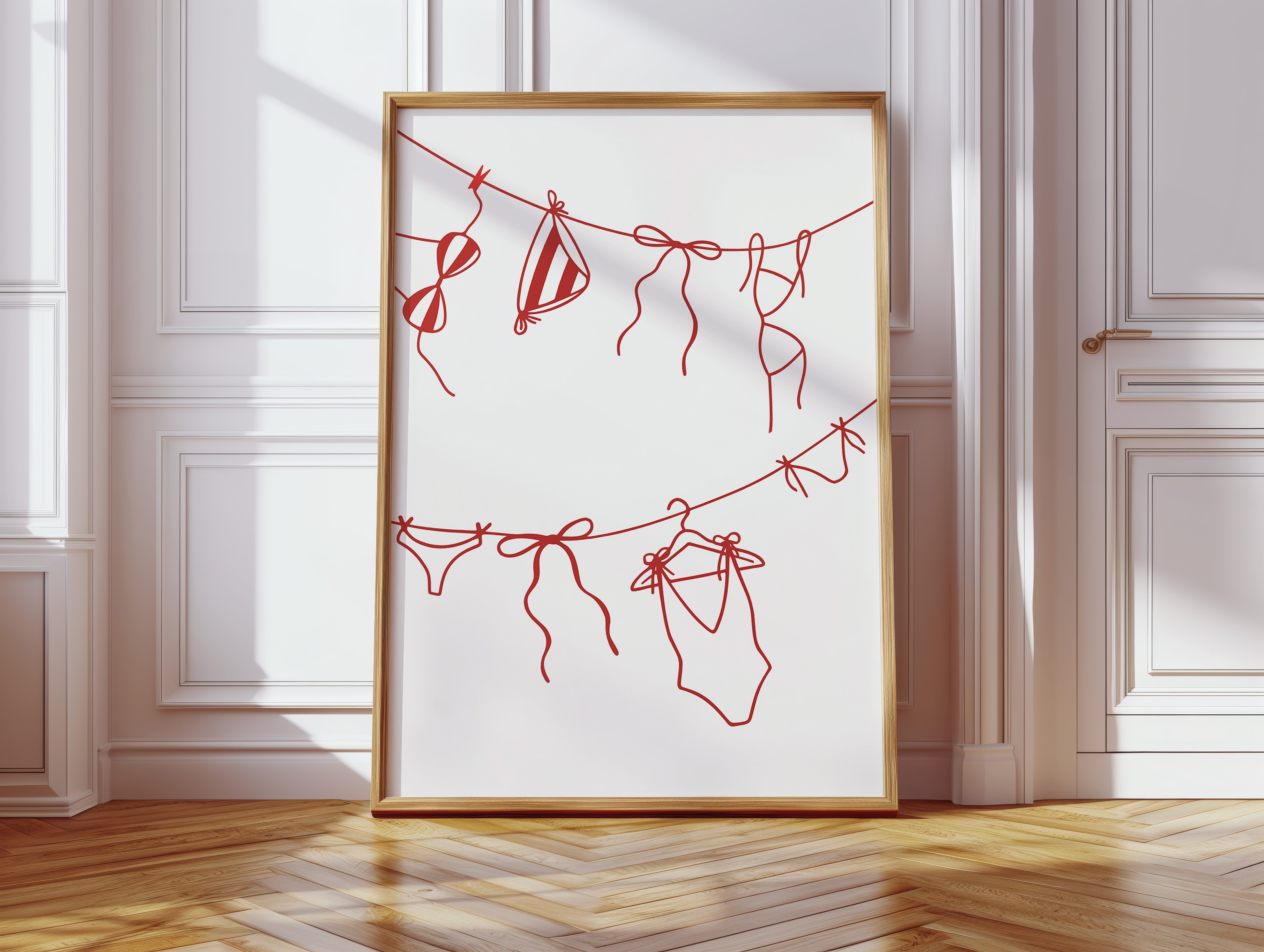 A delicate line drawing captures the carefree spirit of summer, with swimsuits dancing on an invisible breeze. Simple red strokes sketch out a collection of beach essentials strung across a clothesline, each piece telling its own story of sun-soaked adventures. The minimalist design speaks of lazy afternoons and salt-kissed skin, with flowing ribbons and strings adding a playful movement to the composition. Perfect for bringing a touch of summer nostalgia to a bathroom, powder room, or beach house retreat.