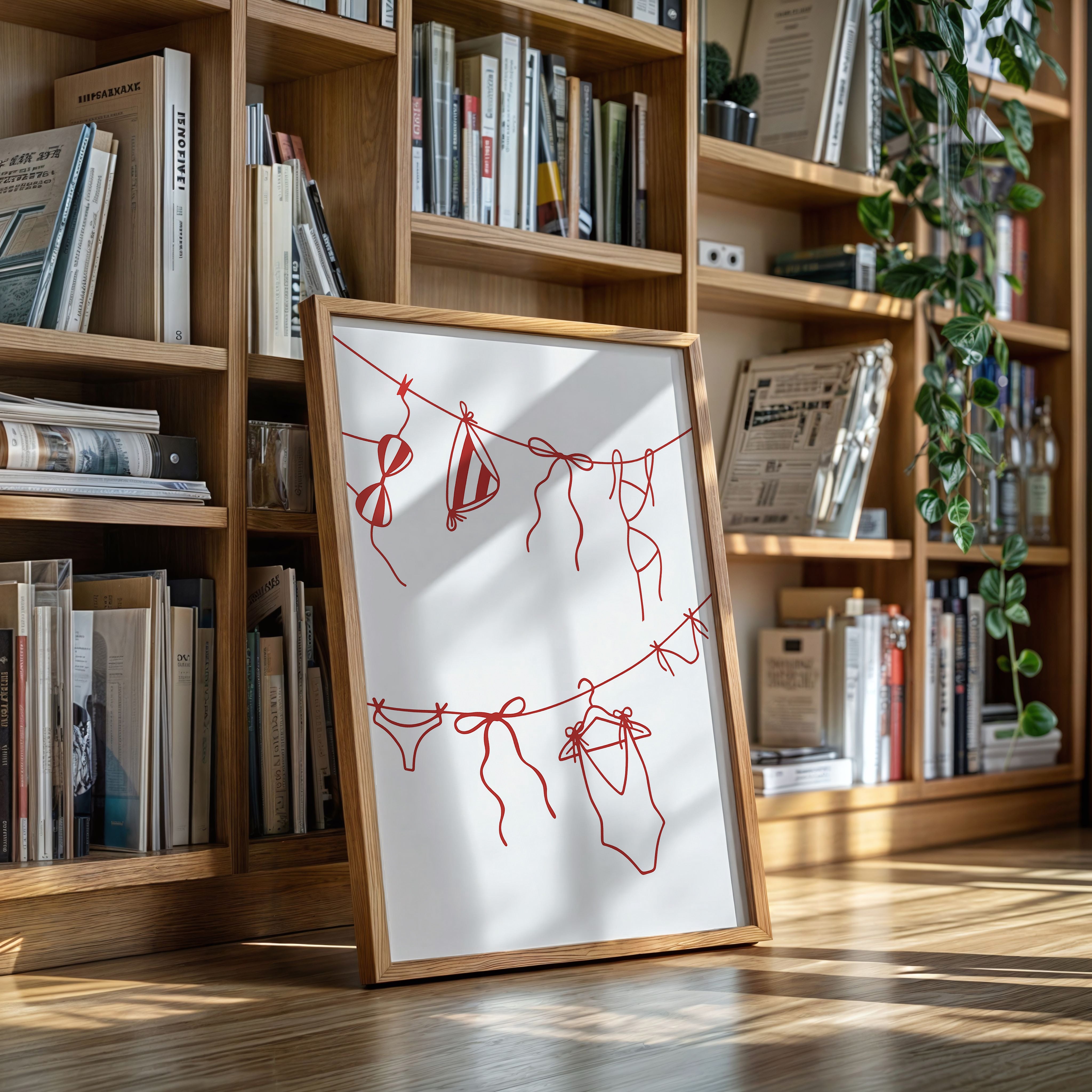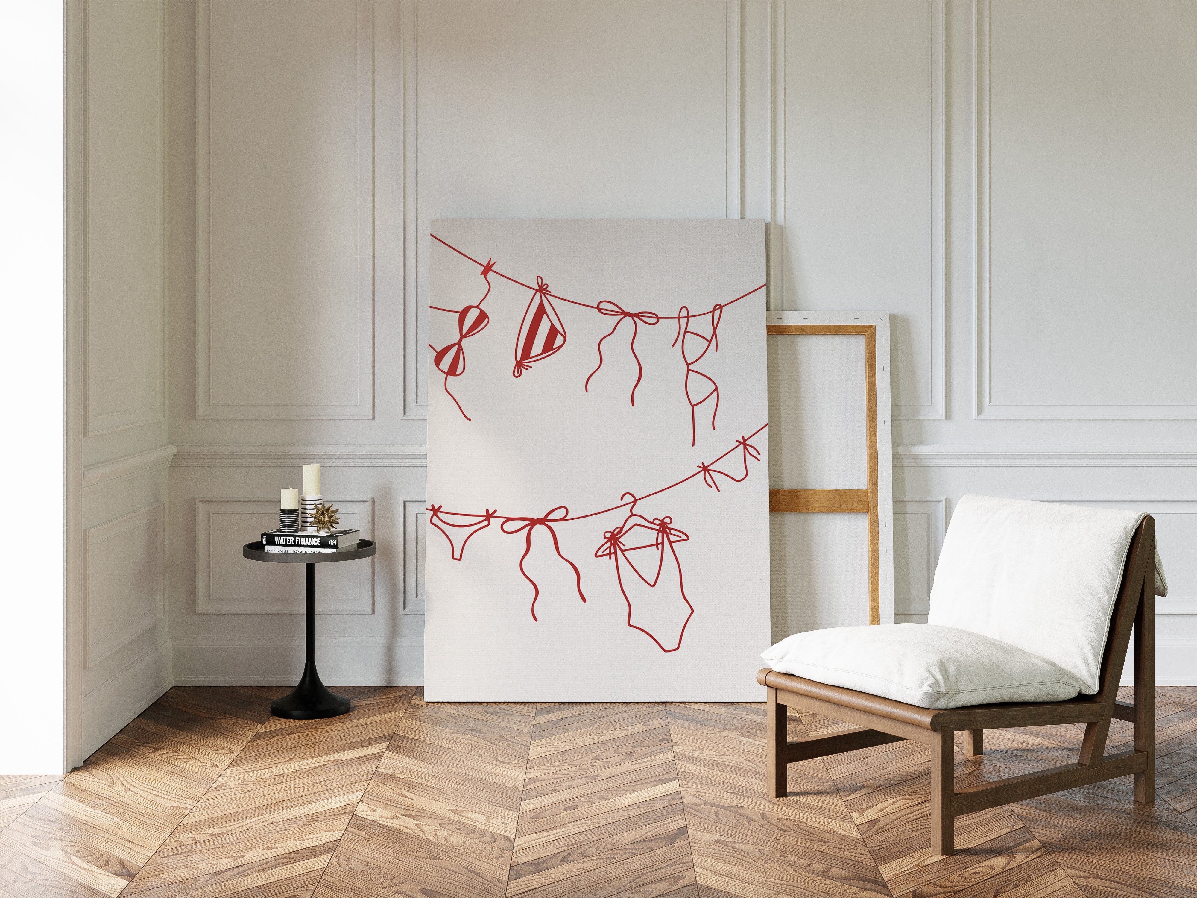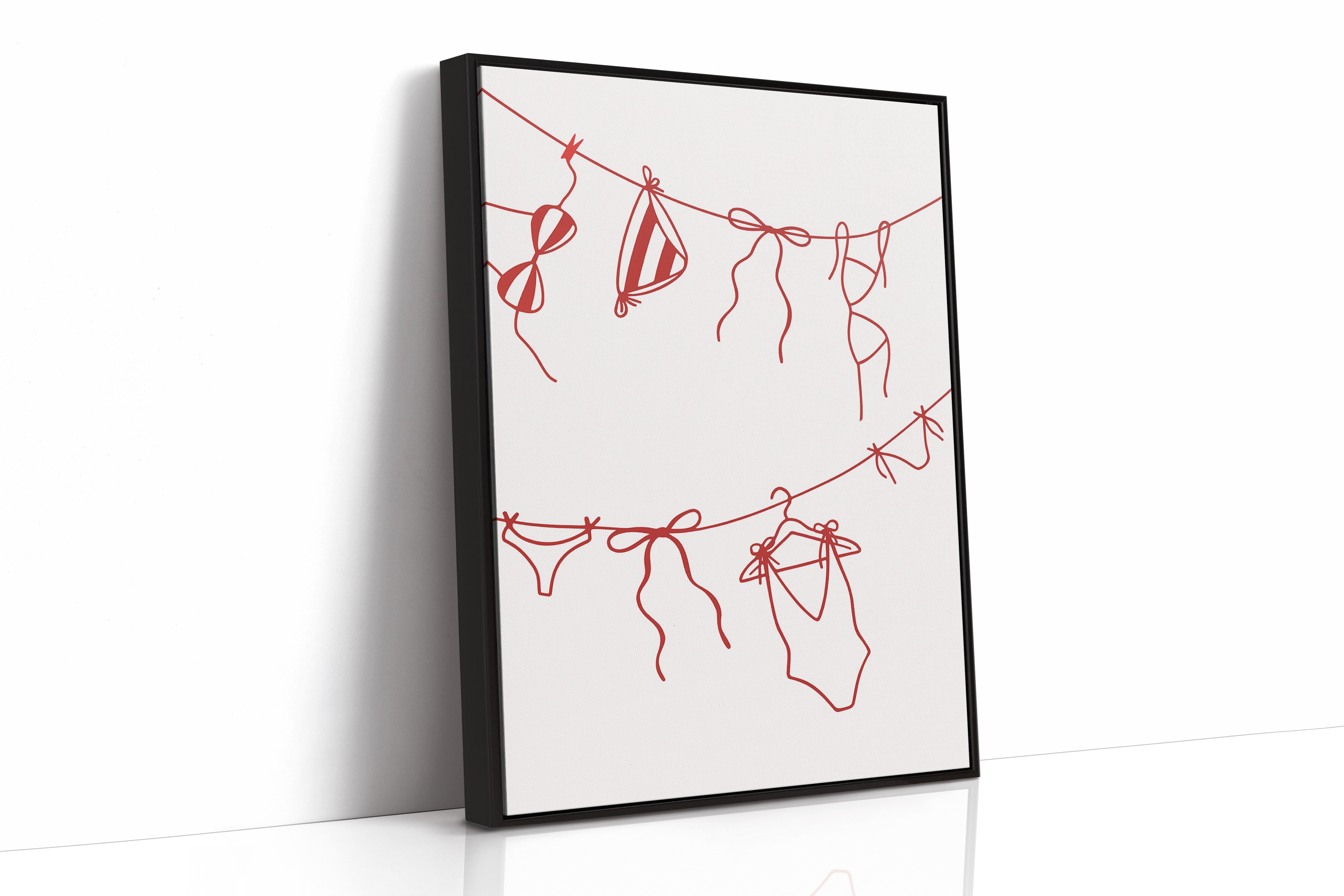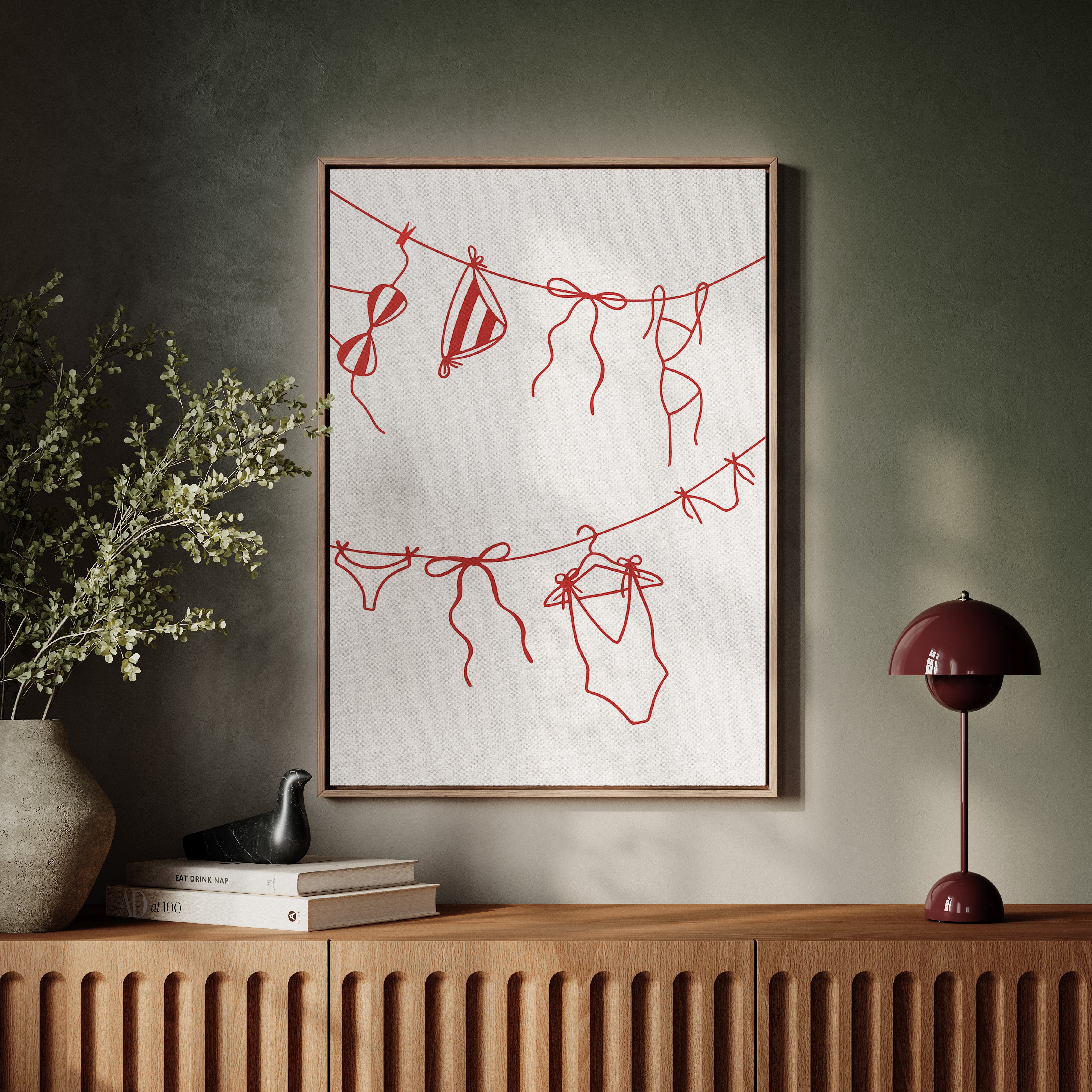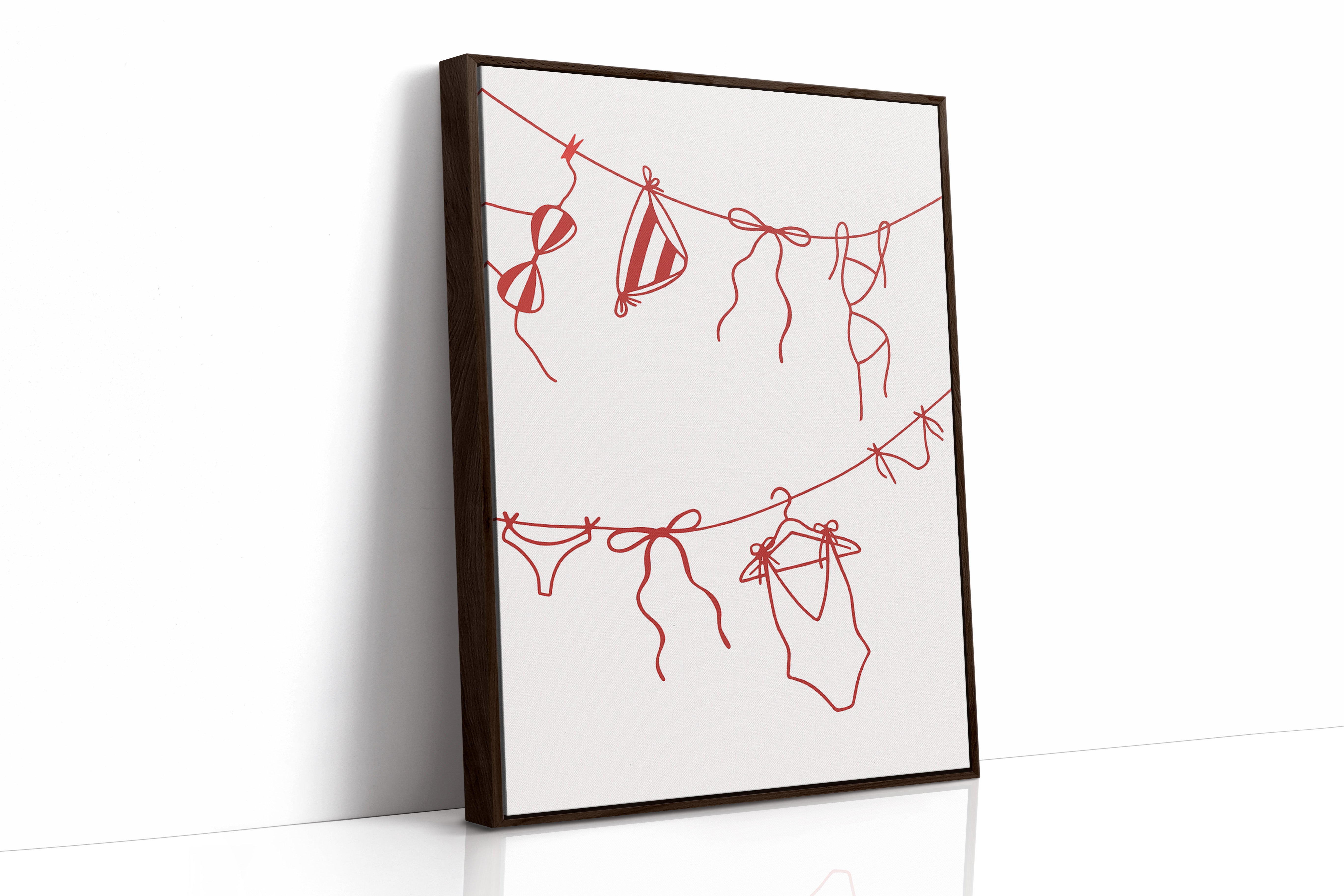 A delicate line drawing captures the carefree spirit of summer, with swimsuits dancing on an invisible breeze. Simple red strokes sketch out a collection of beach essentials strung across a clothesline, each piece telling its own story of sun-soaked adventures. The minimalist design speaks of lazy afternoons and salt-kissed skin, with flowing ribbons and strings adding a playful movement to the composition. Perfect for bringing a touch of summer nostalgia to a bathroom, powder room, or beach house retreat.