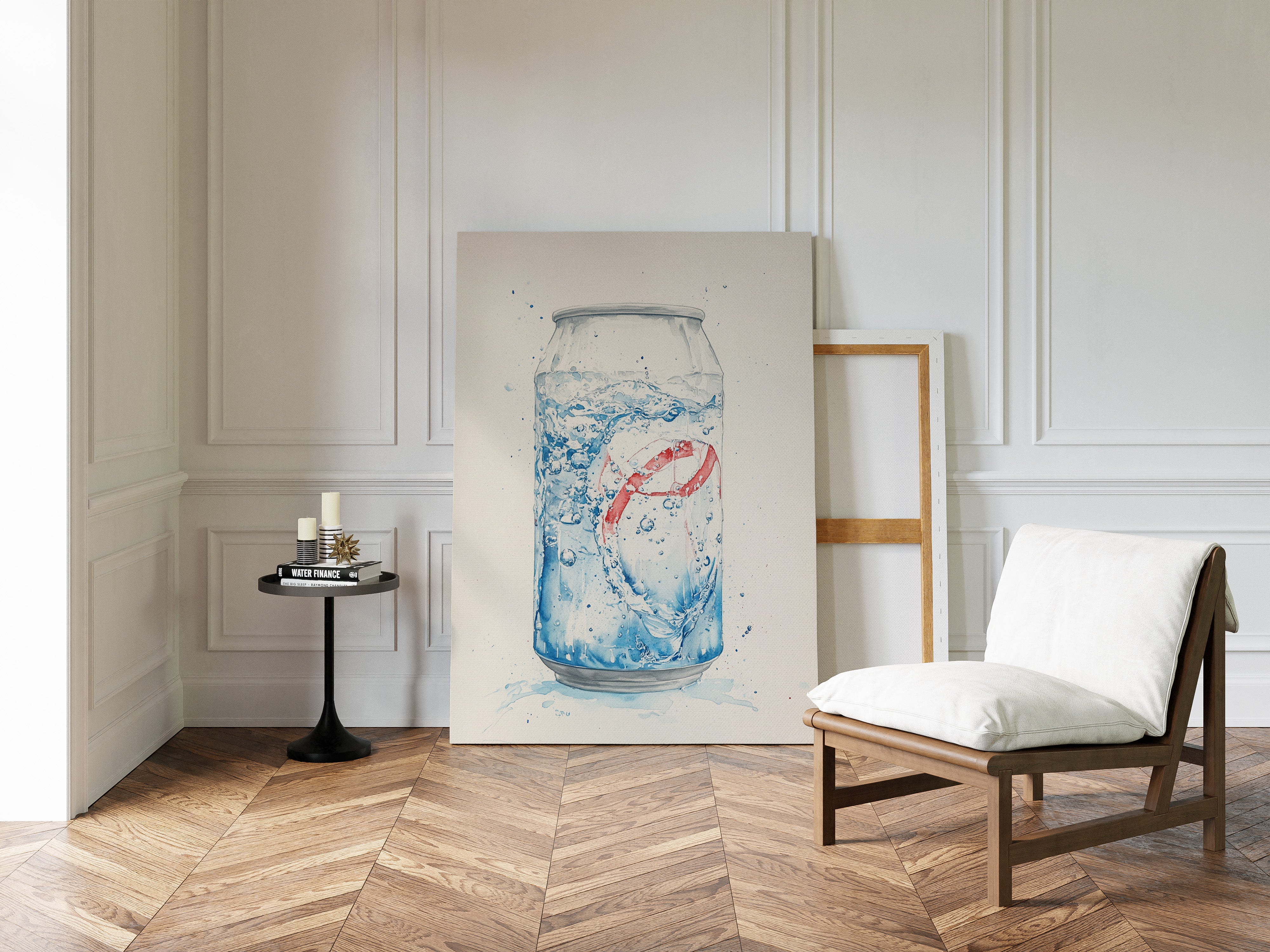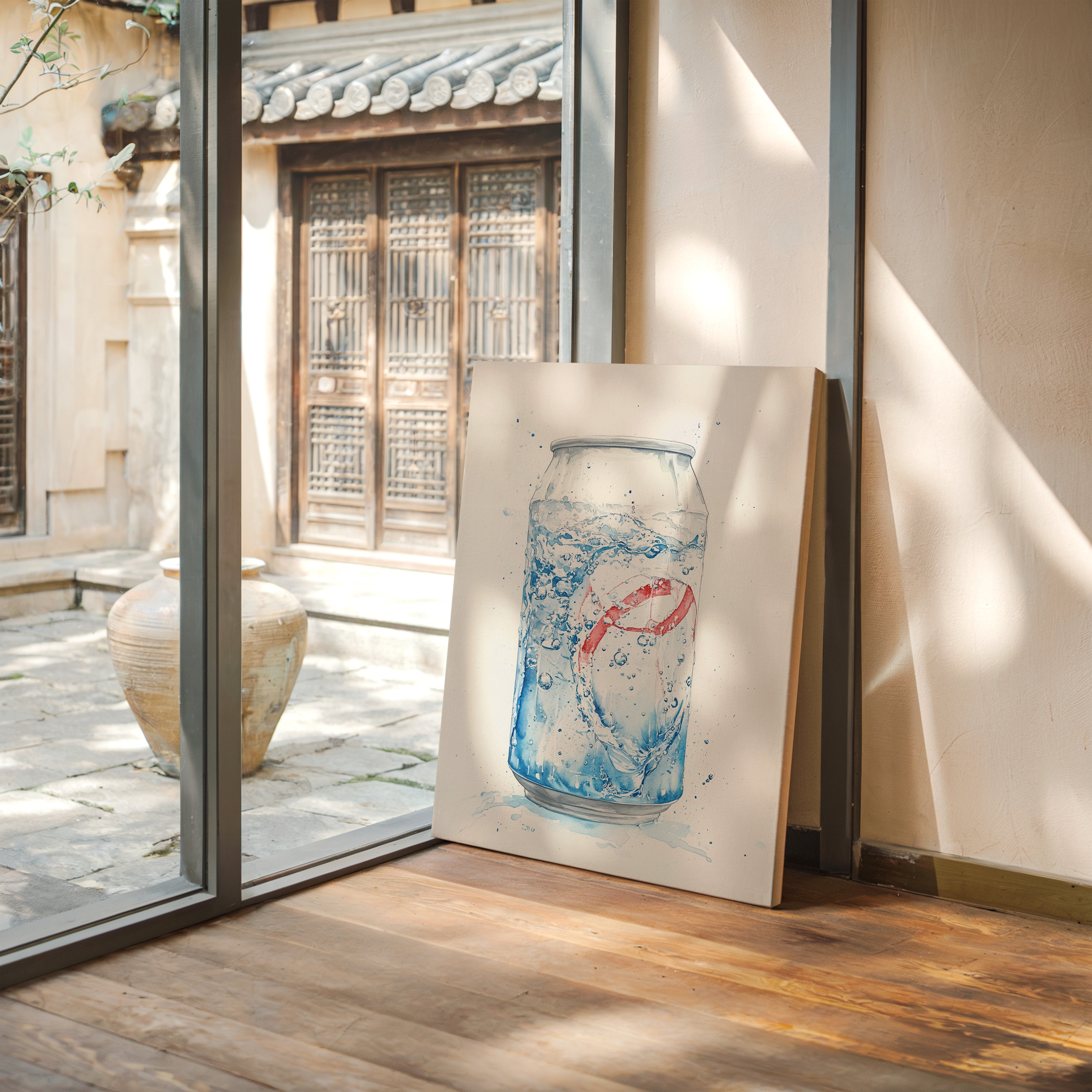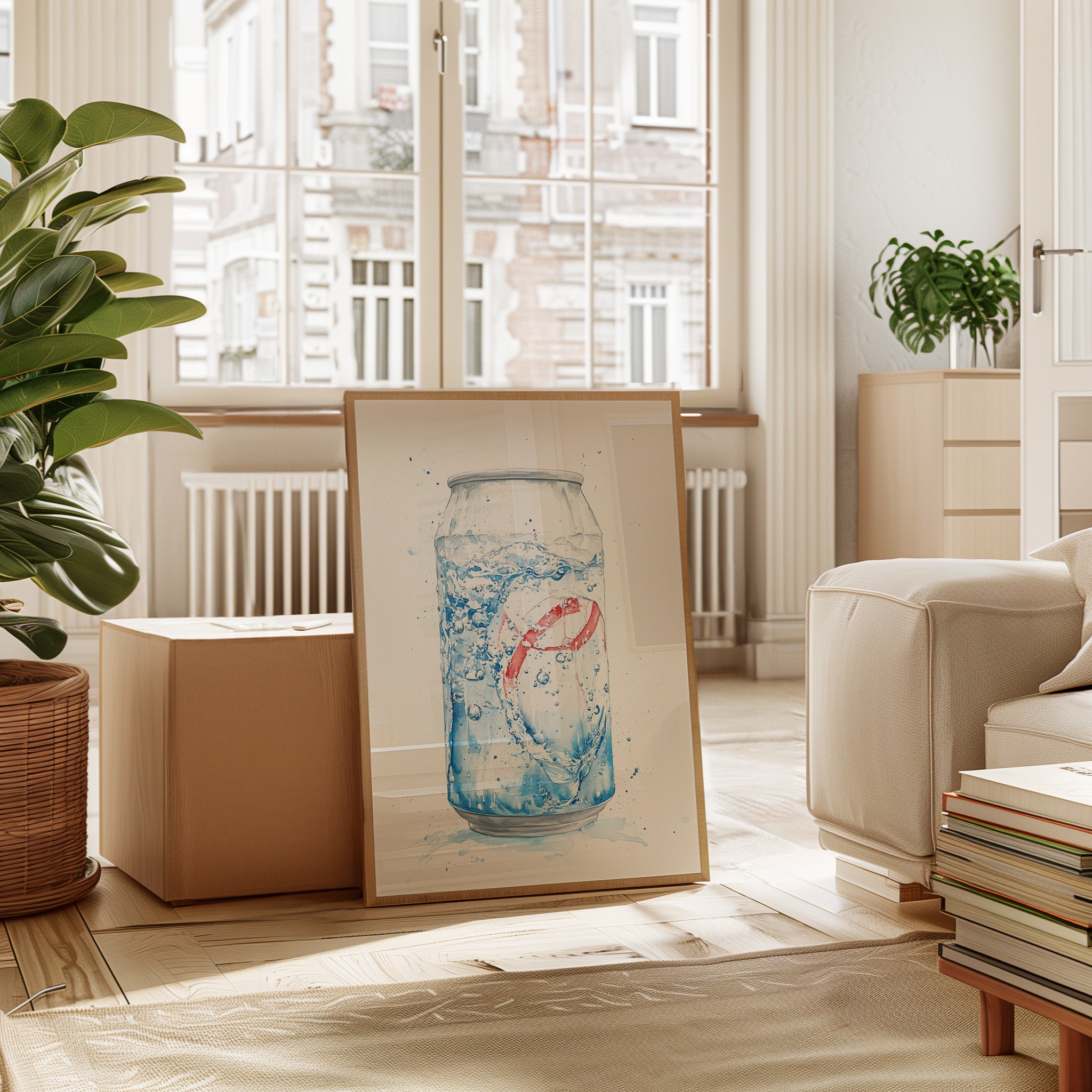 Crystalline droplets cascade through effervescent waters, capturing a moment of pure refreshment frozen in time. The delicate watercolor technique brings to life the interplay between crisp blue liquid and the bold red logo, creating a symphony of splashes and fizzy motion. Light dances through the transparent can, revealing countless tiny bubbles rising like stars in an aqua sky. This piece would bring a cool, contemporary energy to a modern kitchen or add a playful pop to a casual dining space.