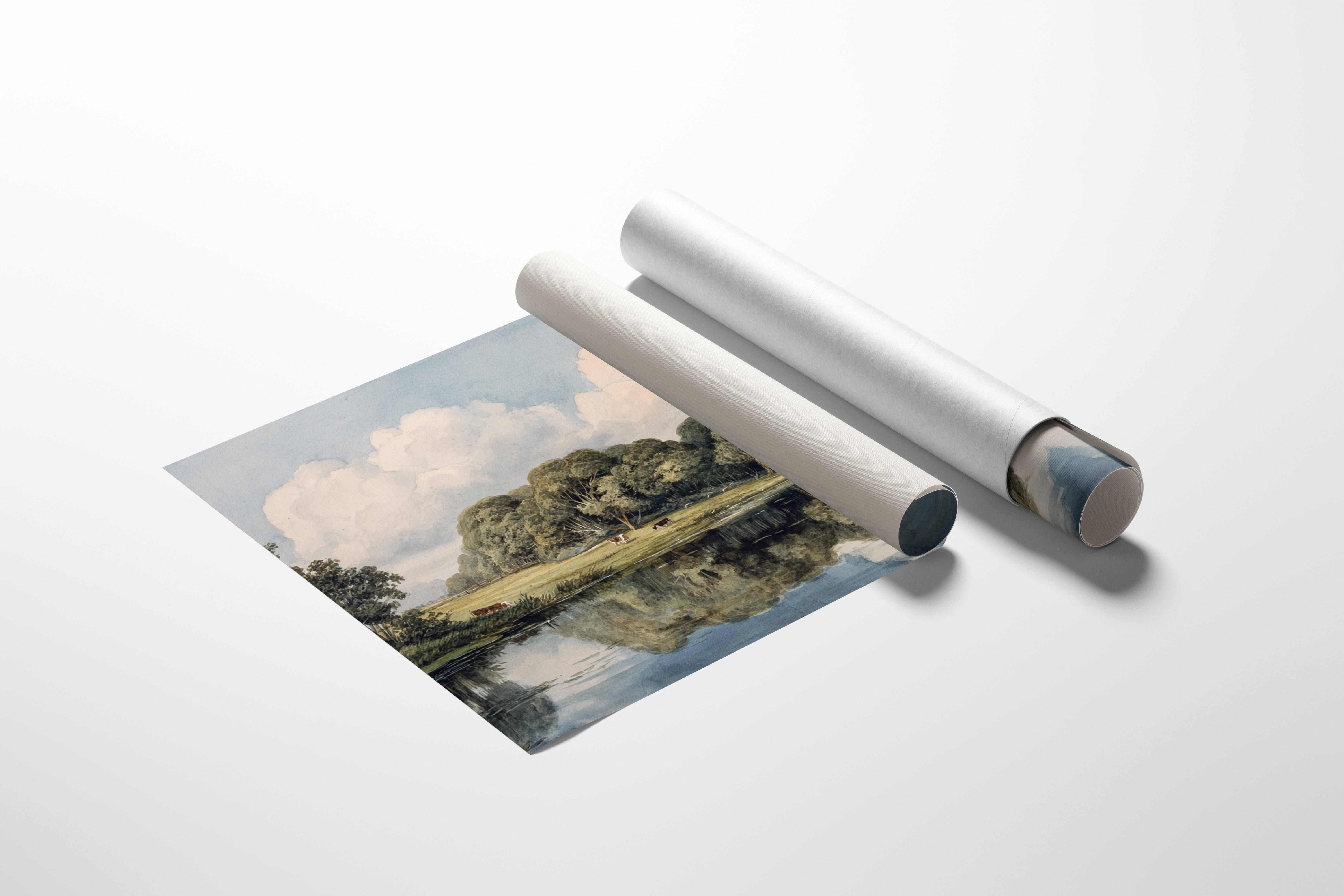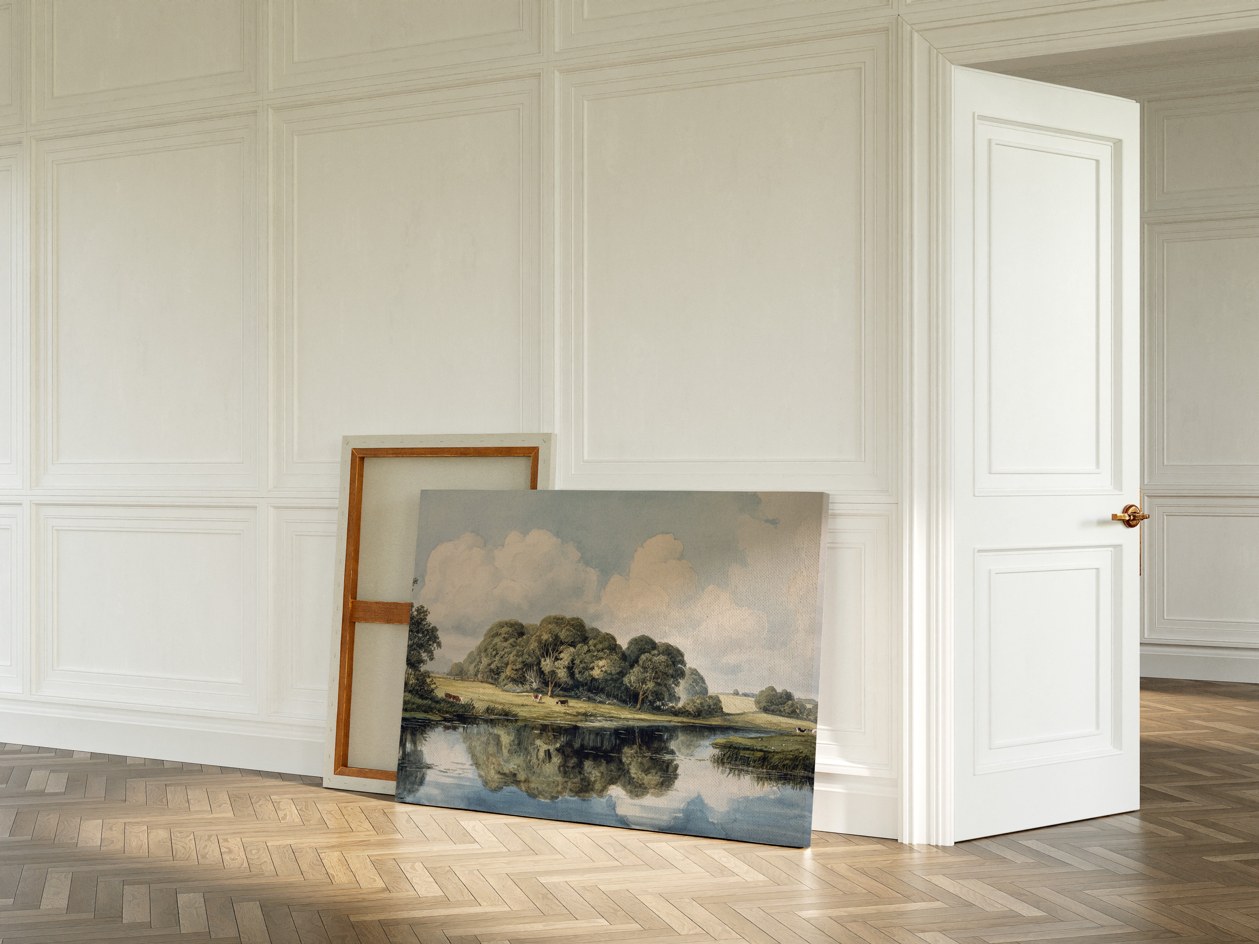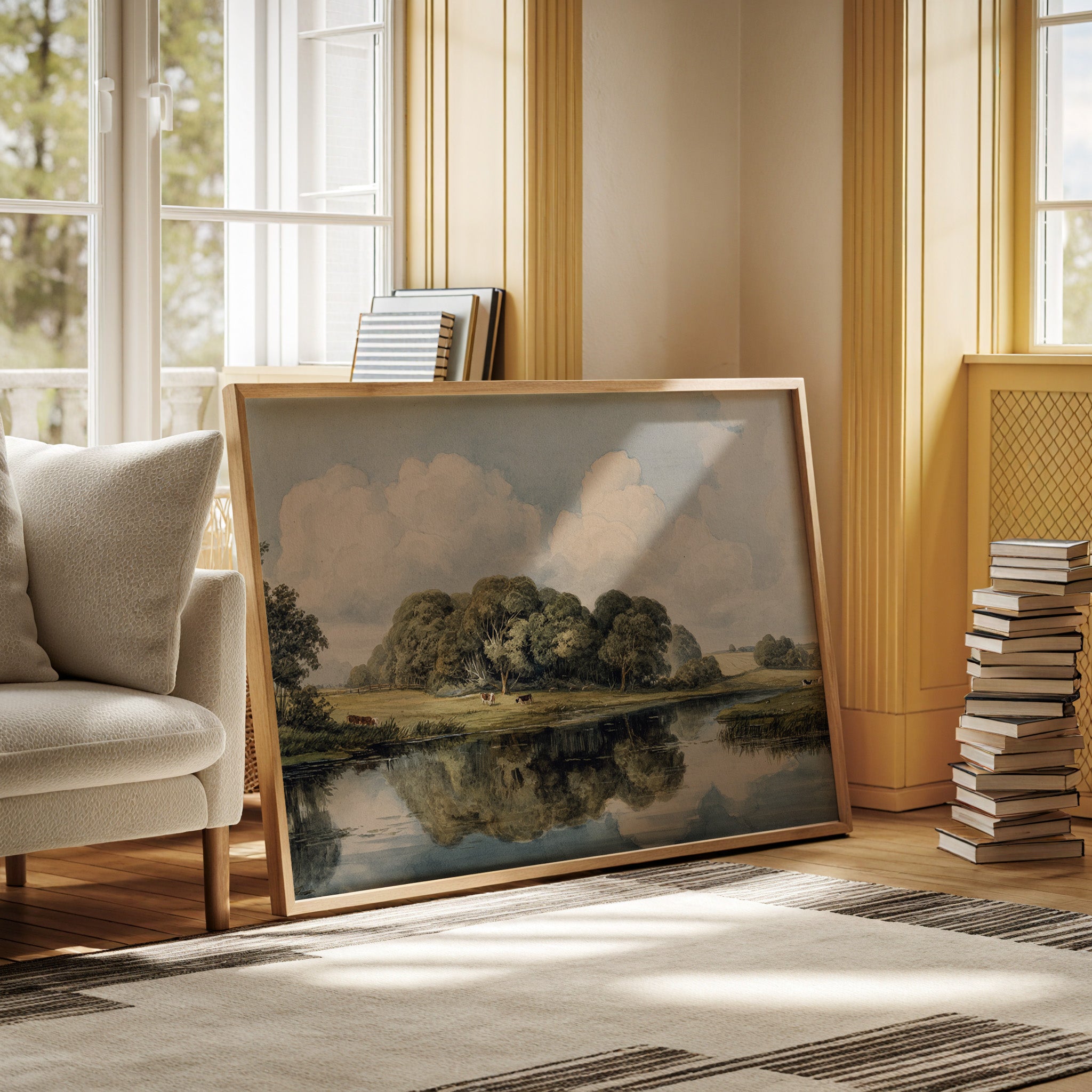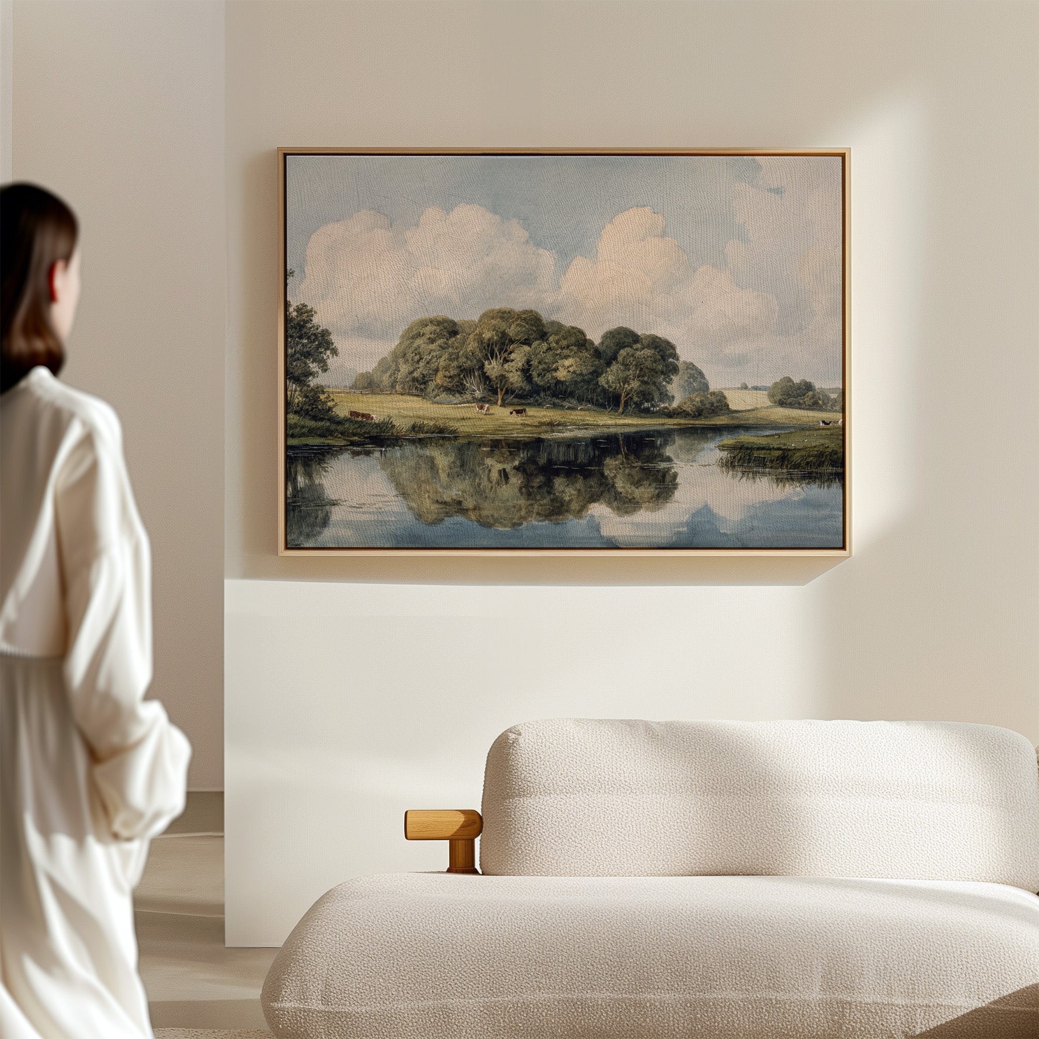 "A pastoral moment unfolds where earth meets sky in perfect symmetry. Gentle clouds drift across a summer sky while cattle graze contentedly along the riverbank, their forms small against the grandeur of ancient trees. The watercolor captures the essence of a timeless English countryside, where massive oaks and elms create a verdant canopy reflected in mirror-like waters below. Rolling hills stretch into the distance, creating a rhythm of gentle slopes and wooded groves that speak to the cultivated wilderness of rural landscapes. This tranquil scene would bring a sense of pastoral serenity to a formal living room or study, where its balanced composition and muted palette could anchor a traditional decor scheme.