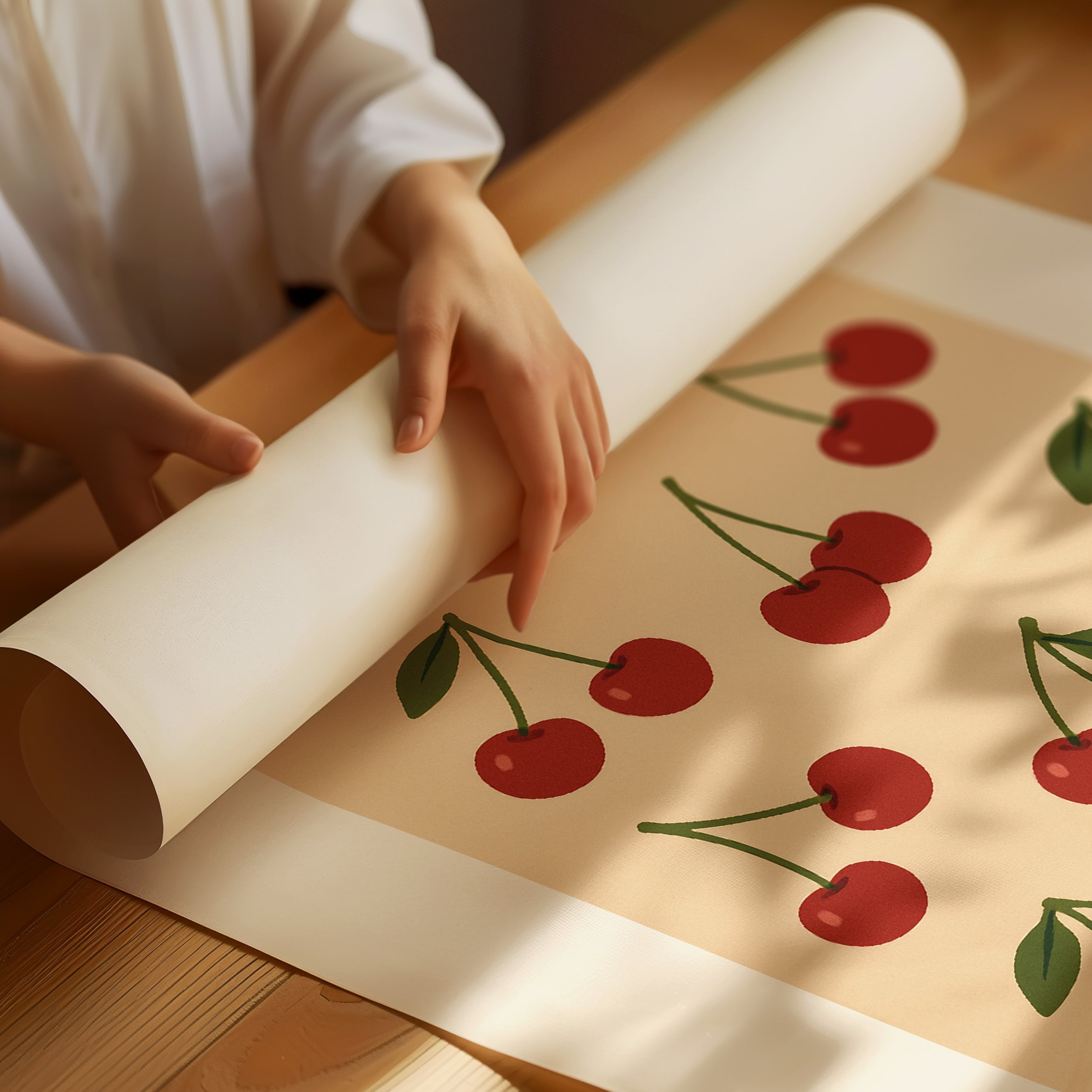 Ripe cherries dance across a warm cream canvas, each pair suspended in perfect stillness. The vibrant red fruit glows with summer's promise, their slender green stems and occasional leaves creating a rhythmic pattern against the soft beige background. Below, the bold cursive "Peace" grounds the composition with a gentle reminder of life's simple pleasures. This piece would bring a cheerful touch to a kitchen wall or dining area, inviting moments of calm appreciation amid busy days.