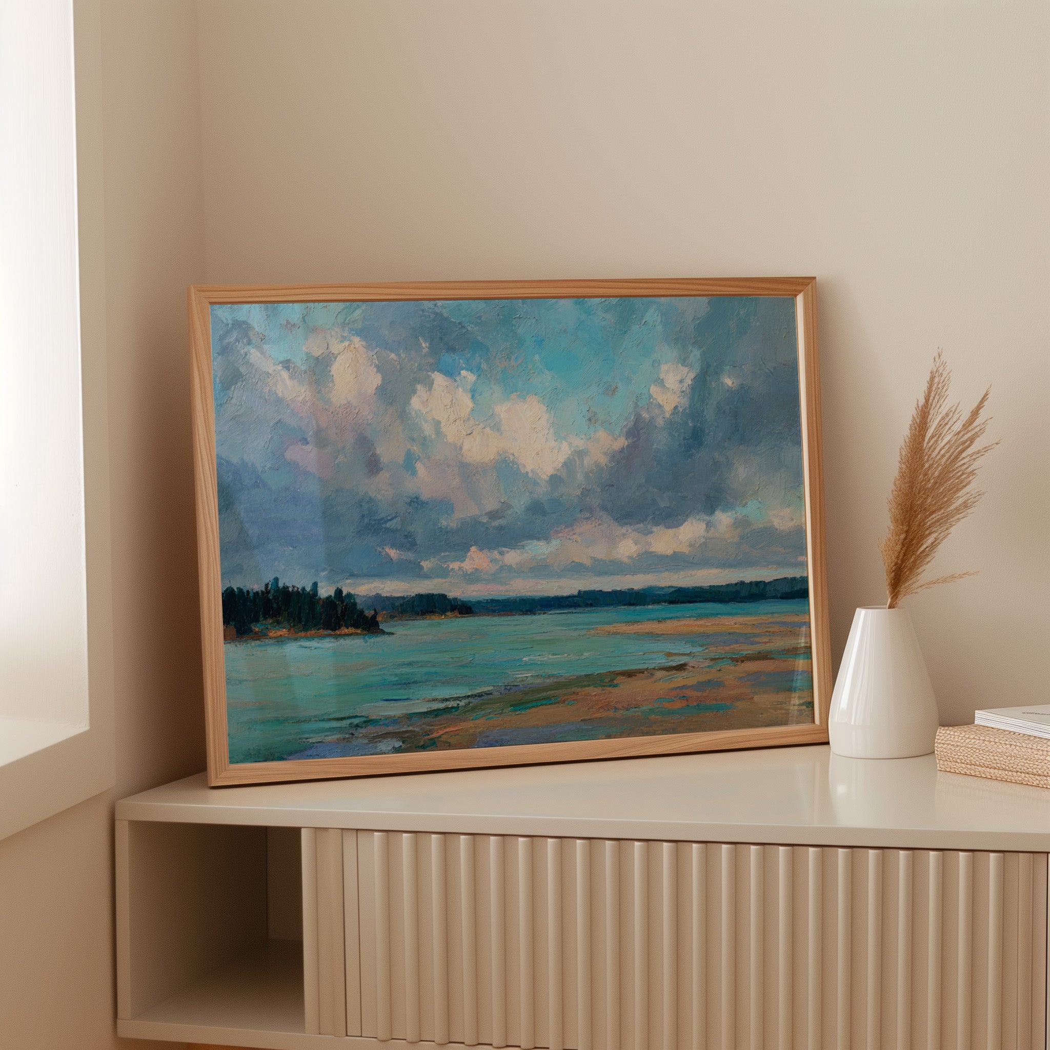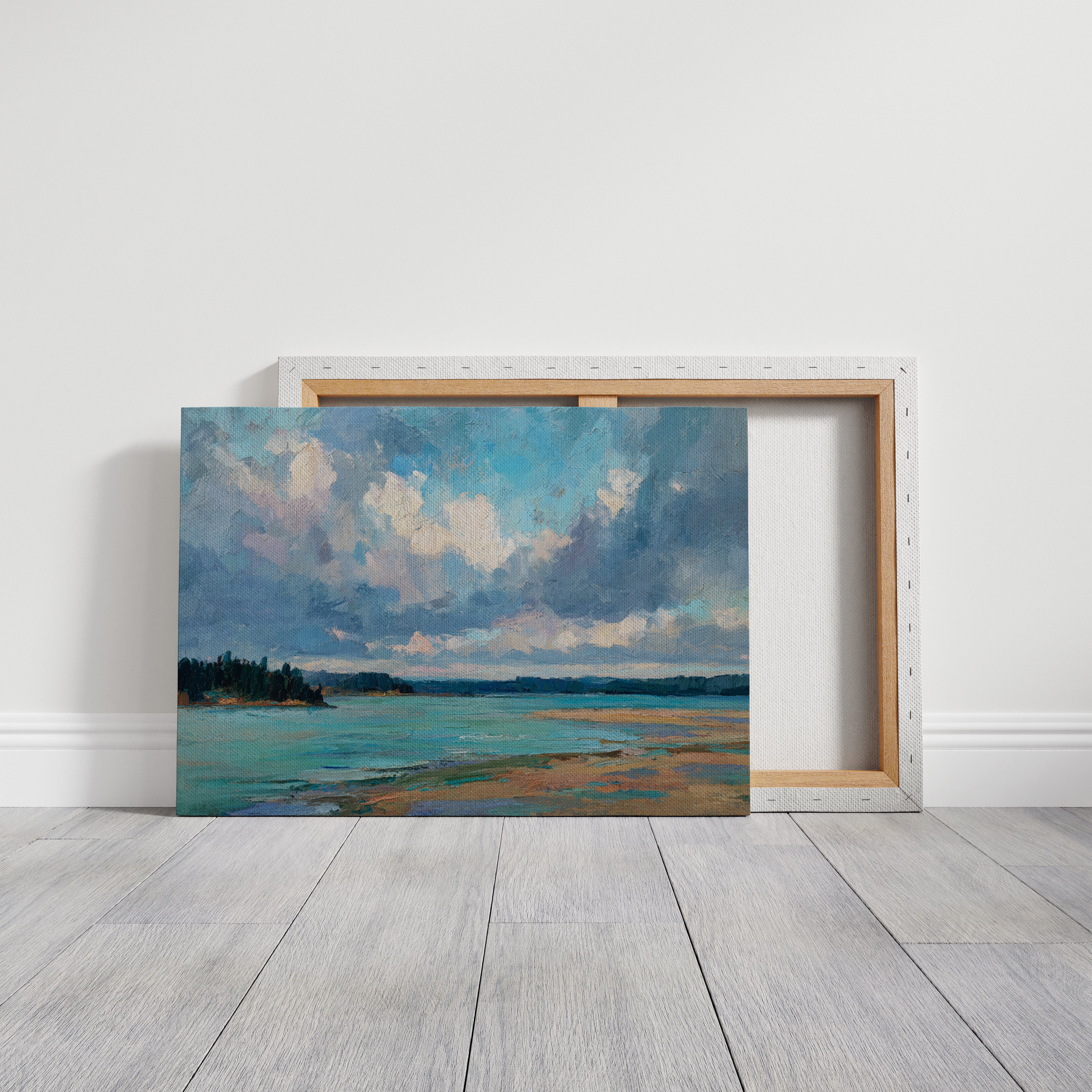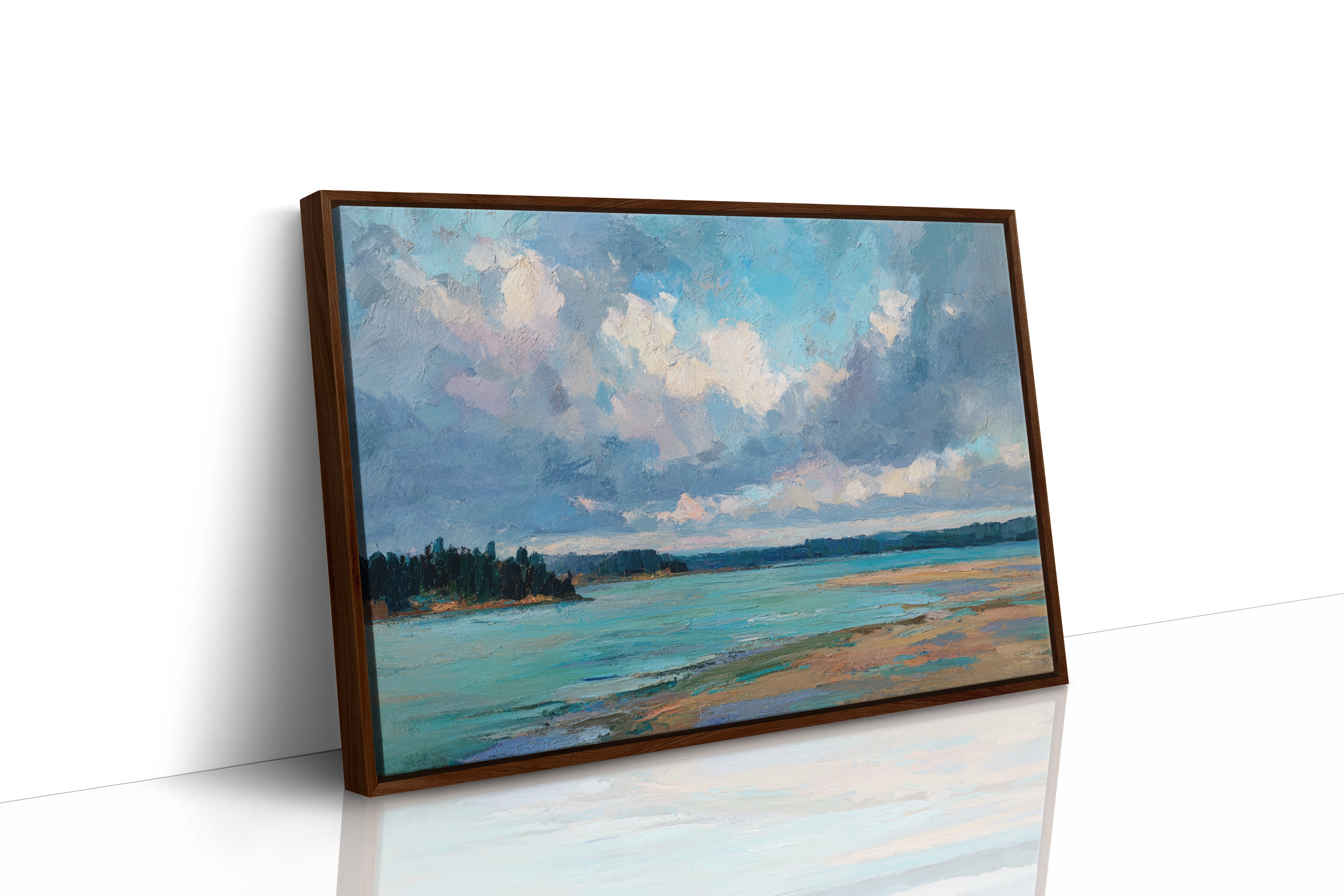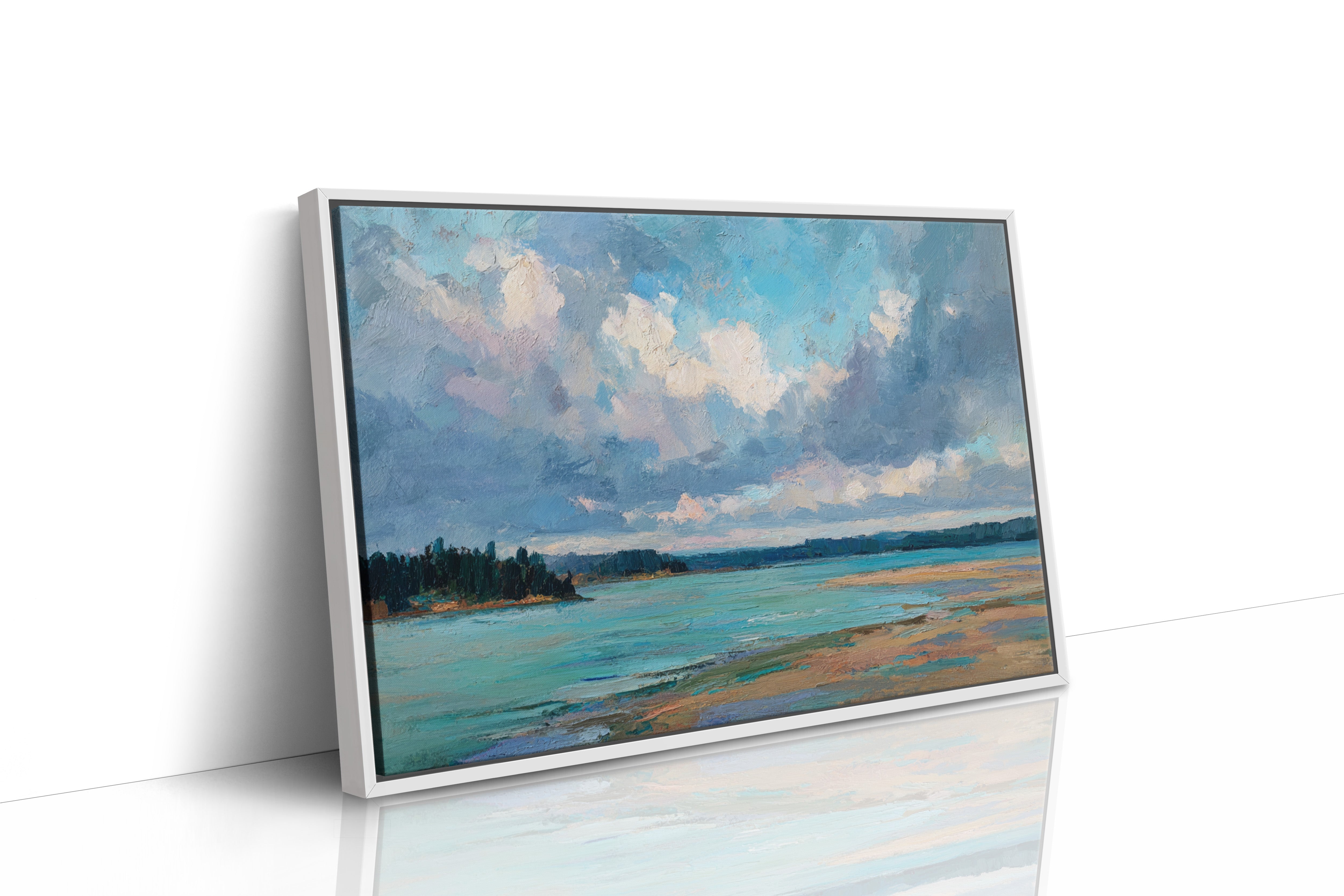 Billowing clouds drift lazily across a vast summer sky, their soft whites and lavenders reflecting in the crystal waters below. The landscape unfolds in bold brushstrokes, where a turquoise bay meets golden sandy shores in a perfect harmony of color and texture. Dark pine forests stand sentinel along the coastline, creating a dramatic contrast against the ethereal sky and luminous water. This coastal scene captures the essence of a perfect summer day, where time seems to slow and nature's palette is at its most vibrant. Perfect for bringing a sense of serenity and coastal charm to a living room, bedroom, or any space seeking to evoke the peaceful energy of shoreline landscapes.