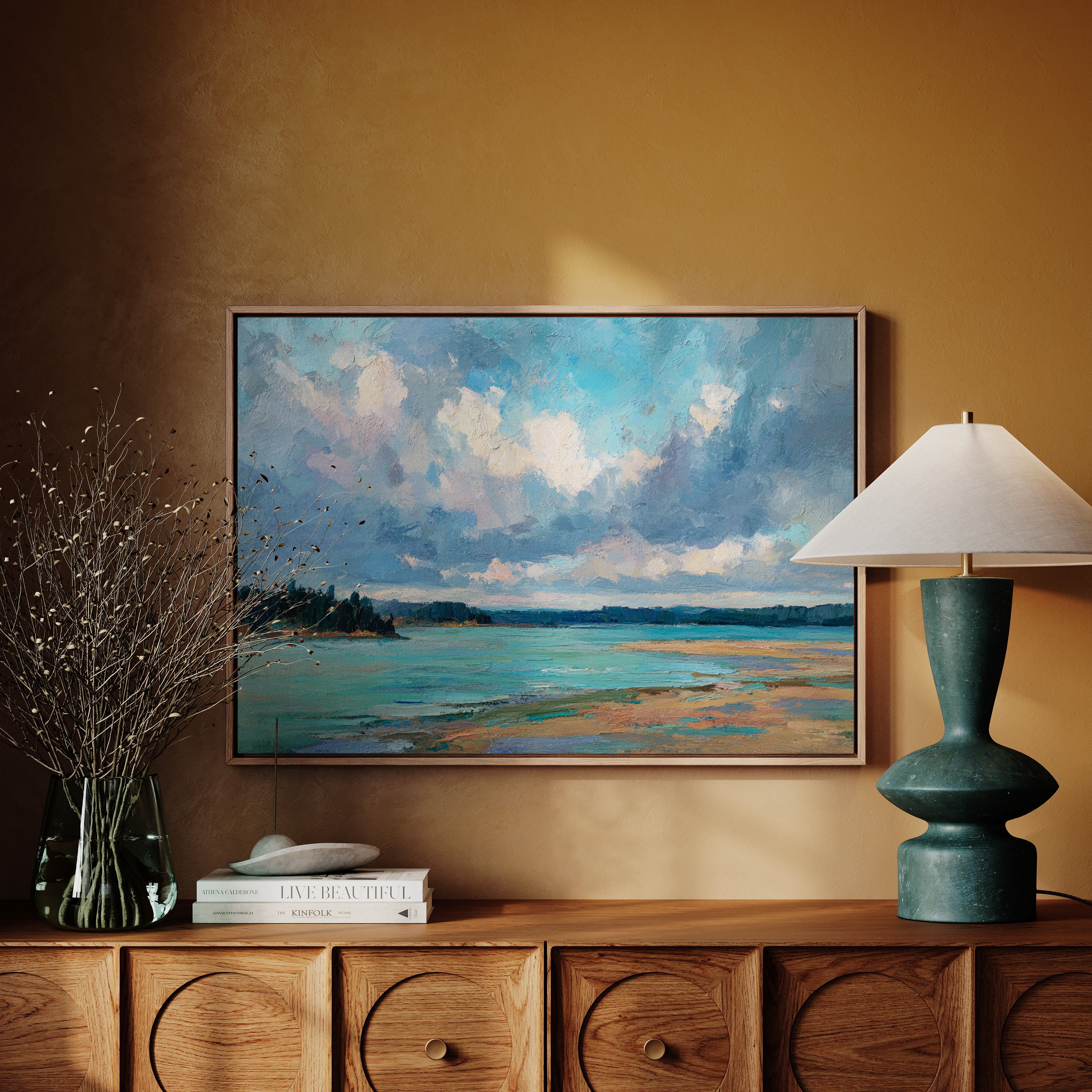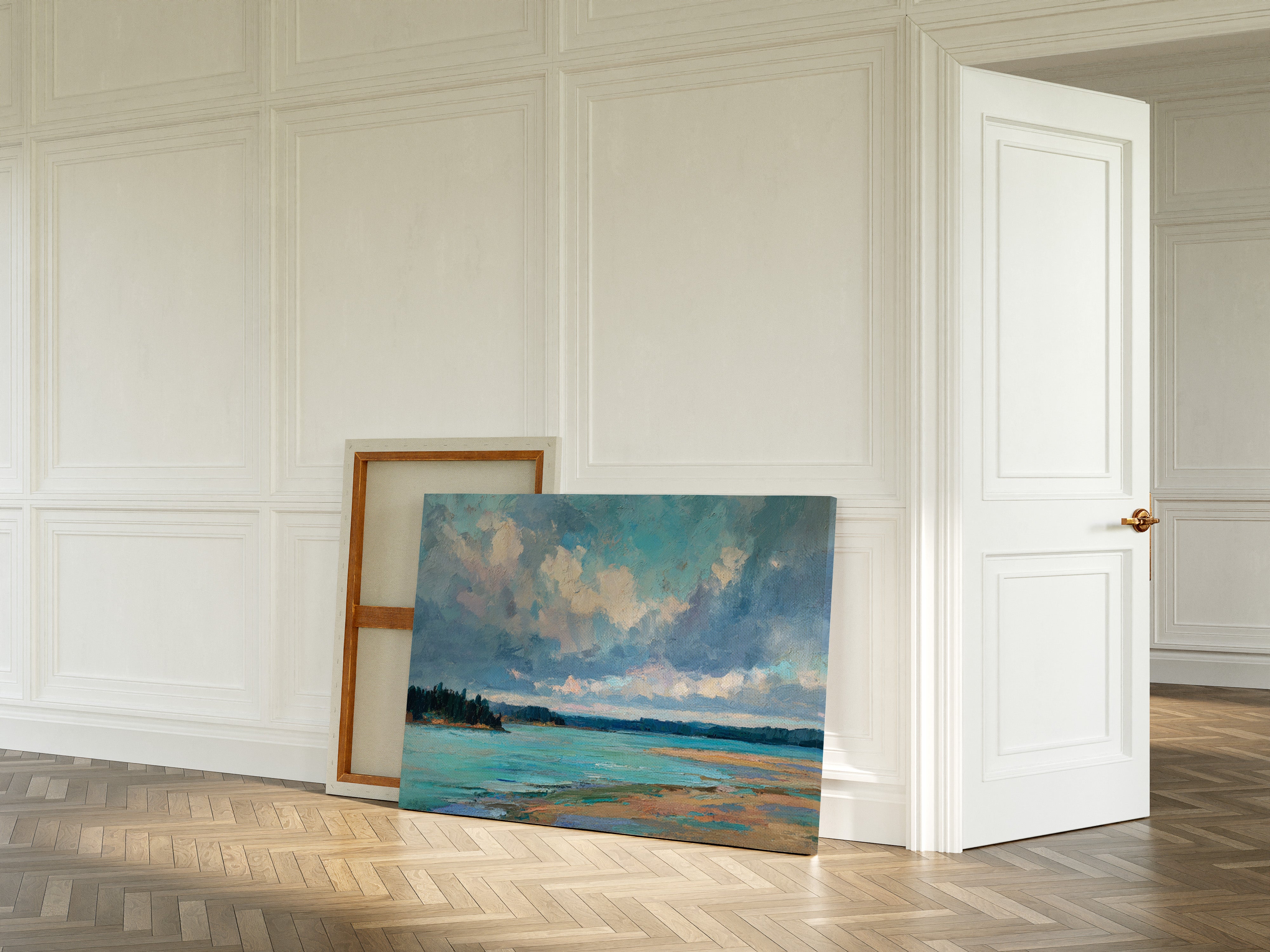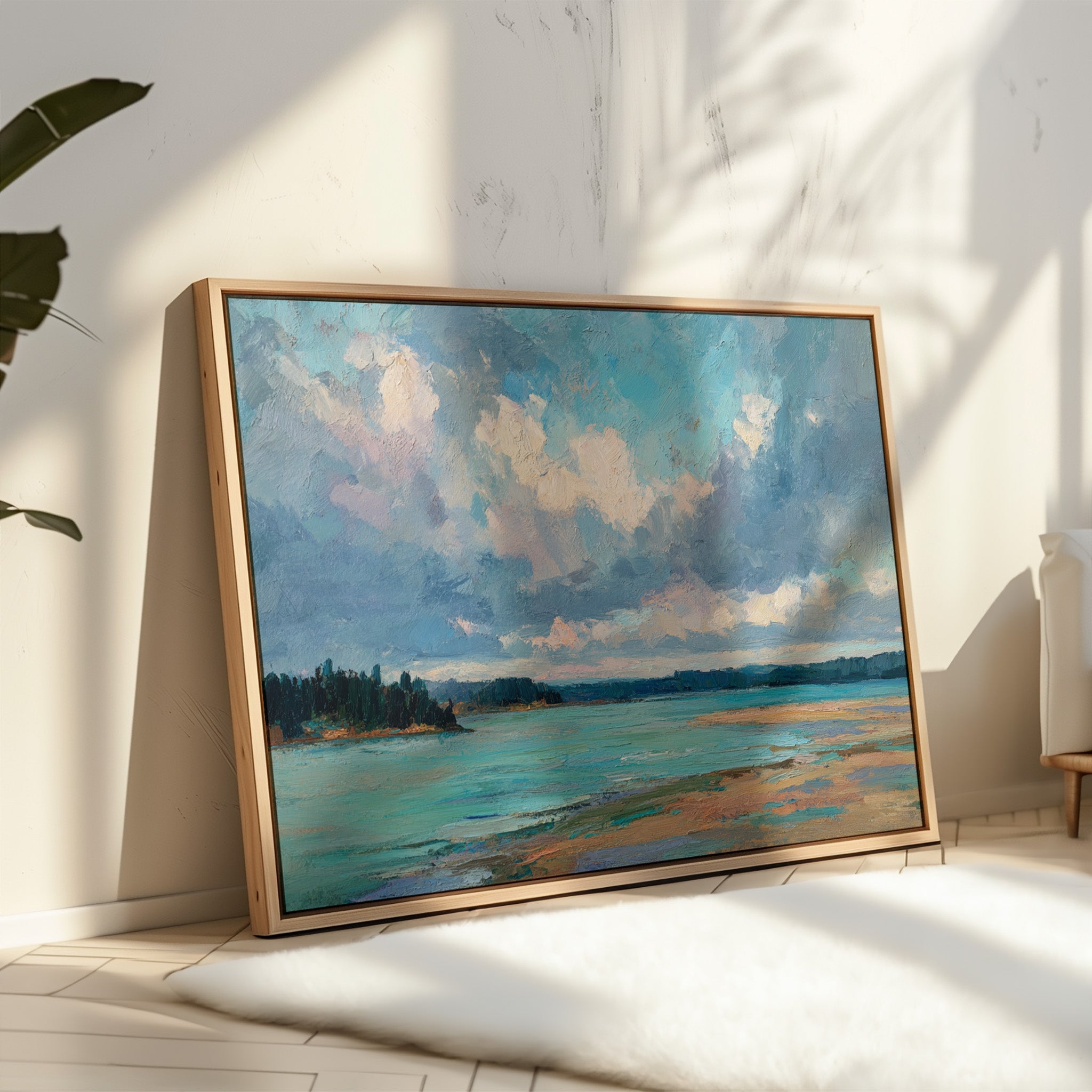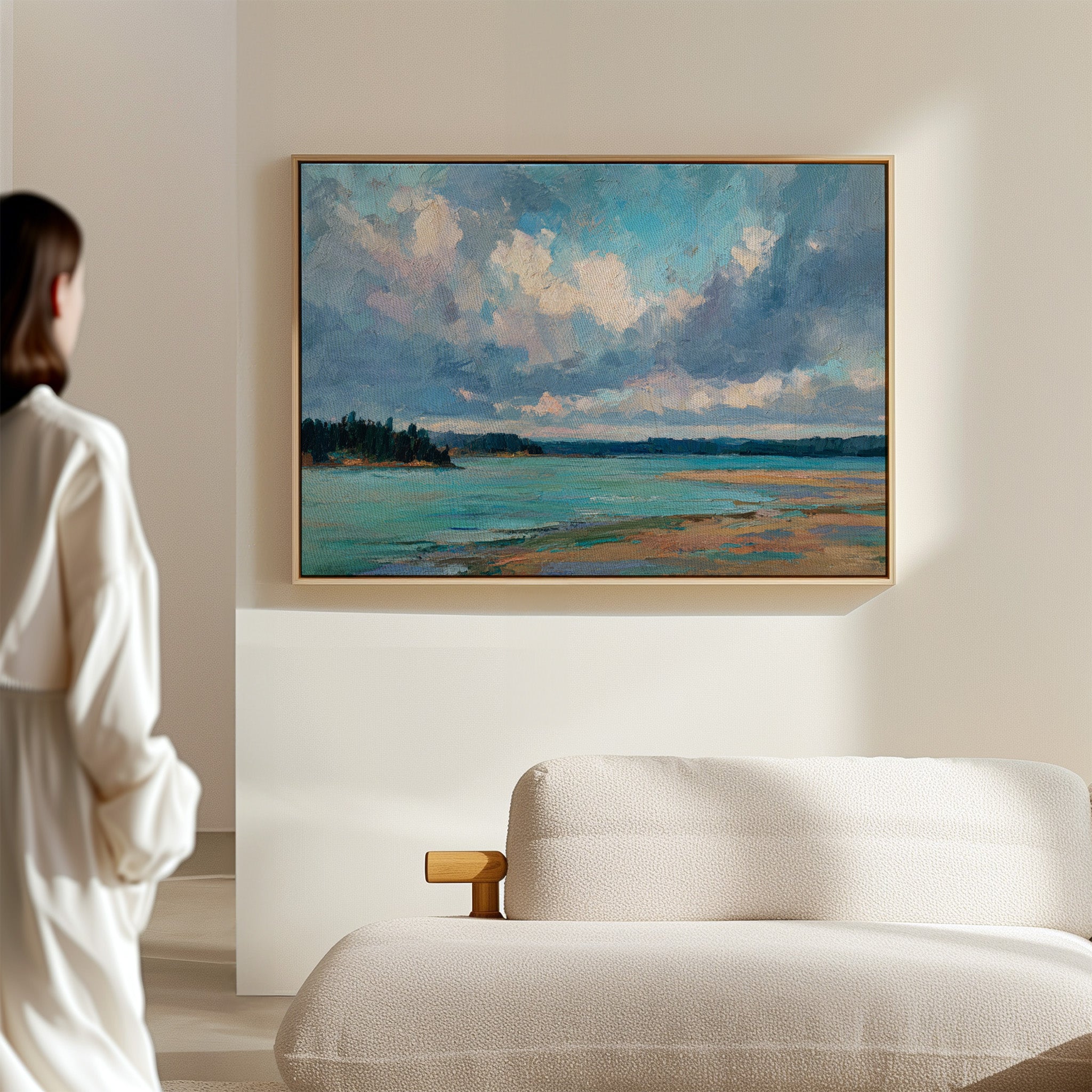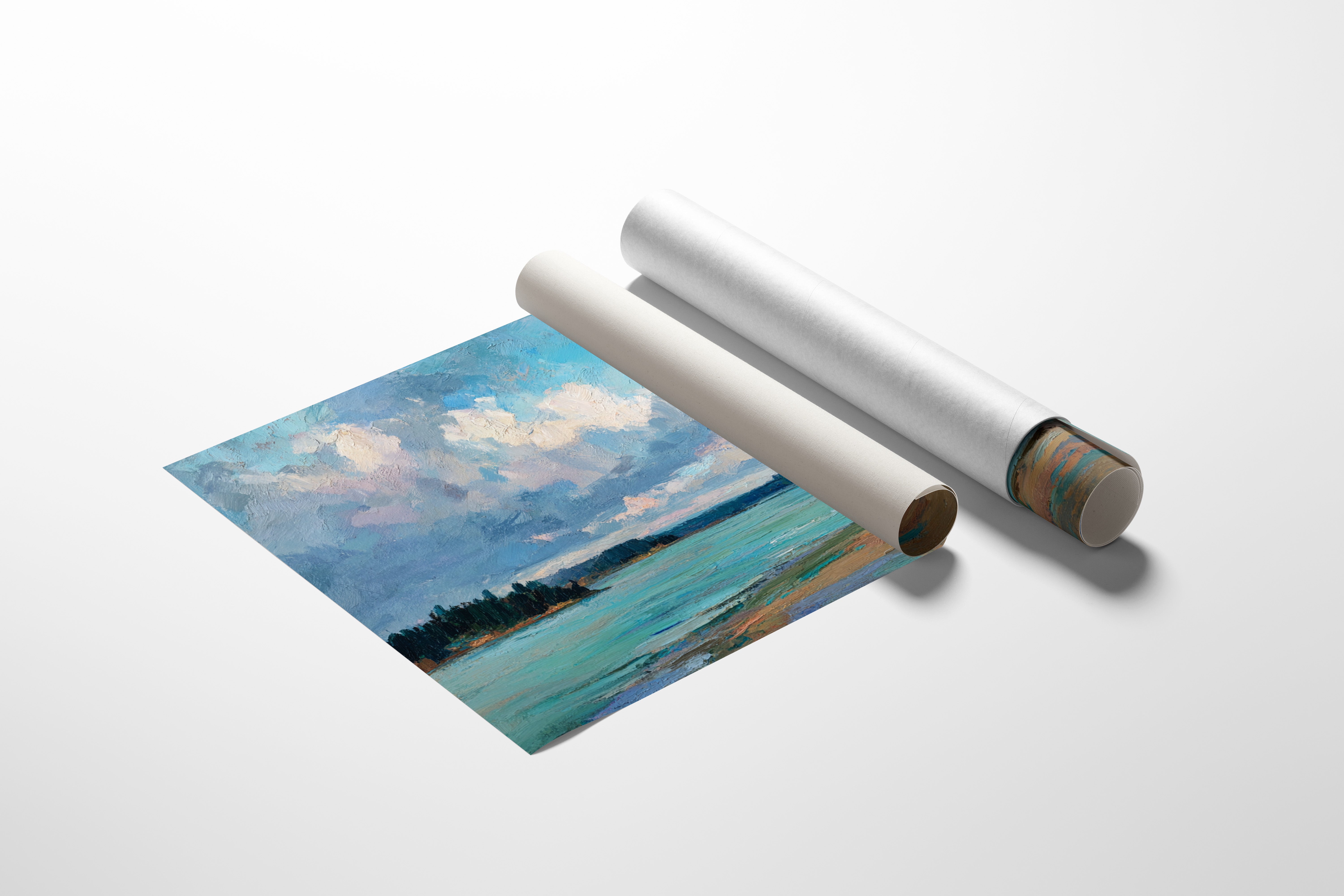 Billowing clouds drift lazily across a vast summer sky, their soft whites and lavenders reflecting in the crystal waters below. The landscape unfolds in bold brushstrokes, where a turquoise bay meets golden sandy shores in a perfect harmony of color and texture. Dark pine forests stand sentinel along the coastline, creating a dramatic contrast against the ethereal sky and luminous water. This coastal scene captures the essence of a perfect summer day, where time seems to slow and nature's palette is at its most vibrant. Perfect for bringing a sense of serenity and coastal charm to a living room, bedroom, or any space seeking to evoke the peaceful energy of shoreline landscapes.