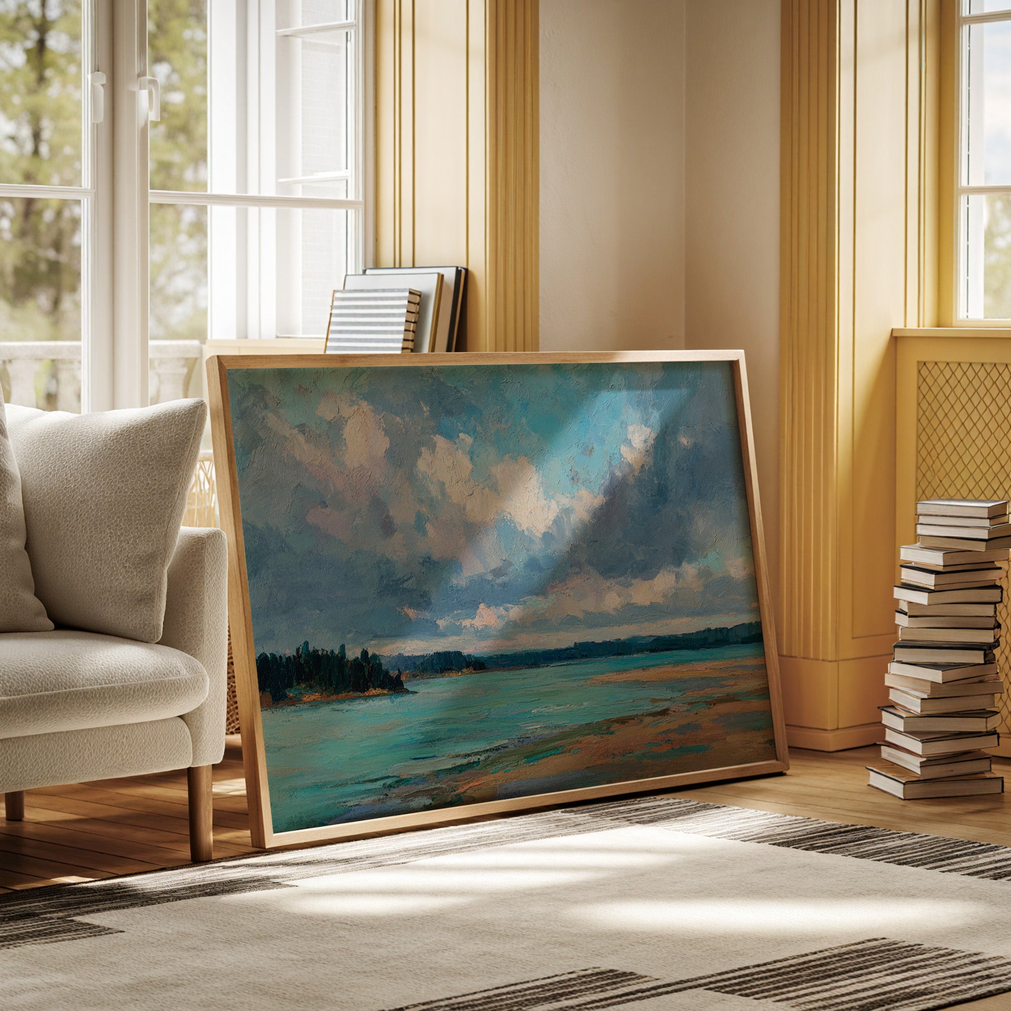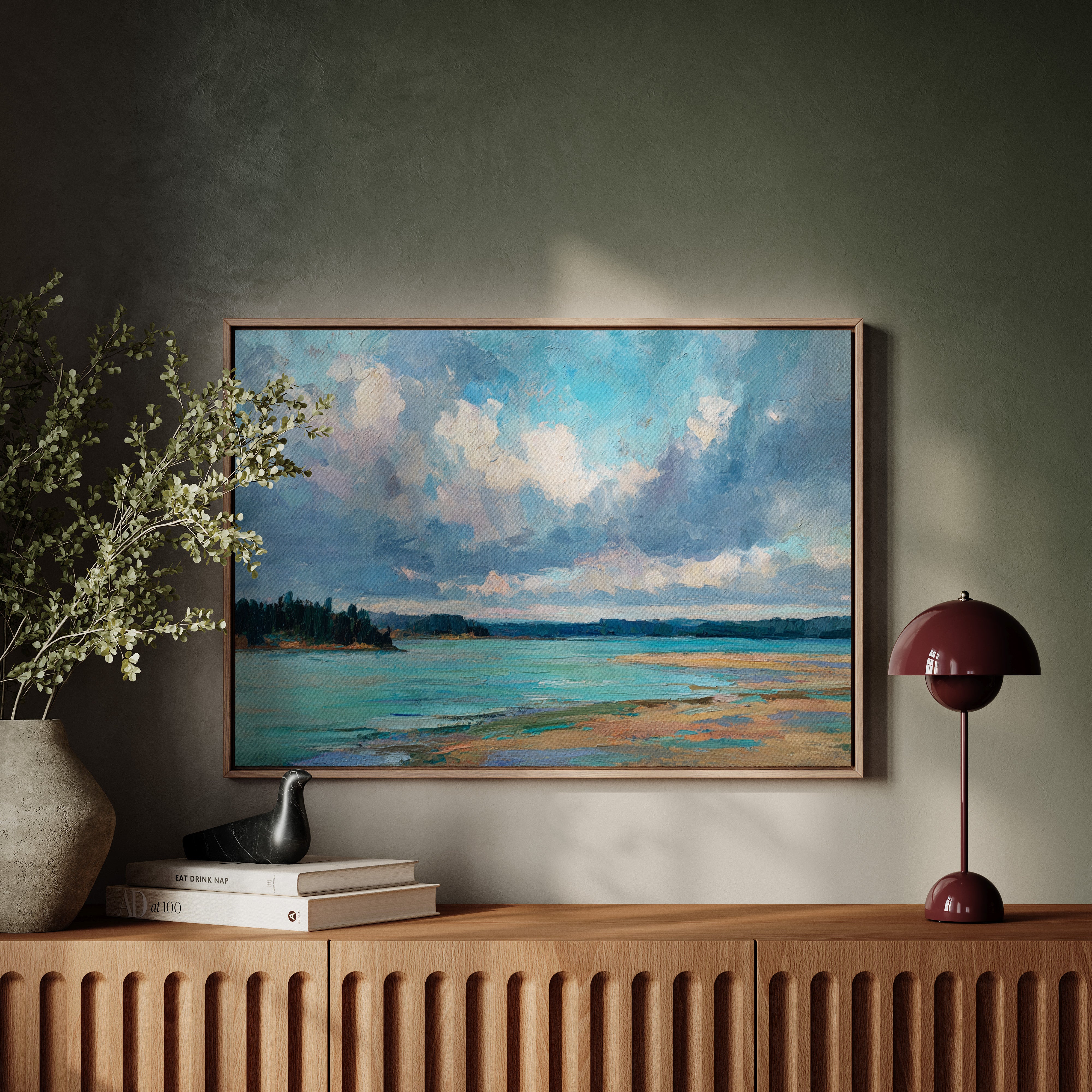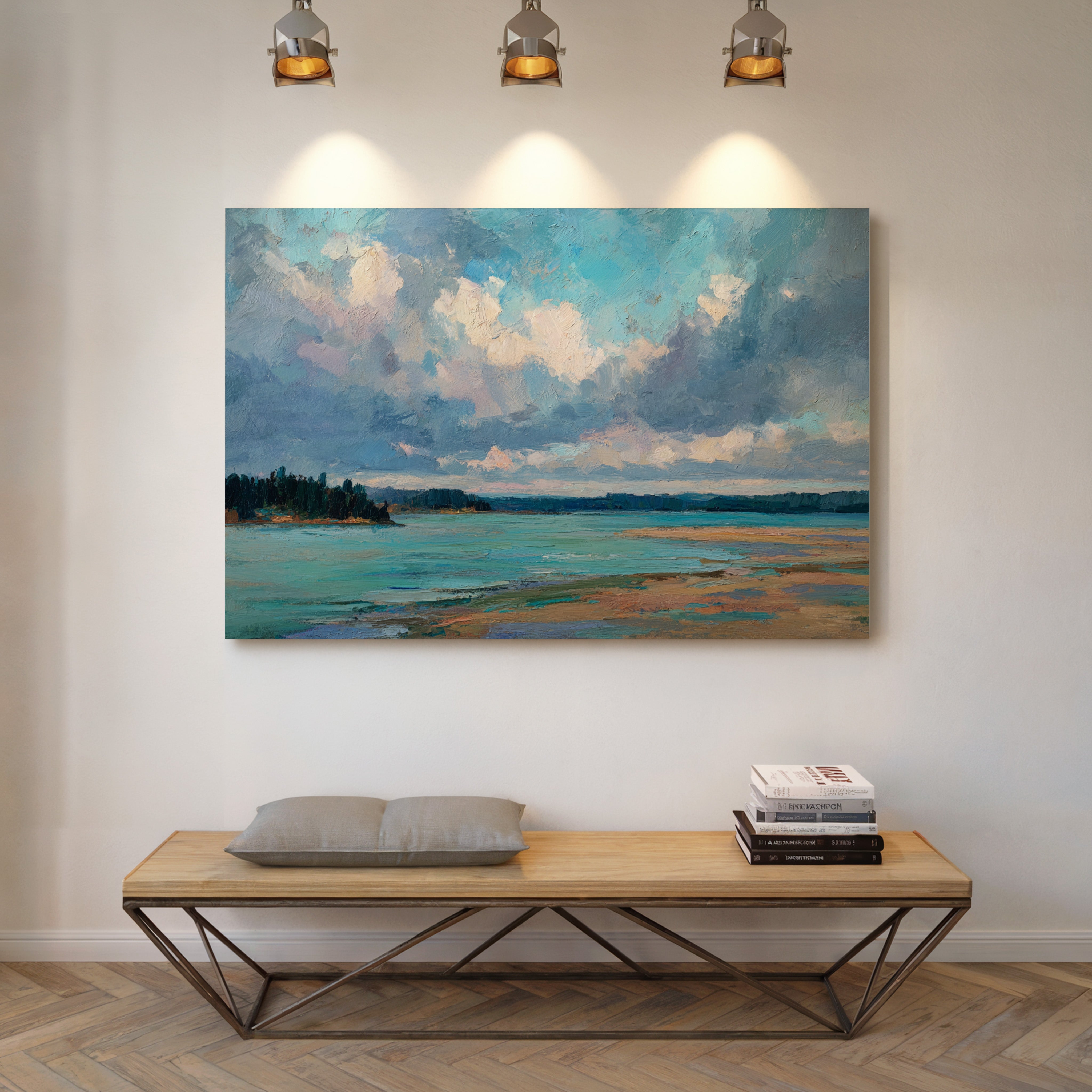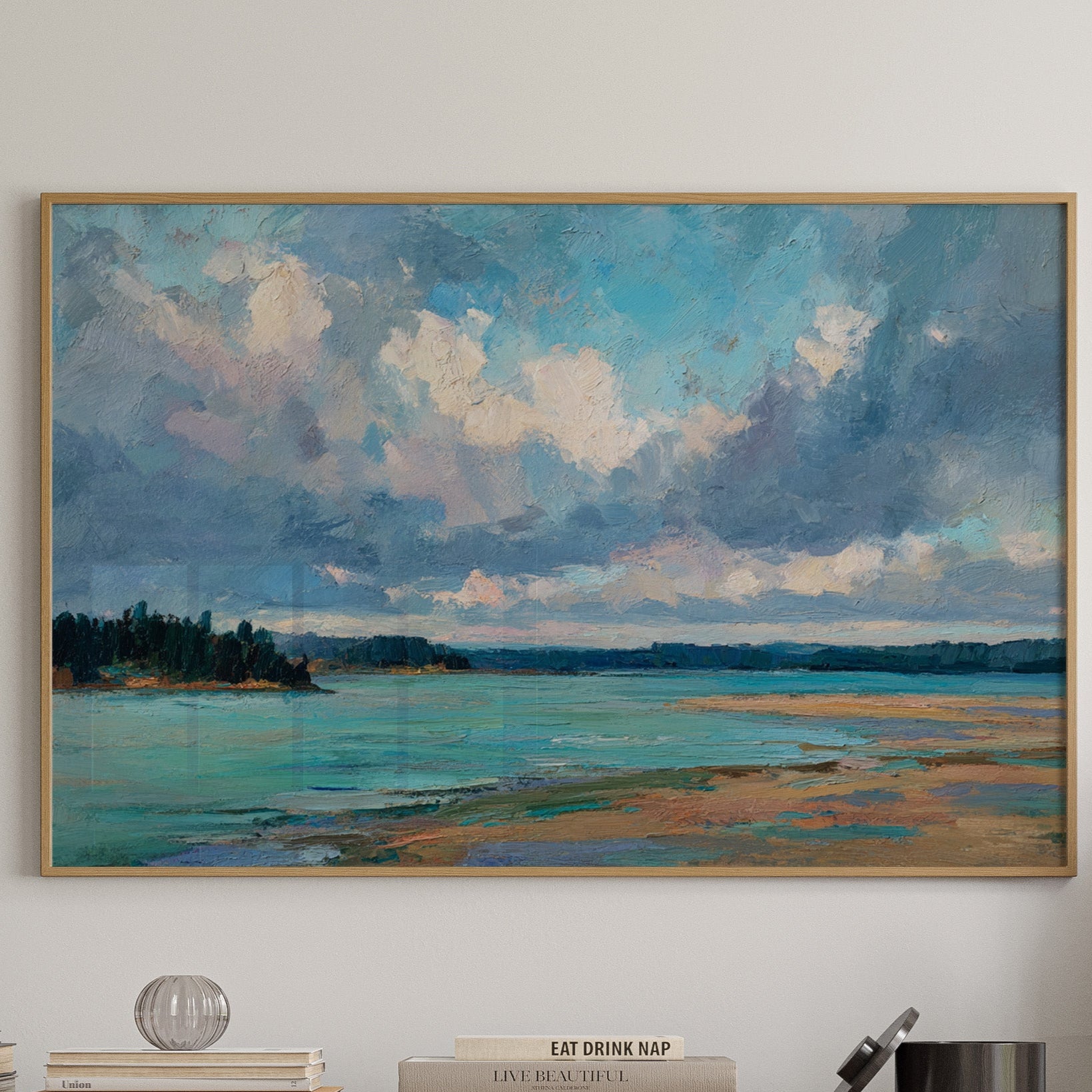 Billowing clouds drift lazily across a vast summer sky, their soft whites and lavenders reflecting in the crystal waters below. The landscape unfolds in bold brushstrokes, where a turquoise bay meets golden sandy shores in a perfect harmony of color and texture. Dark pine forests stand sentinel along the coastline, creating a dramatic contrast against the ethereal sky and luminous water. This coastal scene captures the essence of a perfect summer day, where time seems to slow and nature's palette is at its most vibrant. Perfect for bringing a sense of serenity and coastal charm to a living room, bedroom, or any space seeking to evoke the peaceful energy of shoreline landscapes.