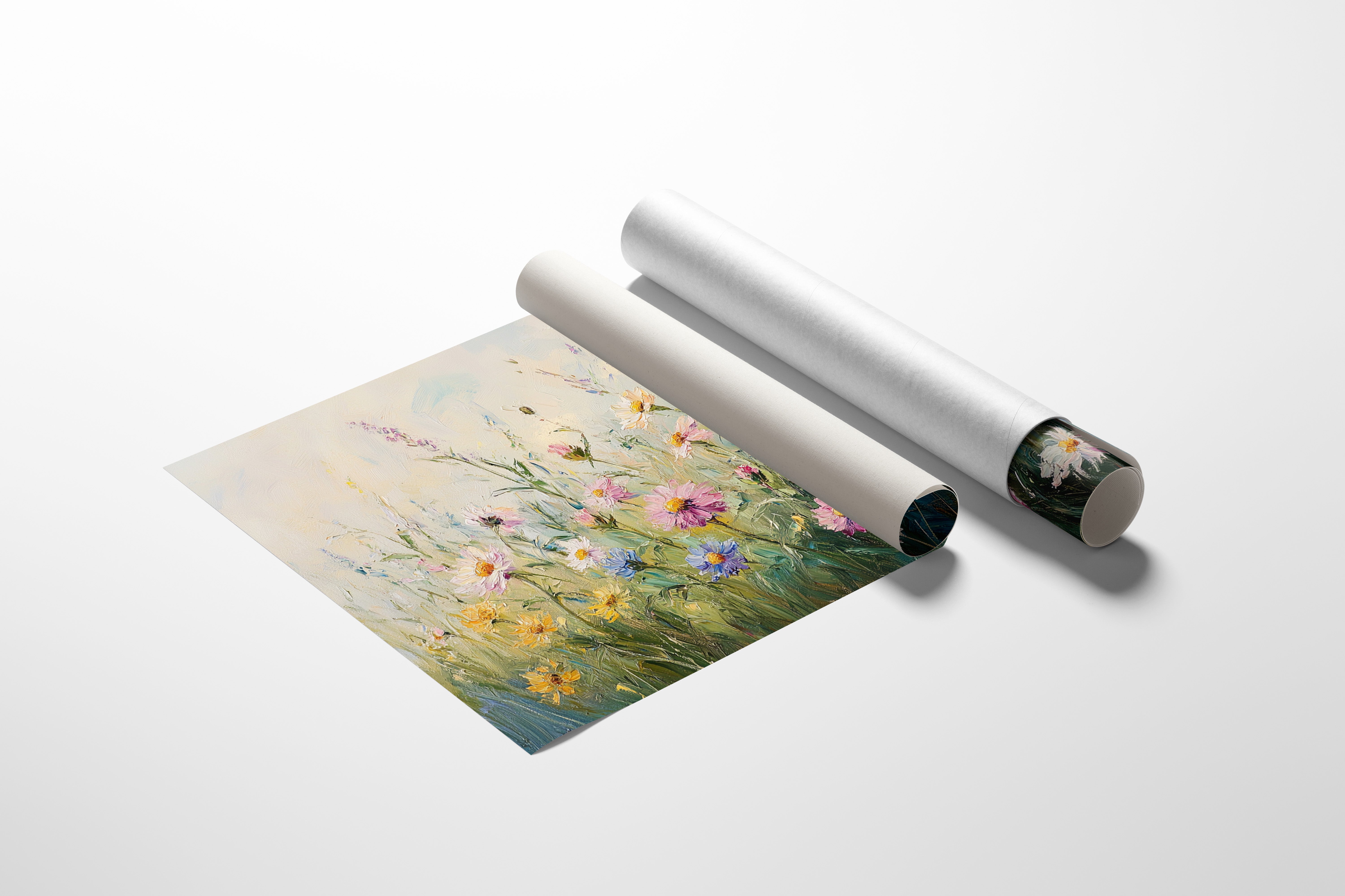 Morning light catches delicate petals swaying in a gentle breeze, creating a symphony of pastels against the soft sky. Daisies in white, pink, and yellow mingle with cornflowers and delphinium spires, their stems rising from textured brushstrokes of emerald grass. The impressionistic painting captures the ephemeral beauty of a wildflower meadow, where each bloom seems to hold its own personality through varied brushstrokes and subtle color transitions. This piece would bring the freshness of a summer garden into a bright breakfast nook or create a peaceful focal point in a reading room.