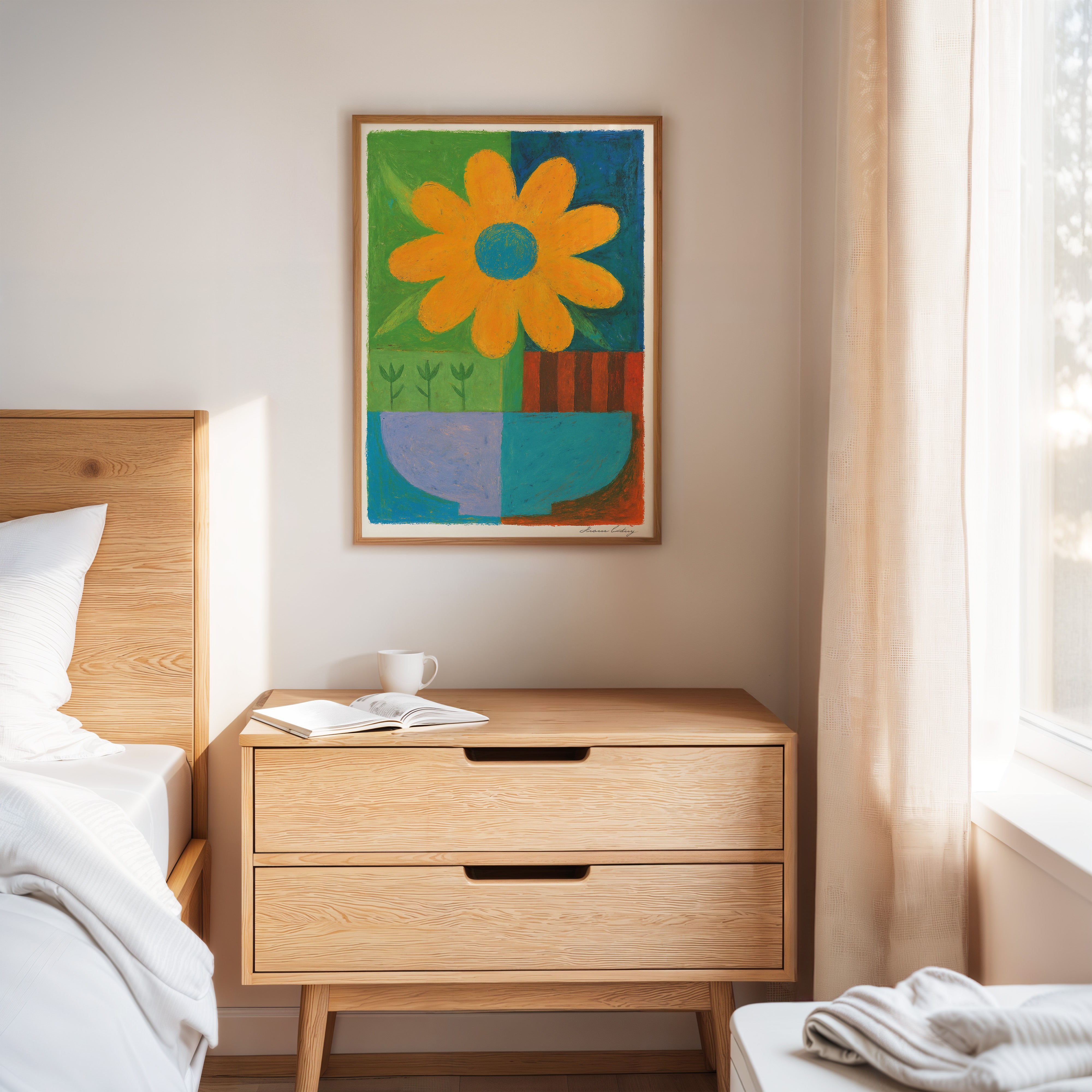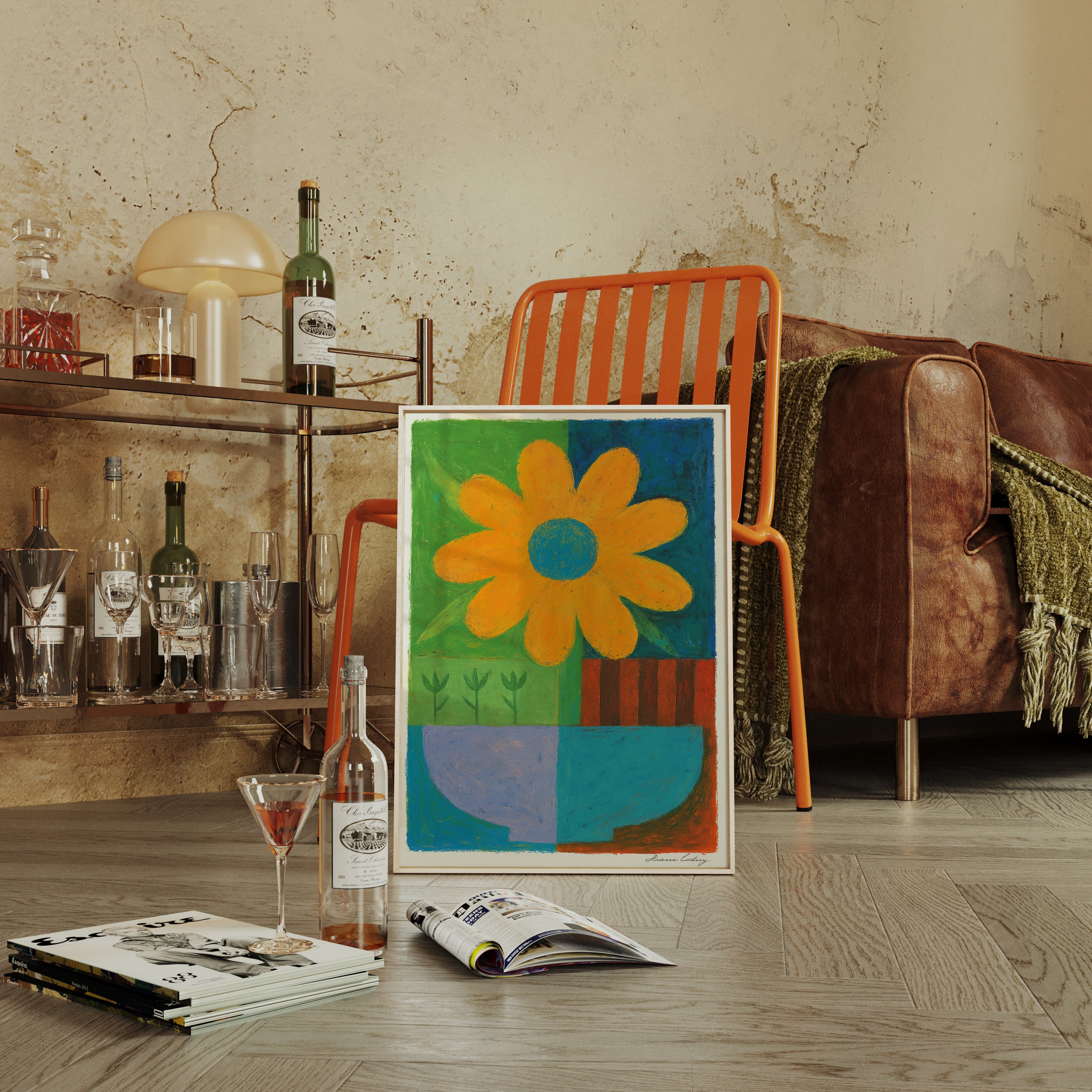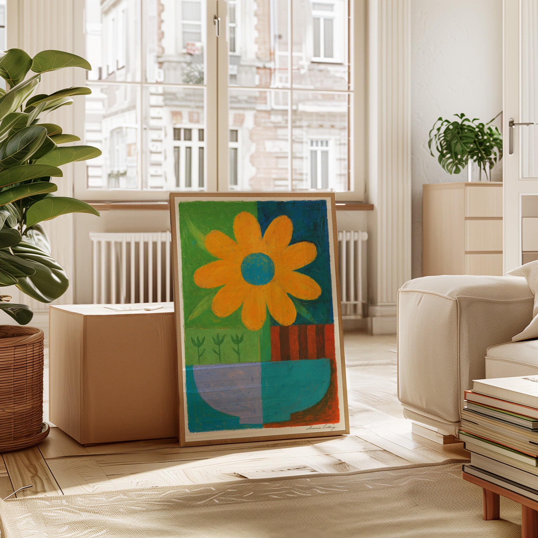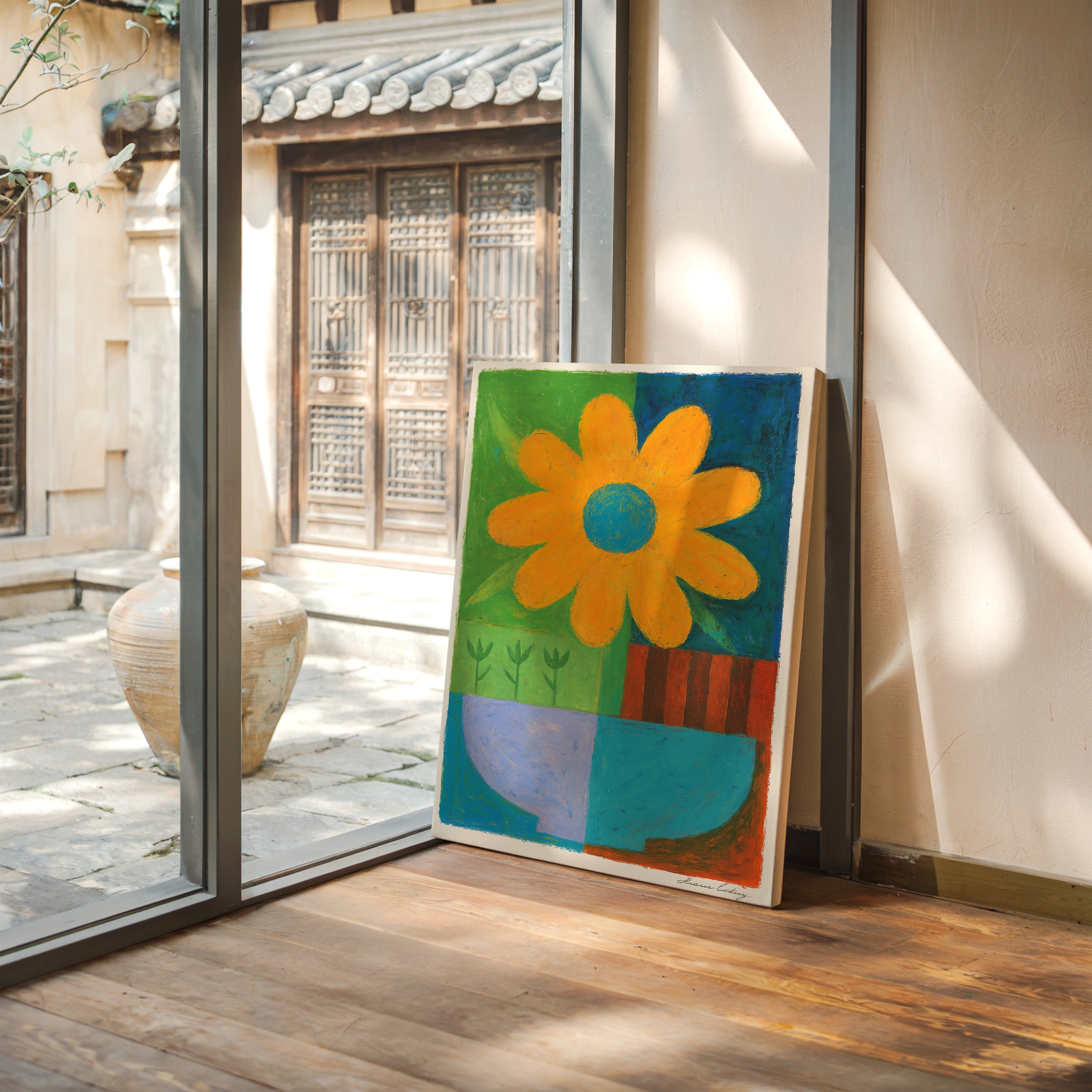 A bold orange daisy commands attention against a playful patchwork of vibrant hues. The composition balances geometric color blocks with organic floral forms, creating a delightful tension between structure and spontaneity. Rich emerald green, deep azure, and earthy terracotta sections frame the simplified botanical elements, while small sprouts peek through like quiet witnesses to the flower's jubilant display. This piece radiates joy and creative energy through its masterful use of color blocking and naive artistic style.