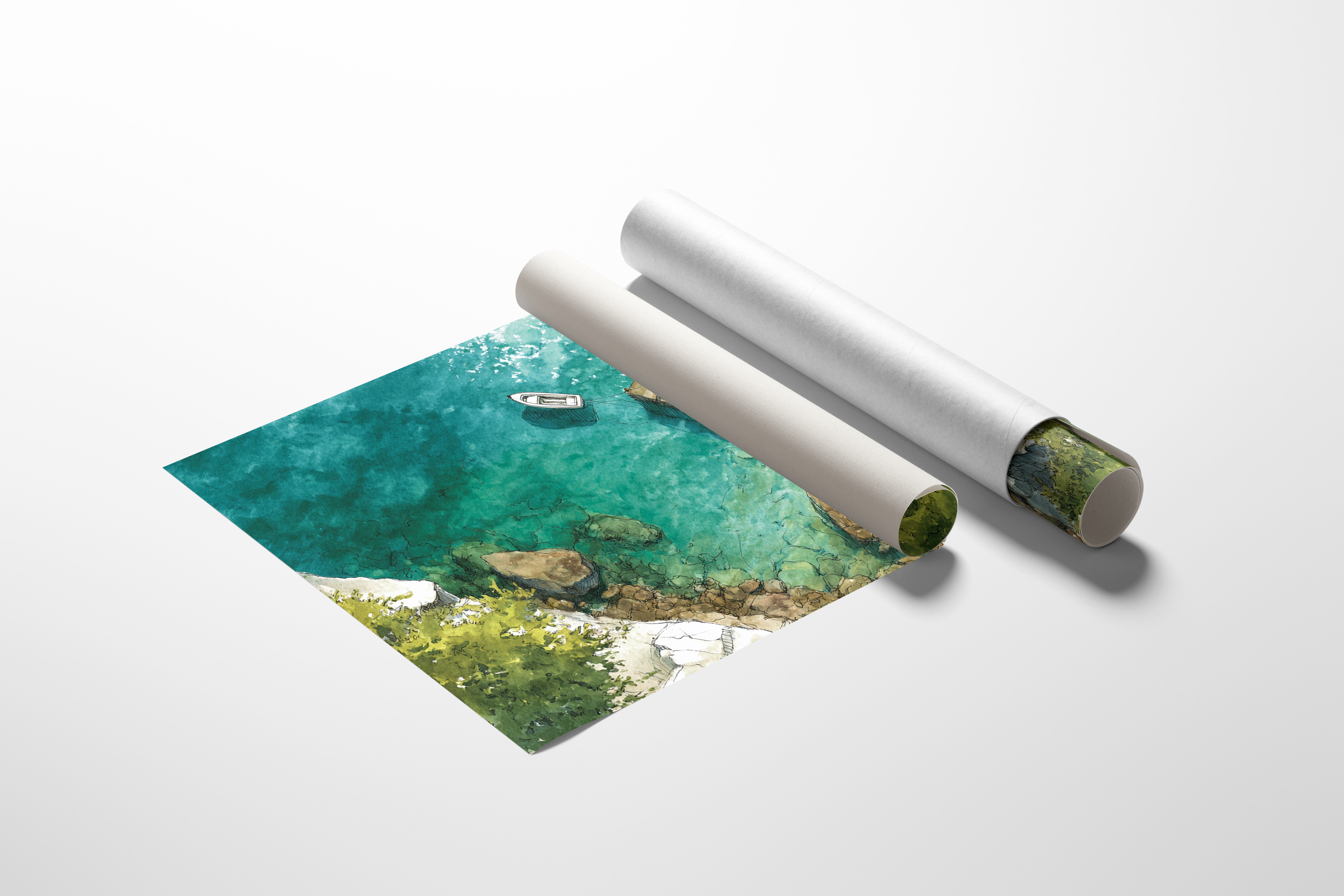 A lone wooden pier stretches into crystalline waters, its weathered planks telling stories of countless summer days. The aerial perspective reveals a mesmerizing dance between deep turquoise waters and white limestone cliffs, while verdant foliage frames the scene like nature's own curtains. A solitary boat tethered to the dock creates a perfect moment of serenity, floating gracefully above its own shadow in the transparent waters below. This tranquil coastal vignette would bring Mediterranean charm to a beach house living room or add a touch of escapism to an urban apartment's dining area.