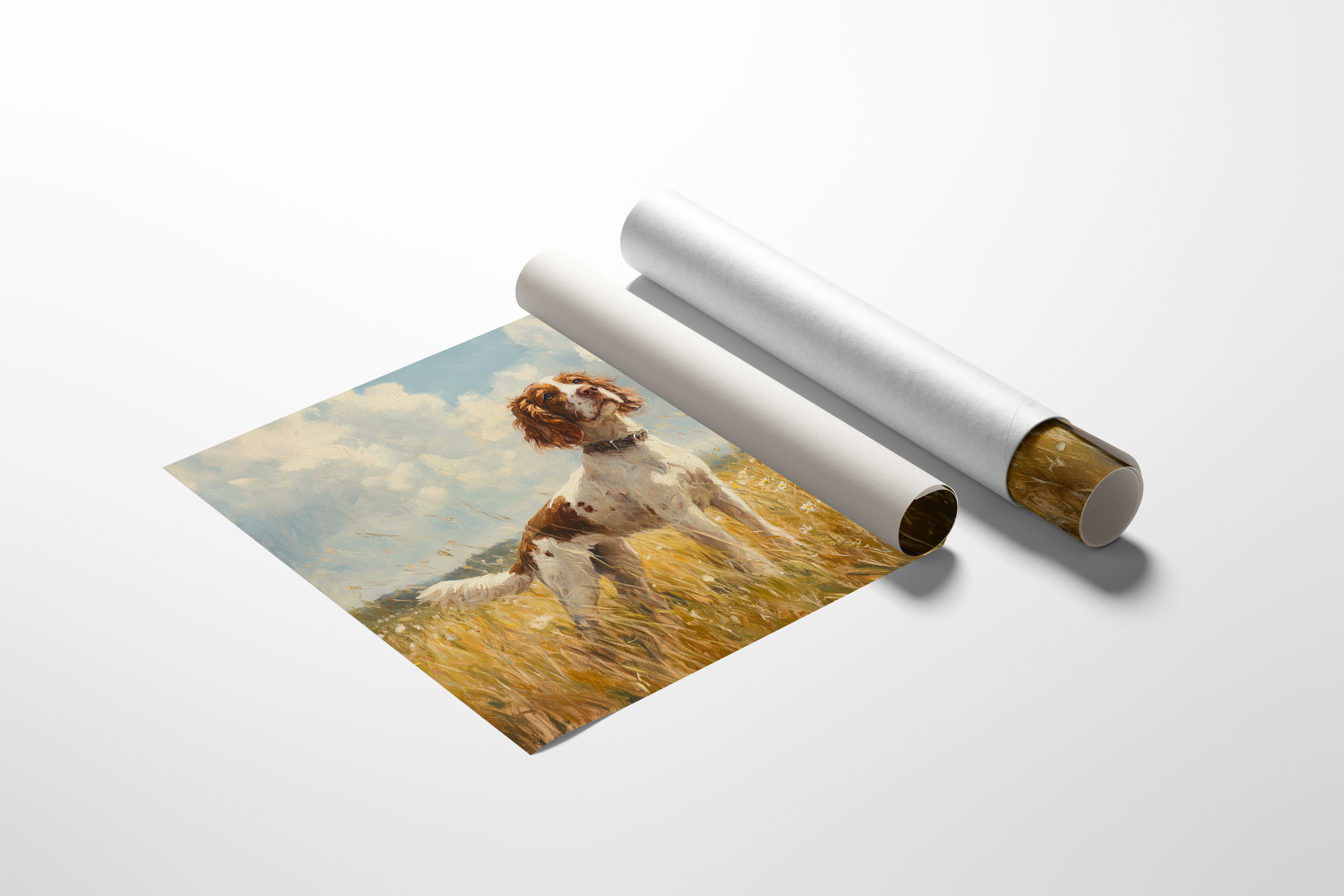 A gentle breeze carries the scent of wildflowers across sun-drenched meadows, where a noble Brittany Spaniel stands alert and proud. The dog's auburn and white coat catches the golden light, creating a striking contrast against the pastoral landscape dotted with delicate daisies. Brushstrokes capture every detail, from the dog's attentive expression to the way tall grasses bend in the wind, telling a story of companionship and adventure in the countryside. This piece brings the outdoors in, perfect for creating a warm, inviting atmosphere in a country home or adding a touch of rustic elegance to a modern living space.