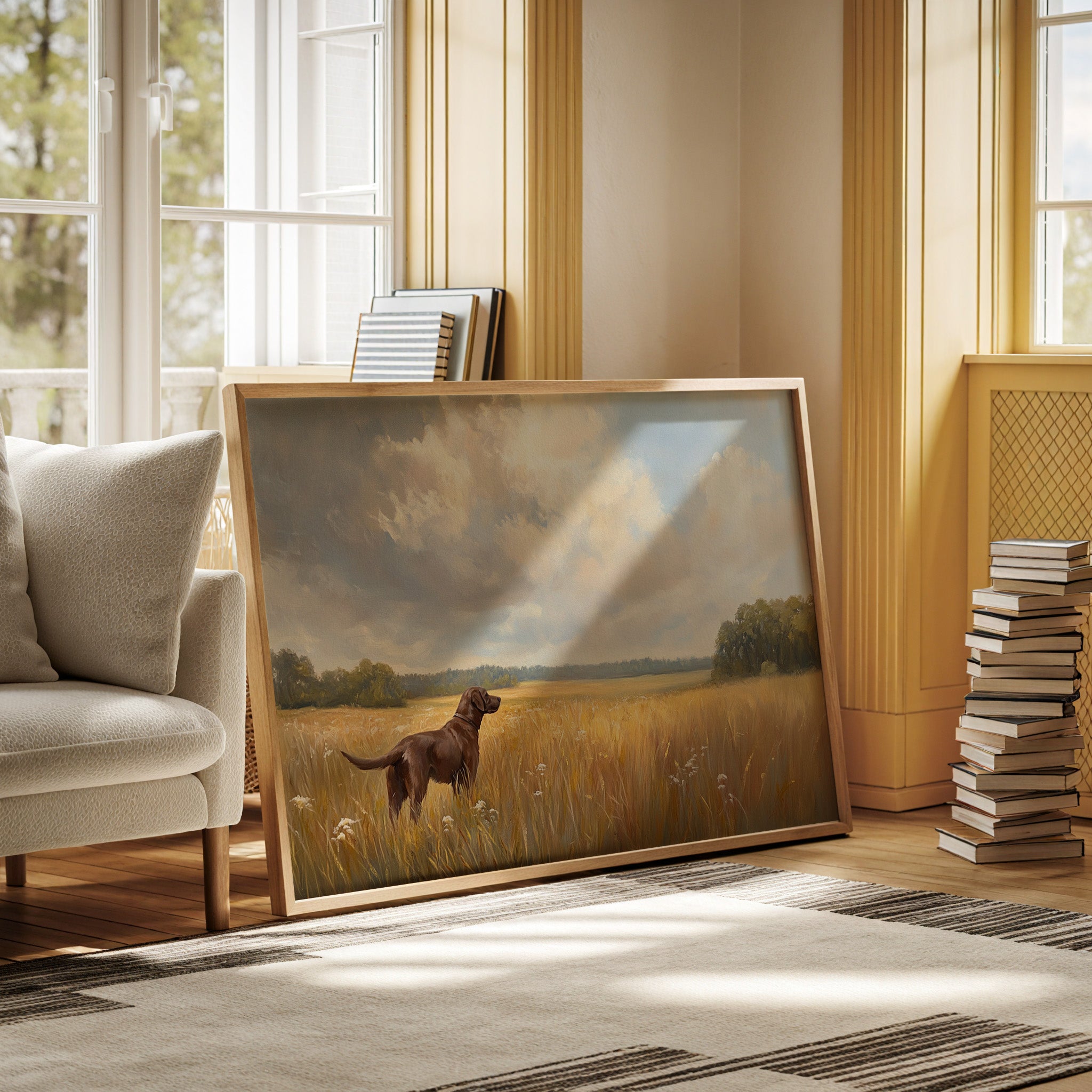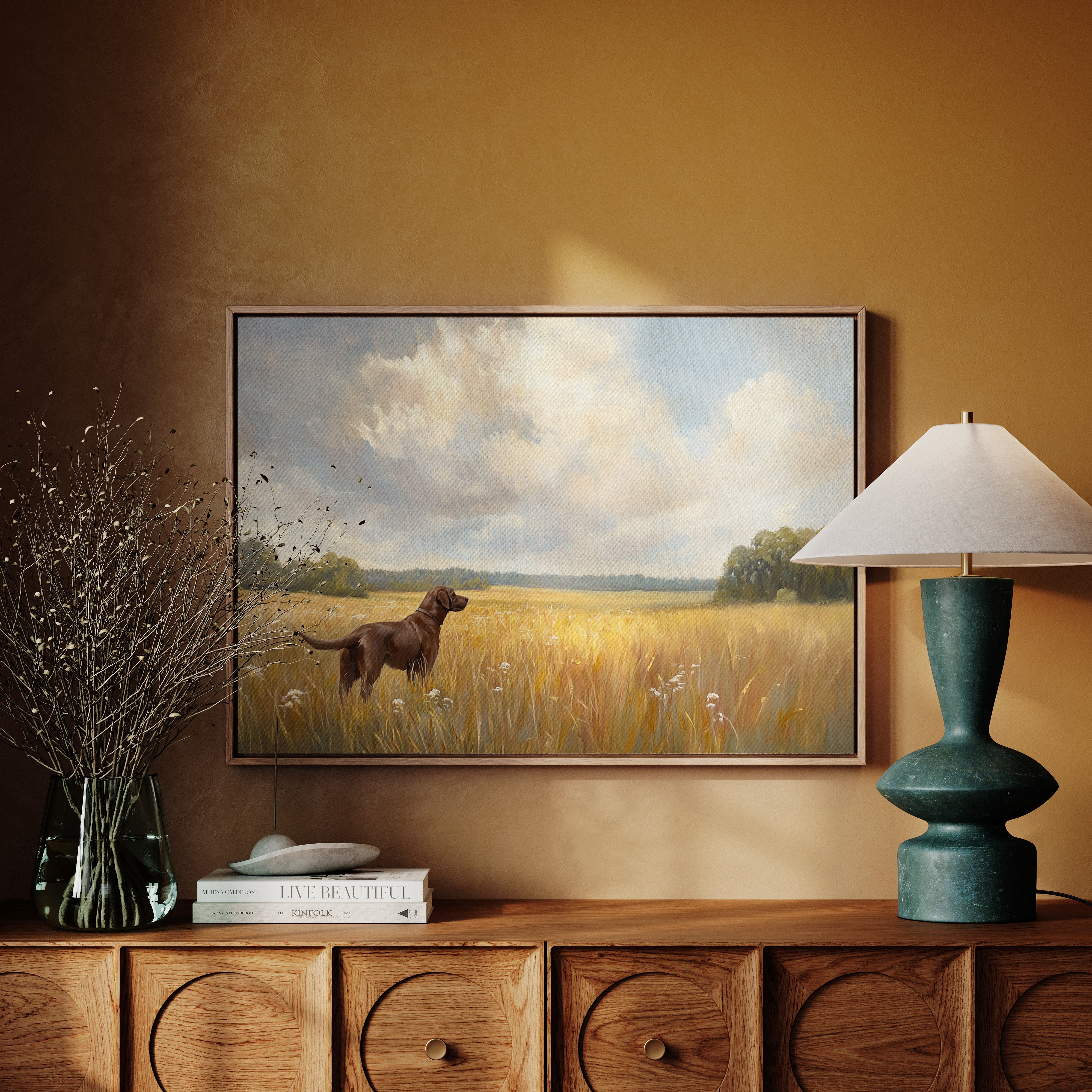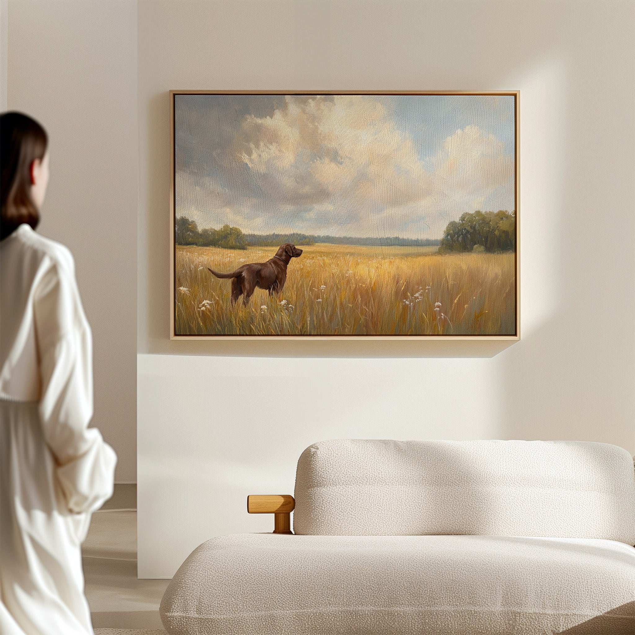 A chocolate Labrador stands alert in golden wheat, their noble profile silhouetted against an endless summer sky. Billowing clouds paint the heavens in soft cream and azure, while wildflowers dance between amber stalks swaying in the afternoon breeze. The rich browns of the faithful companion contrast beautifully with the sun-kissed field, while distant tree lines frame this moment of quiet vigilance. This serene pastoral scene would bring warmth and companionship to a country home's living room or a modern farmhouse dining space.