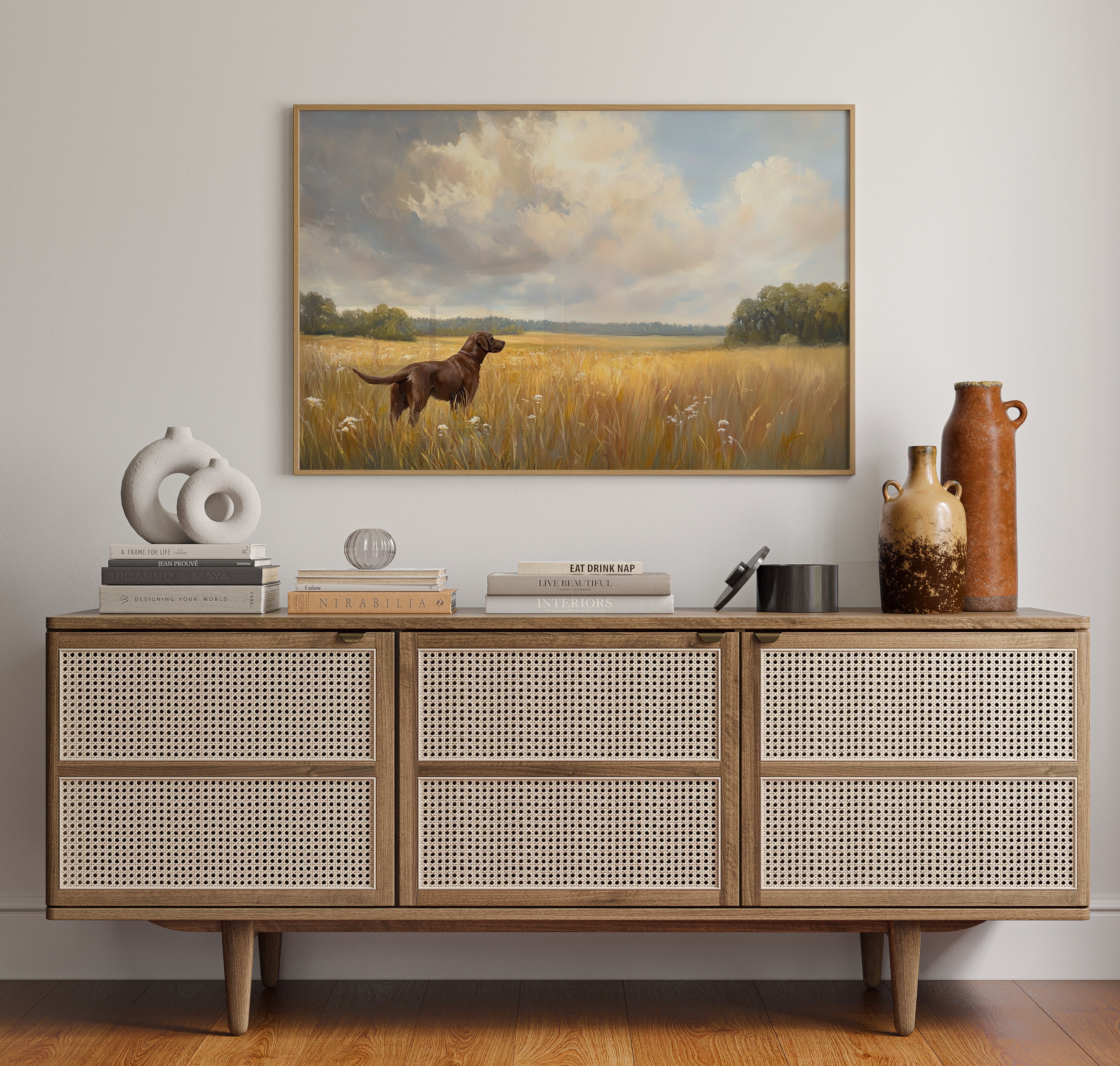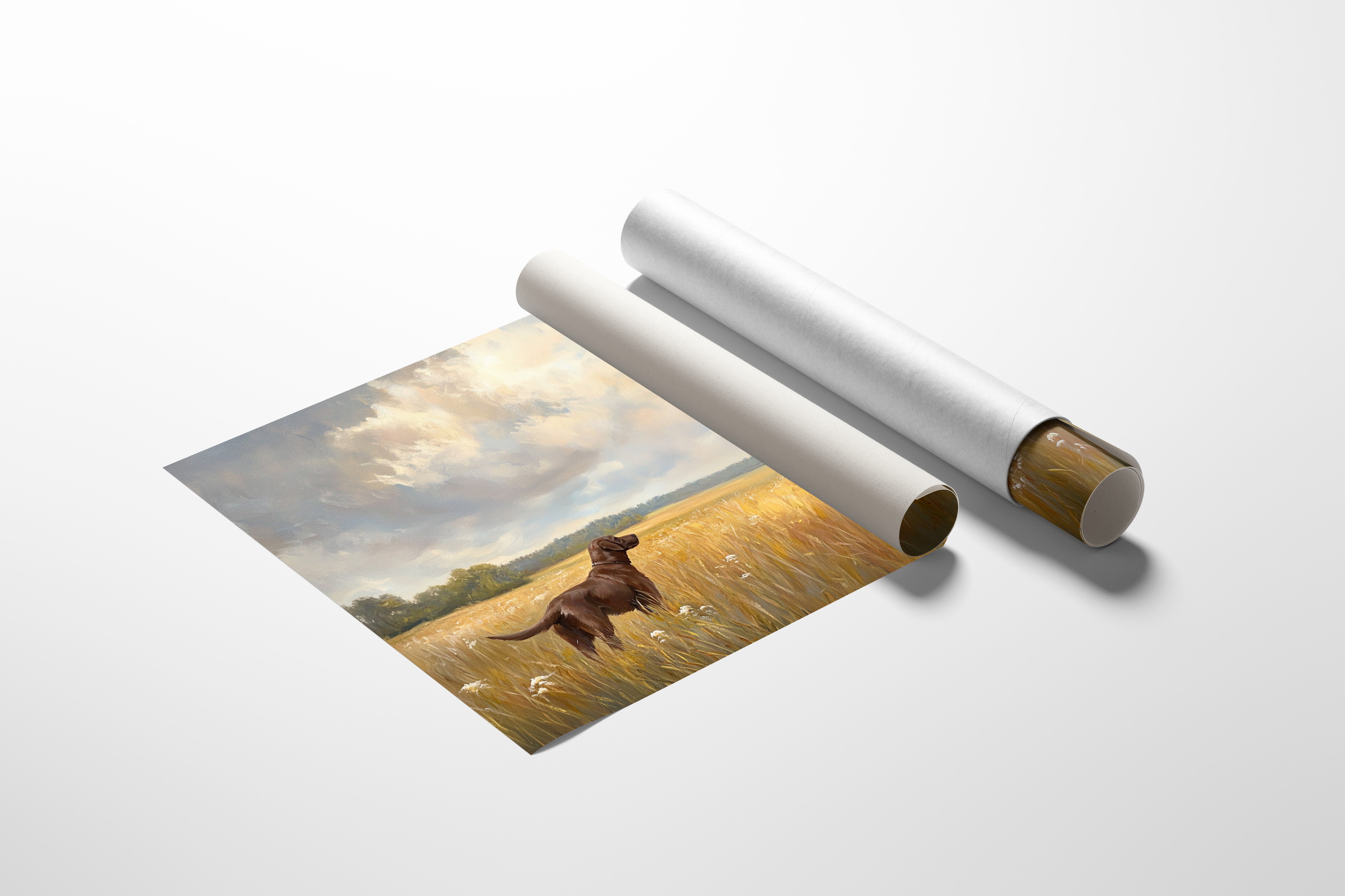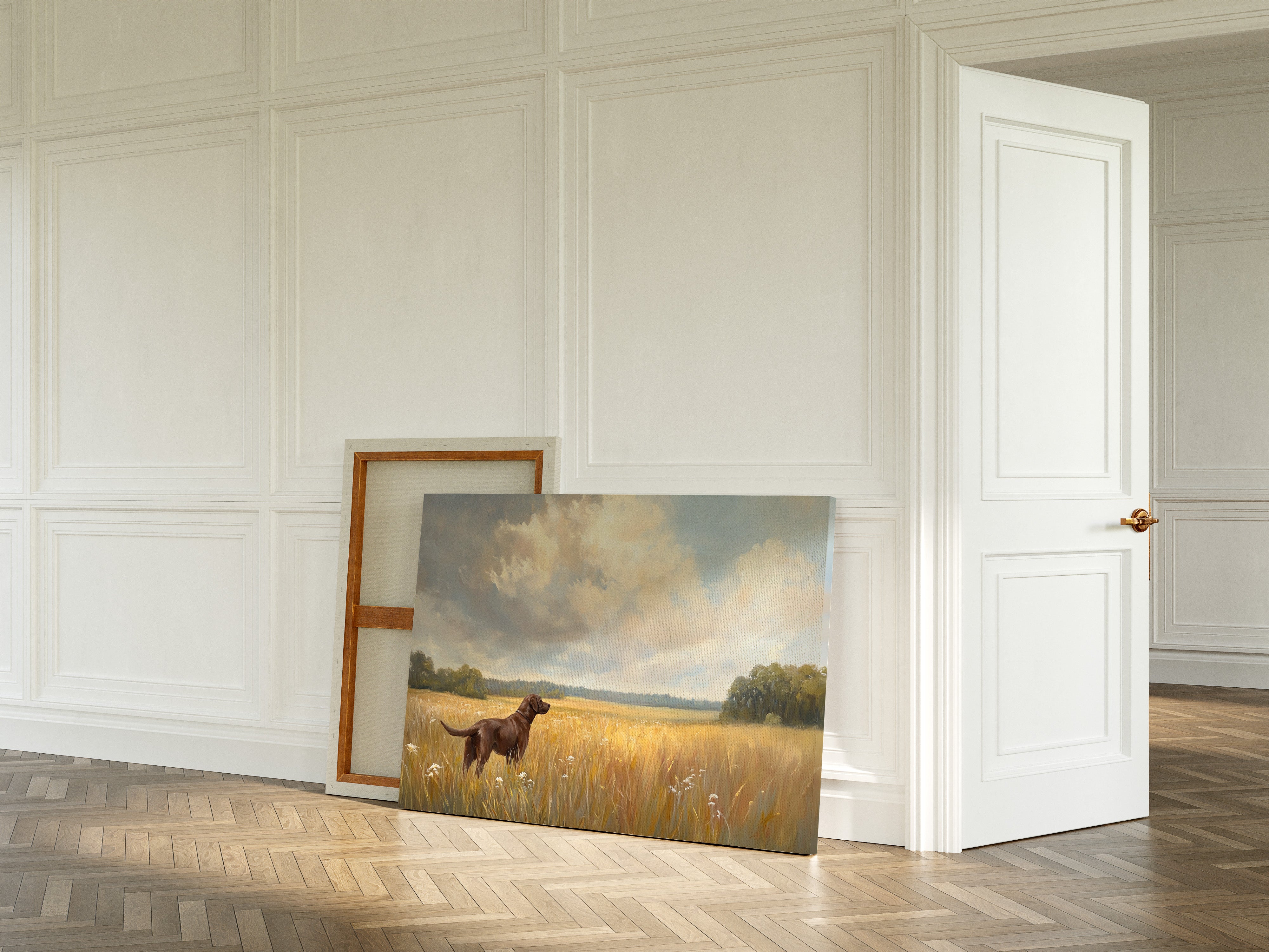 A chocolate Labrador stands alert in golden wheat, their noble profile silhouetted against an endless summer sky. Billowing clouds paint the heavens in soft cream and azure, while wildflowers dance between amber stalks swaying in the afternoon breeze. The rich browns of the faithful companion contrast beautifully with the sun-kissed field, while distant tree lines frame this moment of quiet vigilance. This serene pastoral scene would bring warmth and companionship to a country home's living room or a modern farmhouse dining space.