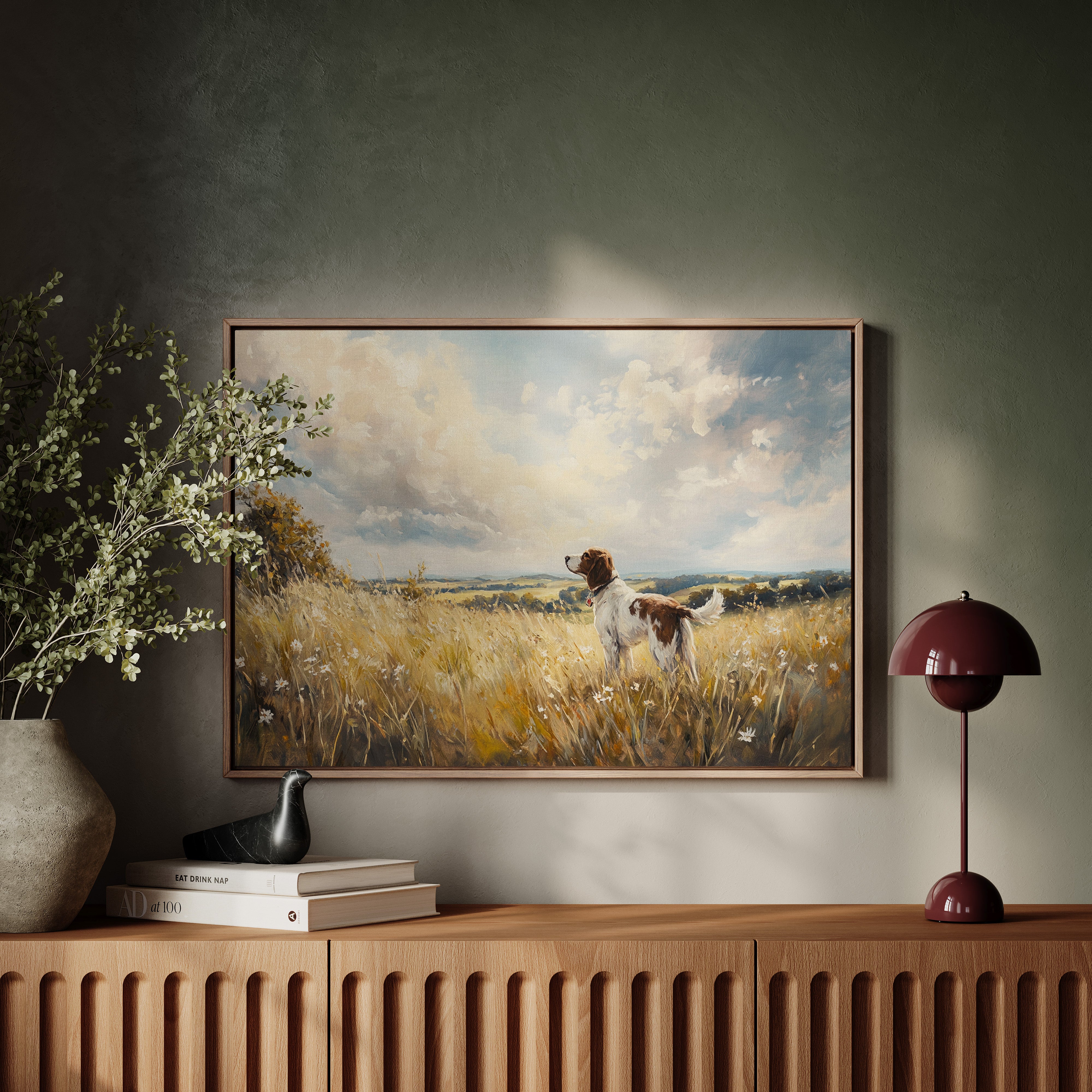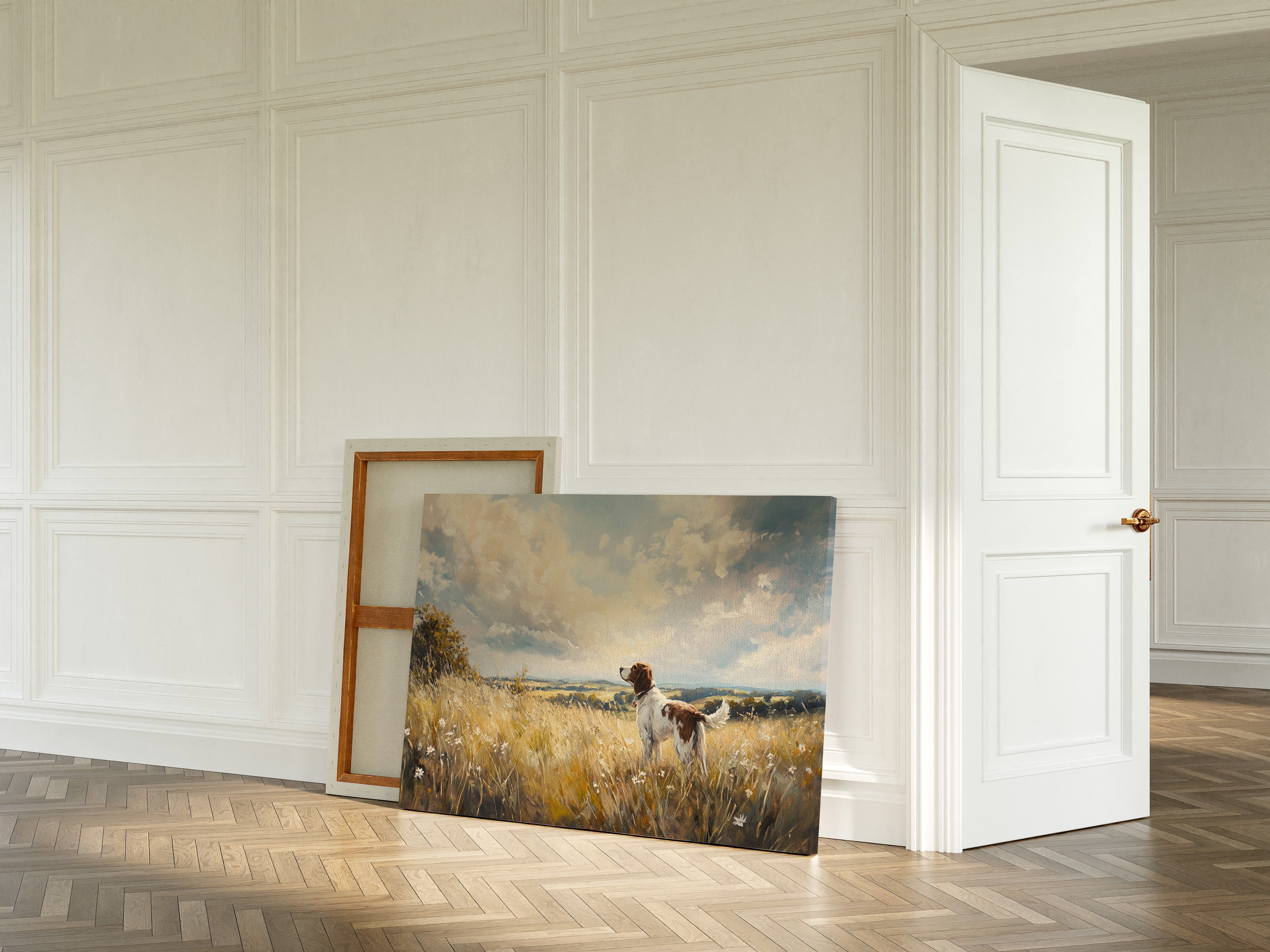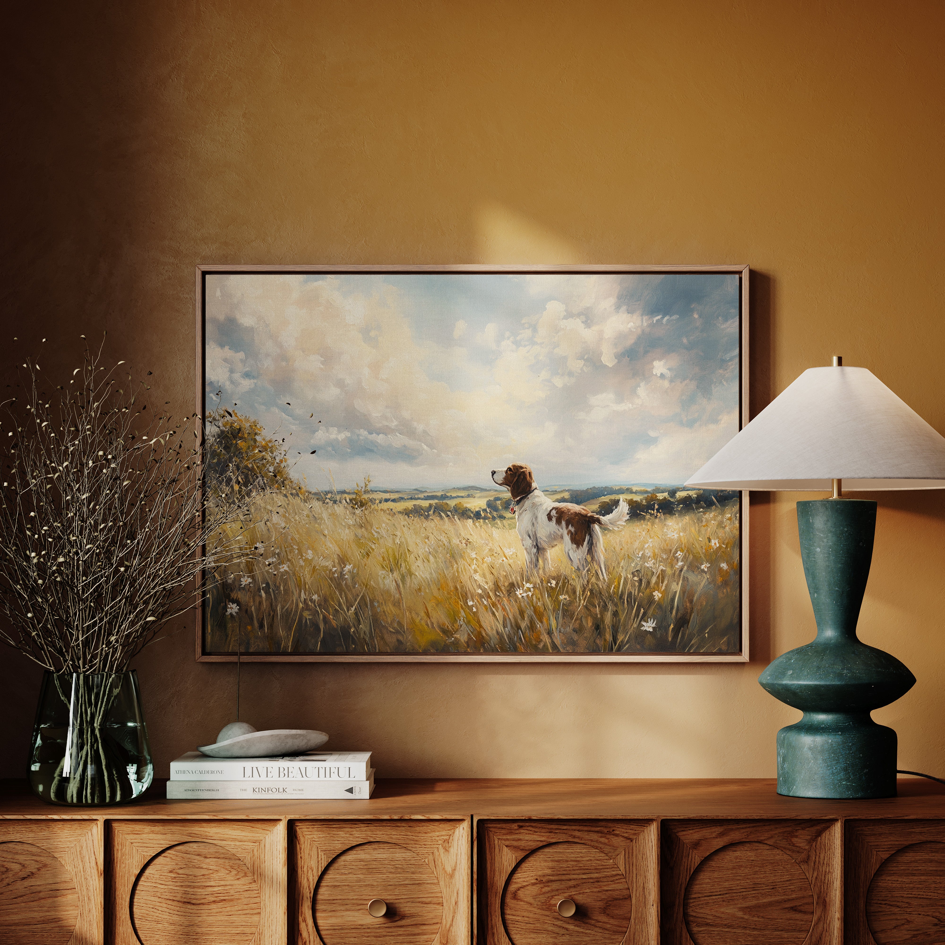 A gentle breeze carries stories across golden meadows where a faithful hunting dog stands alert, scanning distant horizons. Daisies dance among amber wheat stalks, creating a tapestry of white and gold beneath billowing clouds painted in soft peach and azure hues. The Brittany Spaniel's white and russet coat catches the warm light, its noble profile a testament to generations of companionship in these rolling countryside vistas. This pastoral scene brings the timeless bond between human and hound into the modern home, offering a window into simpler moments of pure joy and purpose.